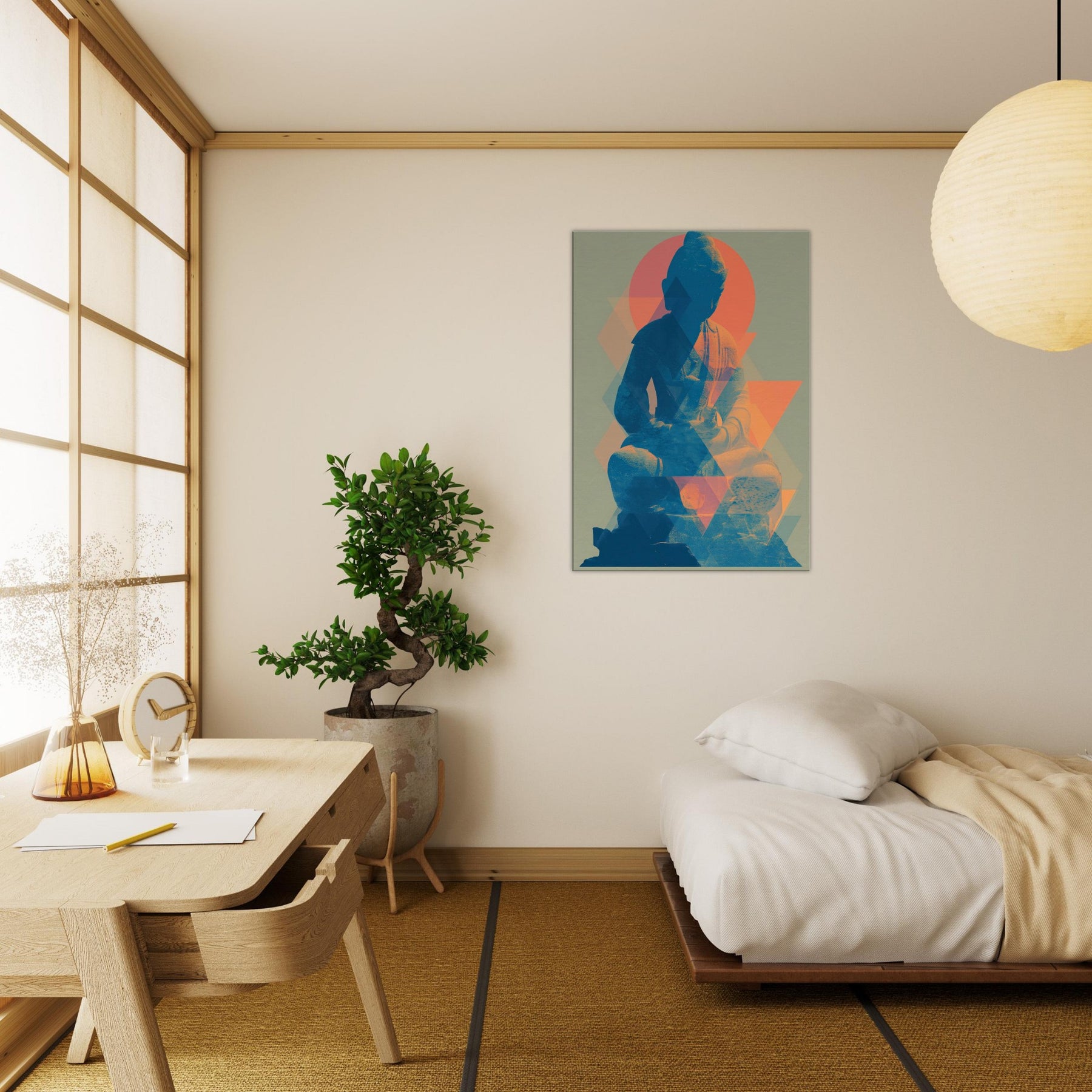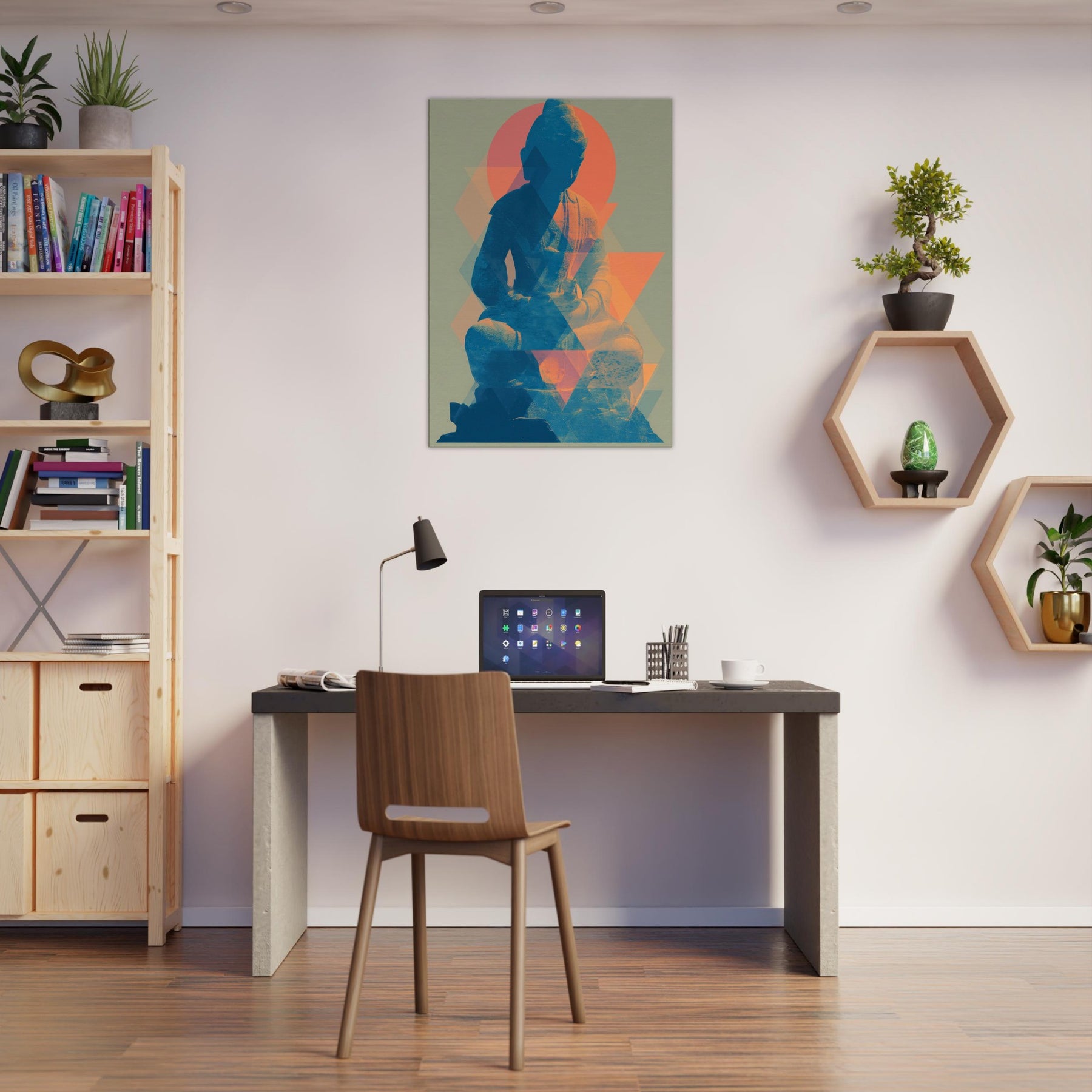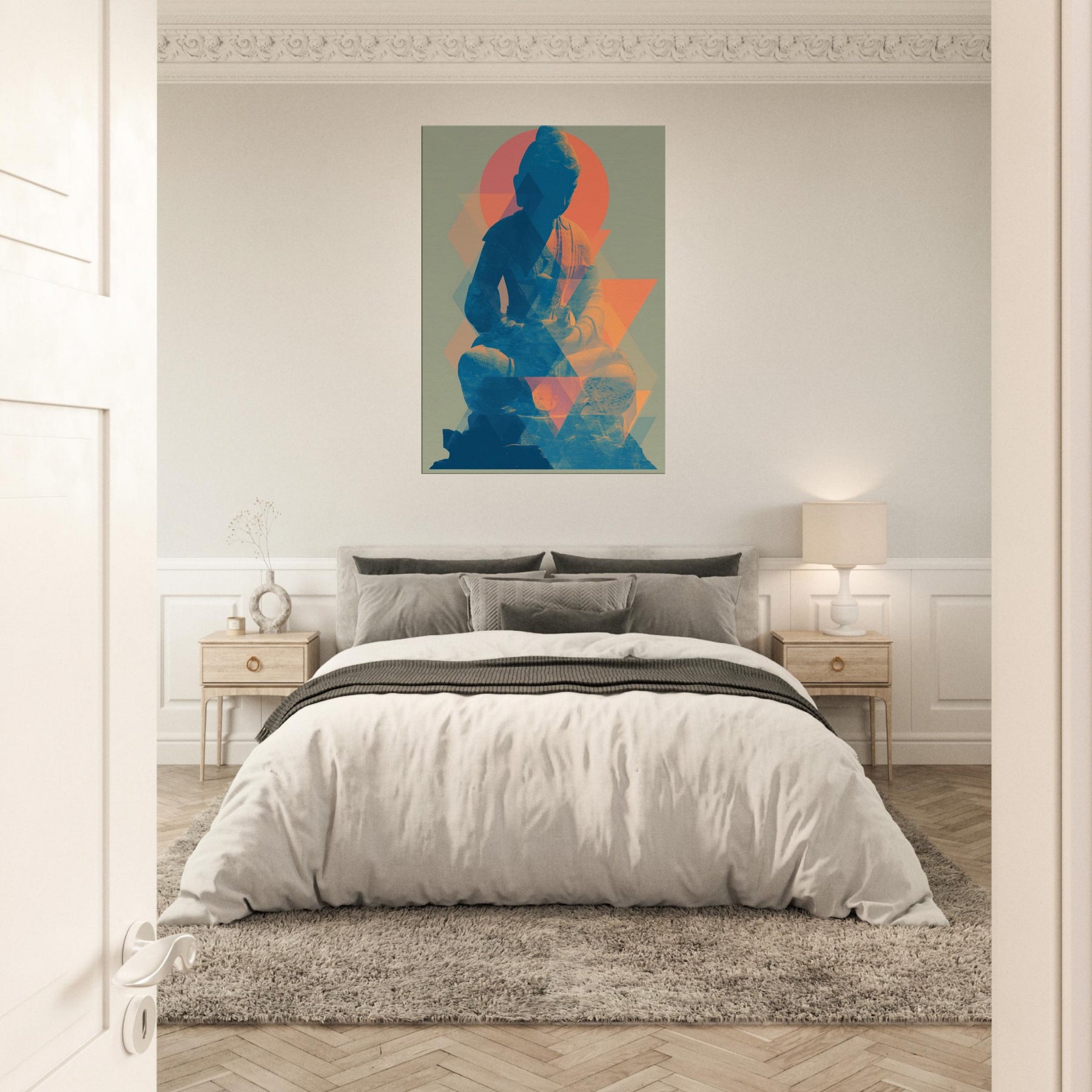 Immerse your space in a contemplative reverie with this Kuan Yin inspired wall piece. Abstract geometry cradles the serene figure in a tide of cobalt and coral, evoking a meditative breath that slows the room’s rhythm. The mystical presence of Guanyin seems to emerge from layered light, inviting quiet reflection, dawn lit calm, and timeless balance. Perfect for a living room or sacred corner, it pairs with natural textures and warm woods, transforming walls into a sanctuary of grace, mindfulness, and luminous serenity. The central subject is Kuan Yin (Guanyin).