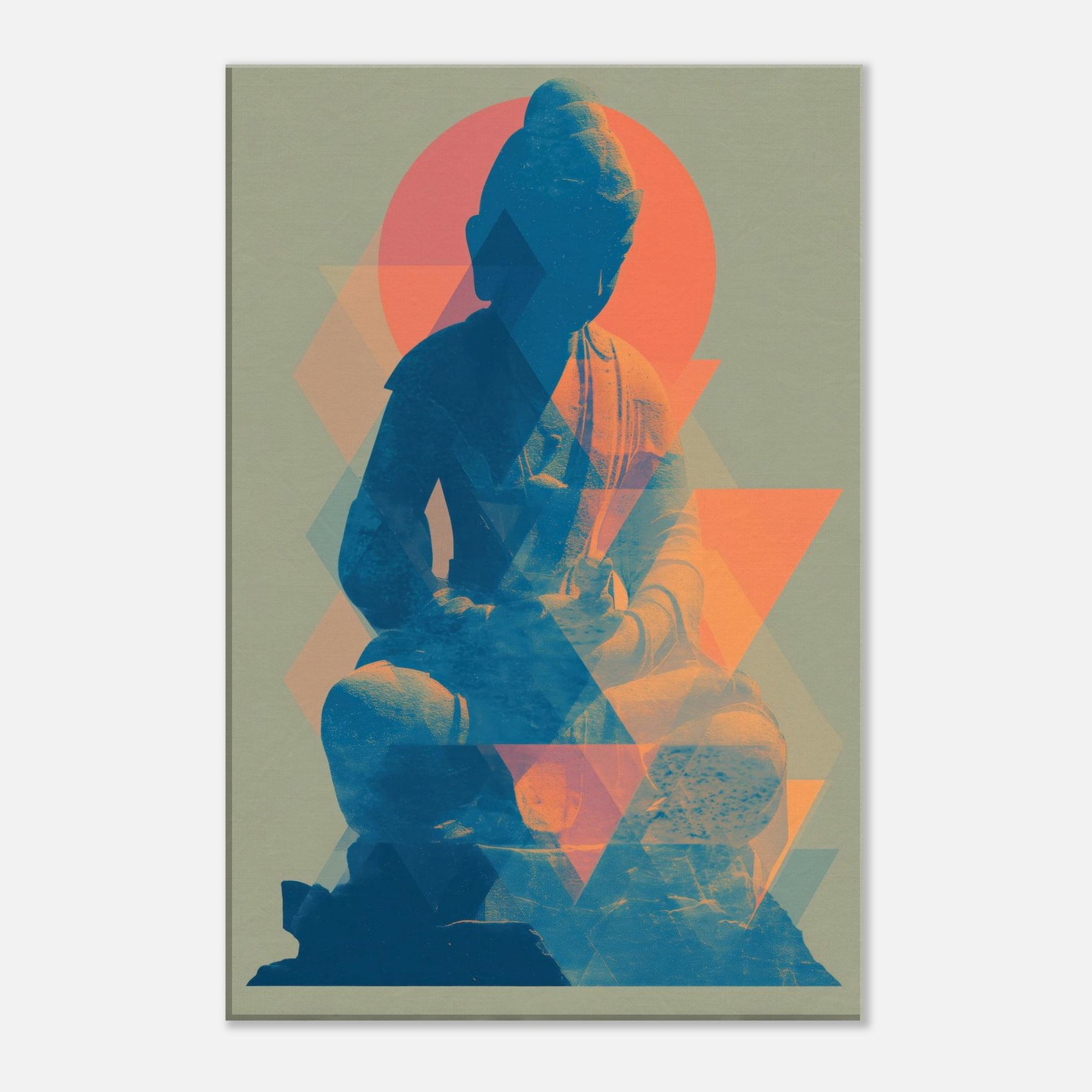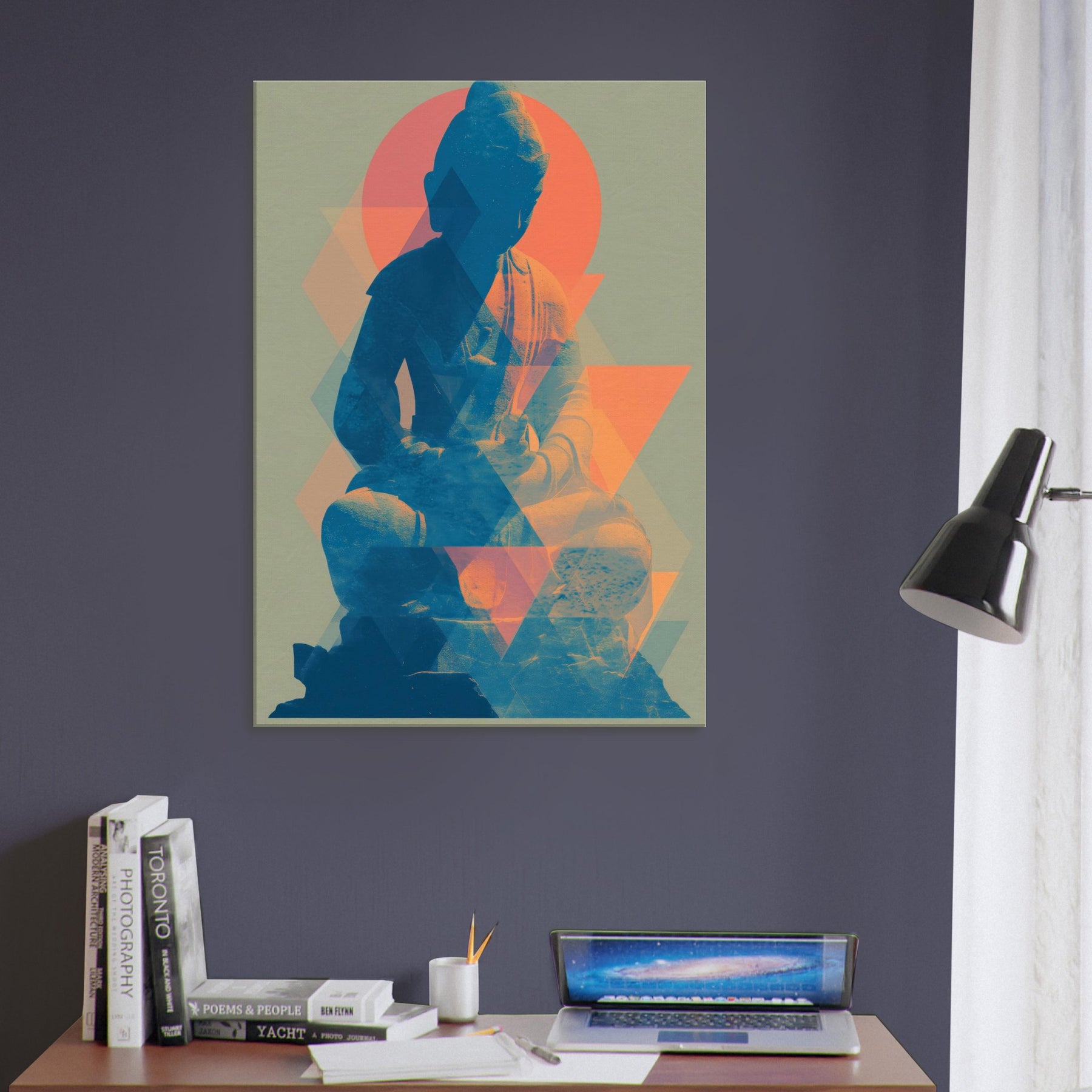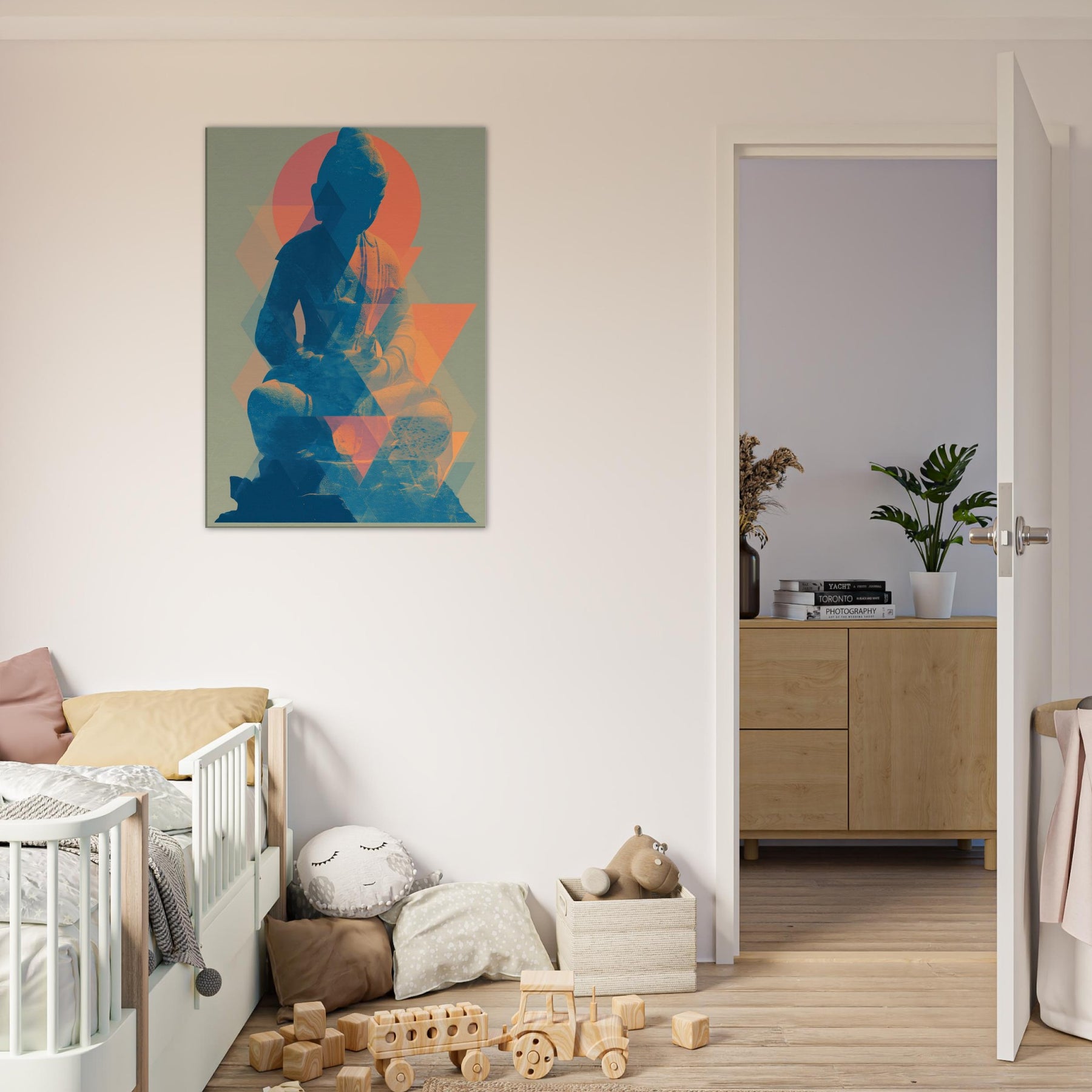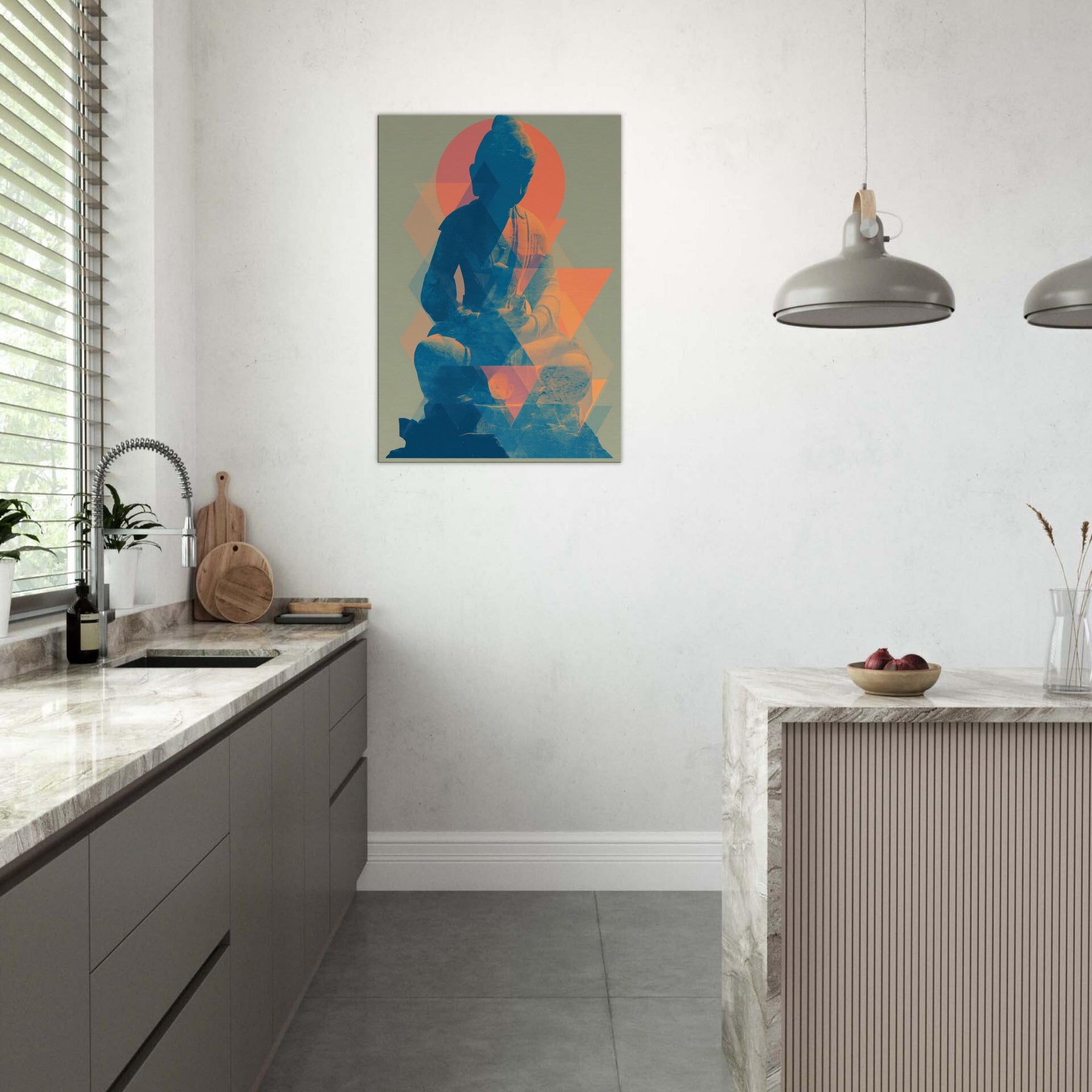 Immerse your space in a contemplative reverie with this Kuan Yin inspired wall piece. Abstract geometry cradles the serene figure in a tide of cobalt and coral, evoking a meditative breath that slows the room’s rhythm. The mystical presence of Guanyin seems to emerge from layered light, inviting quiet reflection, dawn lit calm, and timeless balance. Perfect for a living room or sacred corner, it pairs with natural textures and warm woods, transforming walls into a sanctuary of grace, mindfulness, and luminous serenity. The central subject is Kuan Yin (Guanyin).