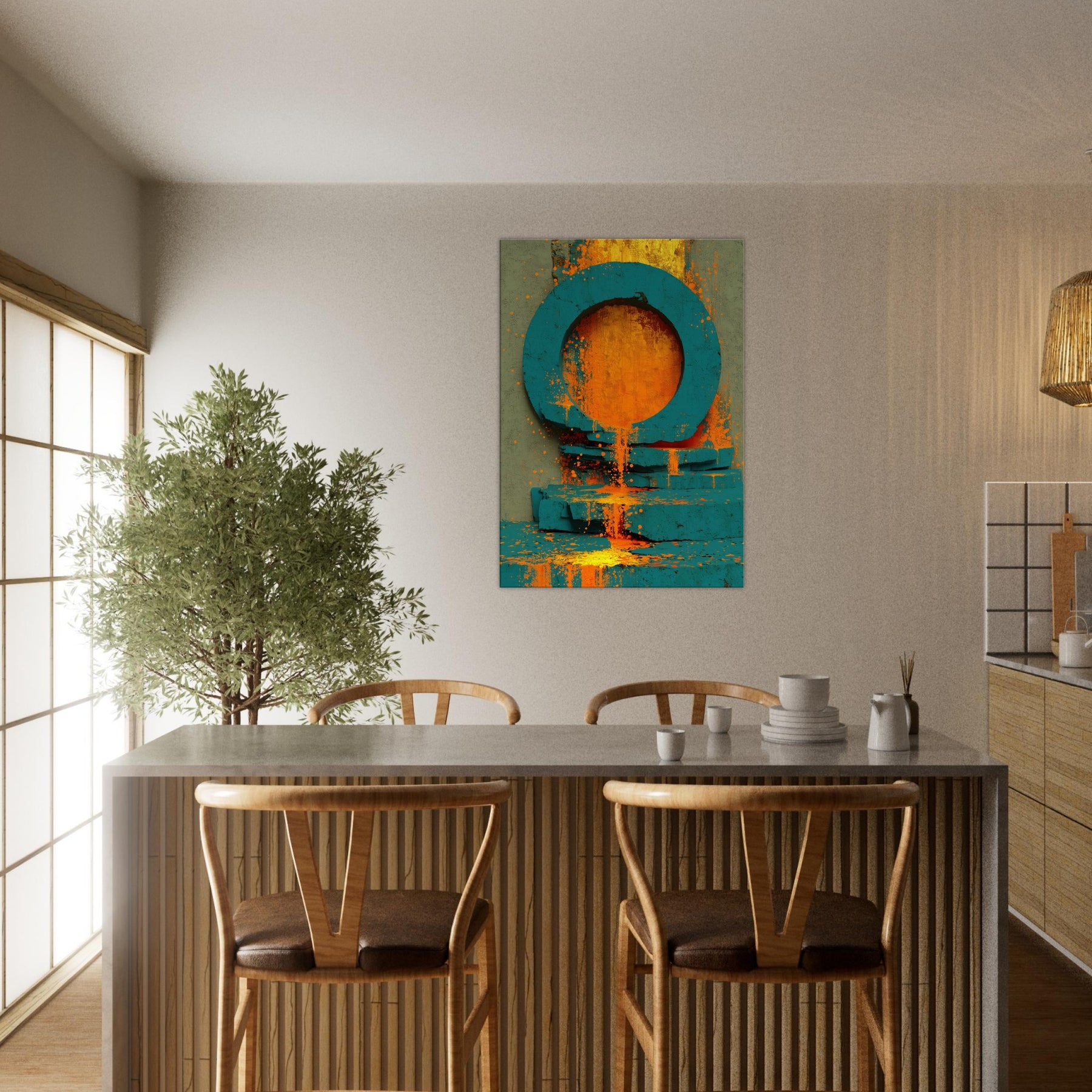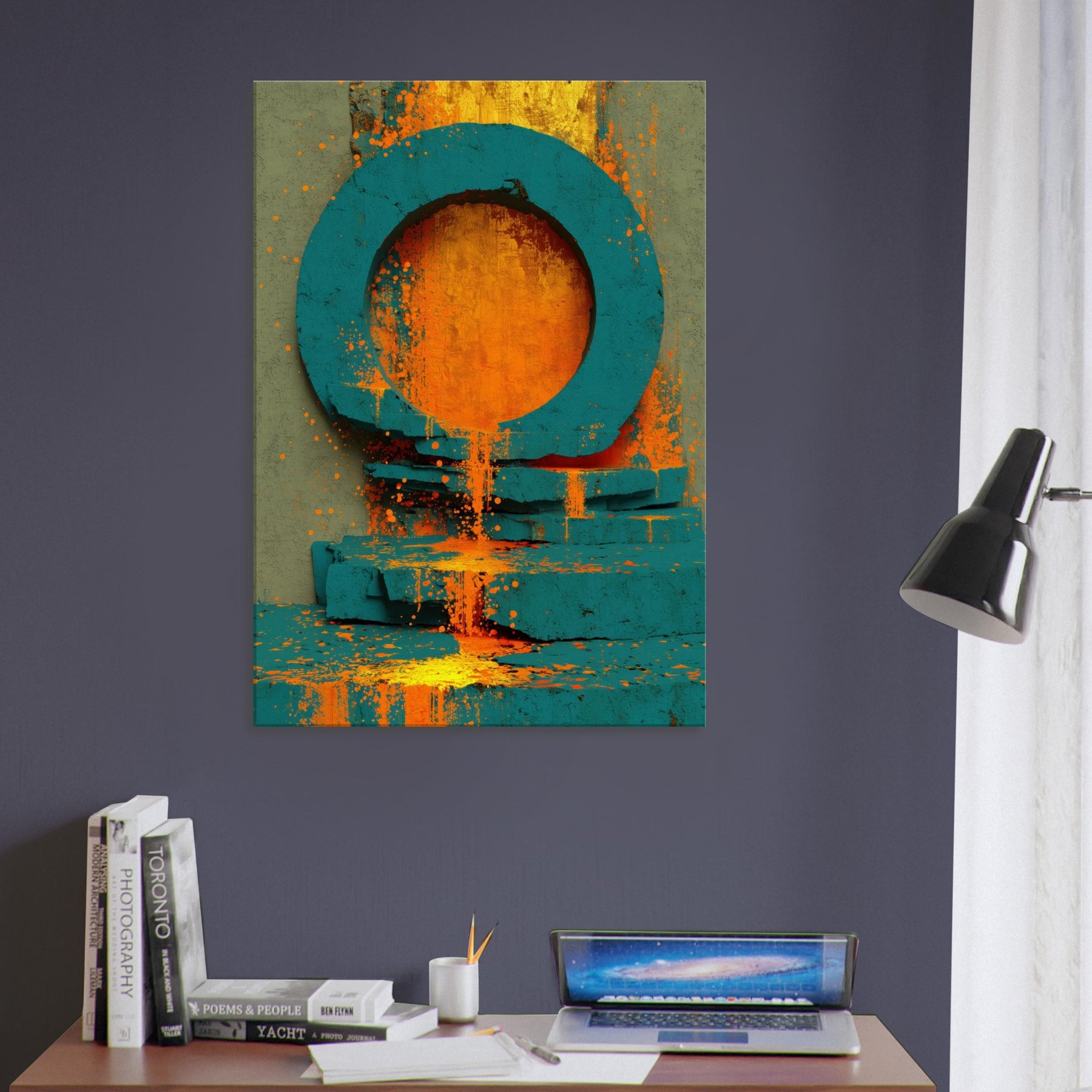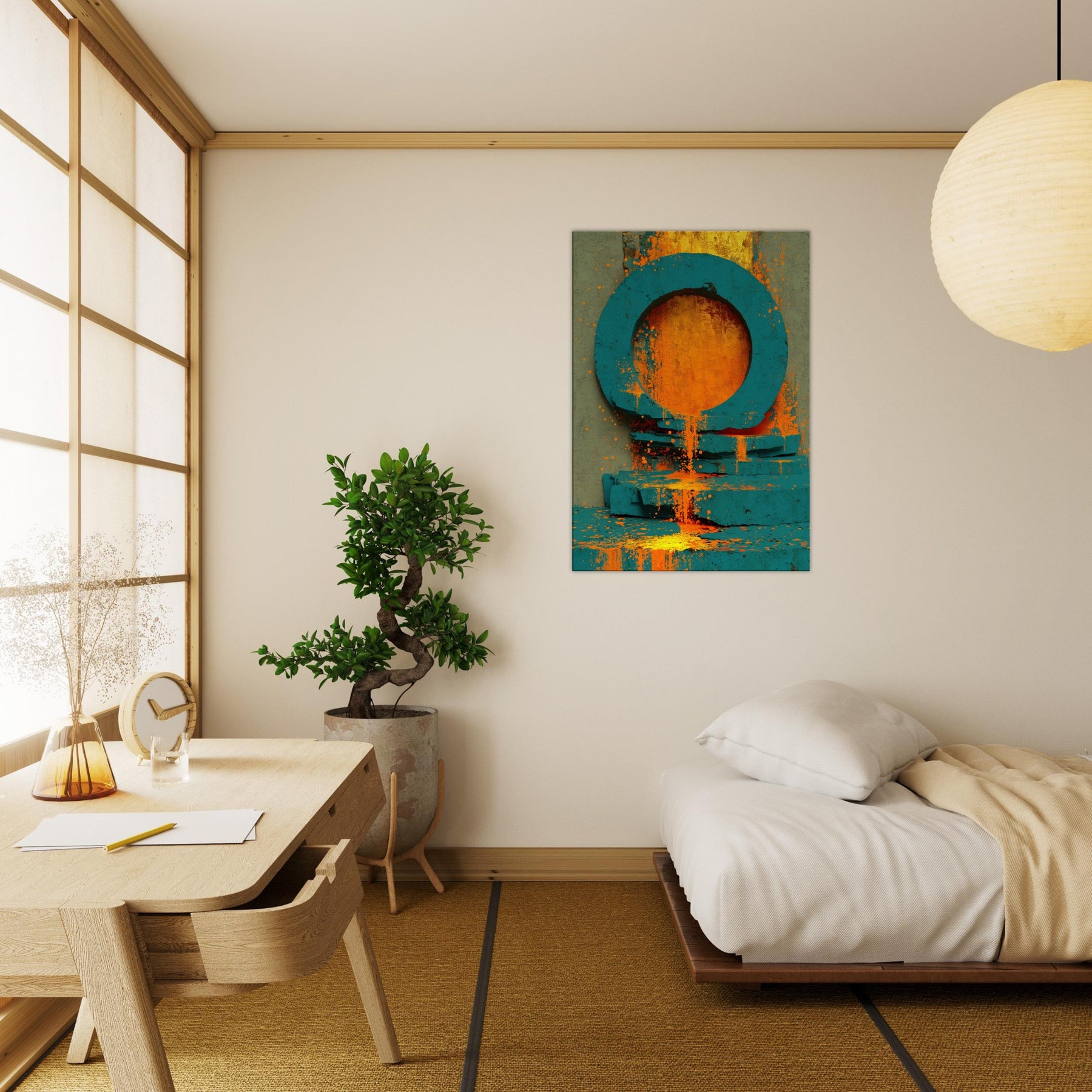 Step into a quiet horizon where a turquoise Ensō circles the sunlit core, a luminous breath captured in pigment. The abstract field wears splashes and drips of orange that shimmer like molten light, inviting introspection without shouting. This mystical circle suggests both completion and beginnings, a visual meditation that softens sharp edges of daily life. Hang it where you breathe beside a sofa, above a console, or in a serene nook to invite calm, focus, and a luminous sense of balance. The central subject is Ensō (Zen Circle).