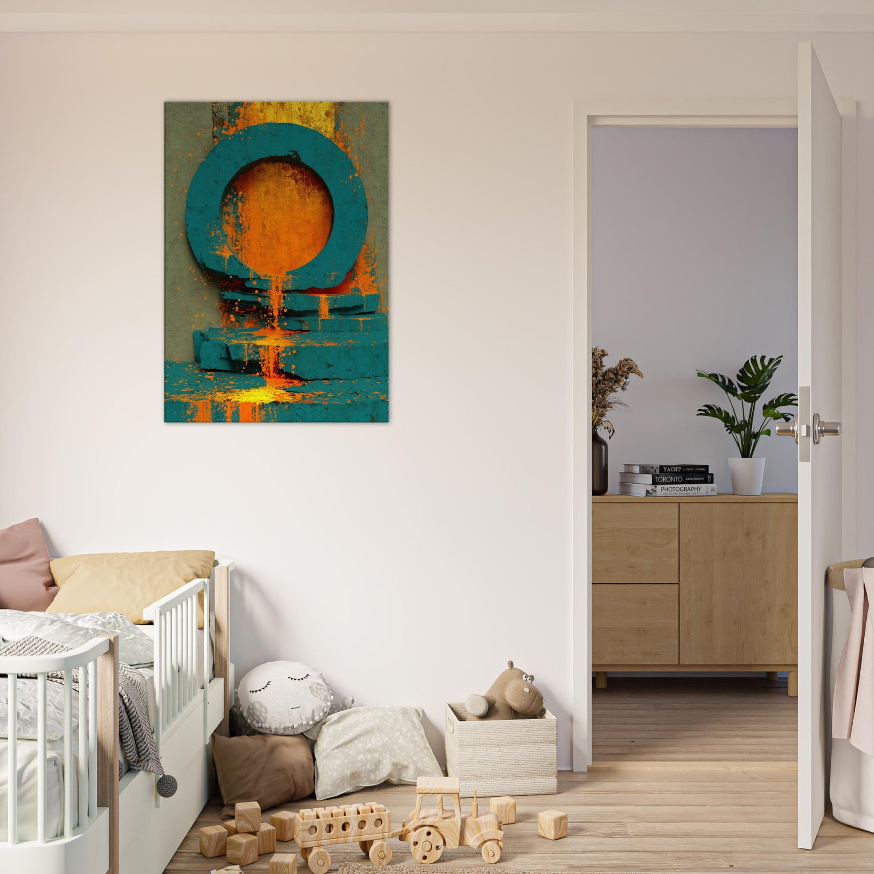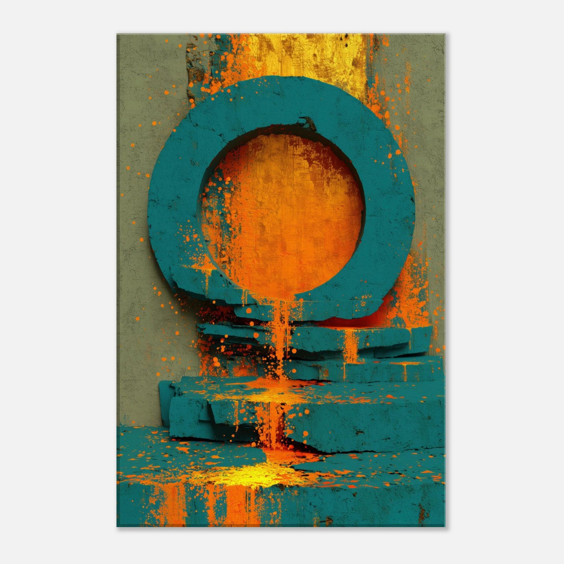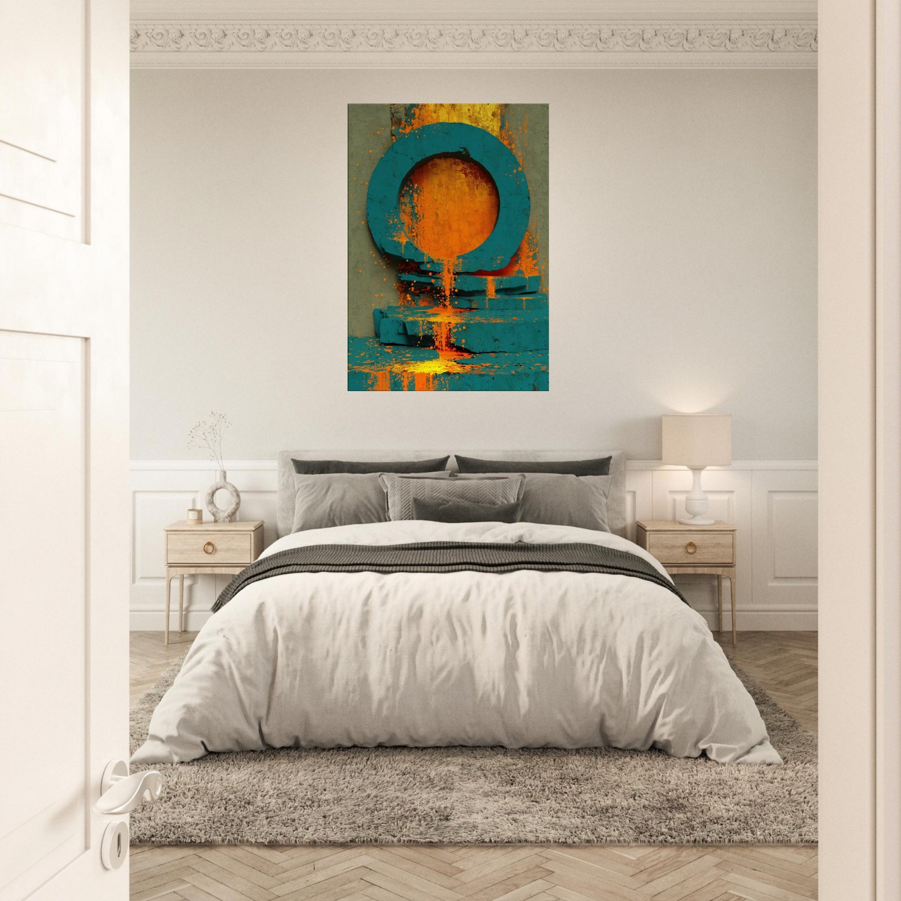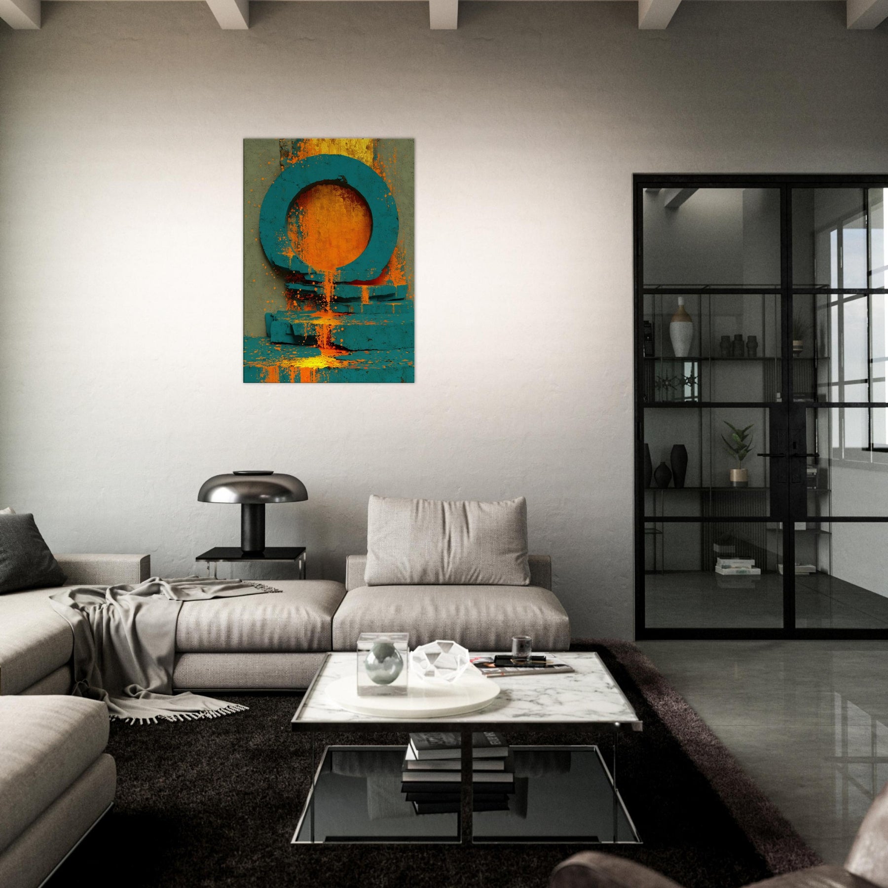Step into a quiet horizon where a turquoise Ensō circles the sunlit core, a luminous breath captured in pigment. The abstract field wears splashes and drips of orange that shimmer like molten light, inviting introspection without shouting. This mystical circle suggests both completion and beginnings, a visual meditation that softens sharp edges of daily life. Hang it where you breathe beside a sofa, above a console, or in a serene nook to invite calm, focus, and a luminous sense of balance. The central subject is Ensō (Zen Circle).