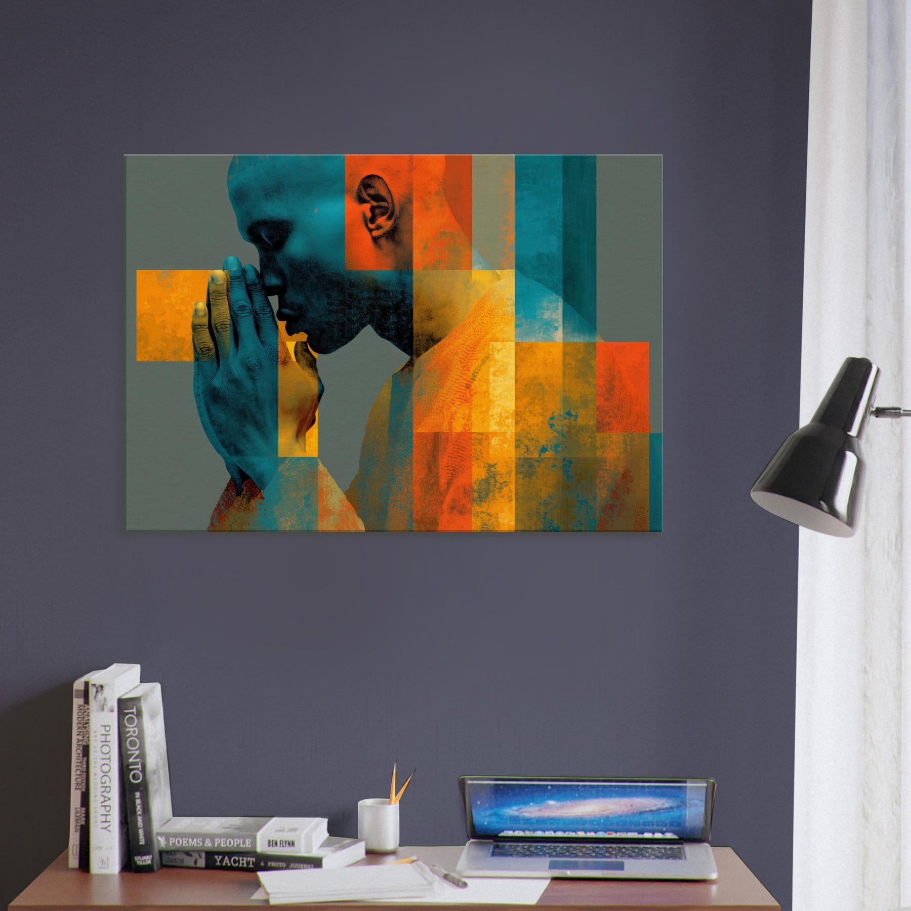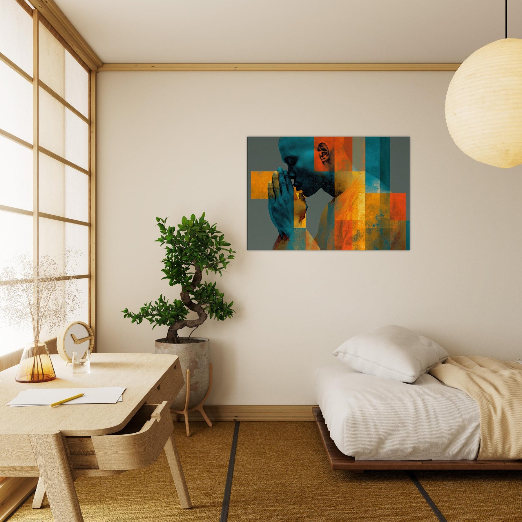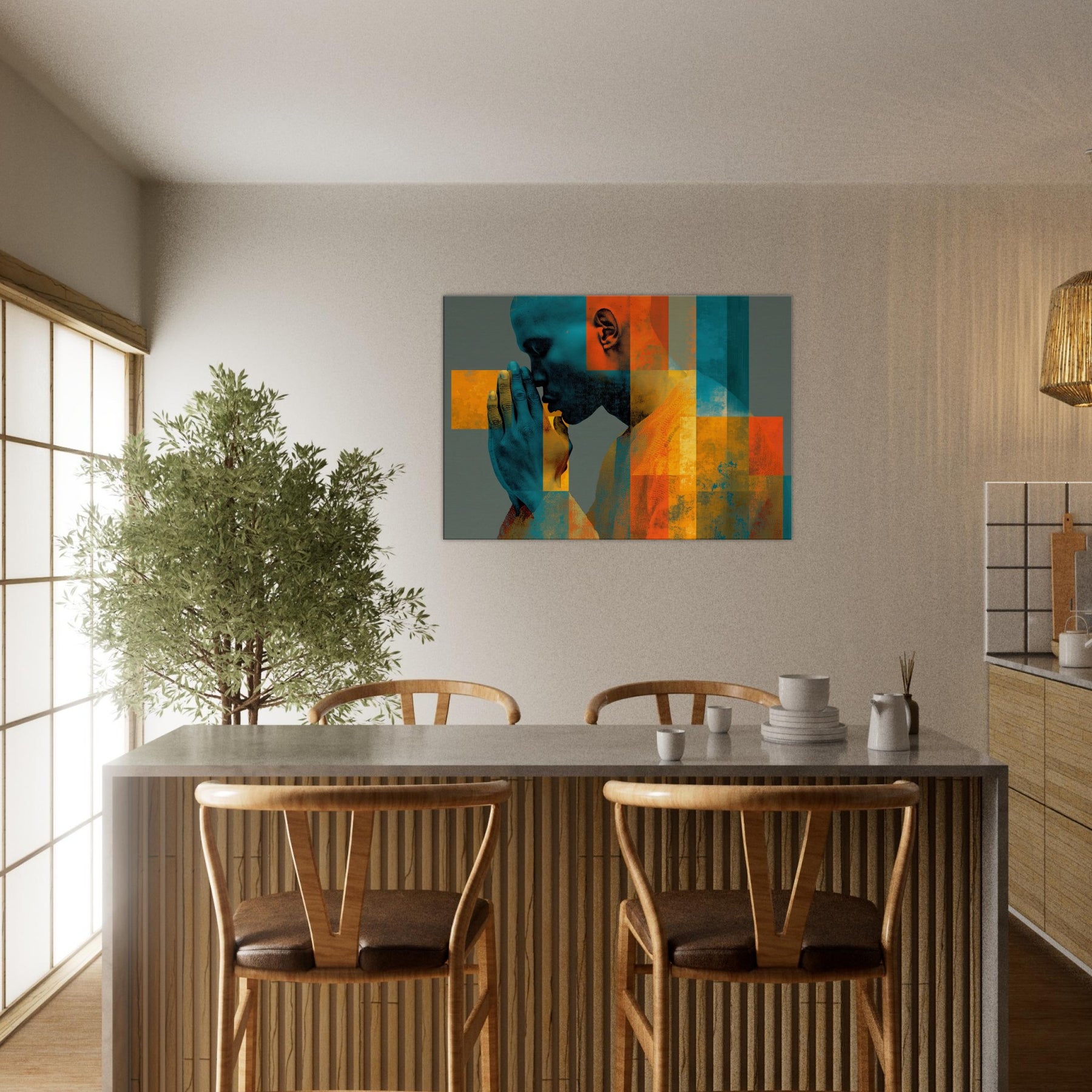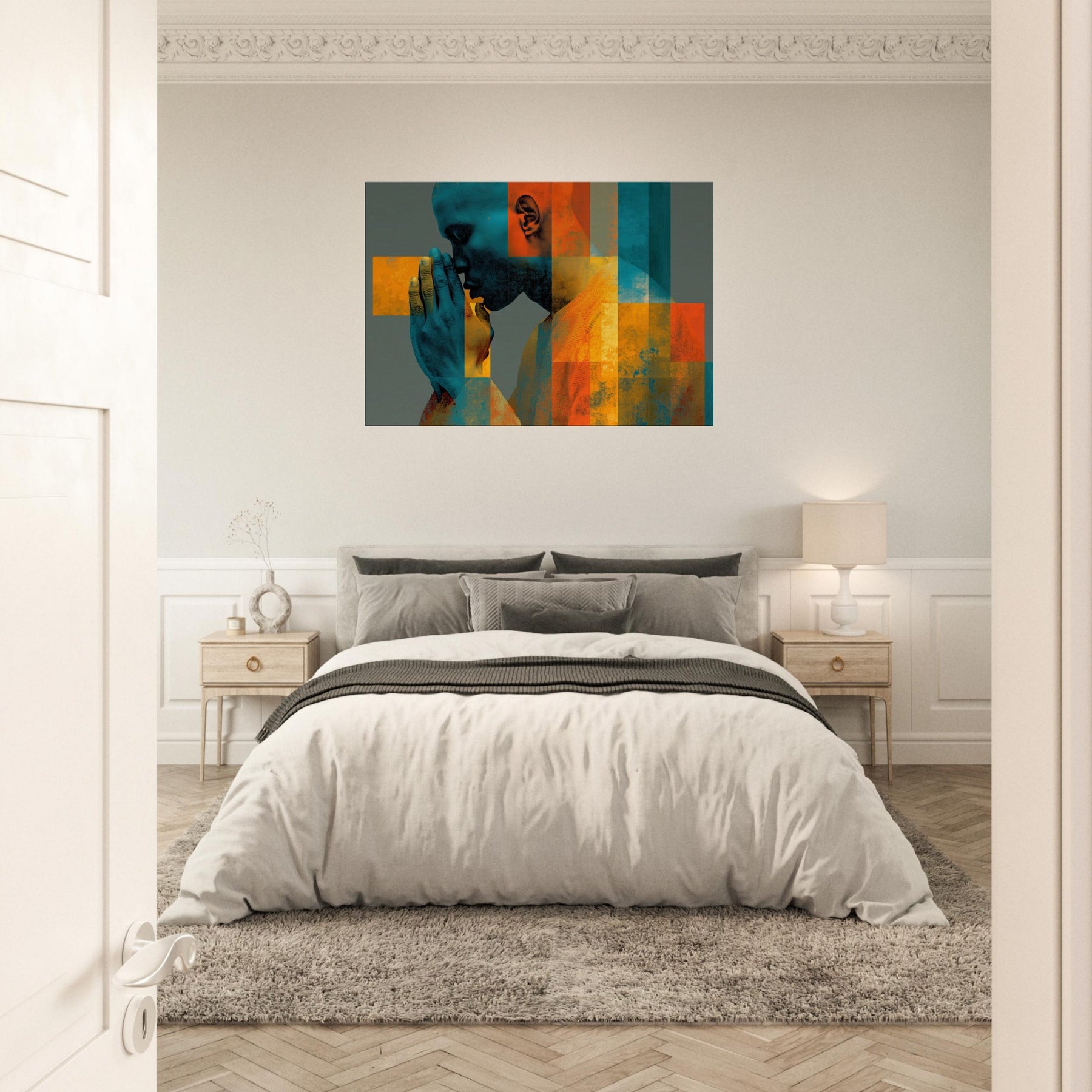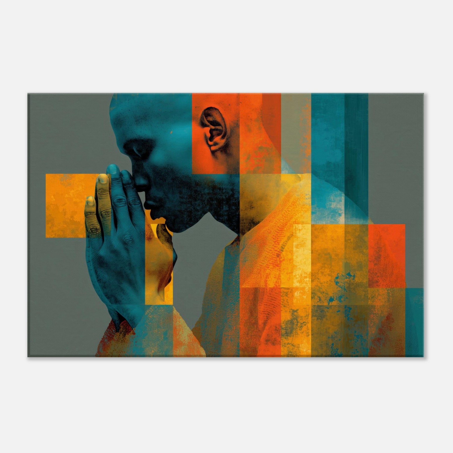 Centered on Hands in Prayer, this luminous abstract study unfolds as a hush of color and form. Blues and ochres interlock in a mosaic that feels like breath and memory, while soft textures invite your touch of the wall. The composition exudes reverence and warmth, transforming a living space into a sanctuary of focus and calm. It pairs quiet drama with contemporary edge, making every glance a moment of quiet reflection.