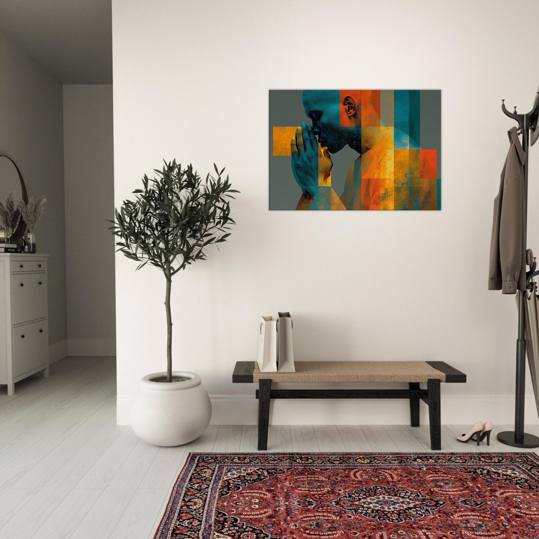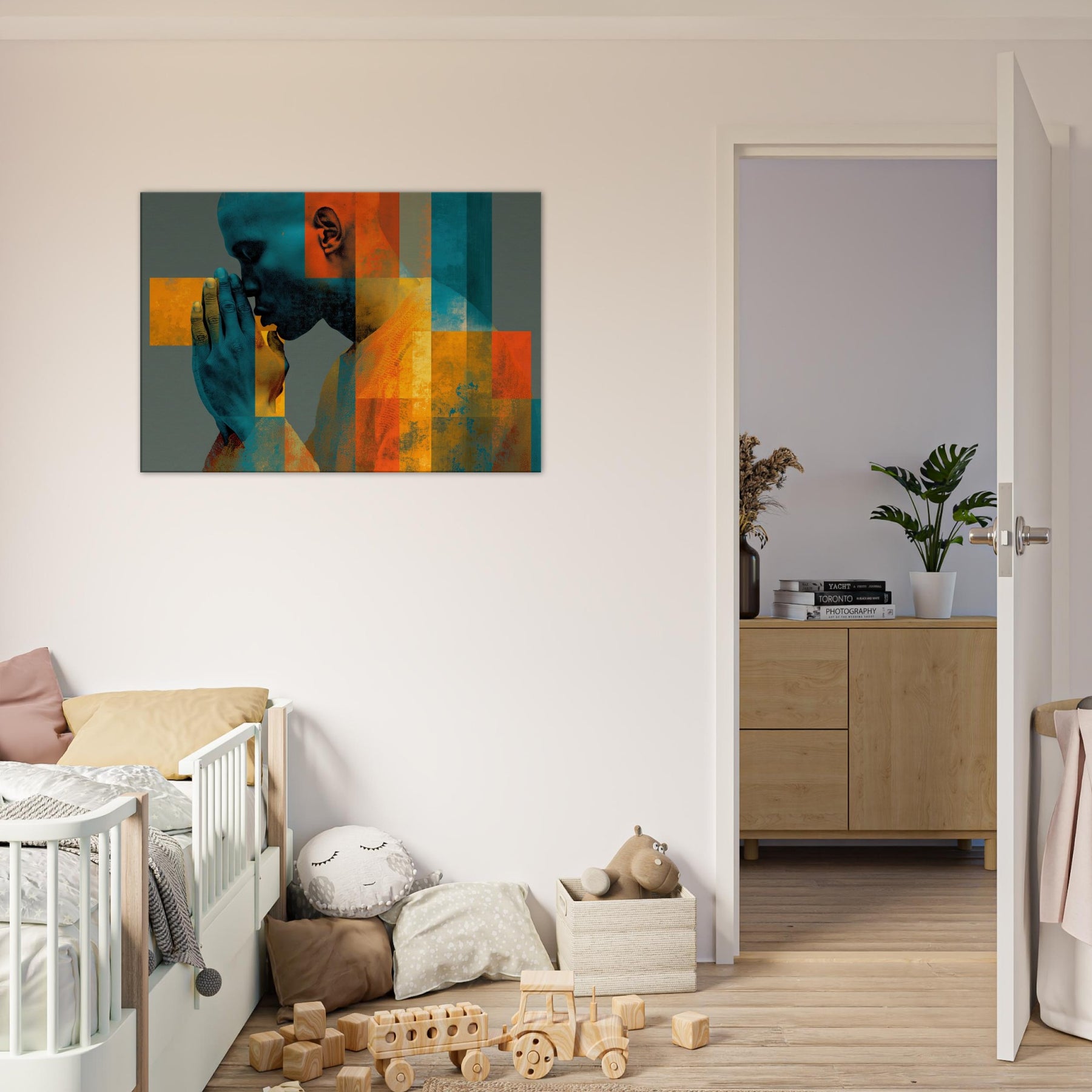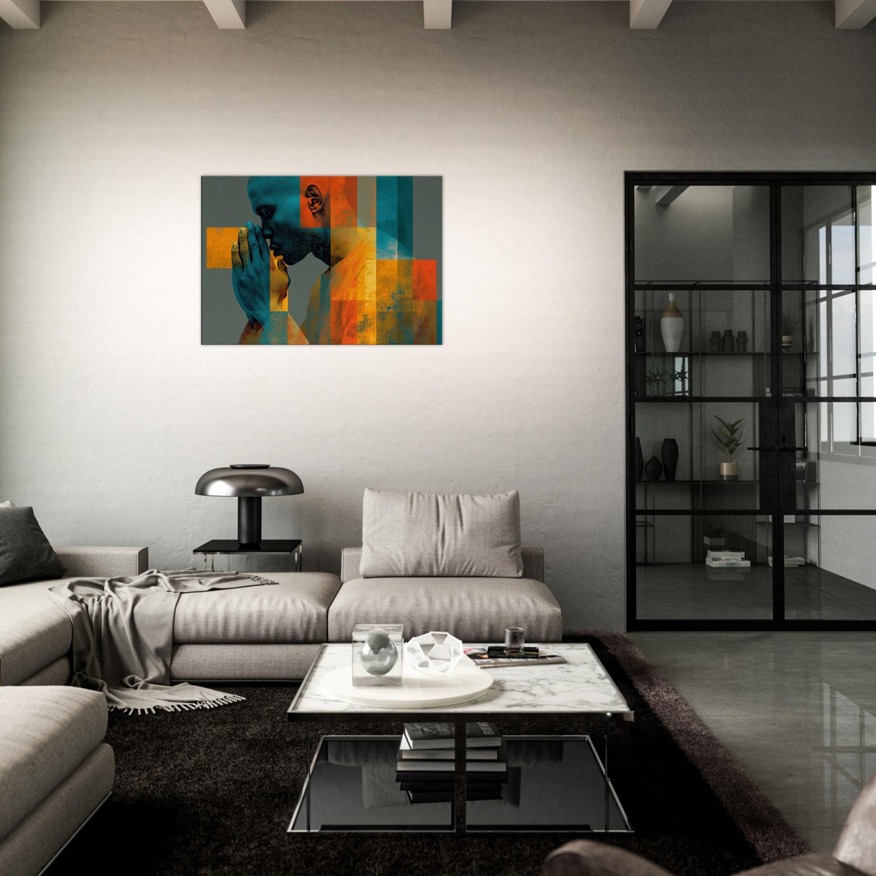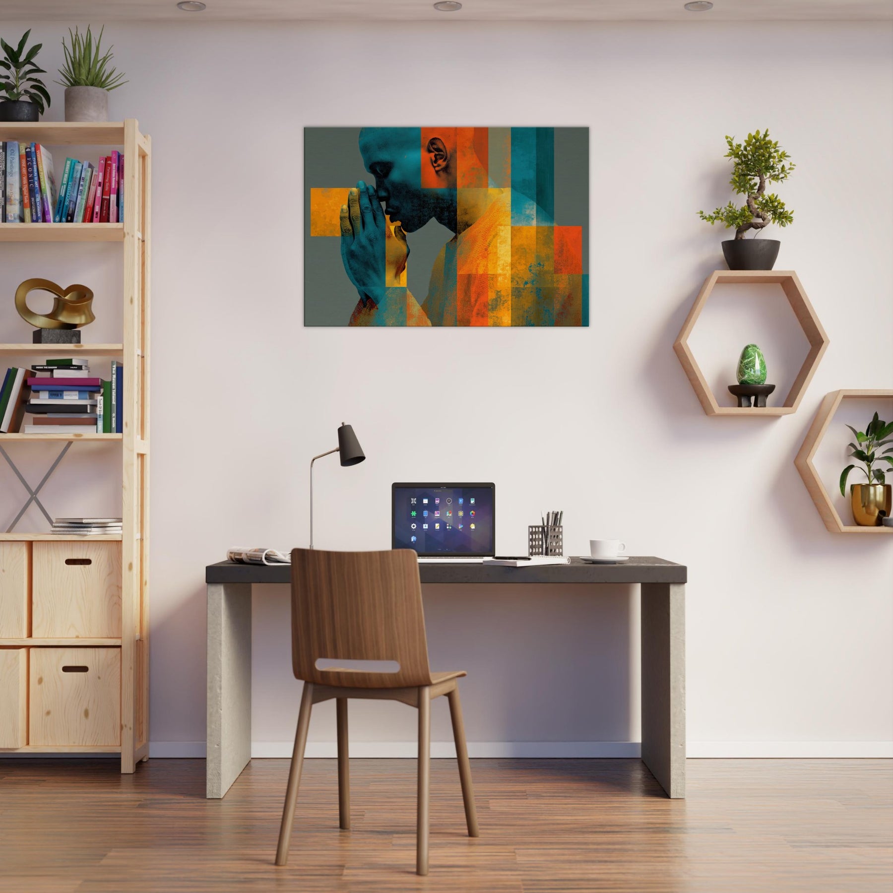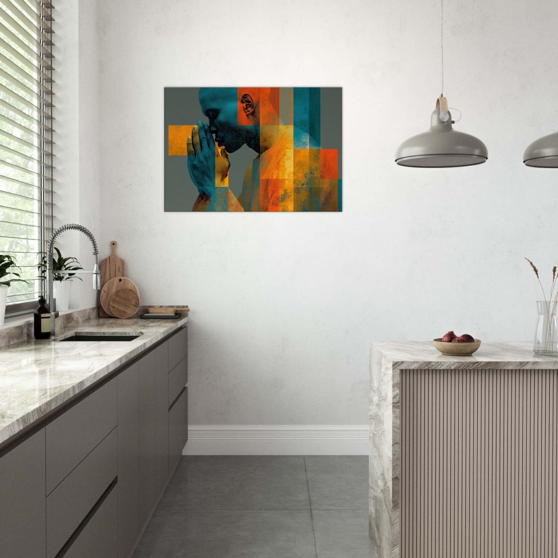 Centered on Hands in Prayer, this luminous abstract study unfolds as a hush of color and form. Blues and ochres interlock in a mosaic that feels like breath and memory, while soft textures invite your touch of the wall. The composition exudes reverence and warmth, transforming a living space into a sanctuary of focus and calm. It pairs quiet drama with contemporary edge, making every glance a moment of quiet reflection.