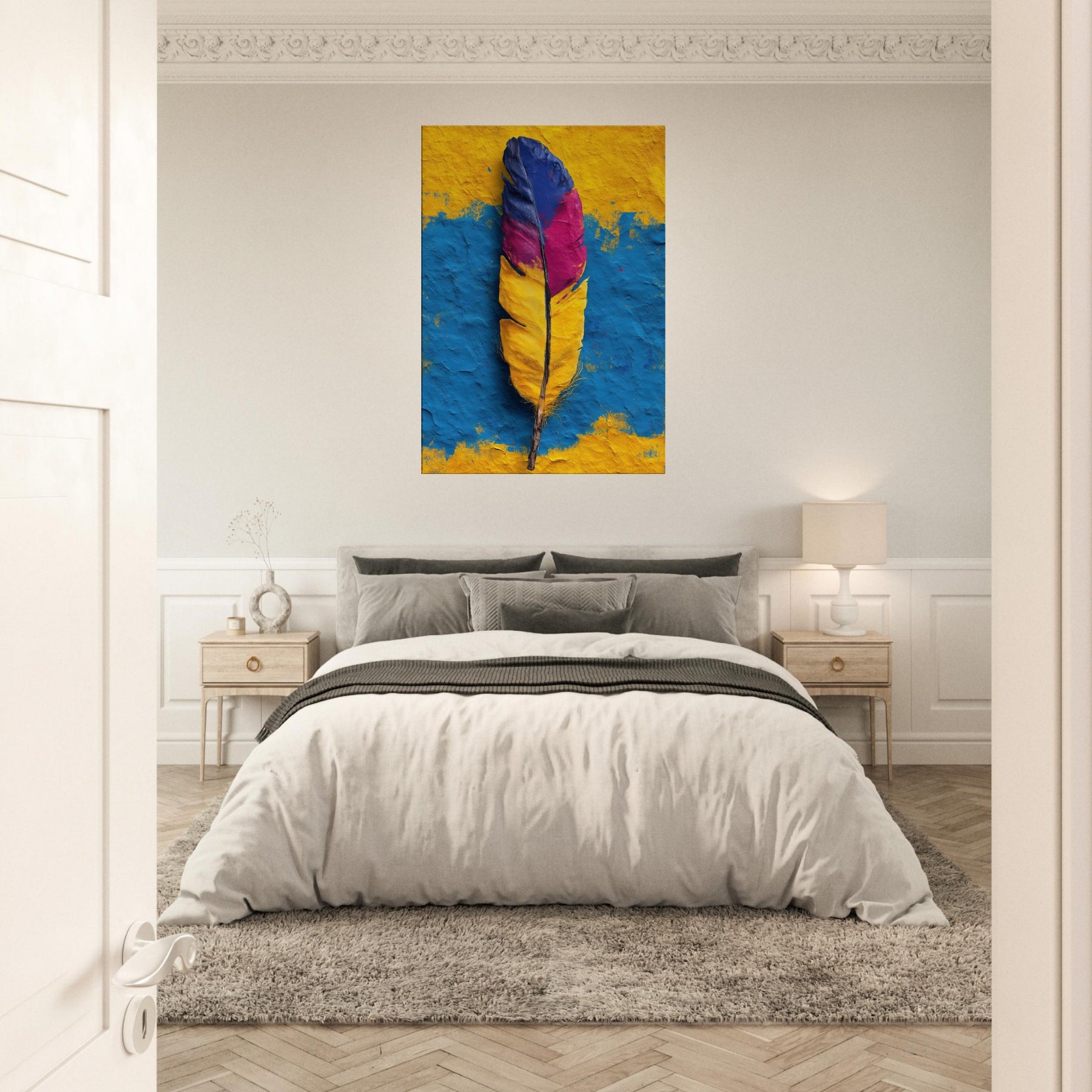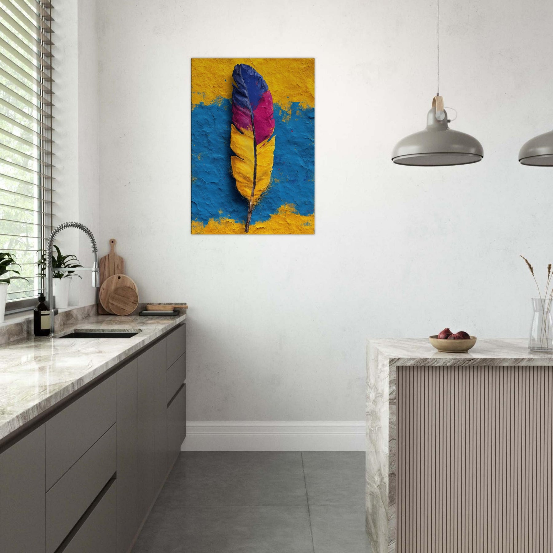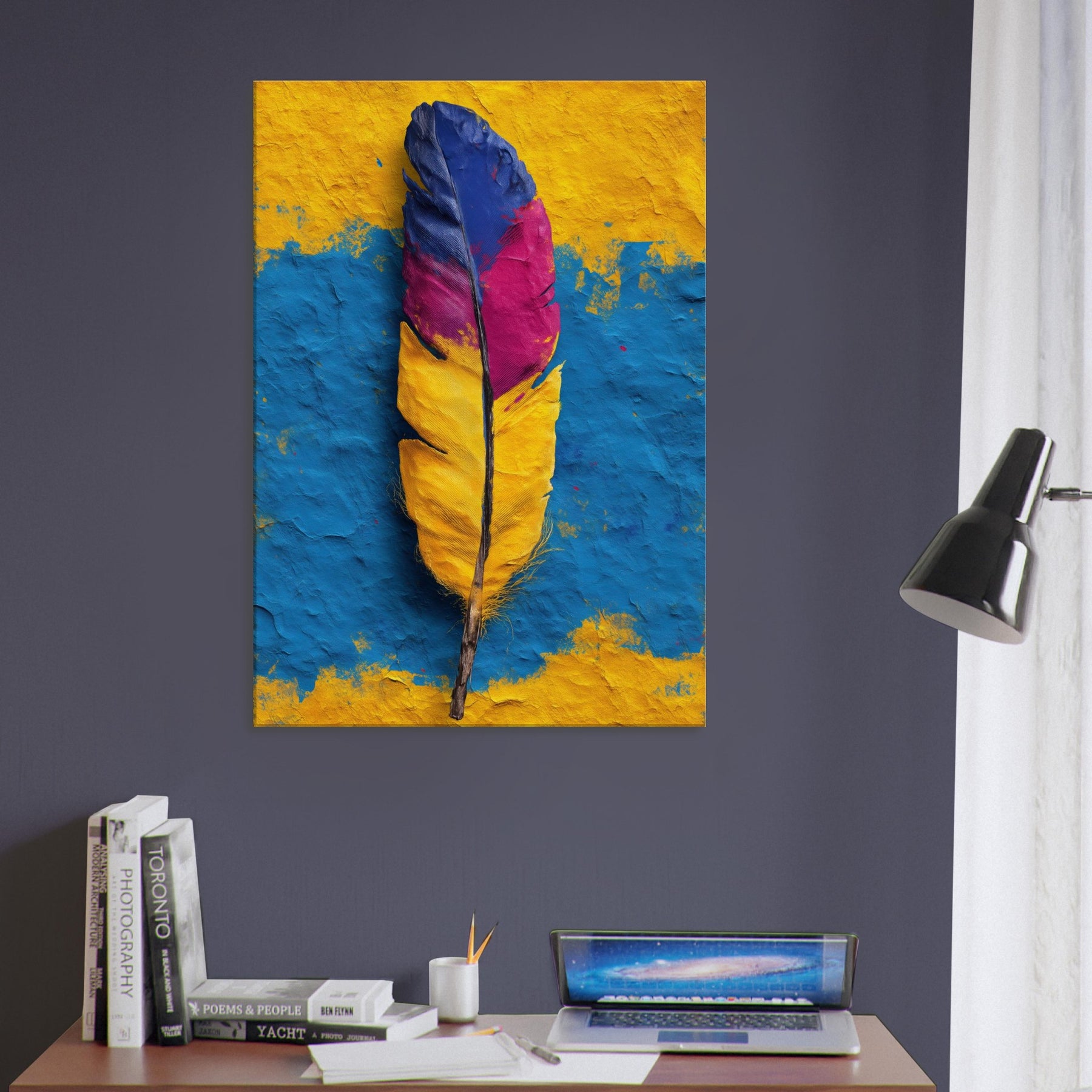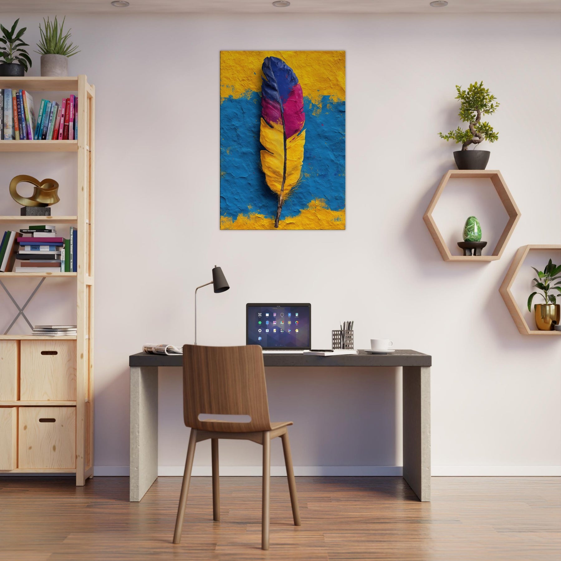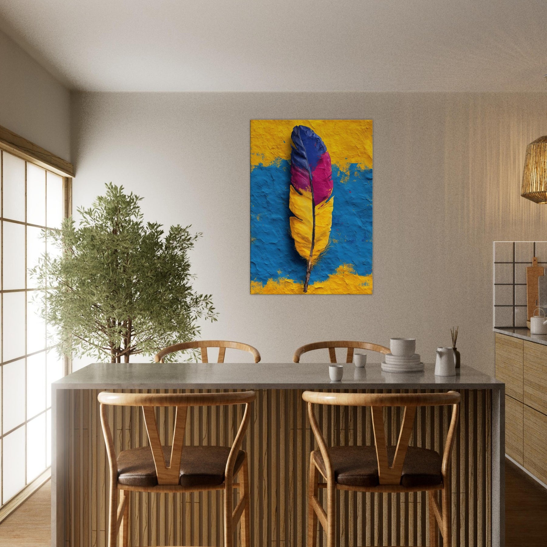 Feather Quill unfurls across a field of sunlit blues and warm yellows, its silhouette sculpted with confident strokes. This abstract meditation invites a room to breathe where the soft curve of the feather echoes a quiet rhythm, and the saturated hues awaken conversation at dusk. The Feather Quill becomes a muse for study nooks and living rooms alike, turning walls into a gallery of intention, memory, and possibility.