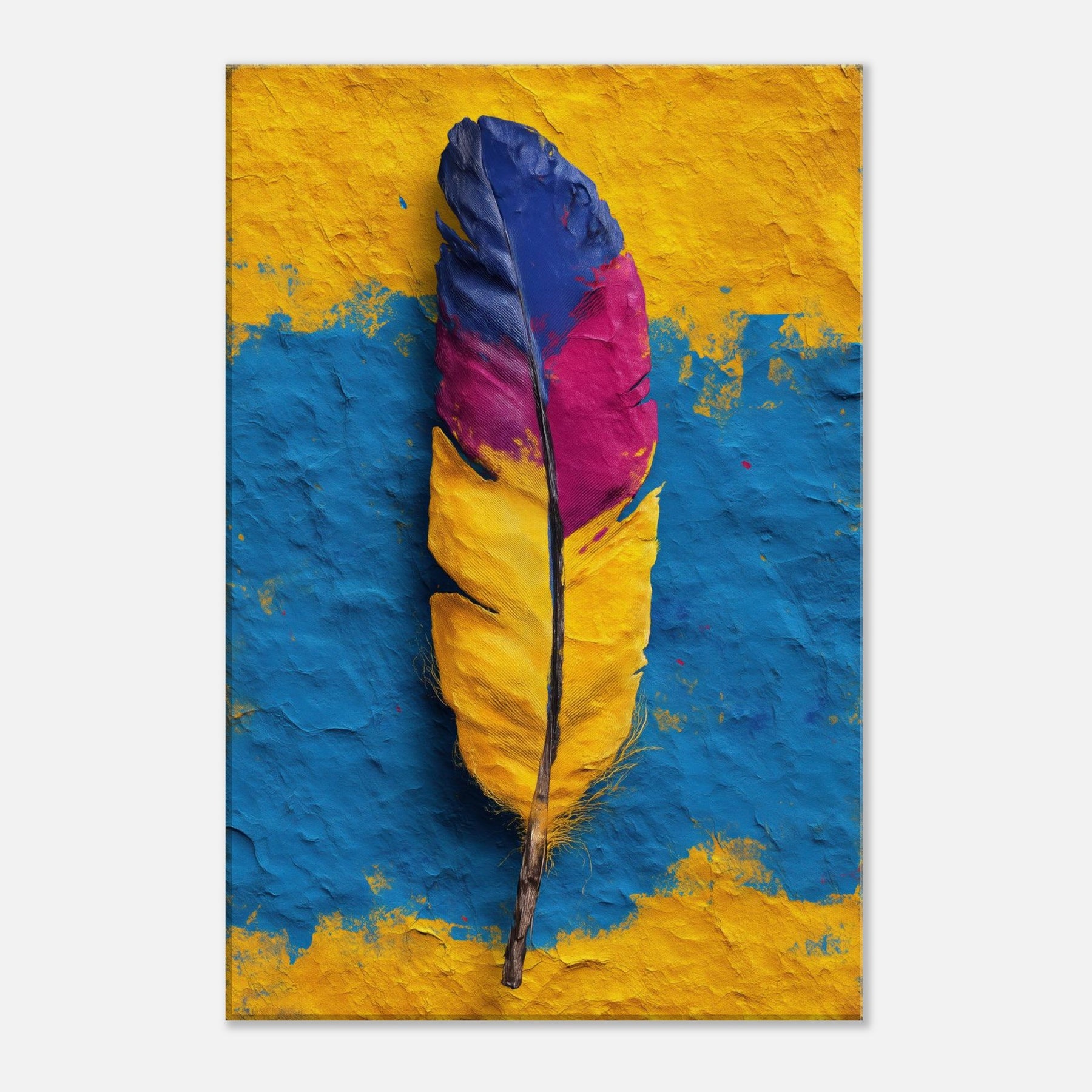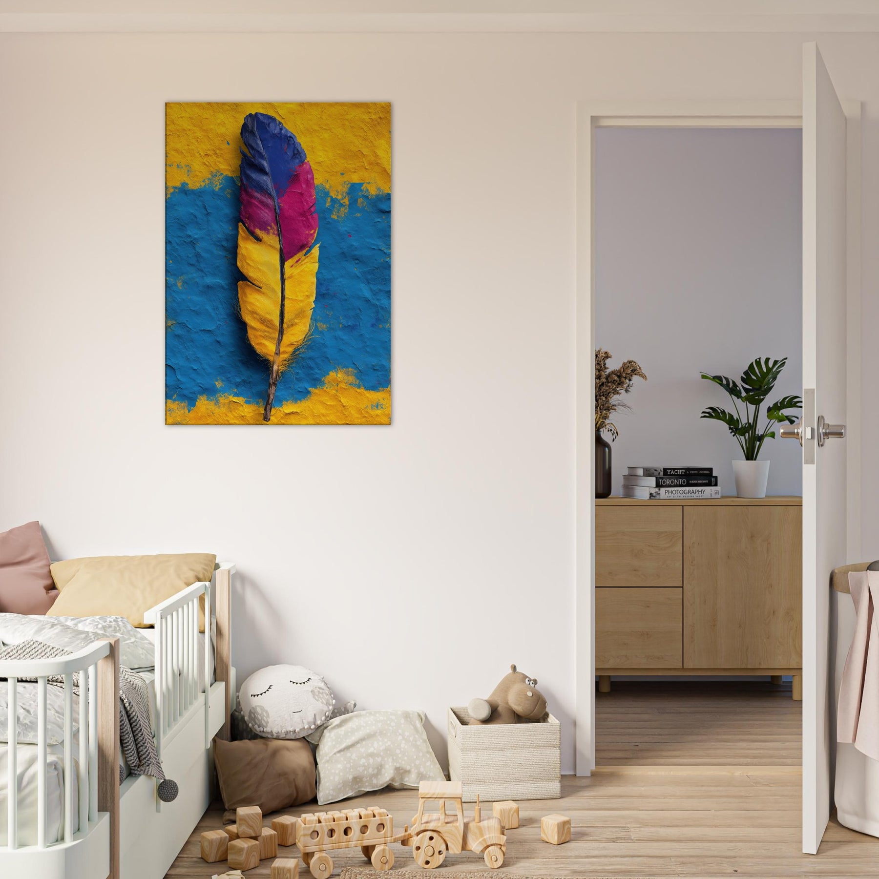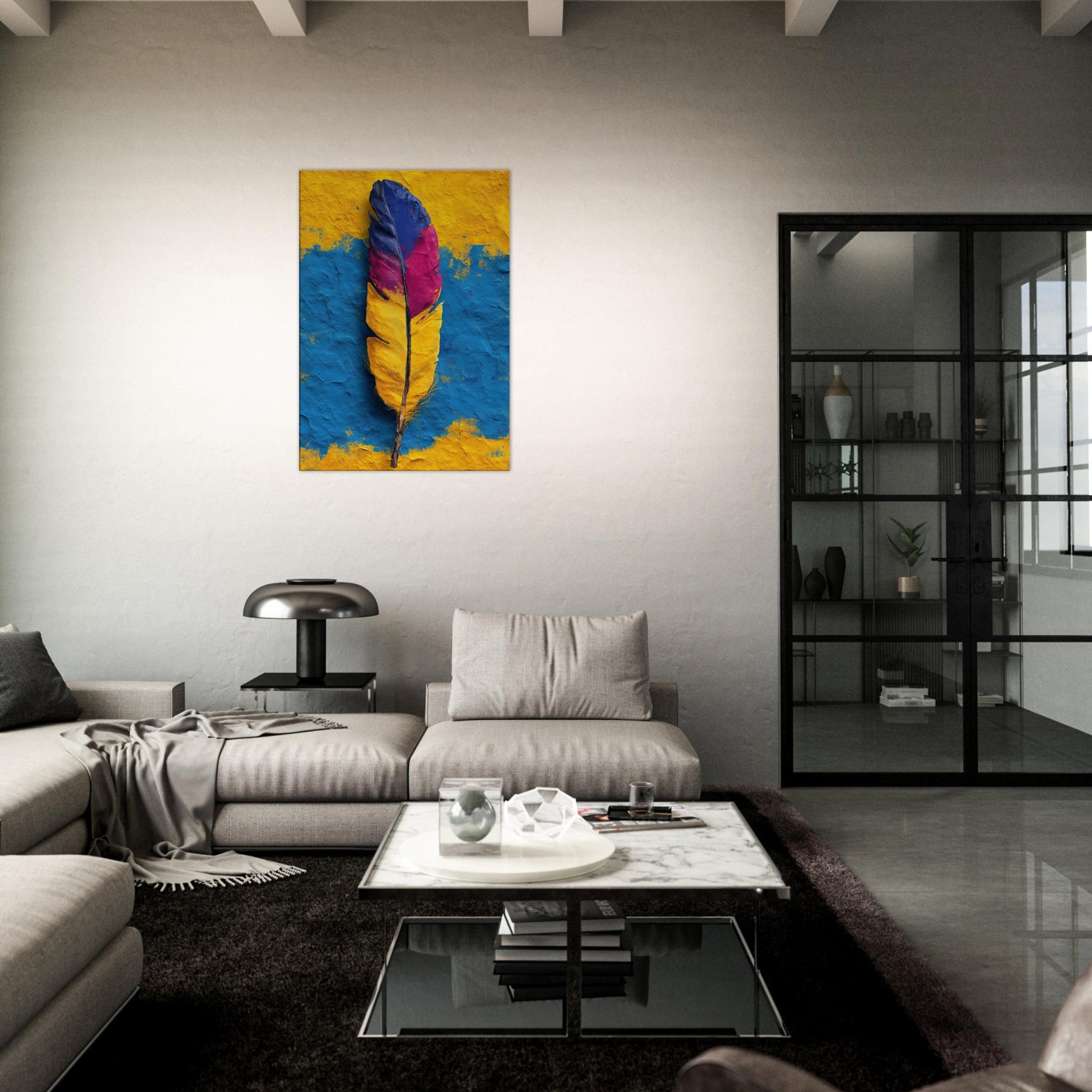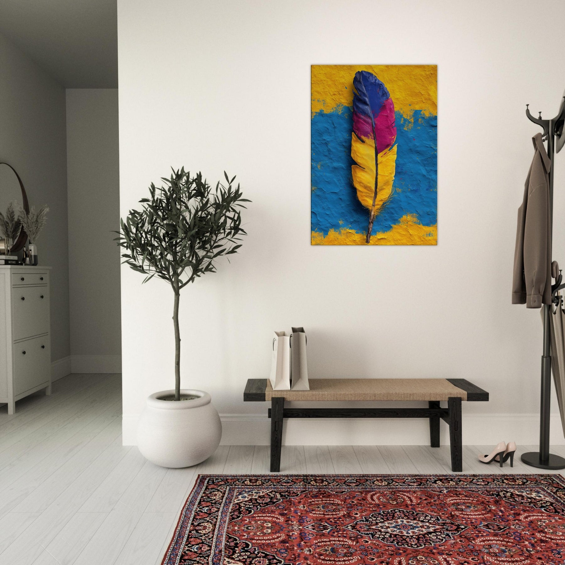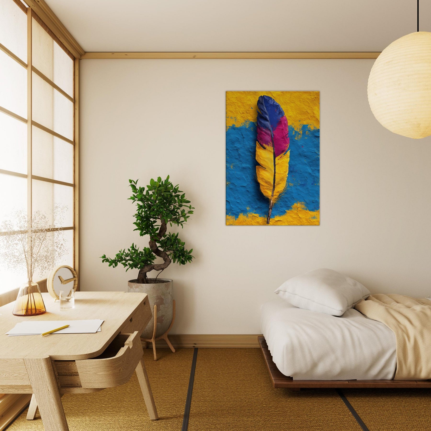 Feather Quill unfurls across a field of sunlit blues and warm yellows, its silhouette sculpted with confident strokes. This abstract meditation invites a room to breathe where the soft curve of the feather echoes a quiet rhythm, and the saturated hues awaken conversation at dusk. The Feather Quill becomes a muse for study nooks and living rooms alike, turning walls into a gallery of intention, memory, and possibility.