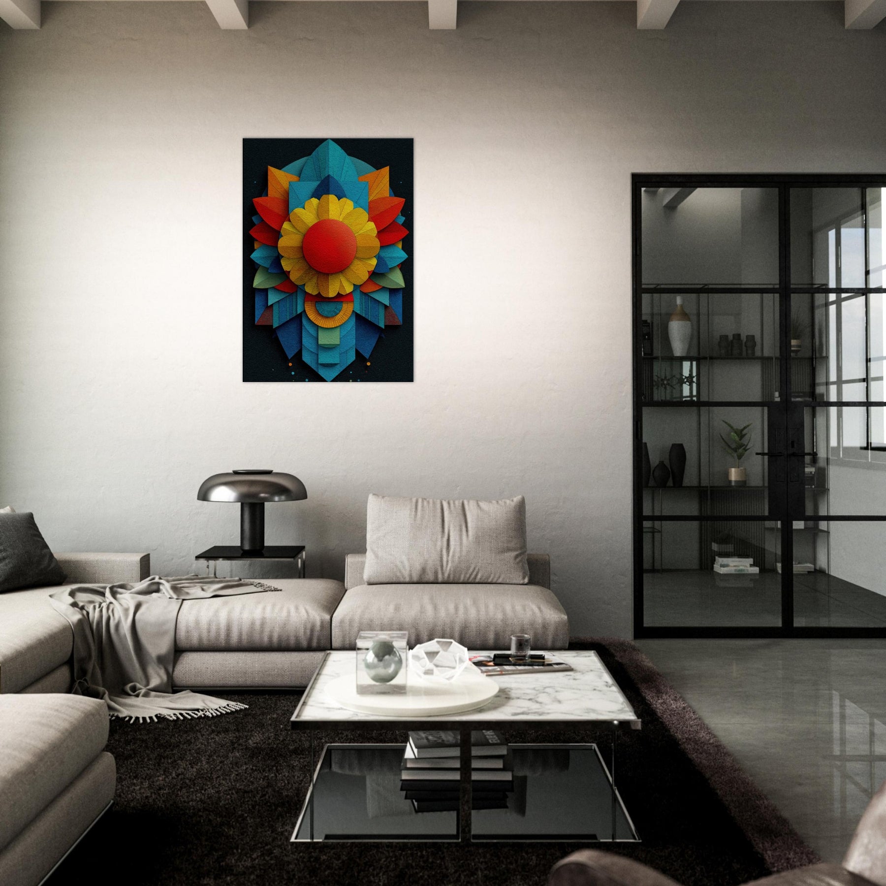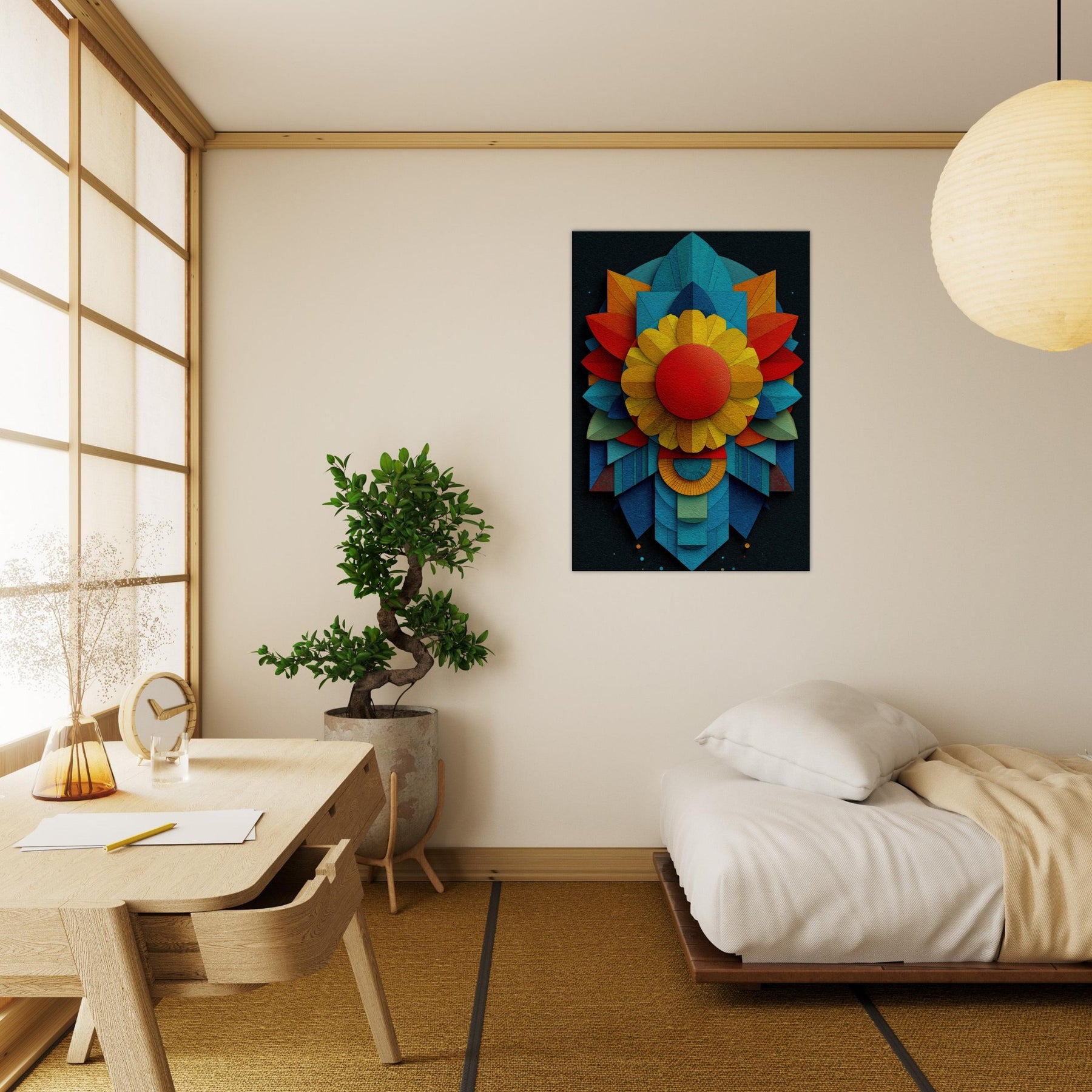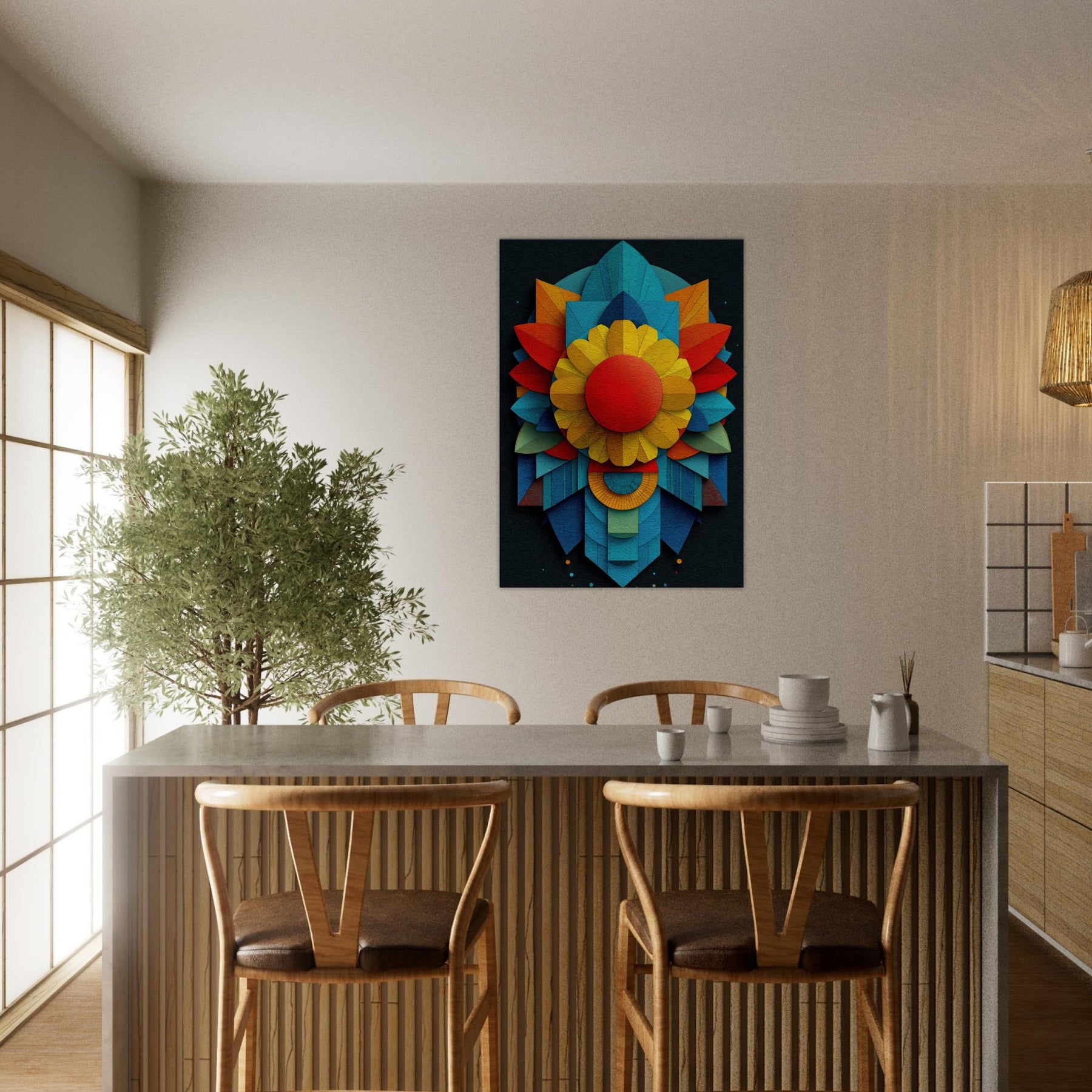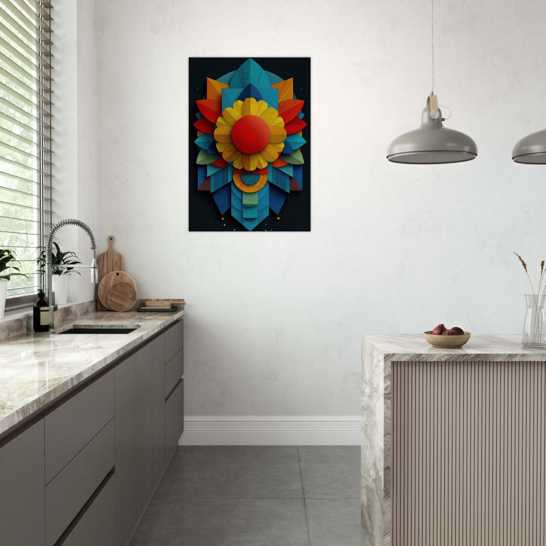 Let the Fruit of Life bloom at the heart of your space. This abstract composition unfurls in turquoise, saffron, and crimson, layering petals and geometric shards into a radiant halo. It exudes a soft, temple like glow that quiets conversations and invites quiet reflection. A mystical centerpiece for any living room, bedroom, or study, it reframes walls into a sanctuary of color and breath an energizing, comforting presence that elevates mood and imagination.