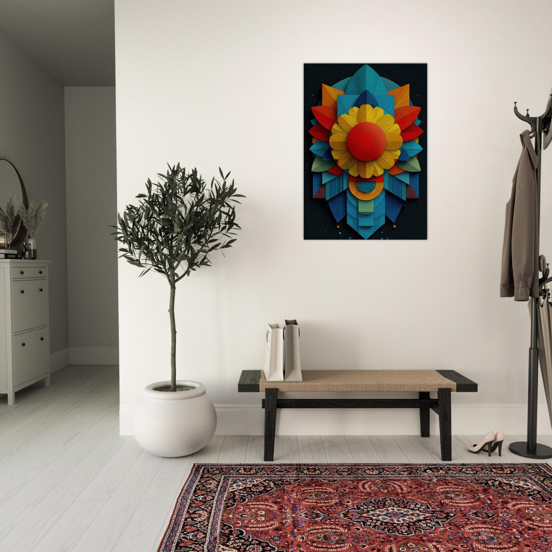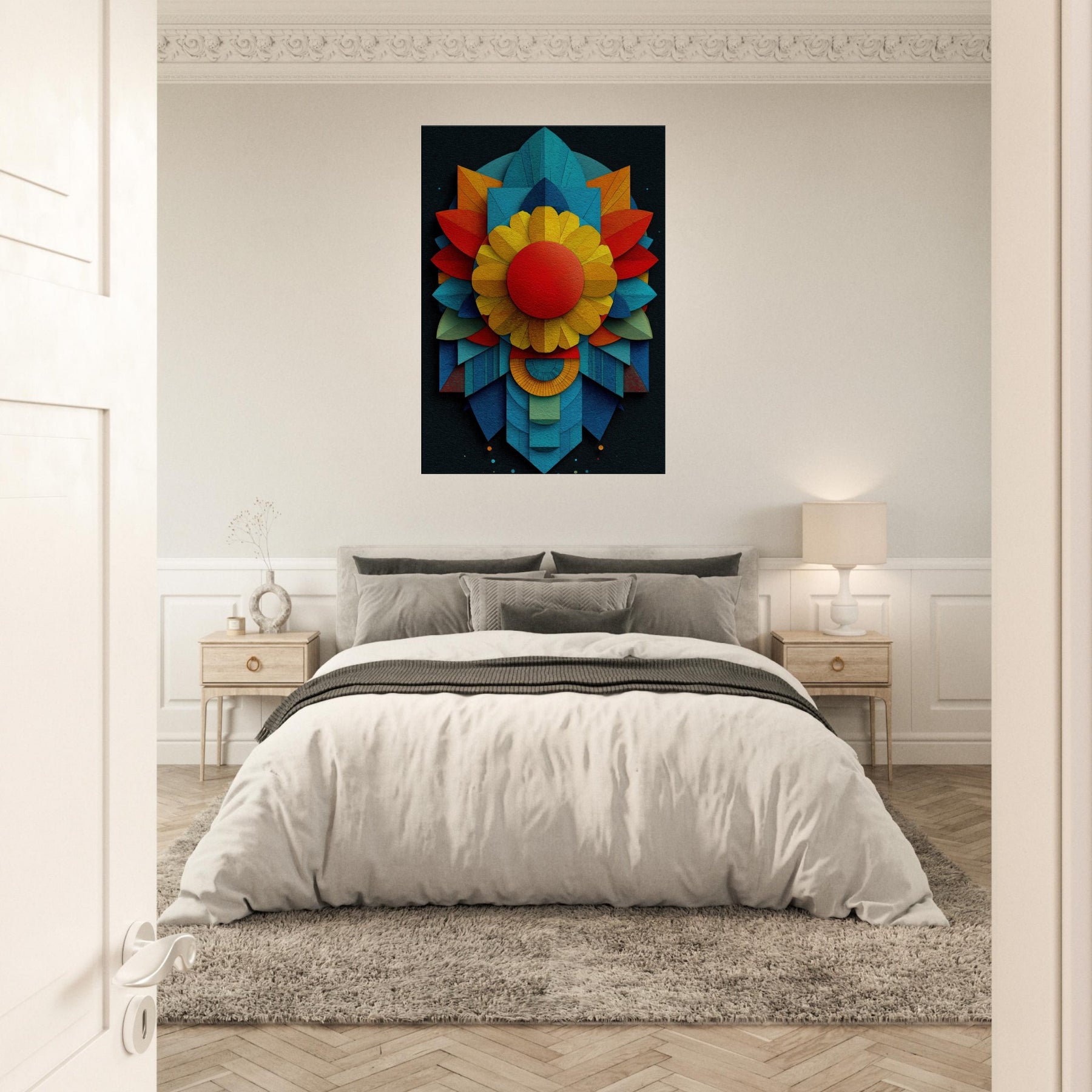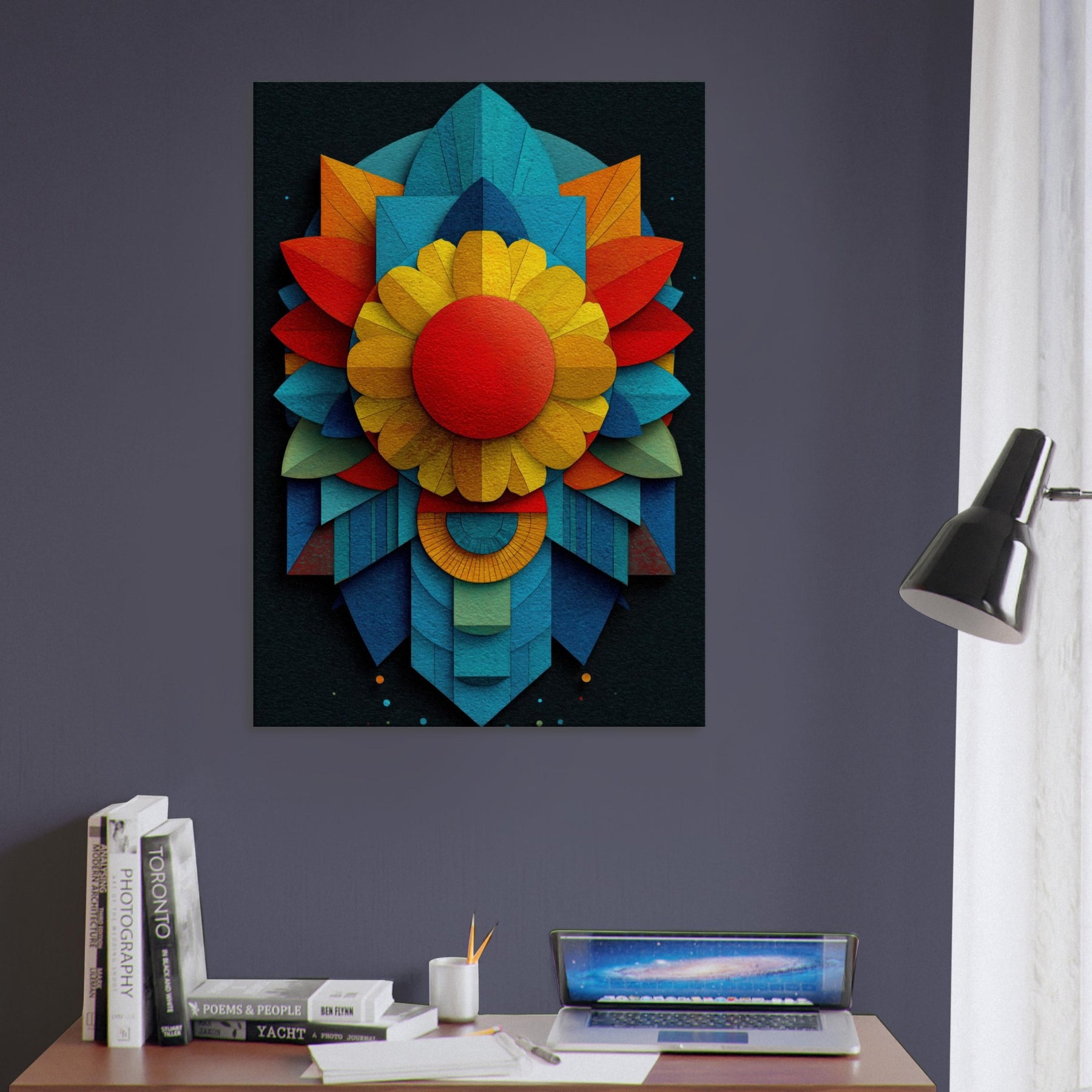 Let the Fruit of Life bloom at the heart of your space. This abstract composition unfurls in turquoise, saffron, and crimson, layering petals and geometric shards into a radiant halo. It exudes a soft, temple like glow that quiets conversations and invites quiet reflection. A mystical centerpiece for any living room, bedroom, or study, it reframes walls into a sanctuary of color and breath an energizing, comforting presence that elevates mood and imagination.