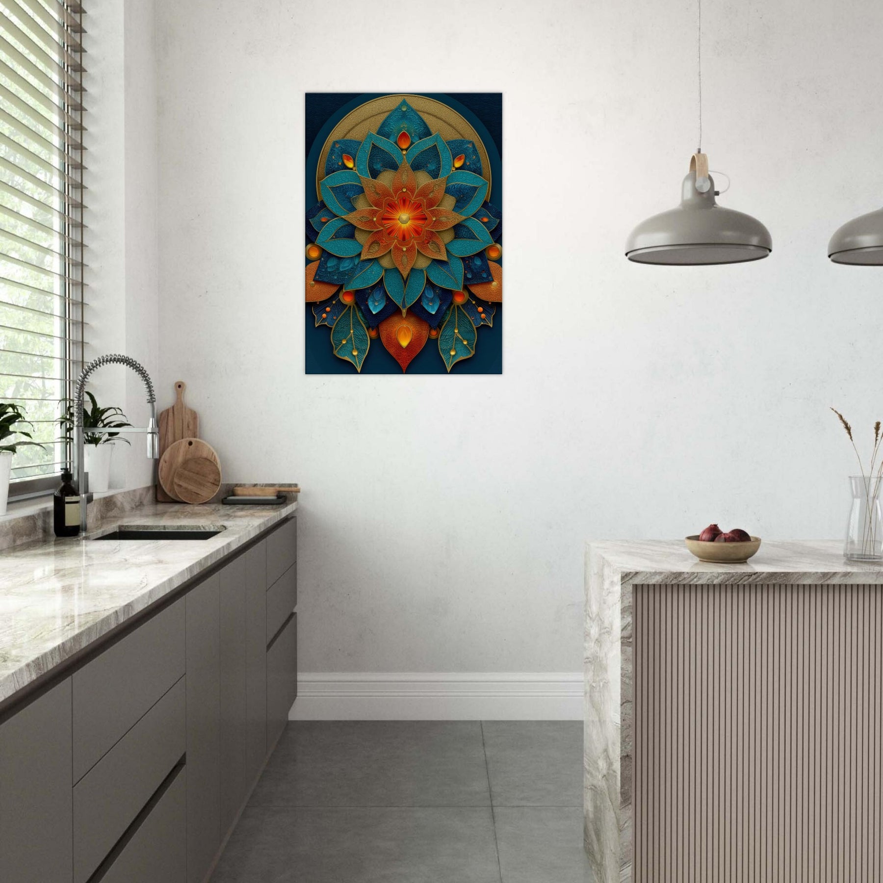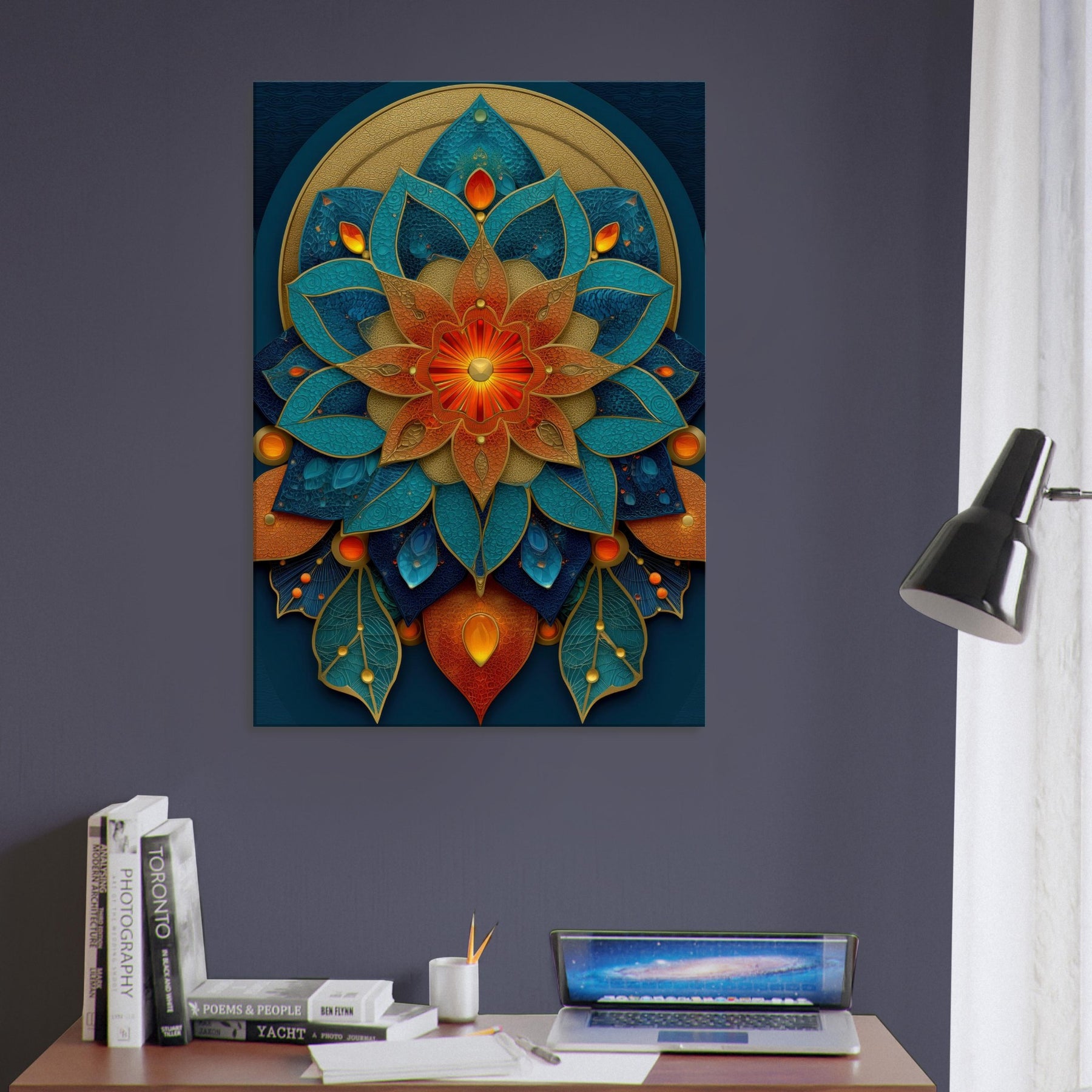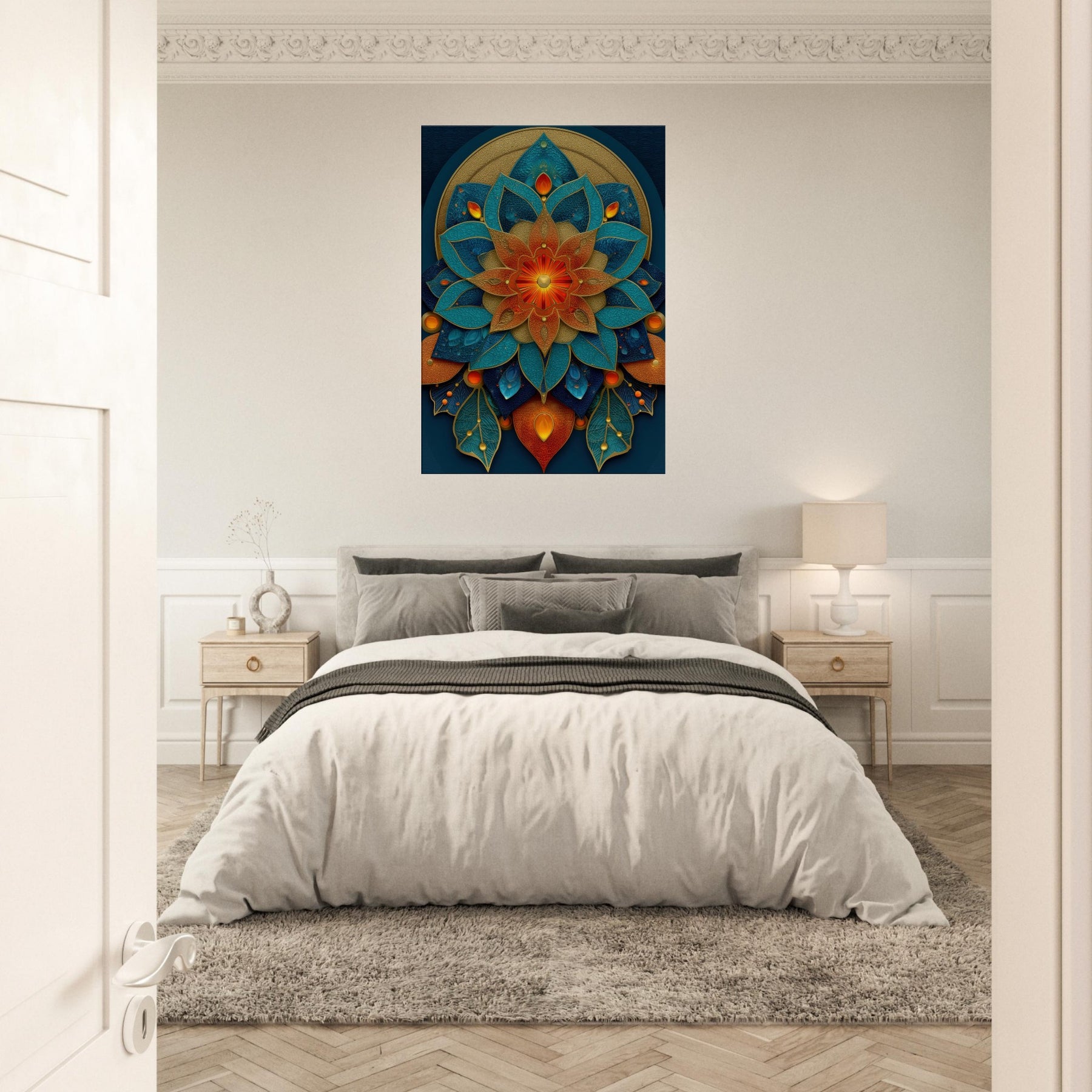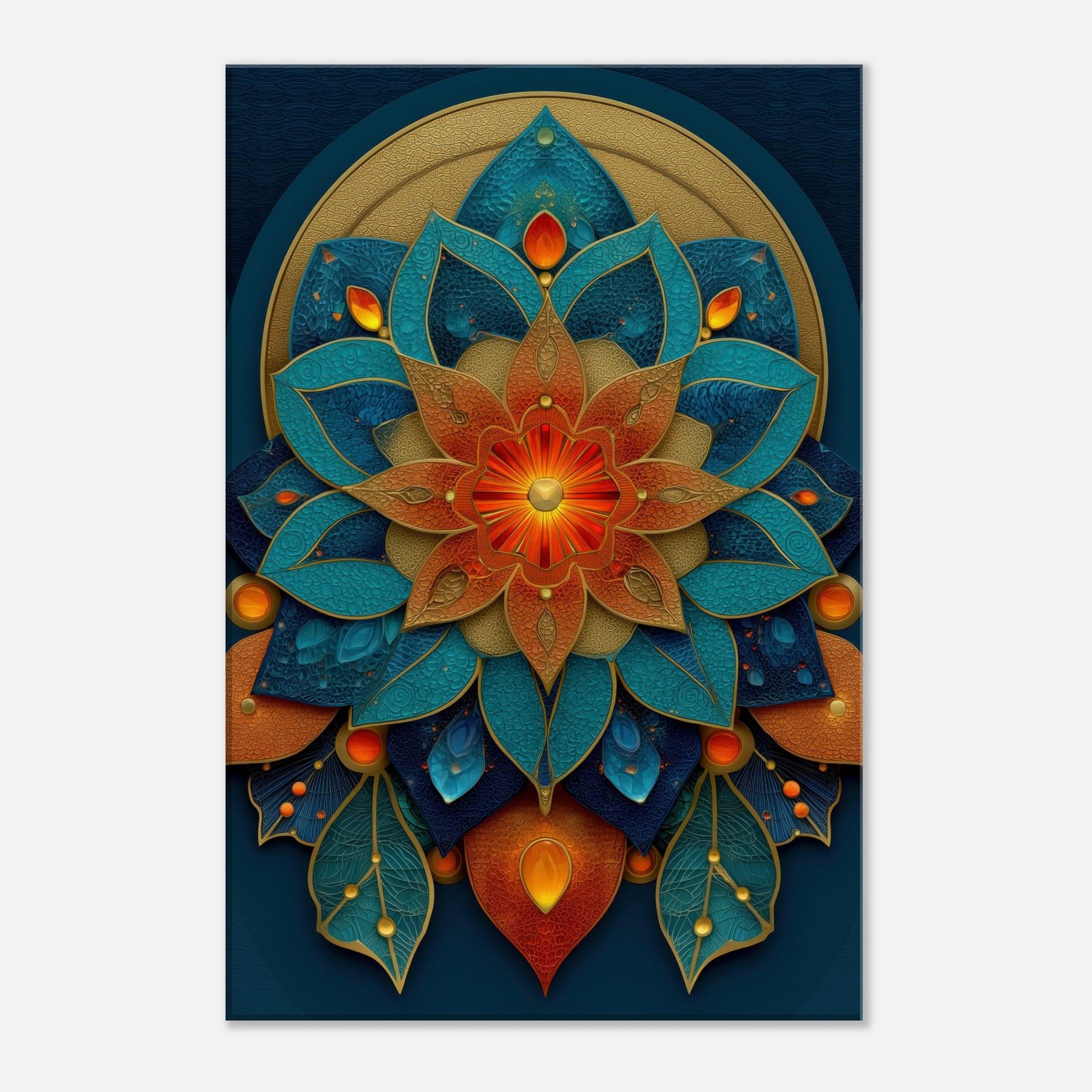 This Flower of Life composition unfolds as a luminous mandala, where petals in teal, azure, and copper layer over a velvet navy field. The piece hums with a mystical cadence, inviting daylight to pool along its edges and cast shifting metallic glints across the room. It anchors a meditation nook or refined living space, wrapping the space in quiet energy conscious, uplifting, and softly transformative. With tactile depth and radiant color, it turns every glance into a moment of wonder.