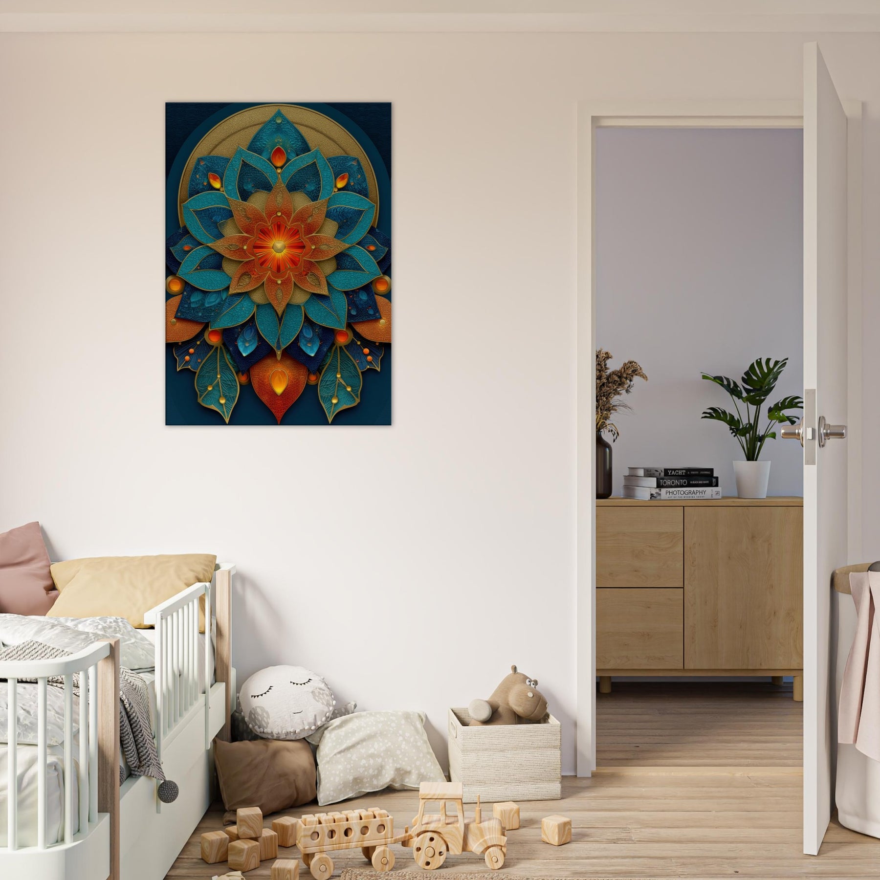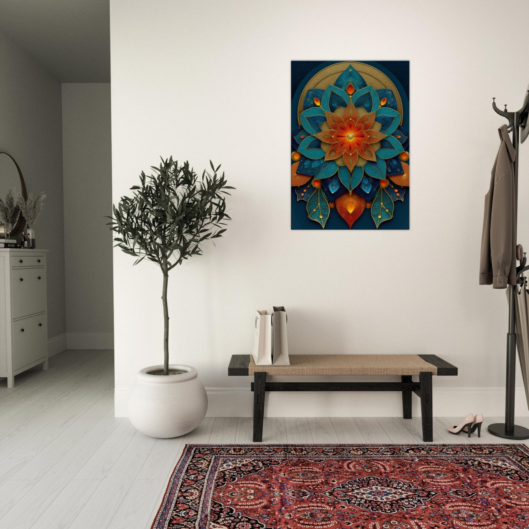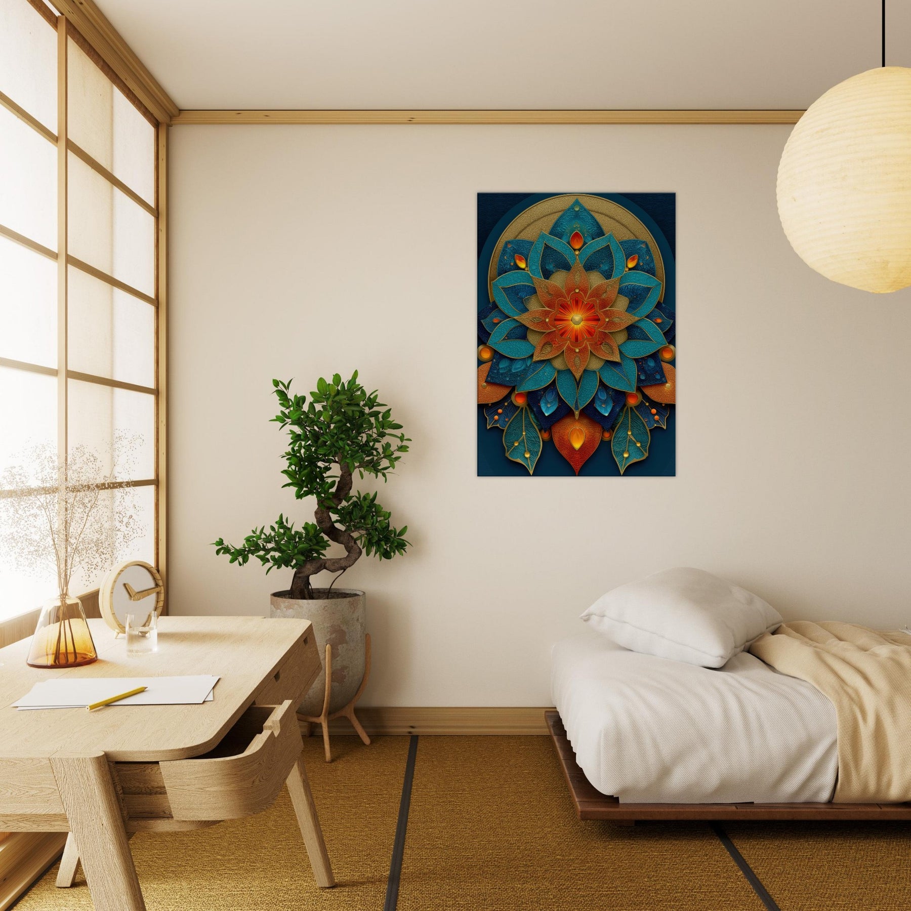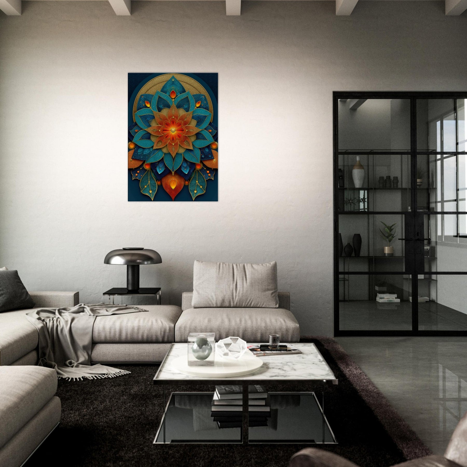 This Flower of Life composition unfolds as a luminous mandala, where petals in teal, azure, and copper layer over a velvet navy field. The piece hums with a mystical cadence, inviting daylight to pool along its edges and cast shifting metallic glints across the room. It anchors a meditation nook or refined living space, wrapping the space in quiet energy conscious, uplifting, and softly transformative. With tactile depth and radiant color, it turns every glance into a moment of wonder.