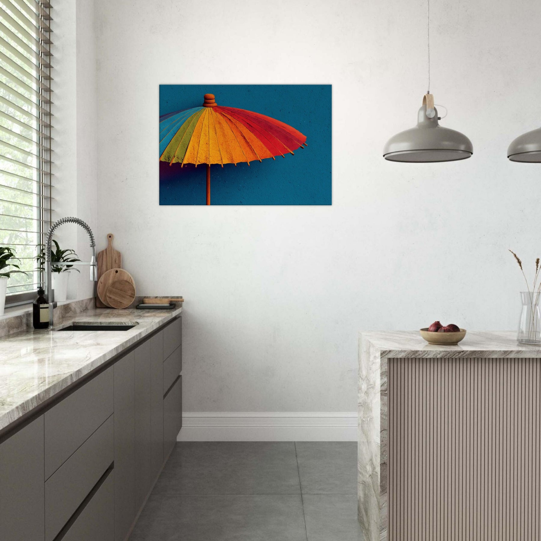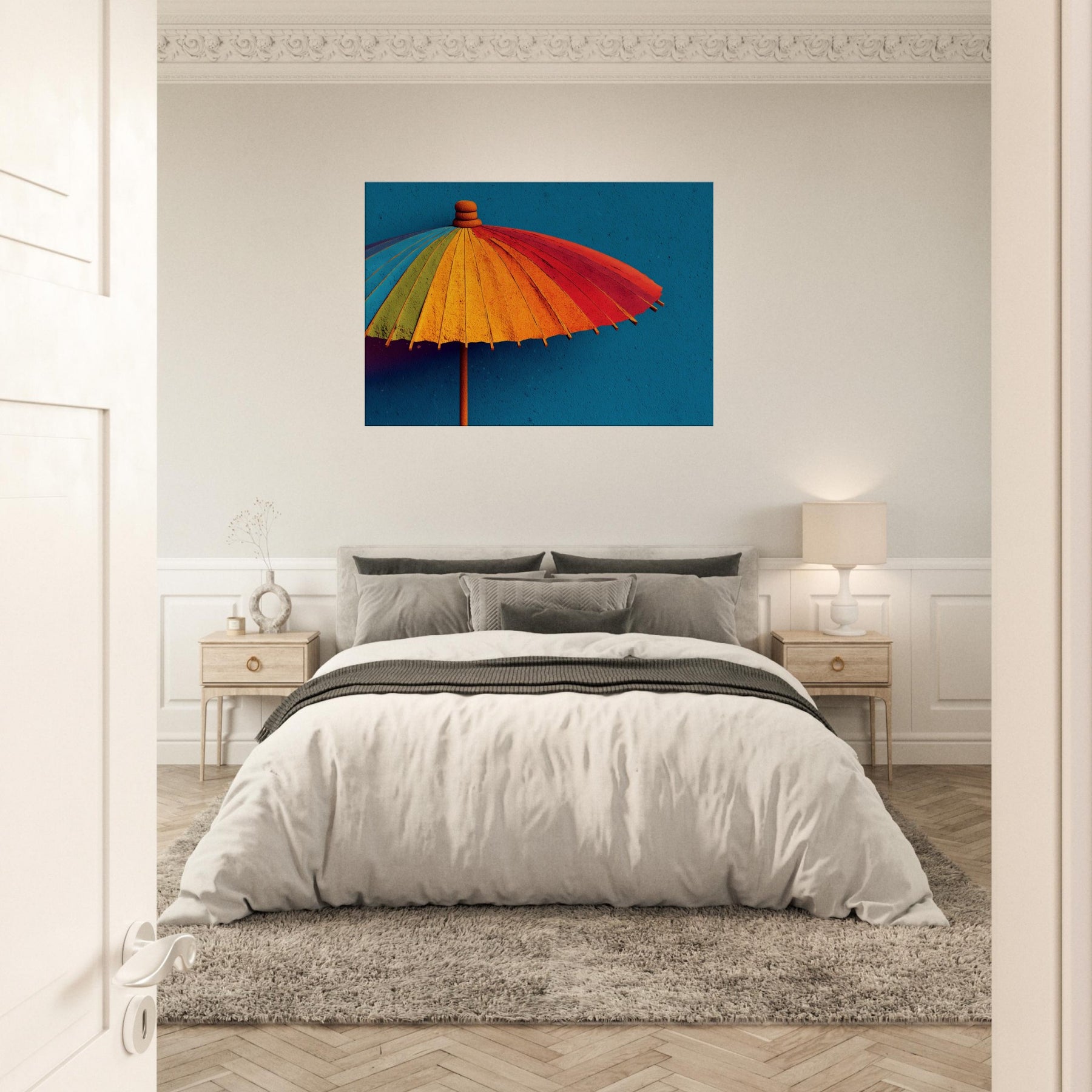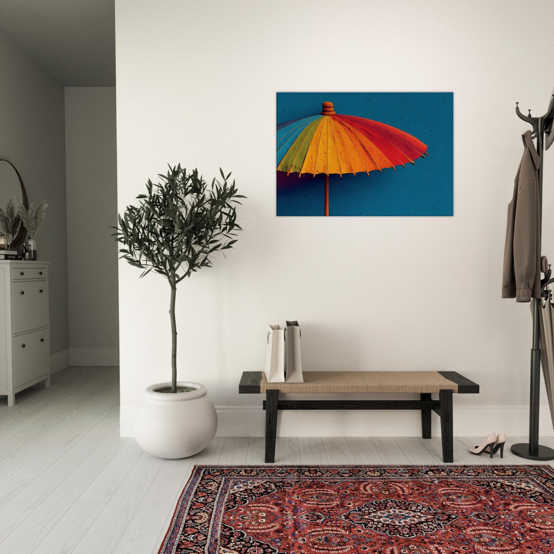 Let your space breathe with this Paper Umbrella, a playful study in color, light, and form. The piece unfurls a spectrum across the panel like a sunlit canopy, inviting the eye to drift from lime to tangerine, then rest on a deep cerulean backdrop. It feels both joyful and serene a compact mood booster that pairs with white walls or warm wood. Hang it in a living room, corridor, or bedroom to spark conversation and cast a gentle, colorful glow throughout the room.
