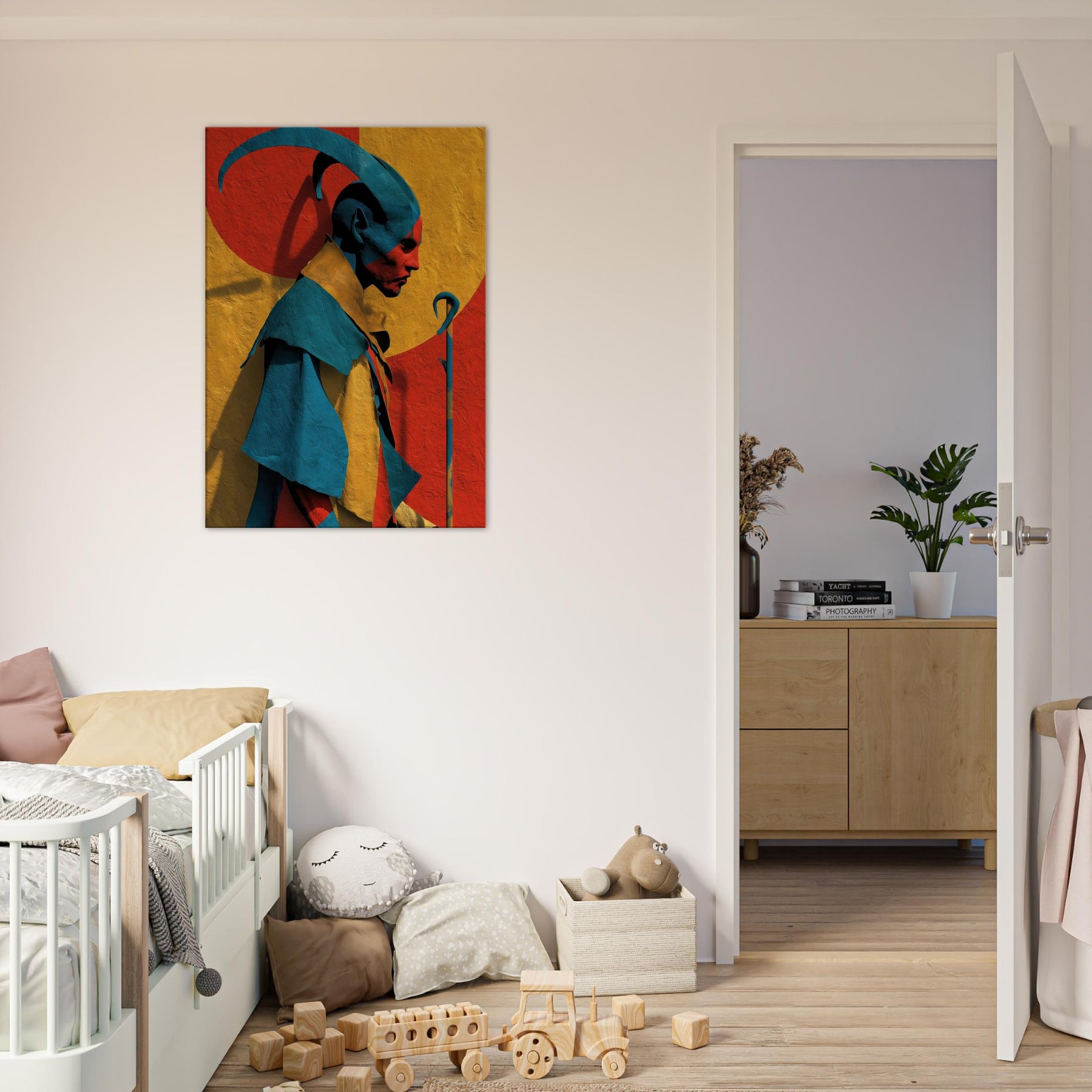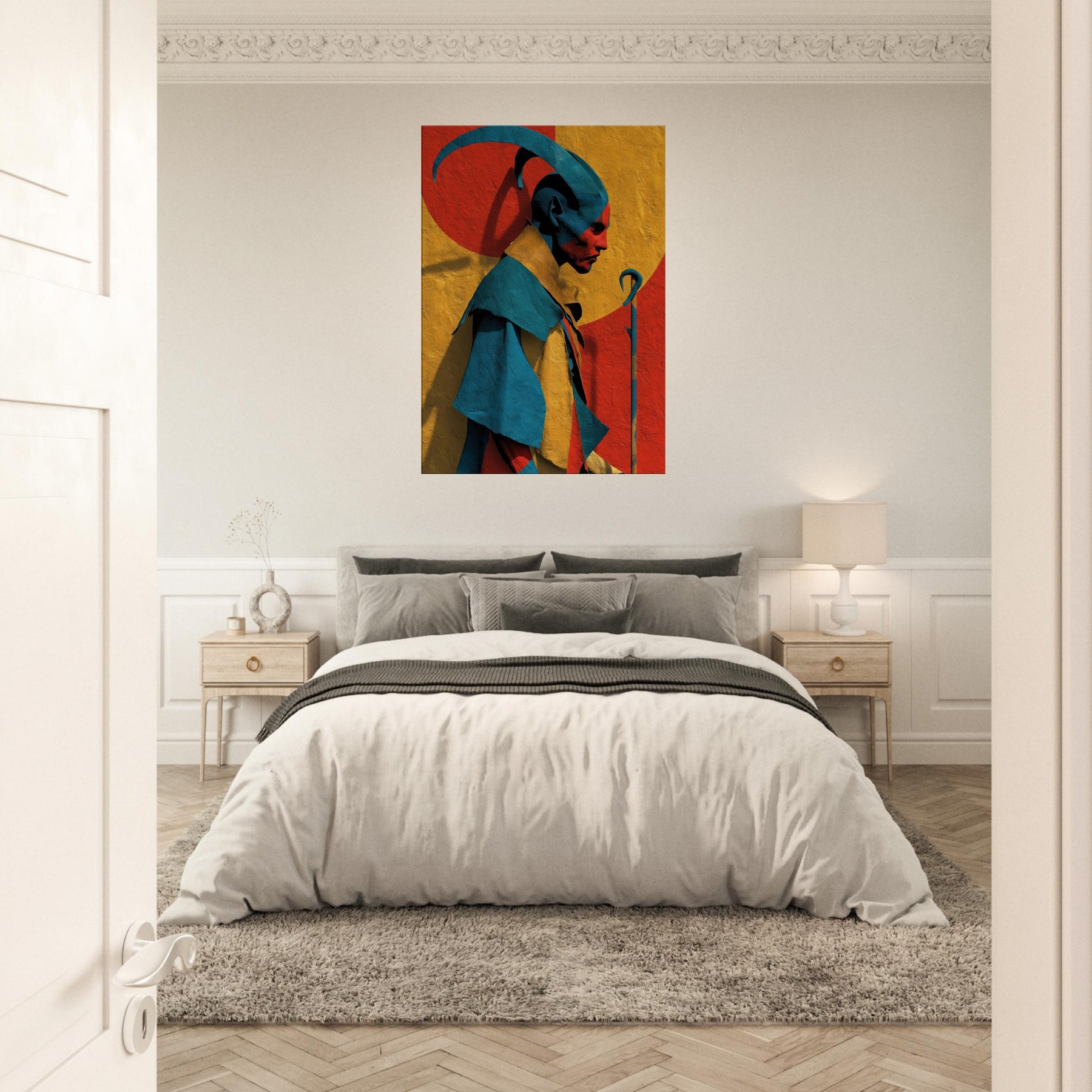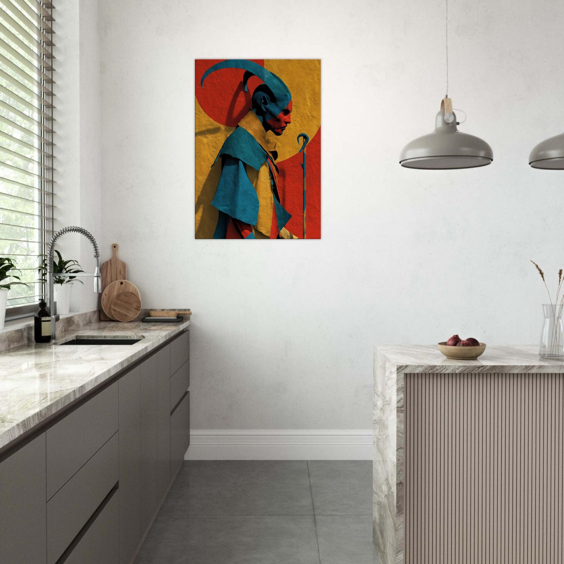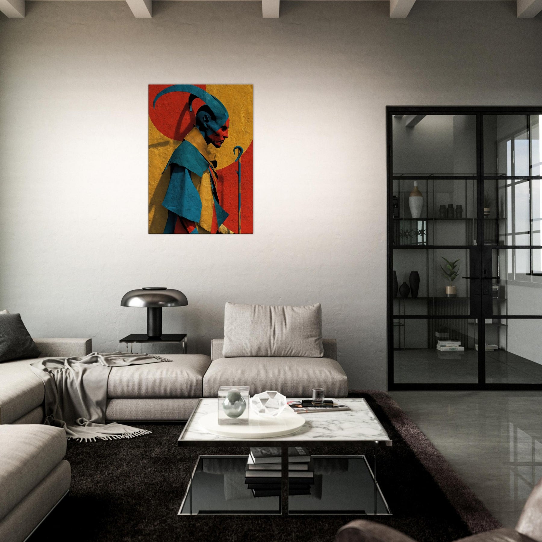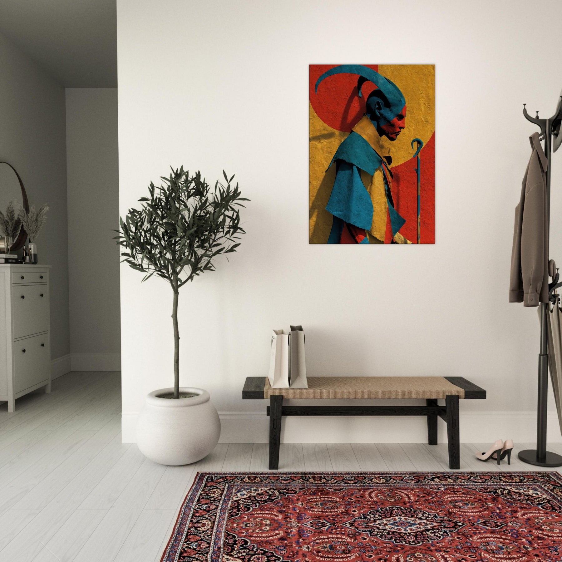 Ra strides through a riot of color in this abstract reverie, where torn blues and sunlit yellows collide against a warm red backdrop. The figure carries a mythic gravity, crowned by a curling arc that reads as a solar halo. Texture seems almost palpable the crumpled fabric, the rough plaster, the soft shadow that drifts behind the form inviting a tactile, slow gaze. This piece breathes warmth into any room, turning walls into a stage for imagination. In a living space, it becomes a quiet beacon of myth, color, and timeless presence.
