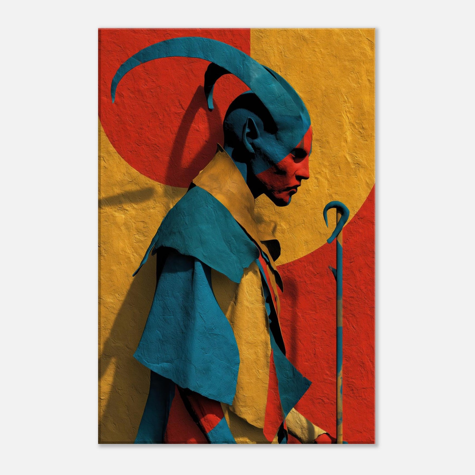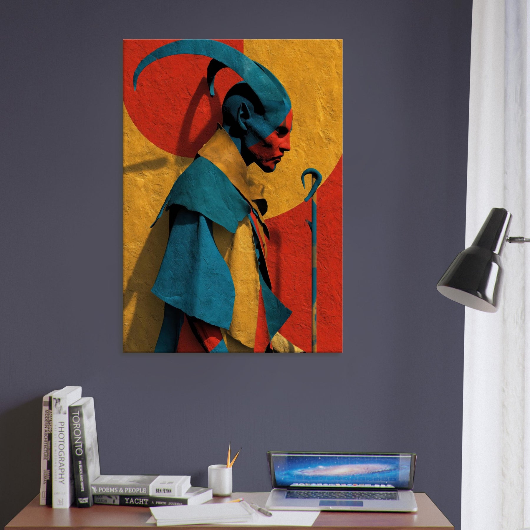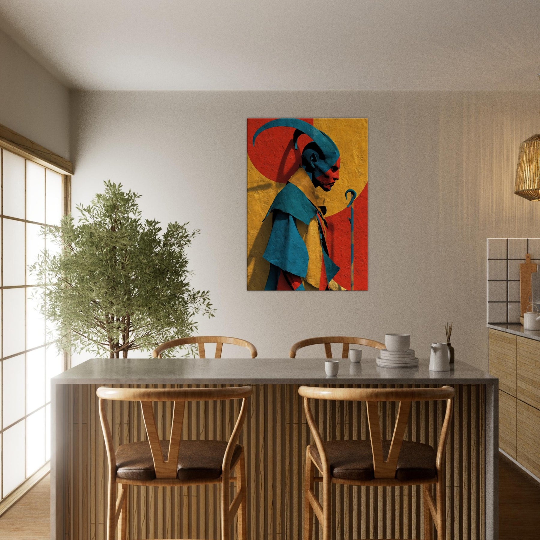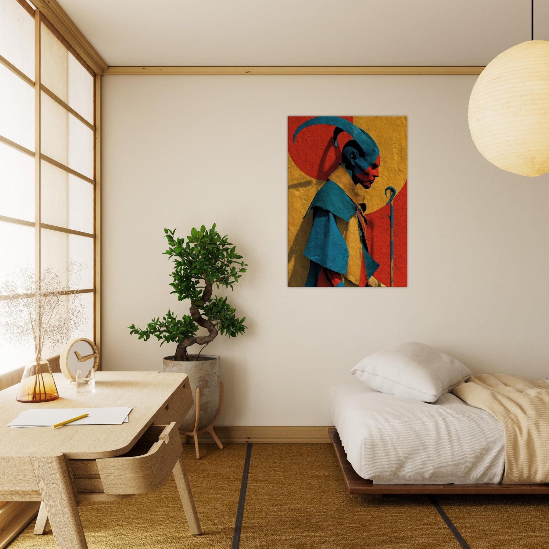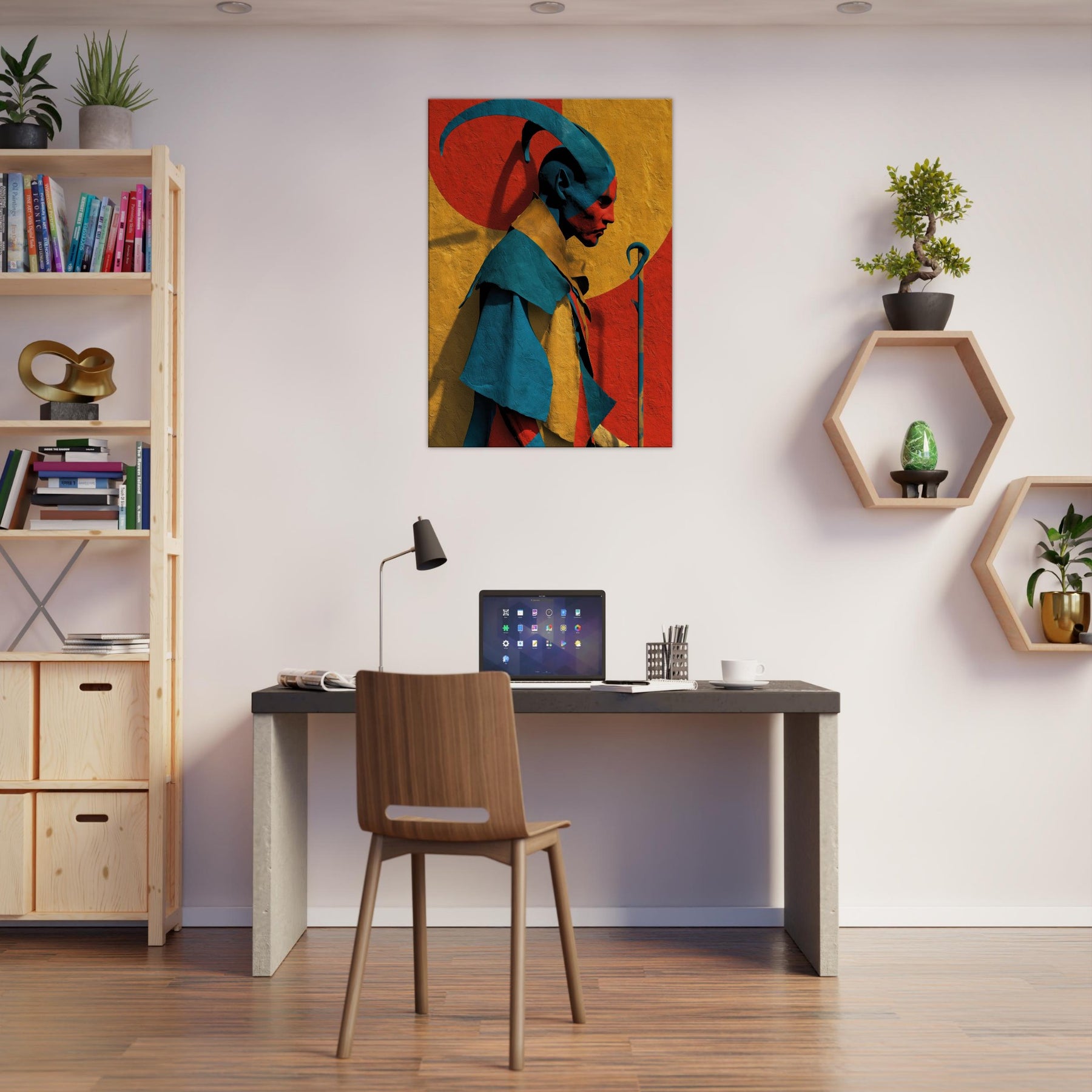 Ra strides through a riot of color in this abstract reverie, where torn blues and sunlit yellows collide against a warm red backdrop. The figure carries a mythic gravity, crowned by a curling arc that reads as a solar halo. Texture seems almost palpable the crumpled fabric, the rough plaster, the soft shadow that drifts behind the form inviting a tactile, slow gaze. This piece breathes warmth into any room, turning walls into a stage for imagination. In a living space, it becomes a quiet beacon of myth, color, and timeless presence.