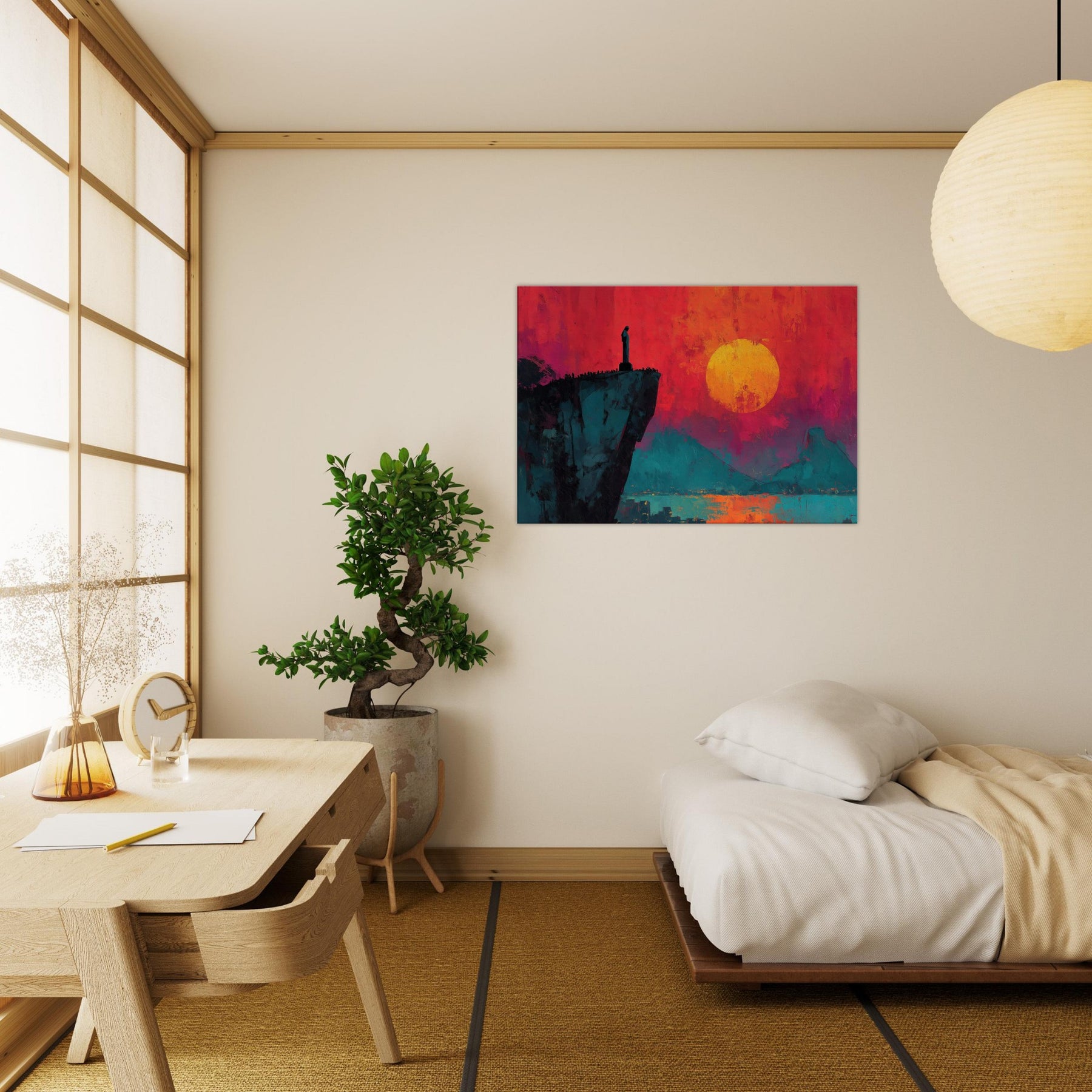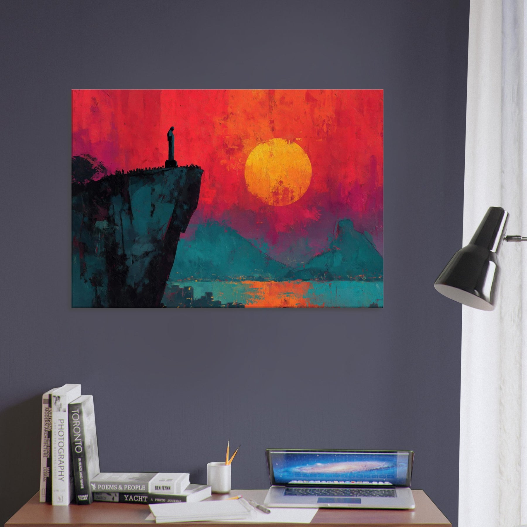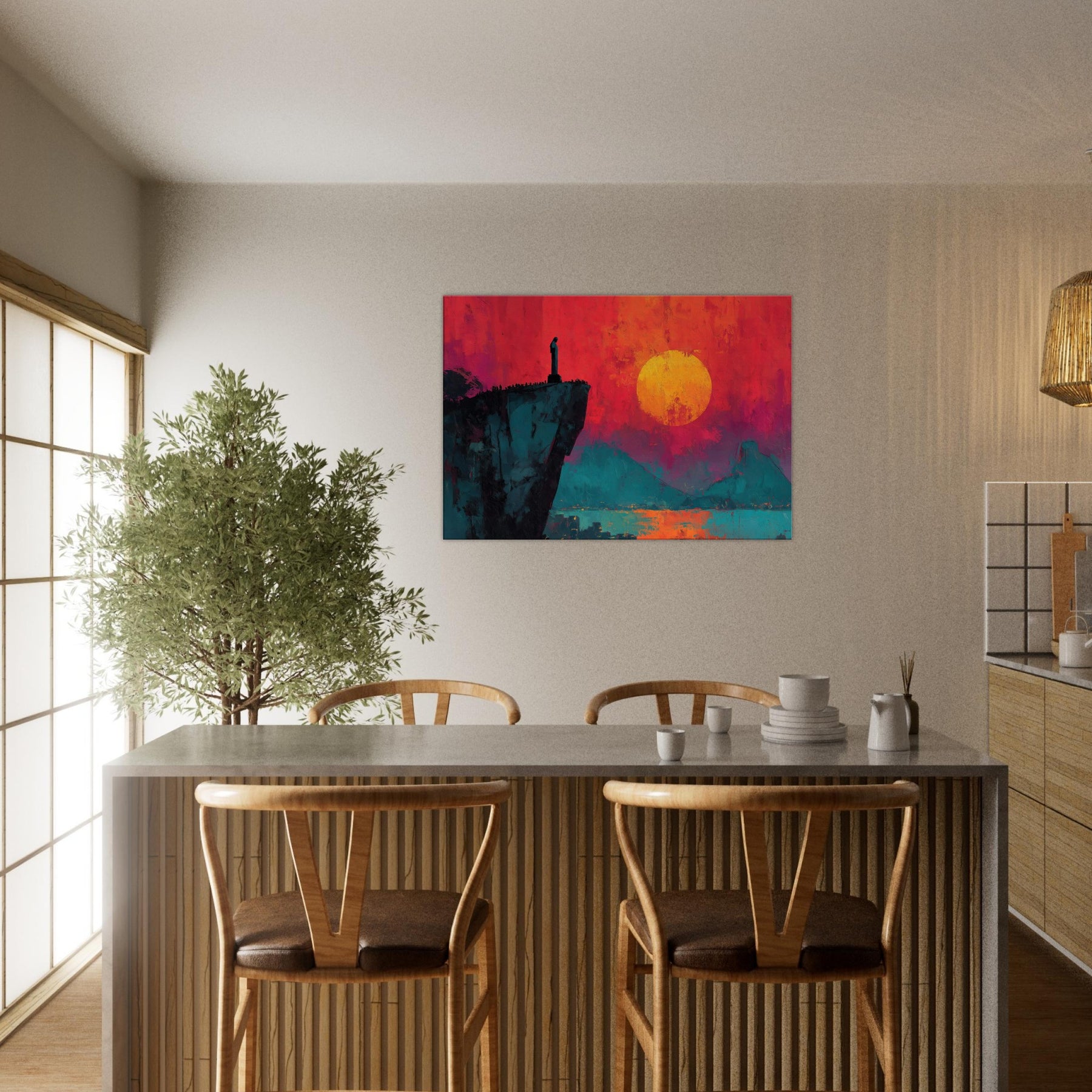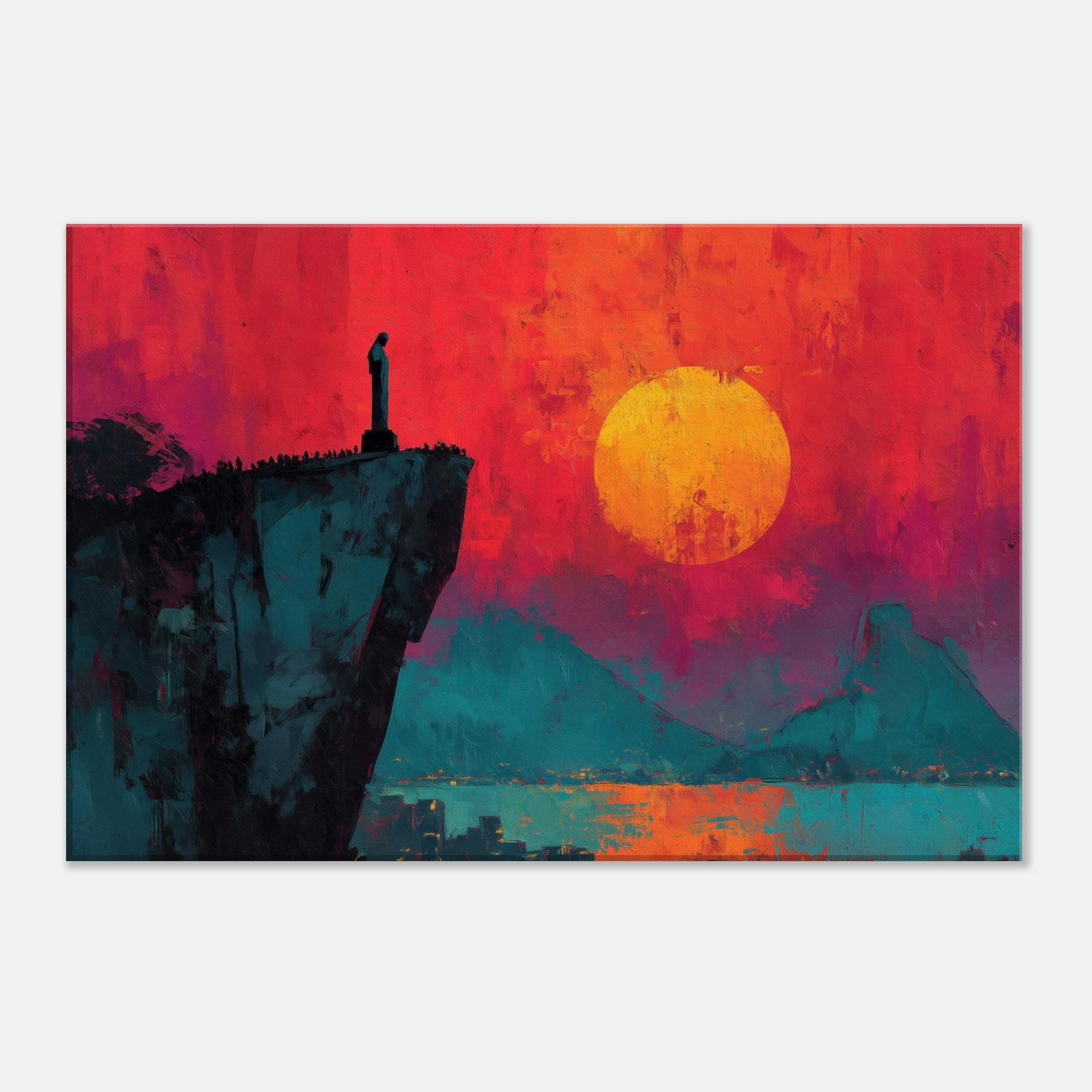Rio De Janeiro unfurls in bold silence on a cliff's edge, where a solitary figure watches a burning sunset. This abstract panorama blends electric magentas, teal shadows, and a molten sun to craft a room transforming atmosphere. The composition invites slow, cinematic moments, turning a living space into a coastline of memory and possibility. Hang it beside a sofa or desk to infuse warmth, depth, and the city's magnetic pulse into daily life.
