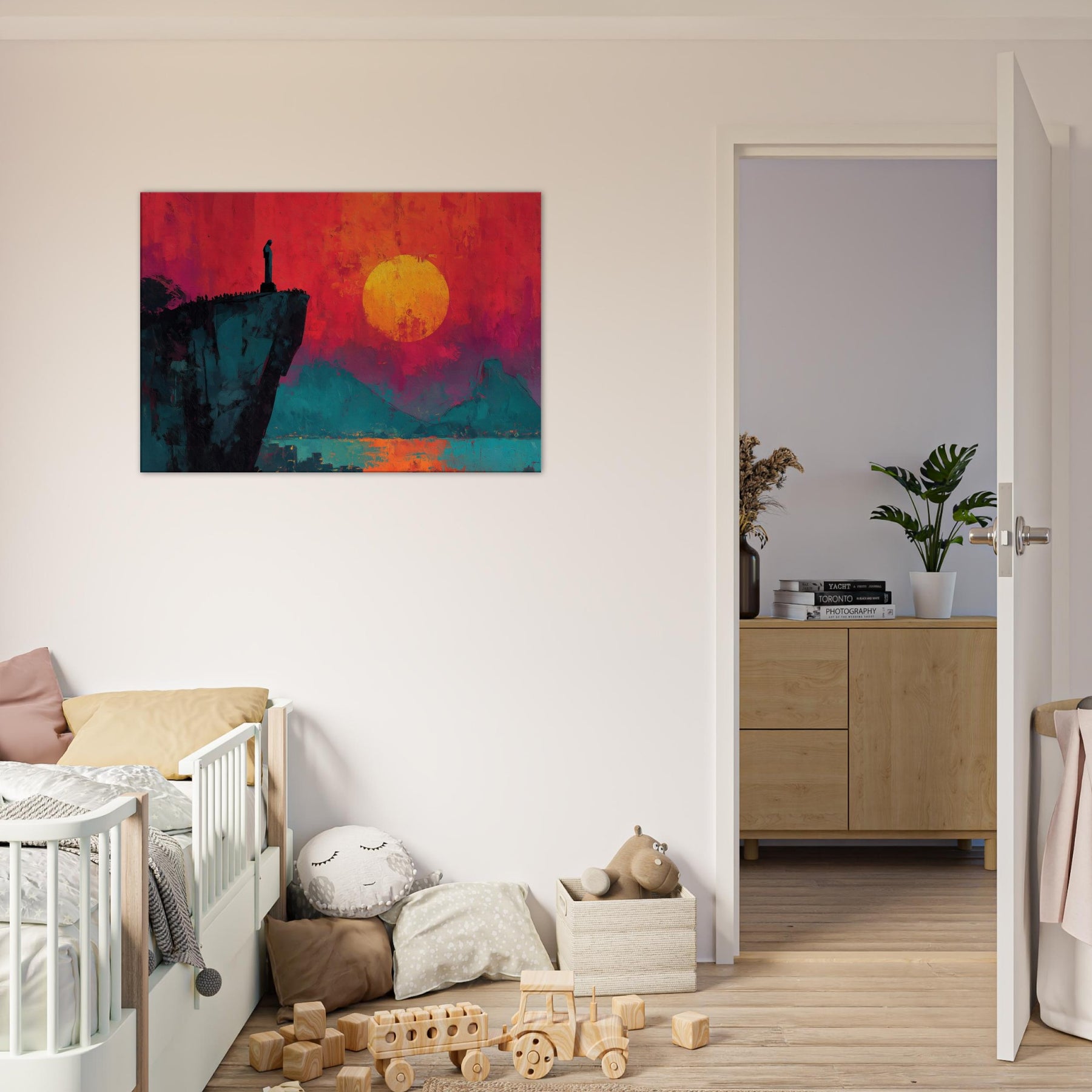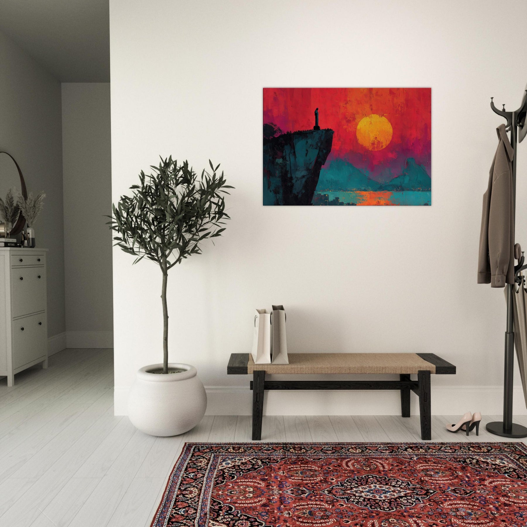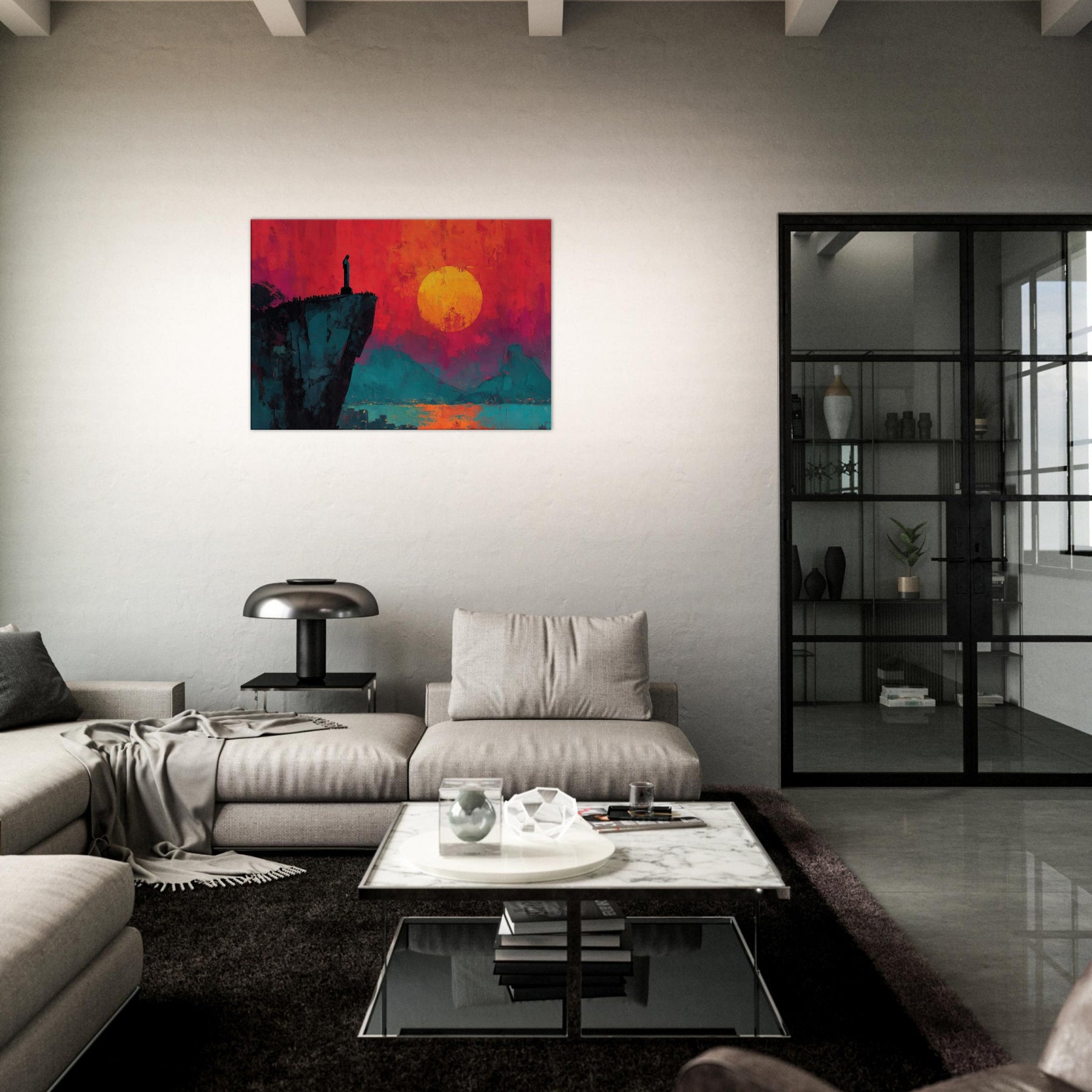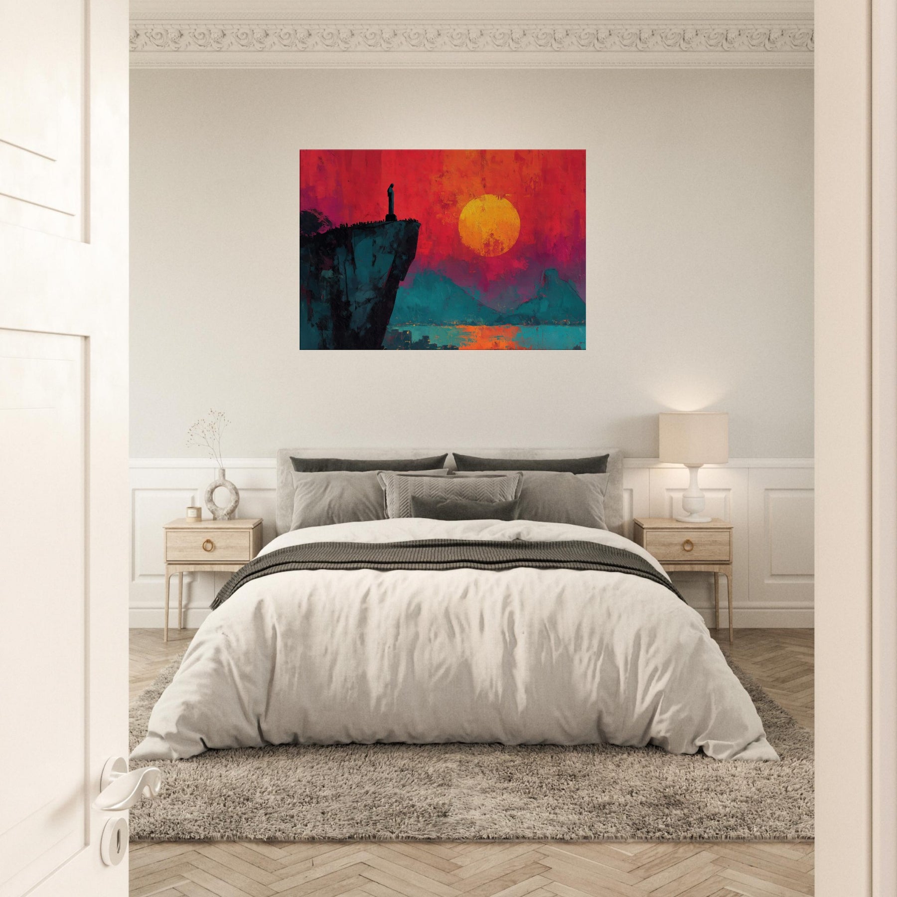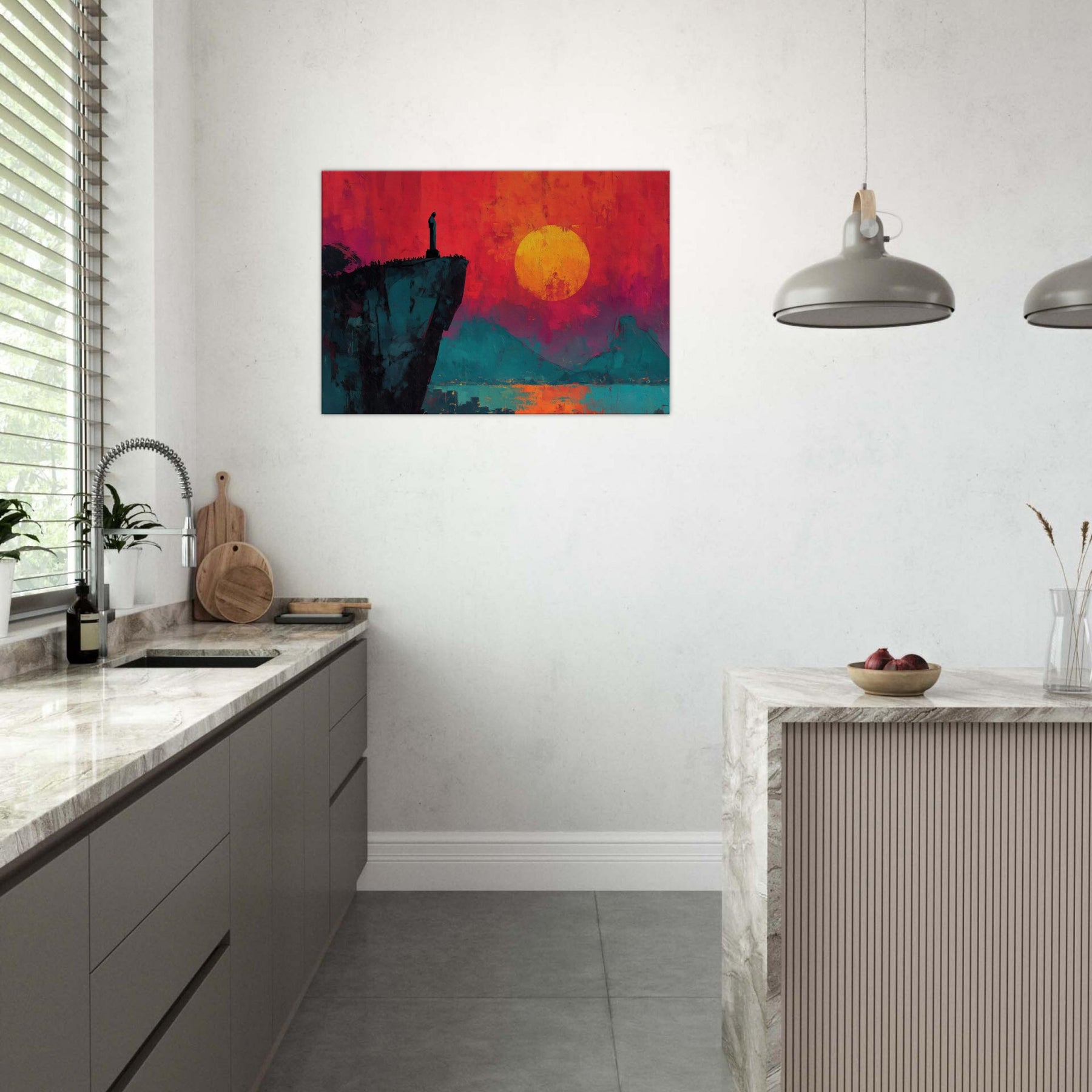 Rio De Janeiro unfurls in bold silence on a cliff's edge, where a solitary figure watches a burning sunset. This abstract panorama blends electric magentas, teal shadows, and a molten sun to craft a room transforming atmosphere. The composition invites slow, cinematic moments, turning a living space into a coastline of memory and possibility. Hang it beside a sofa or desk to infuse warmth, depth, and the city's magnetic pulse into daily life.