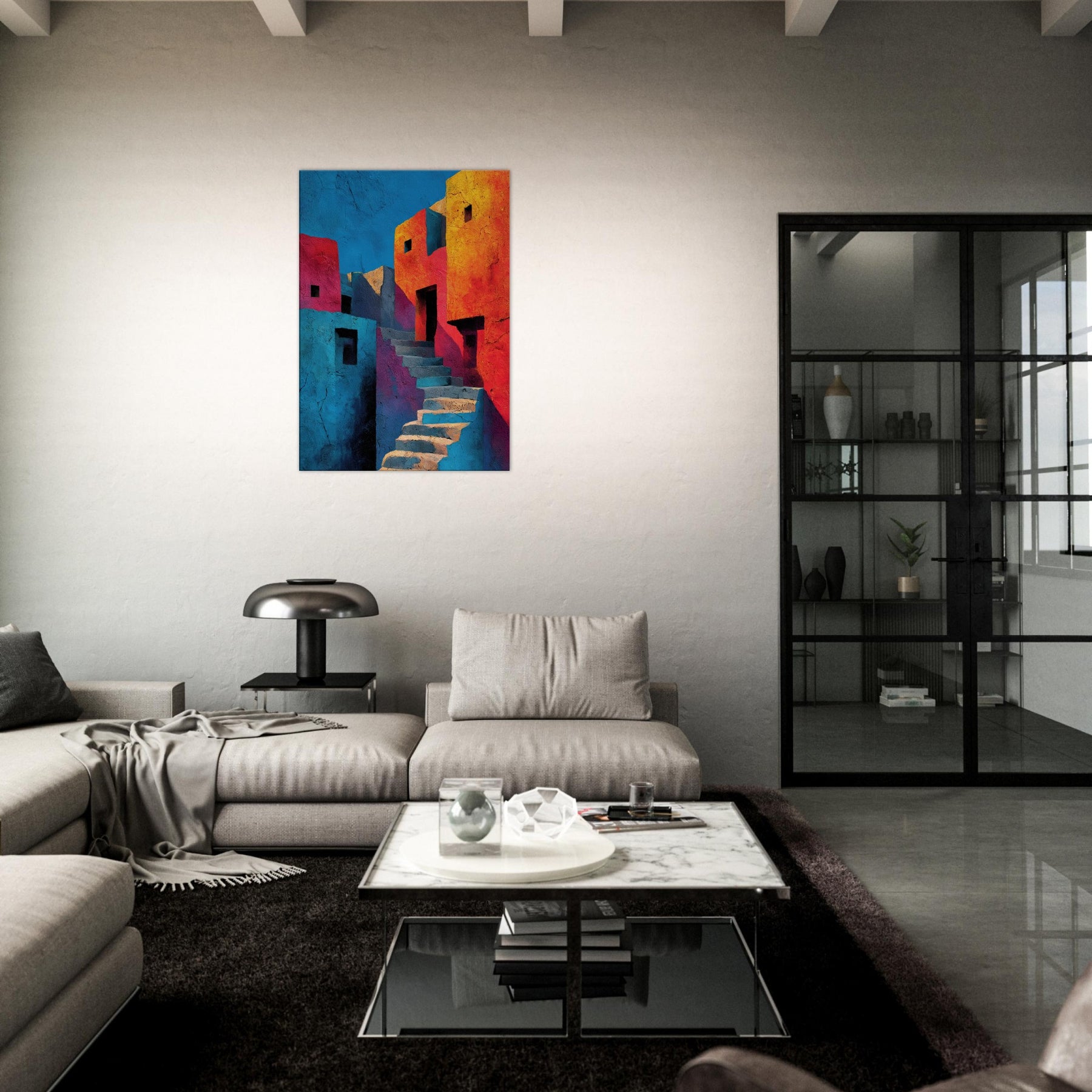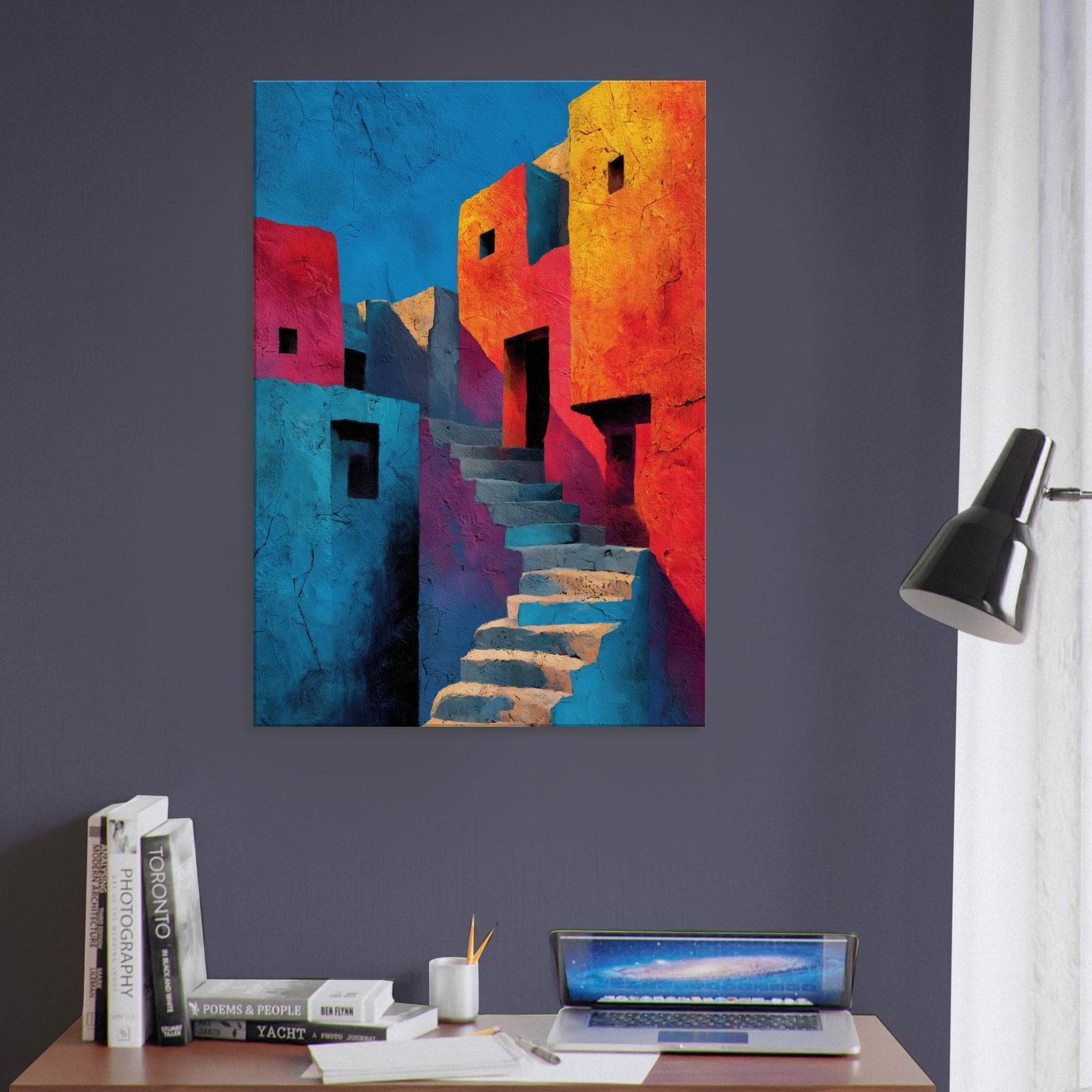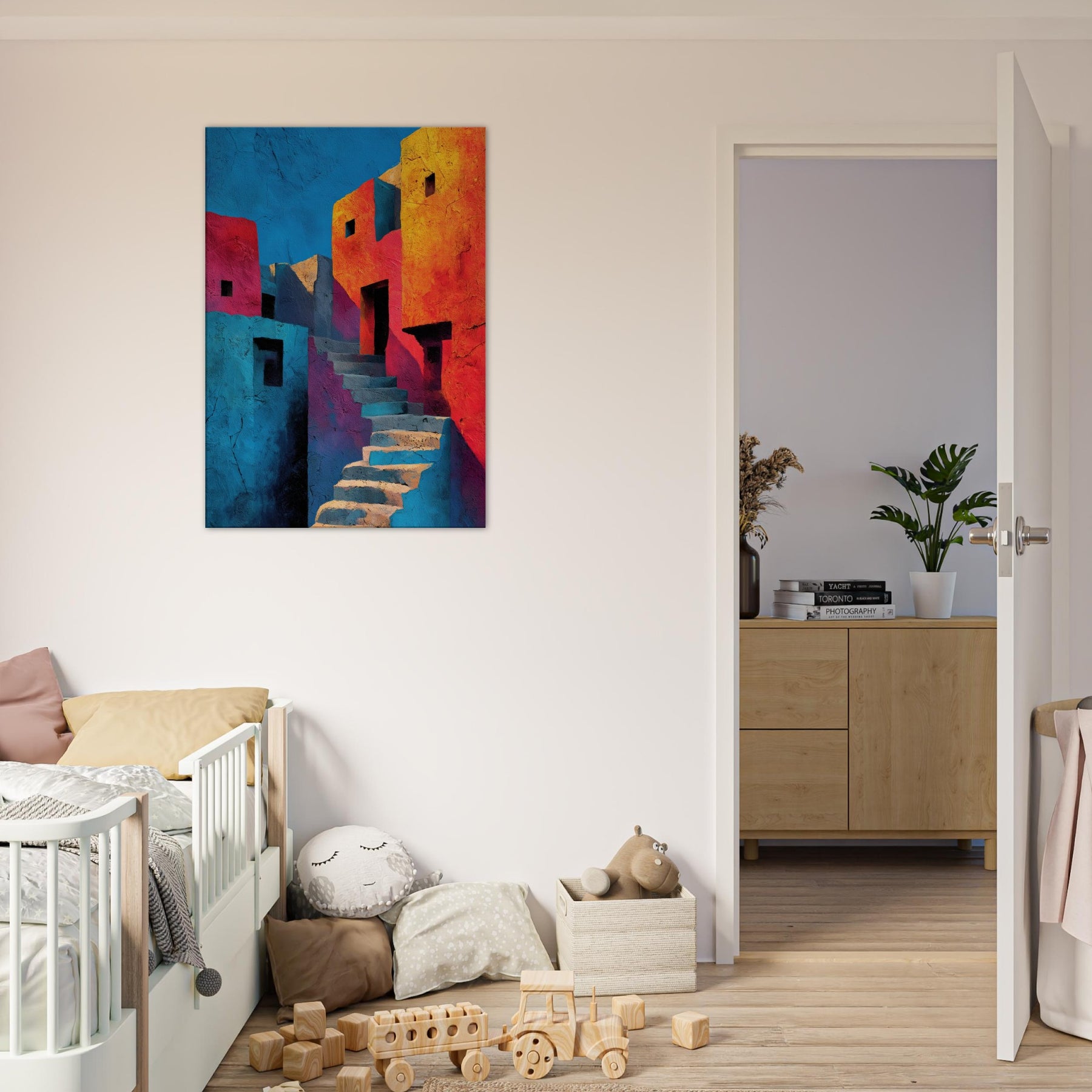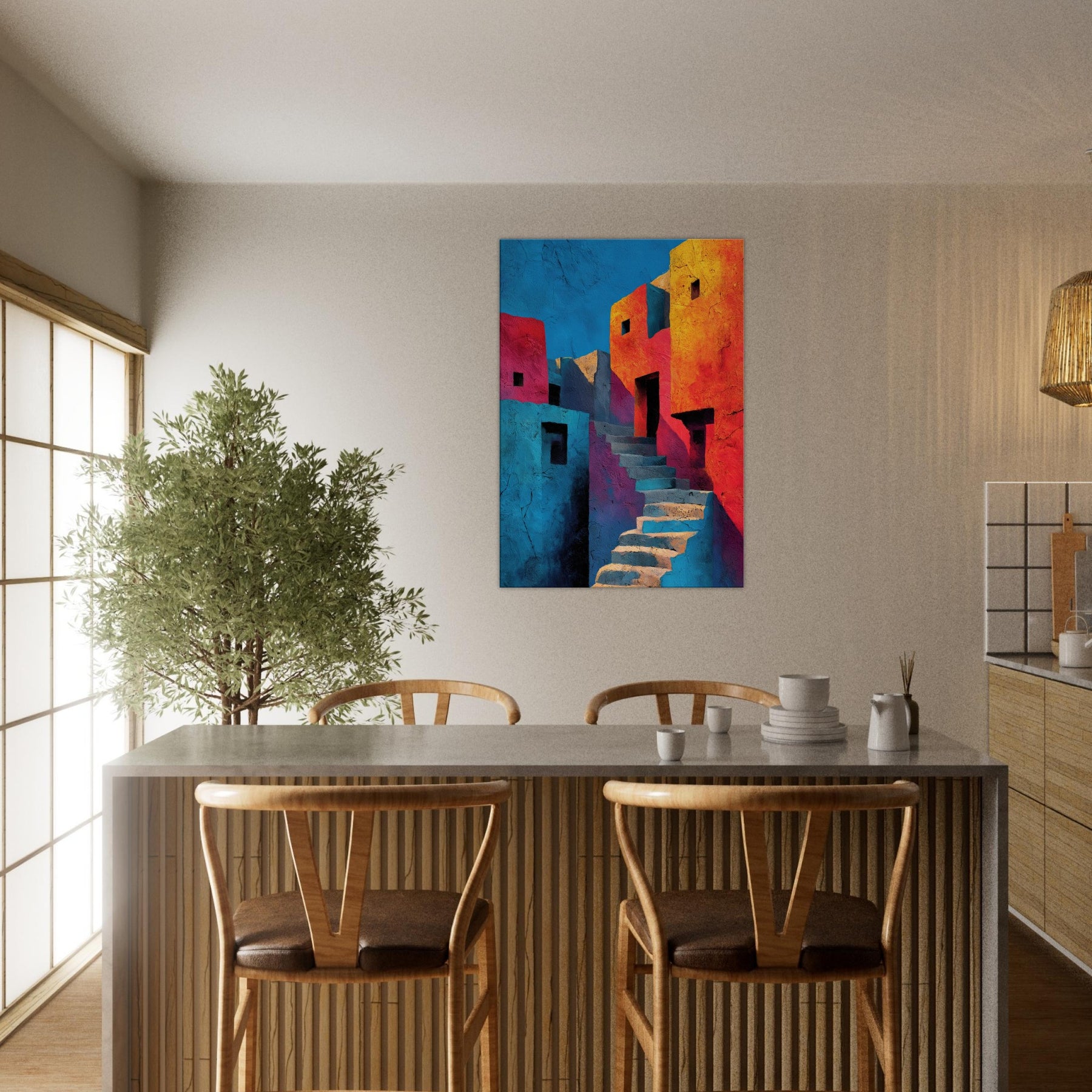 Let Rome unfold across your wall in a riot of color and quiet form. This bold abstract scene invites the eye to wander through sunlit stairways and blocky facades, turning city memory into a sensorial experience warm yellows, deep corals, and cool cerulean that hum with life. The piece casts a vibrant atmosphere that elevates living spaces, offering a daily escape into timeless streets and architectural poetry. A statement work that pairs urban memory with modern serenity in your home.