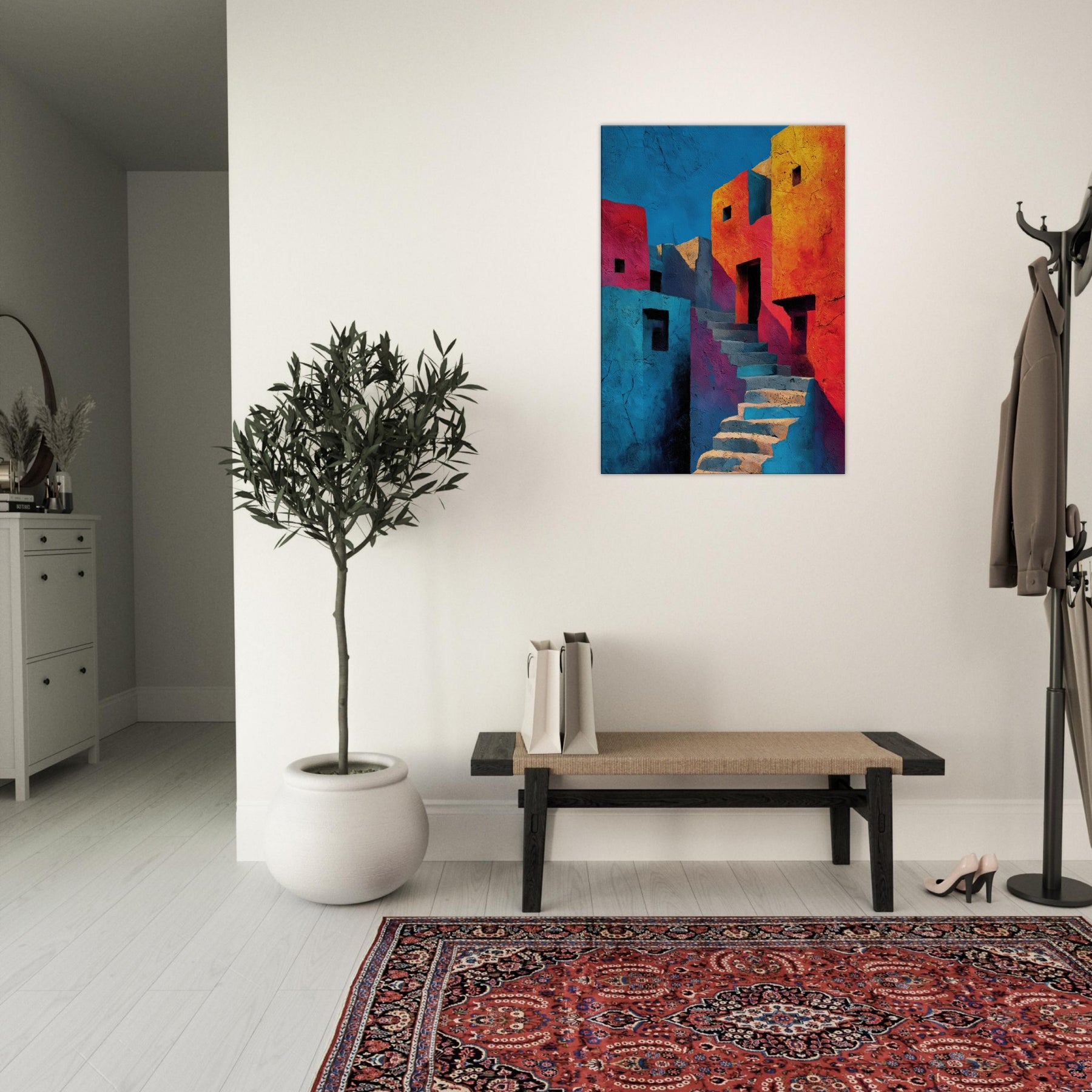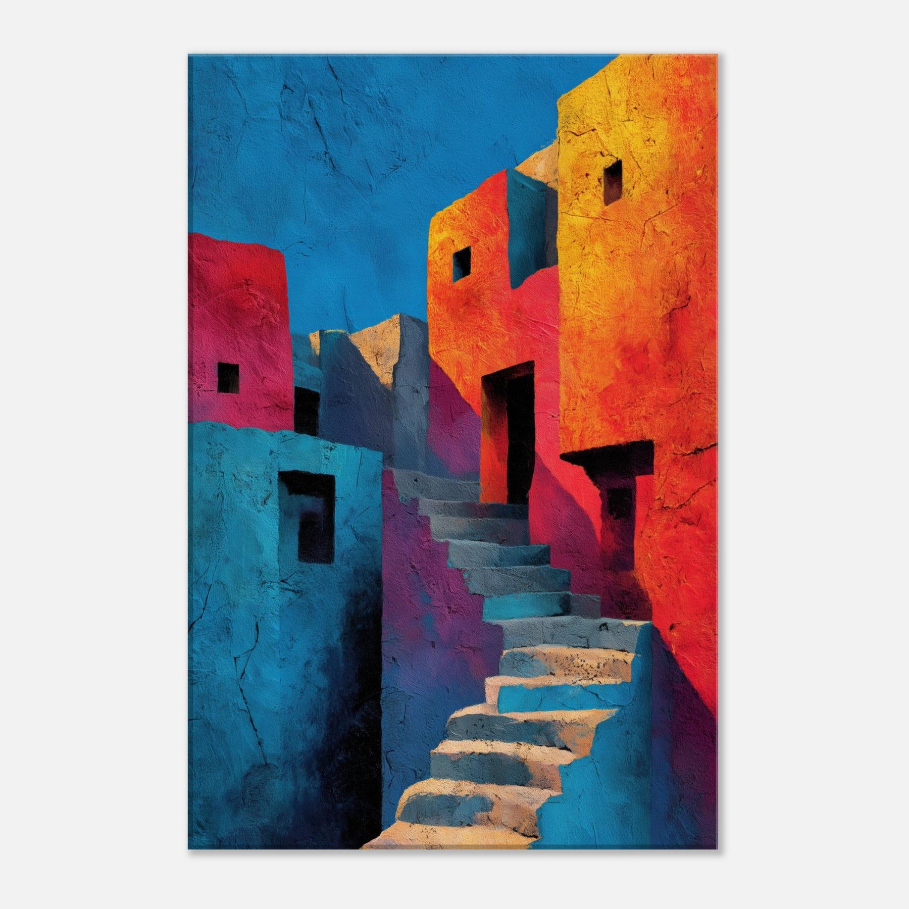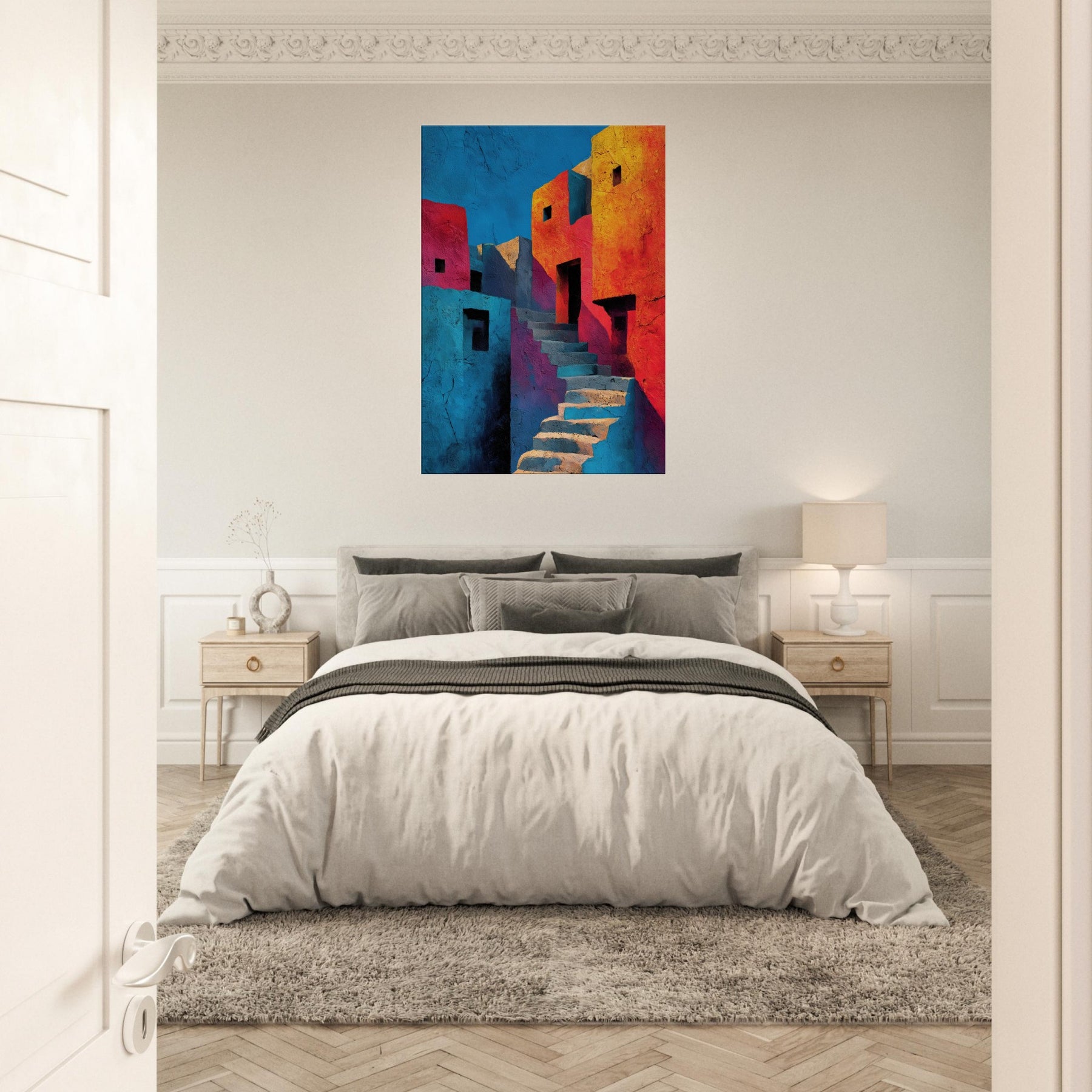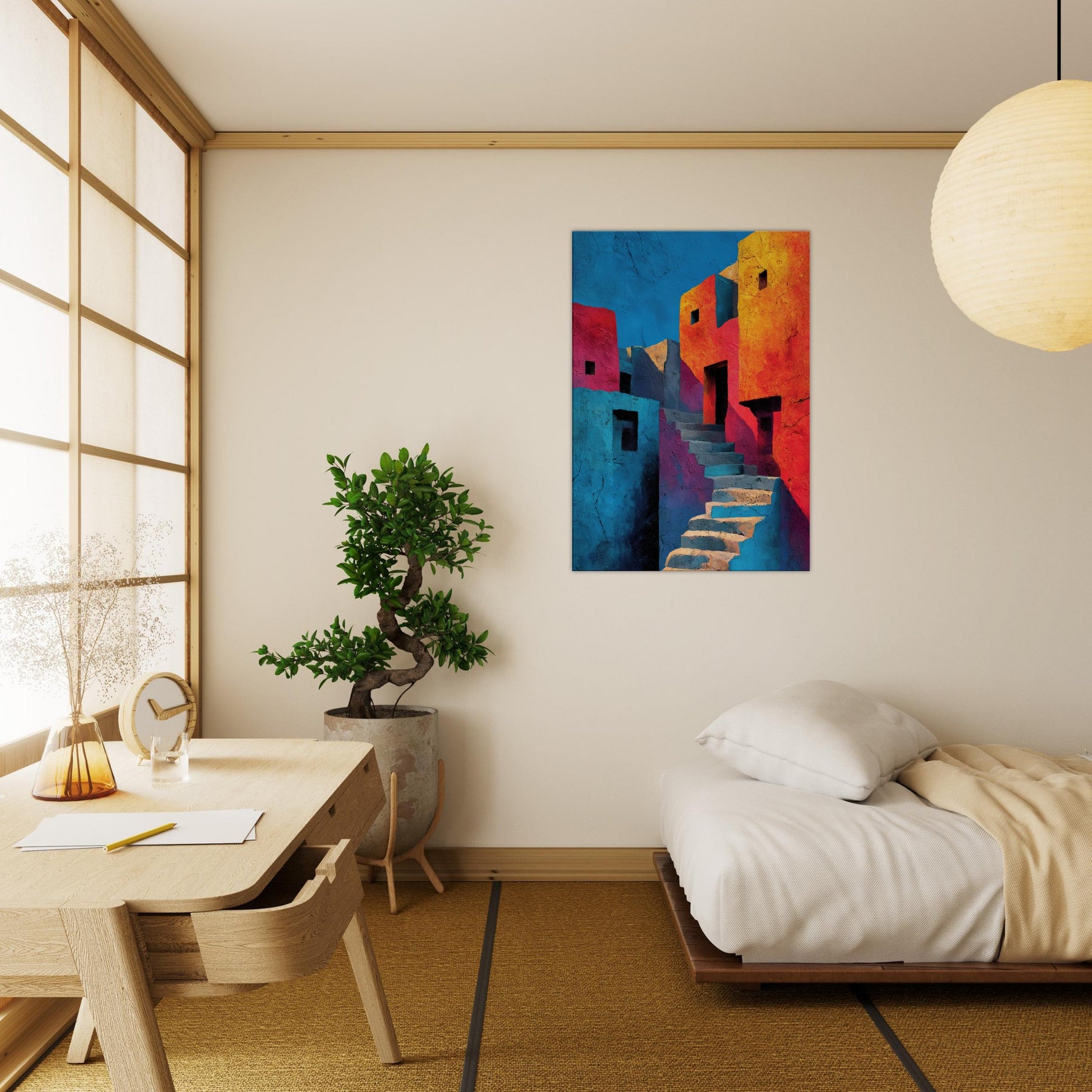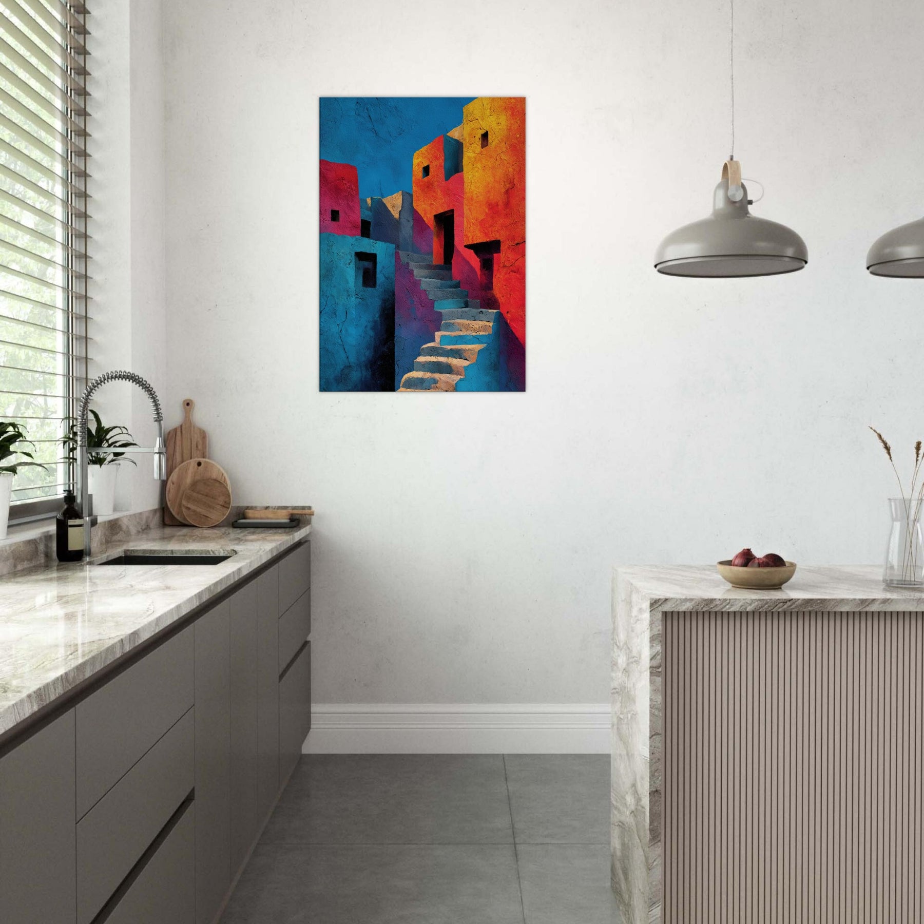 Let Rome unfold across your wall in a riot of color and quiet form. This bold abstract scene invites the eye to wander through sunlit stairways and blocky facades, turning city memory into a sensorial experience warm yellows, deep corals, and cool cerulean that hum with life. The piece casts a vibrant atmosphere that elevates living spaces, offering a daily escape into timeless streets and architectural poetry. A statement work that pairs urban memory with modern serenity in your home.