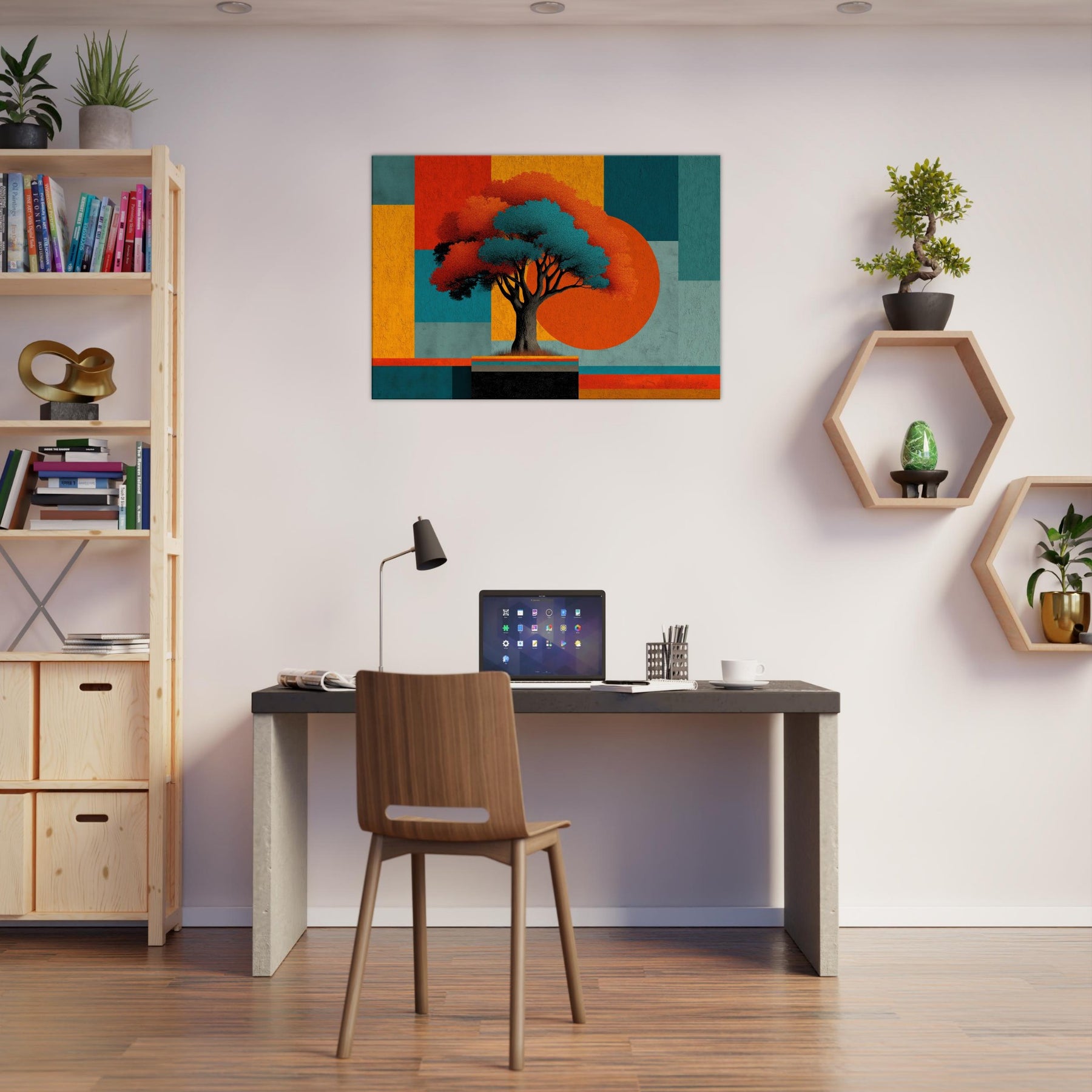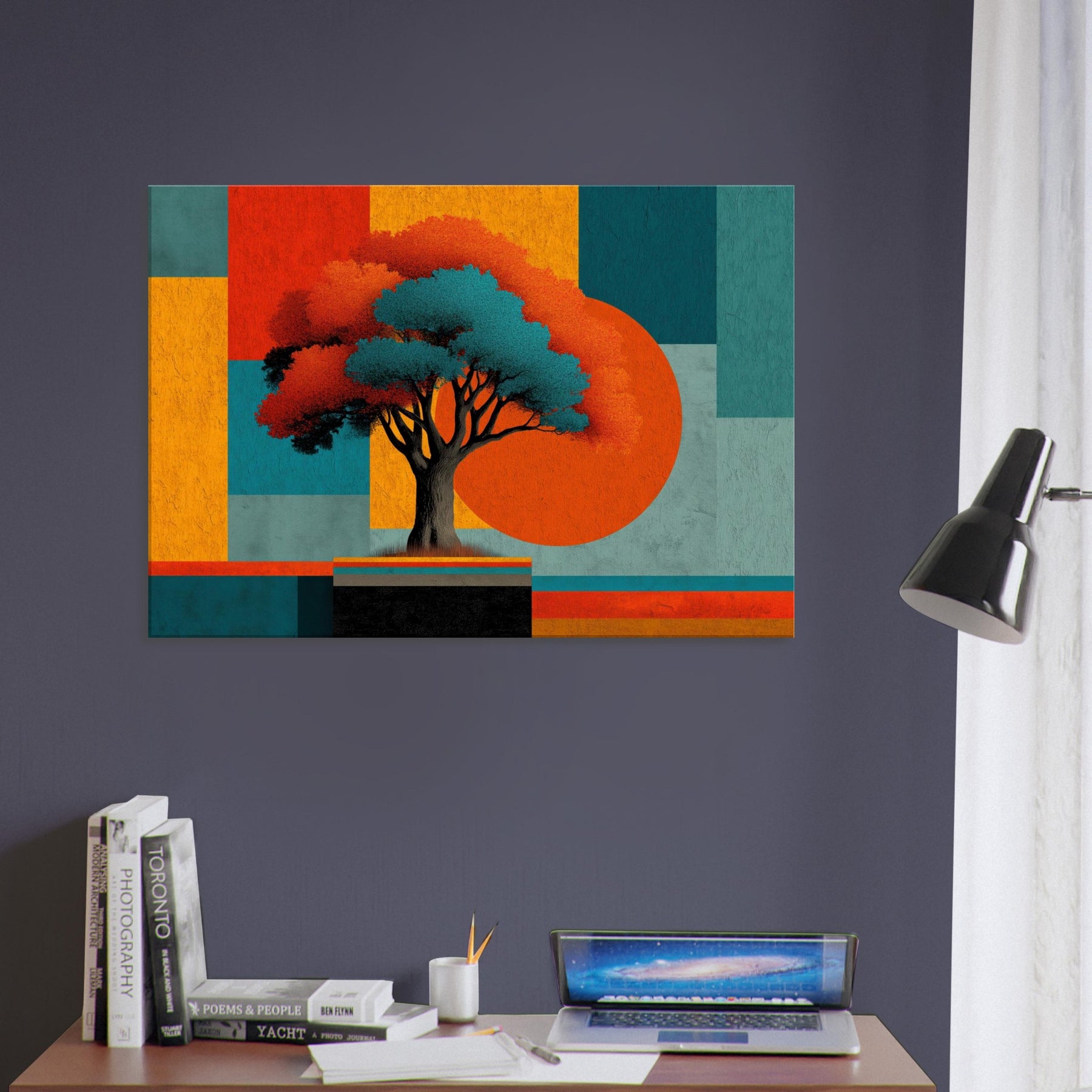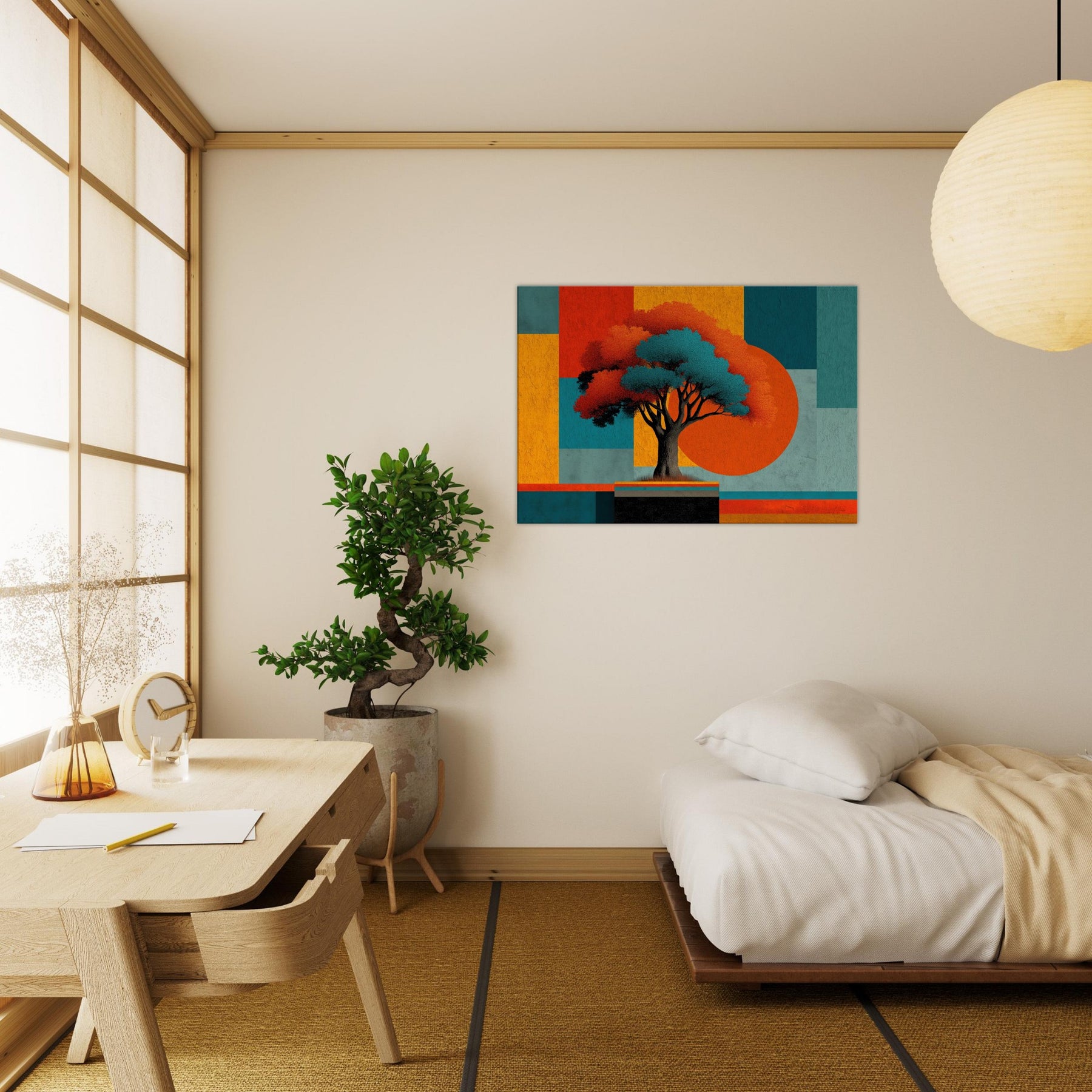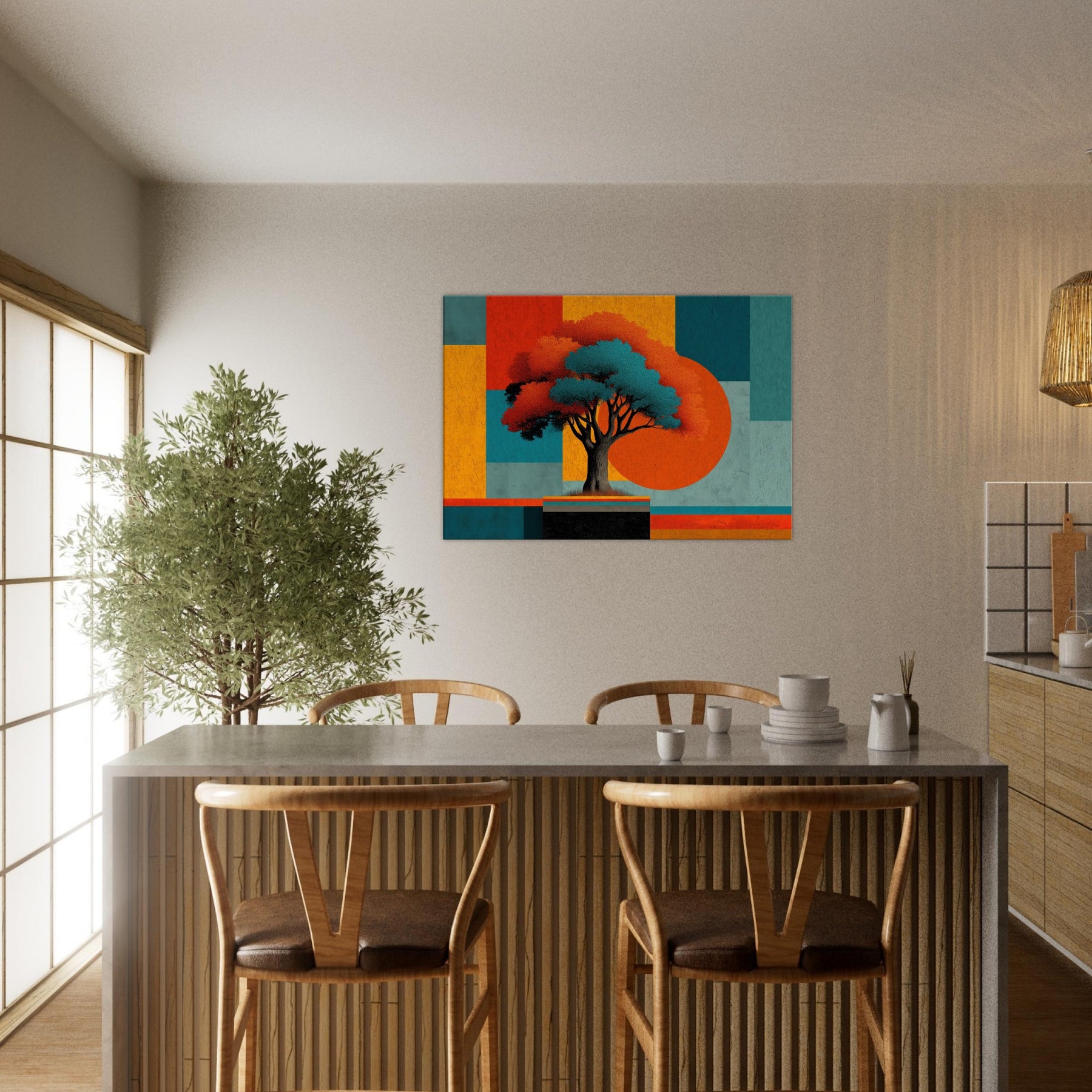Yggdrasil, the World Tree, unfurls as an abstract beacon of connection and renewal. In this fusion of myth and color, its luminous canopy anchors a composition of bold blocks and shadowed branches. The piece hums with a quiet, otherworldly energy that invites you to pause, breathe, and dream. Place it in a living room or study to anchor conversations, soften edges, and transform walls into a portal between memory and possibility. The central subject is Yggdrasil (World Tree).