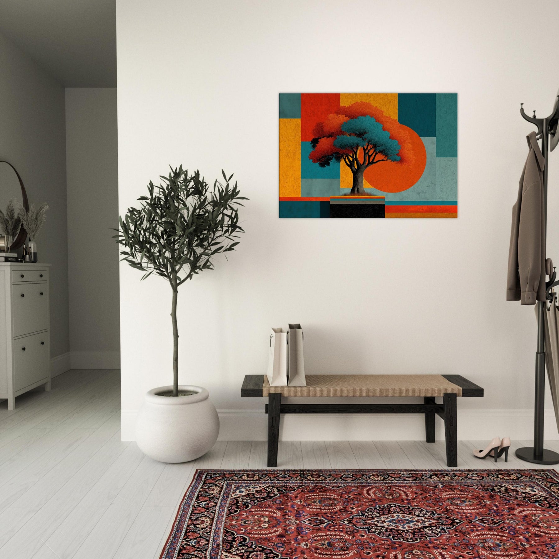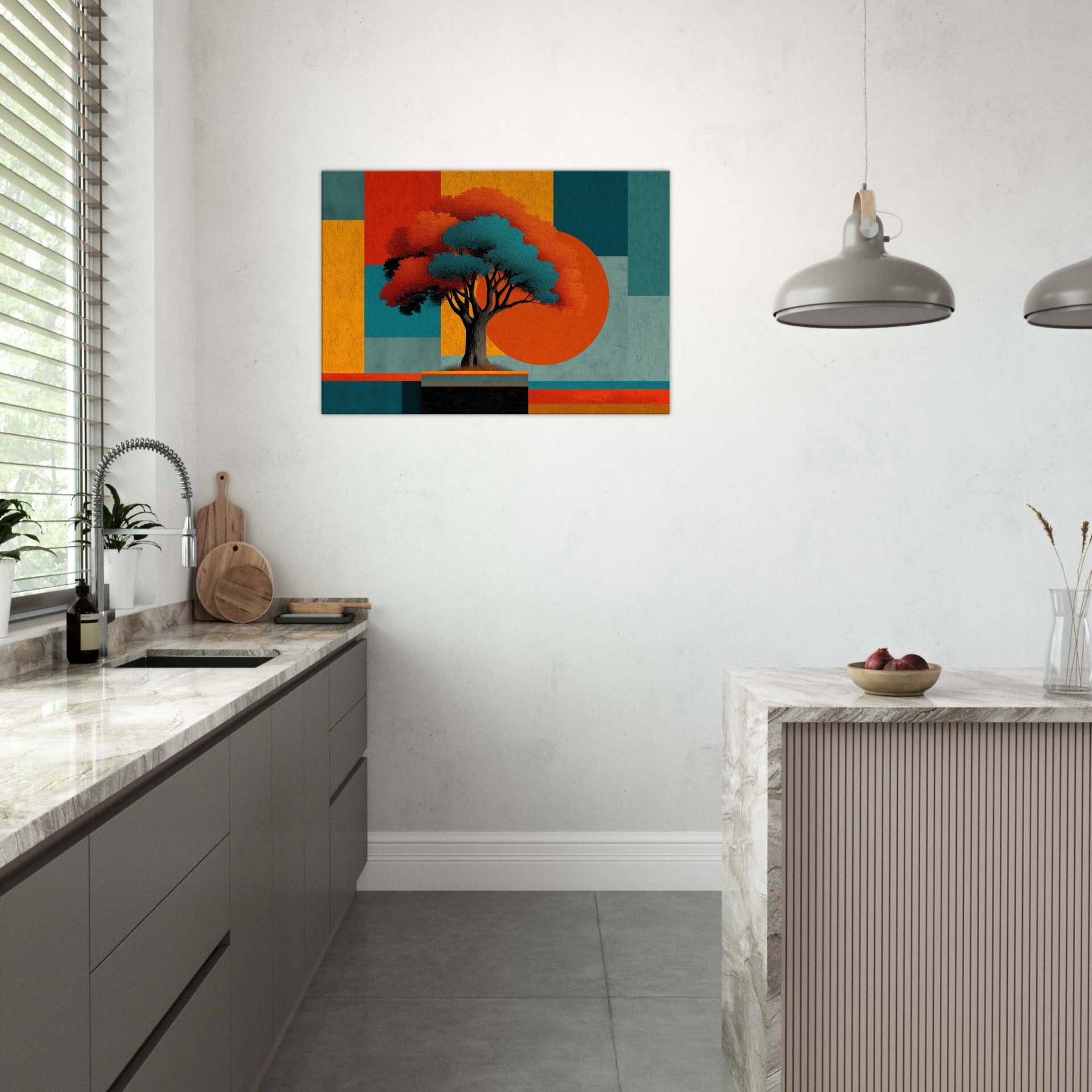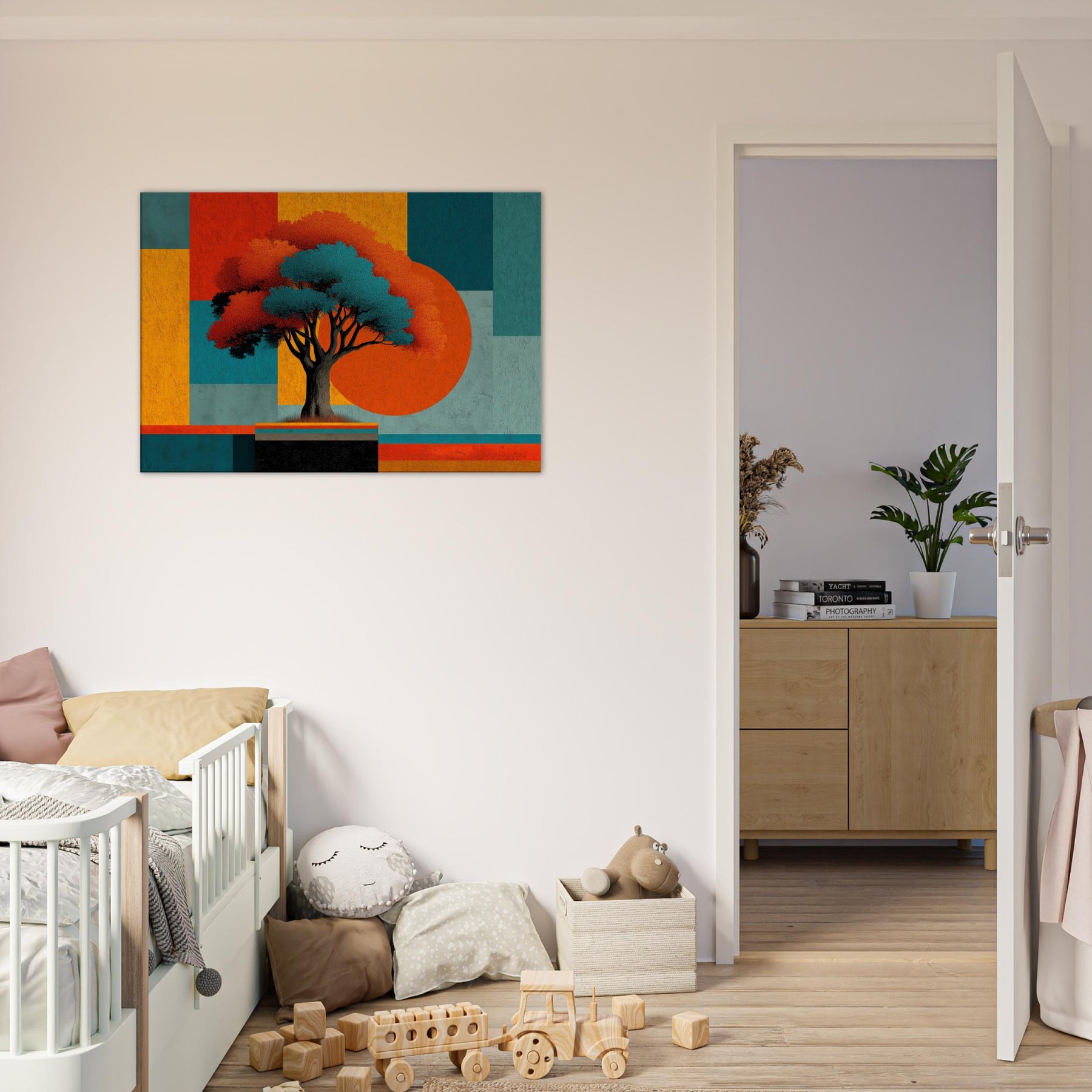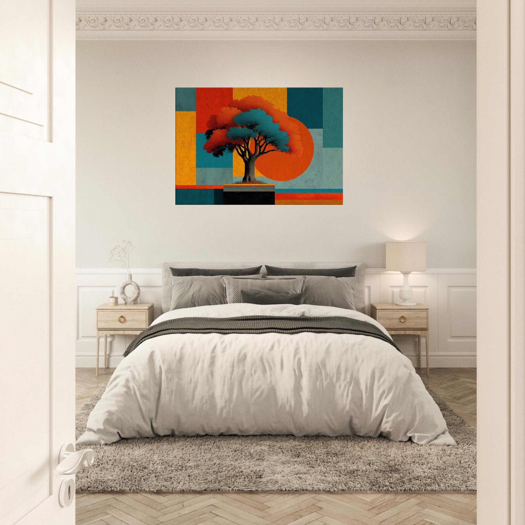 Yggdrasil, the World Tree, unfurls as an abstract beacon of connection and renewal. In this fusion of myth and color, its luminous canopy anchors a composition of bold blocks and shadowed branches. The piece hums with a quiet, otherworldly energy that invites you to pause, breathe, and dream. Place it in a living room or study to anchor conversations, soften edges, and transform walls into a portal between memory and possibility. The central subject is Yggdrasil (World Tree).