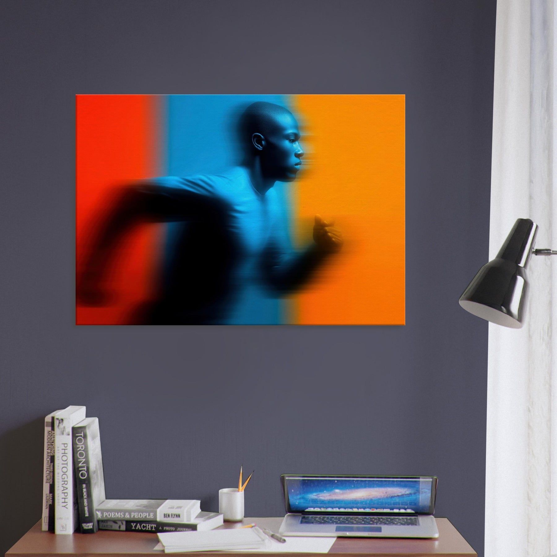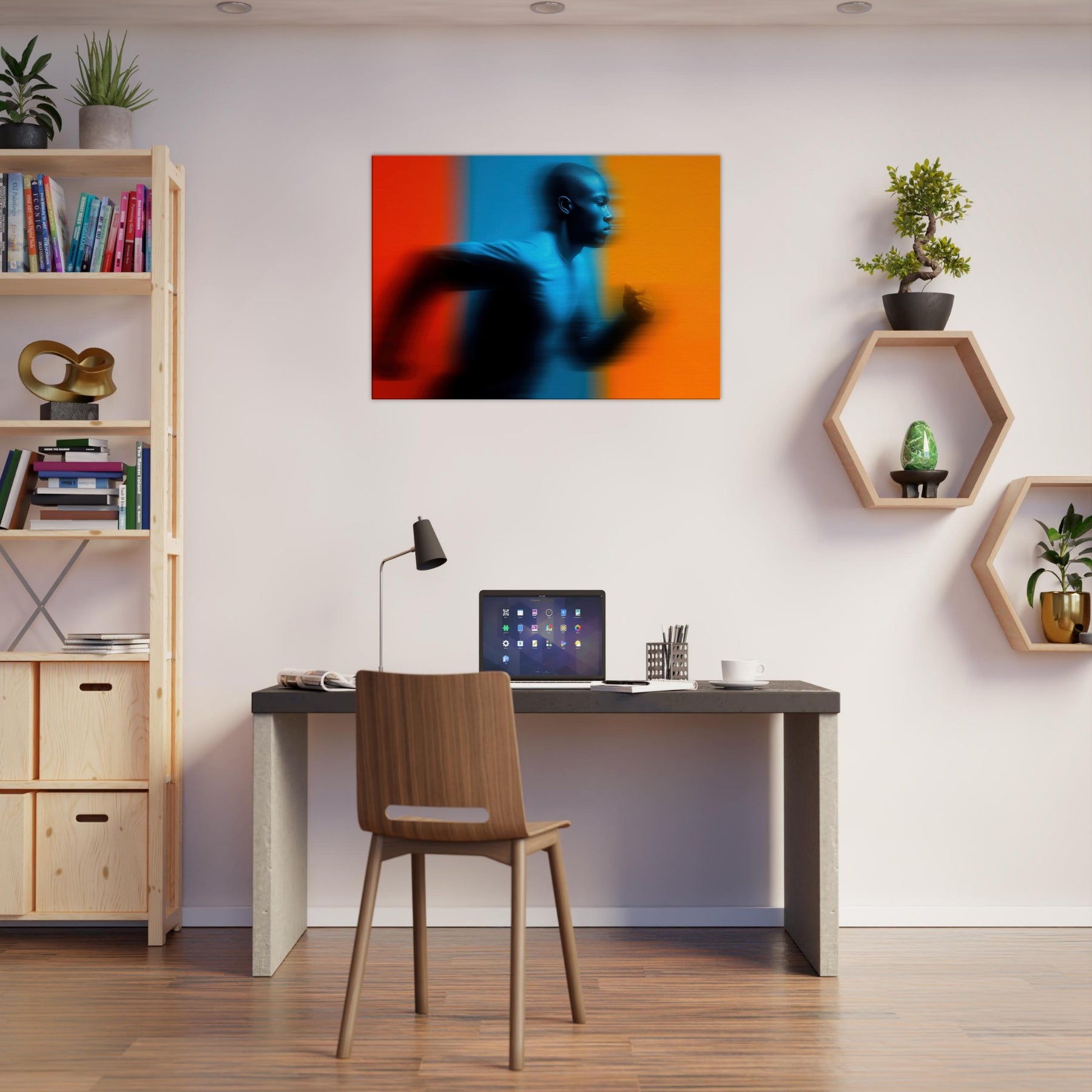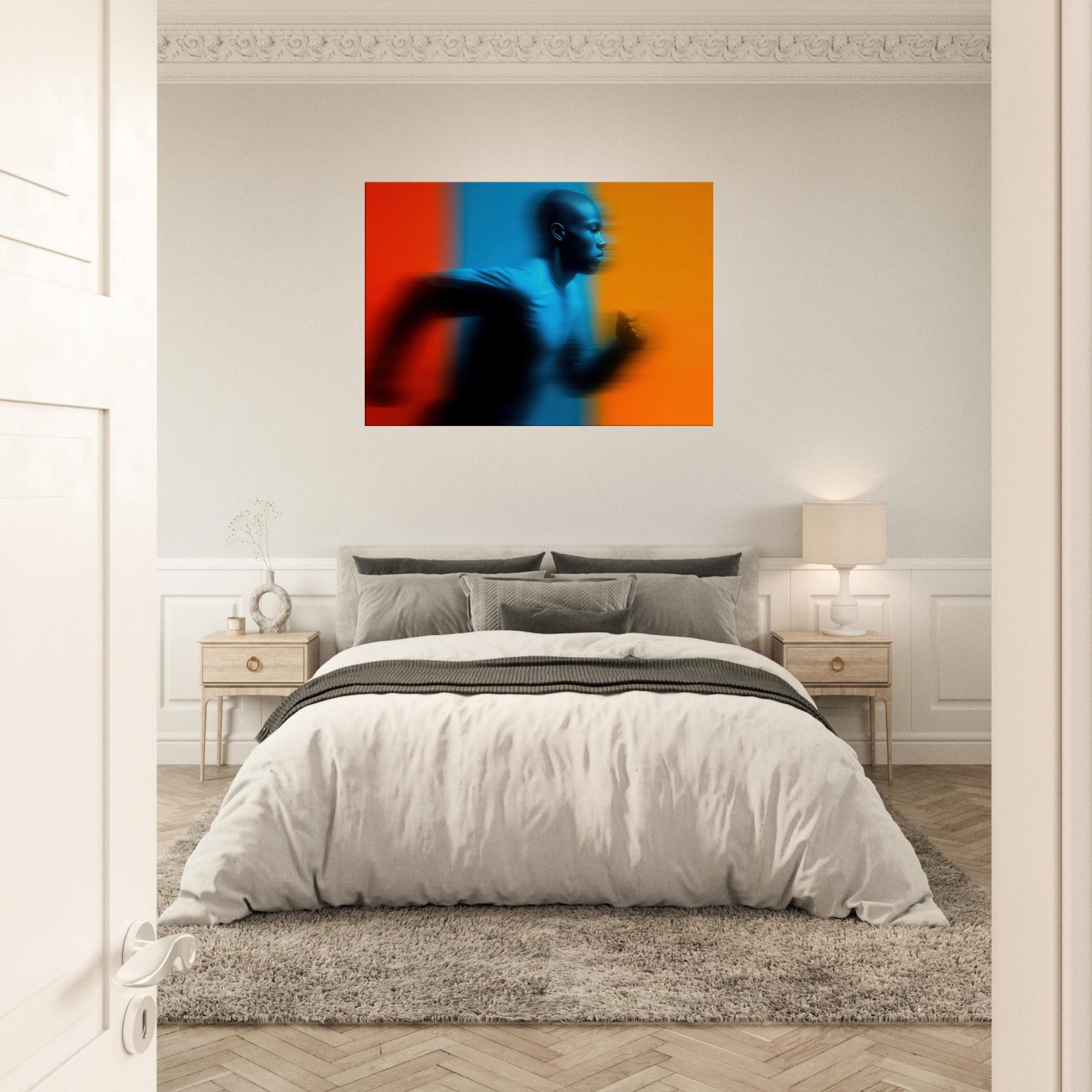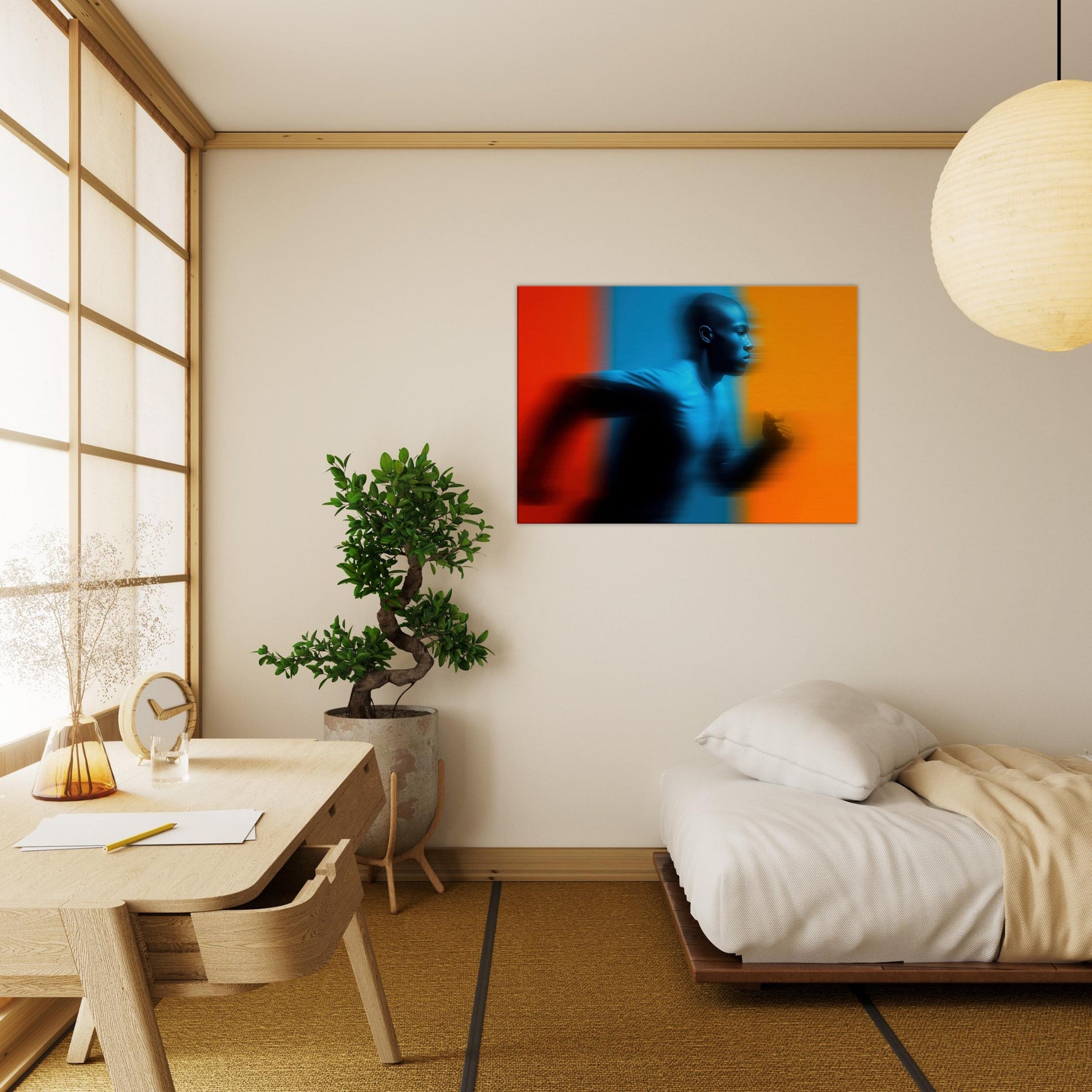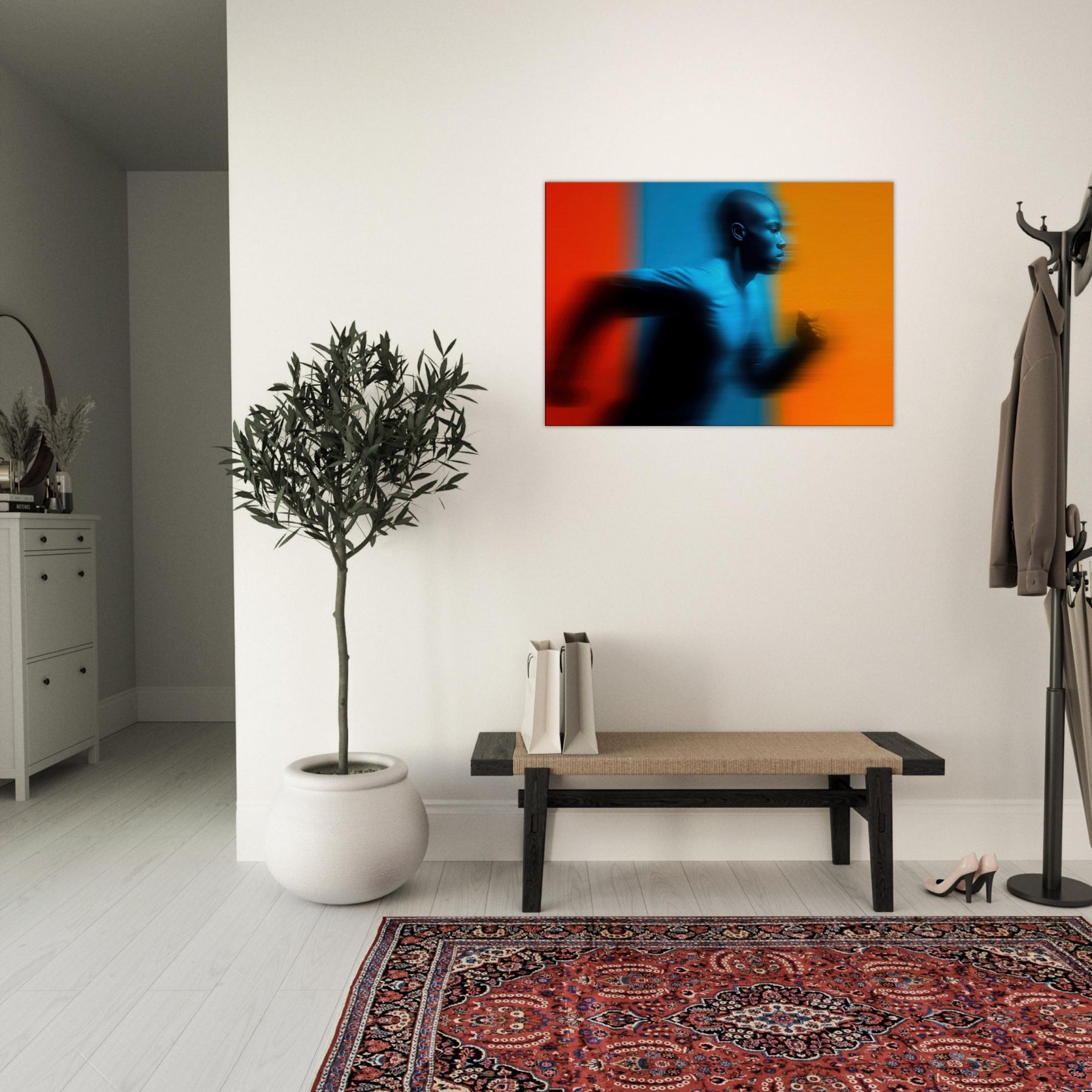 This piece pulses with kinetic grace, a study in momentum rendered as a luminous silhouette of the Primary Subject, Runner in Motion. Swathes of cobalt blue meet blazing orange in a blur of motion that draws the eye forward, inviting you to feel the energy rather than simply see it. The atmosphere is electric and intimate like a dawn sprint or a city heartbeat captured mid step. Hang it in a living room or entryway to infuse space with momentum, depth, and restless beauty.