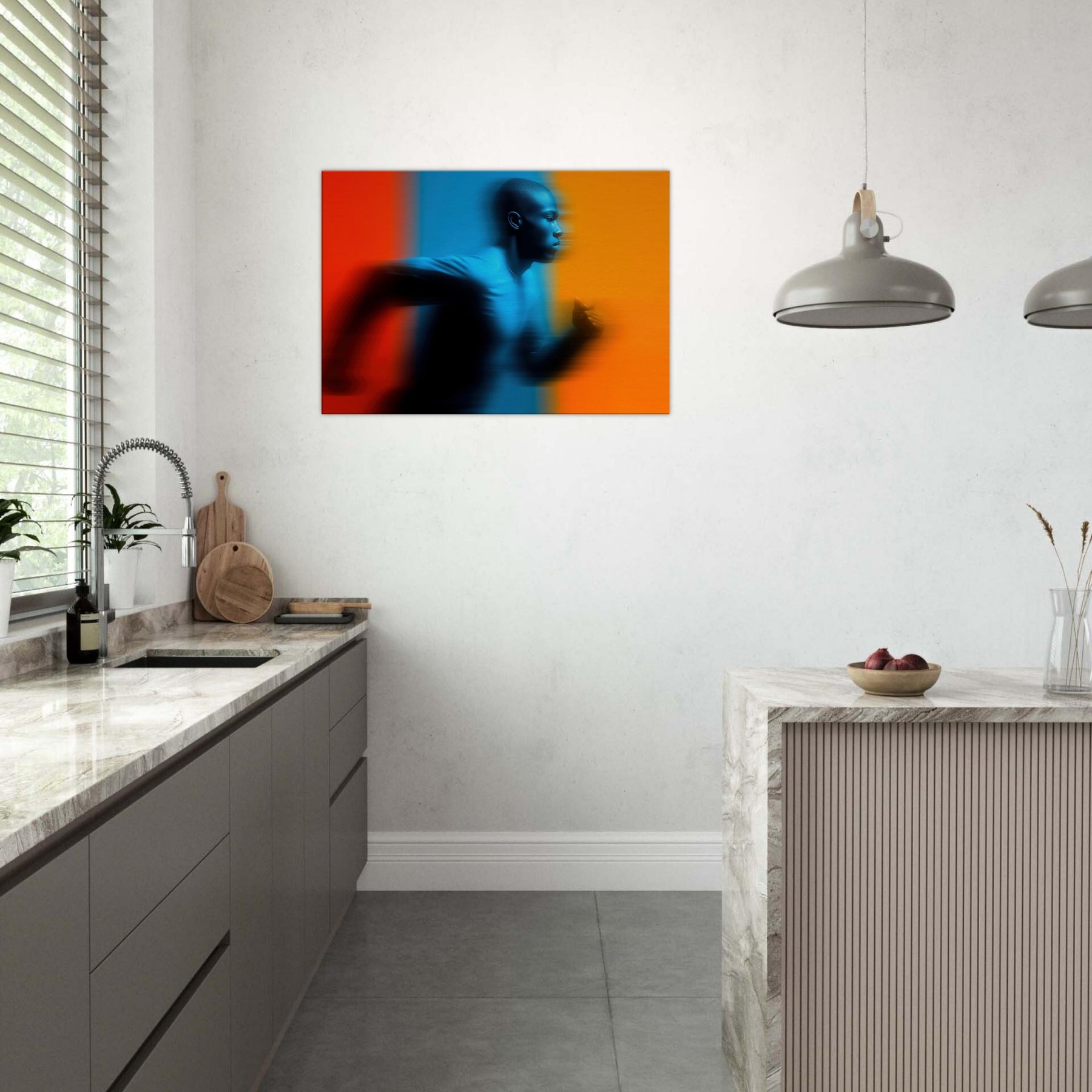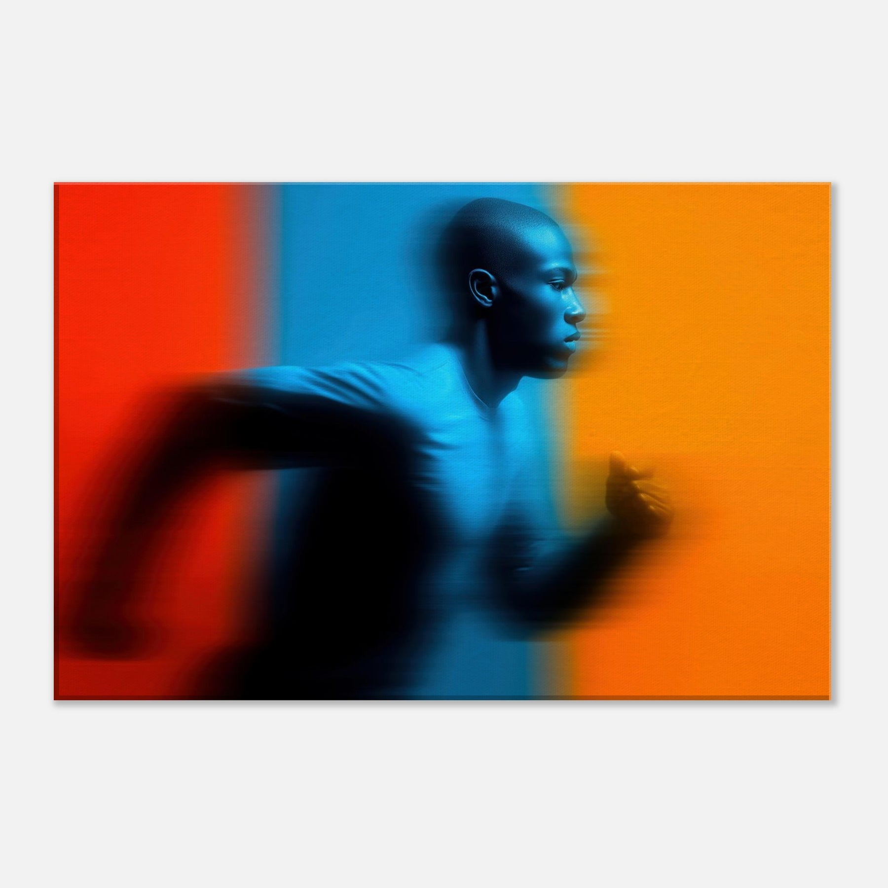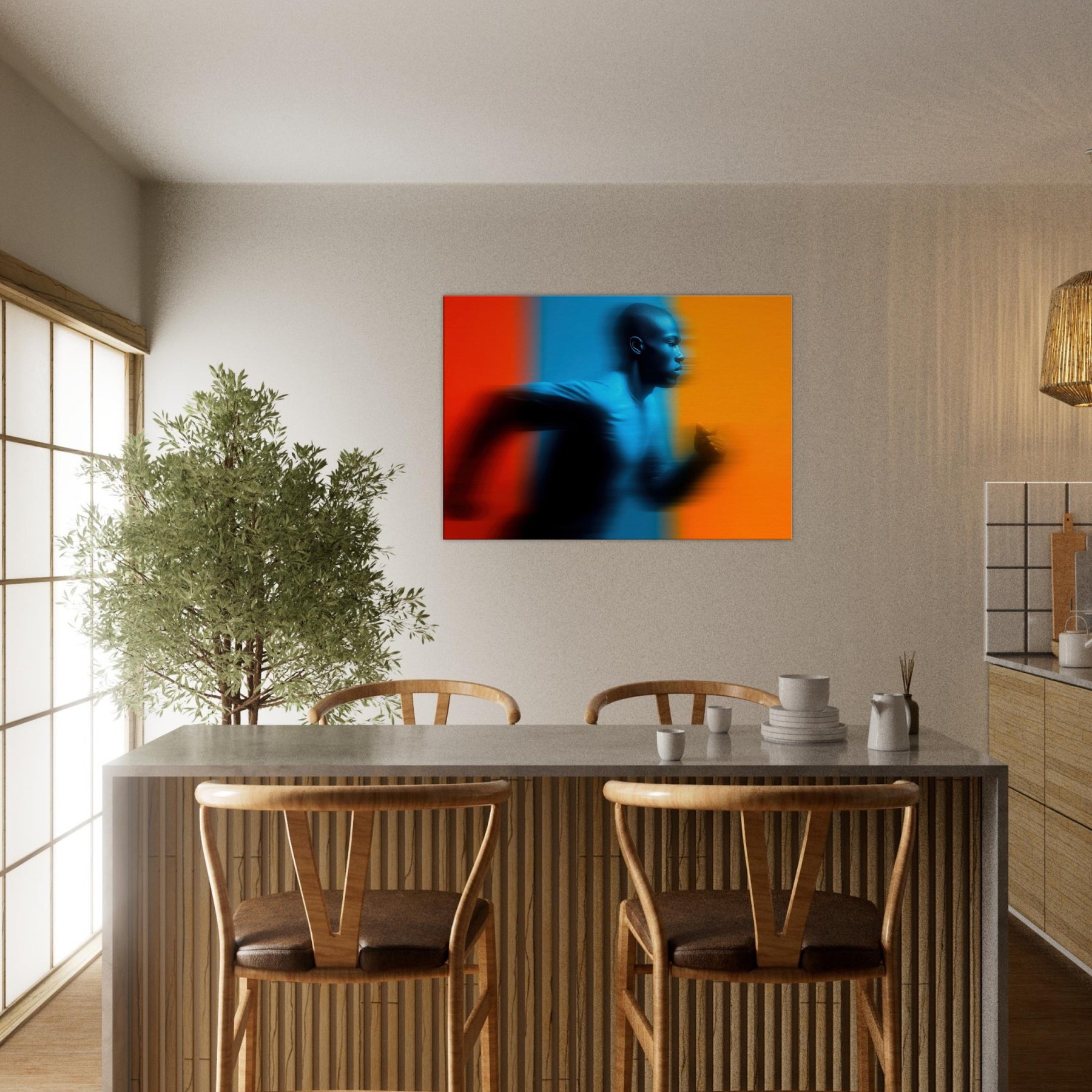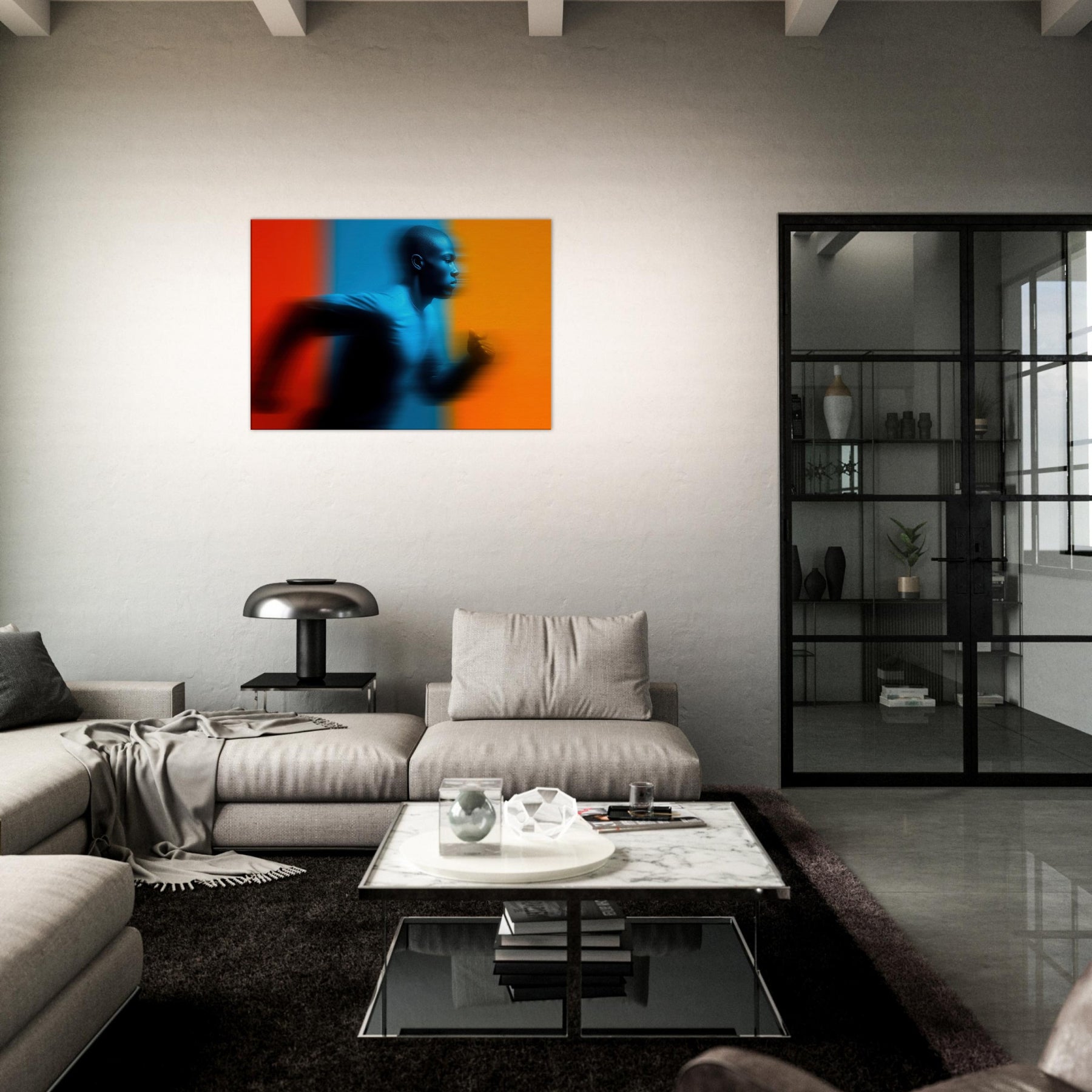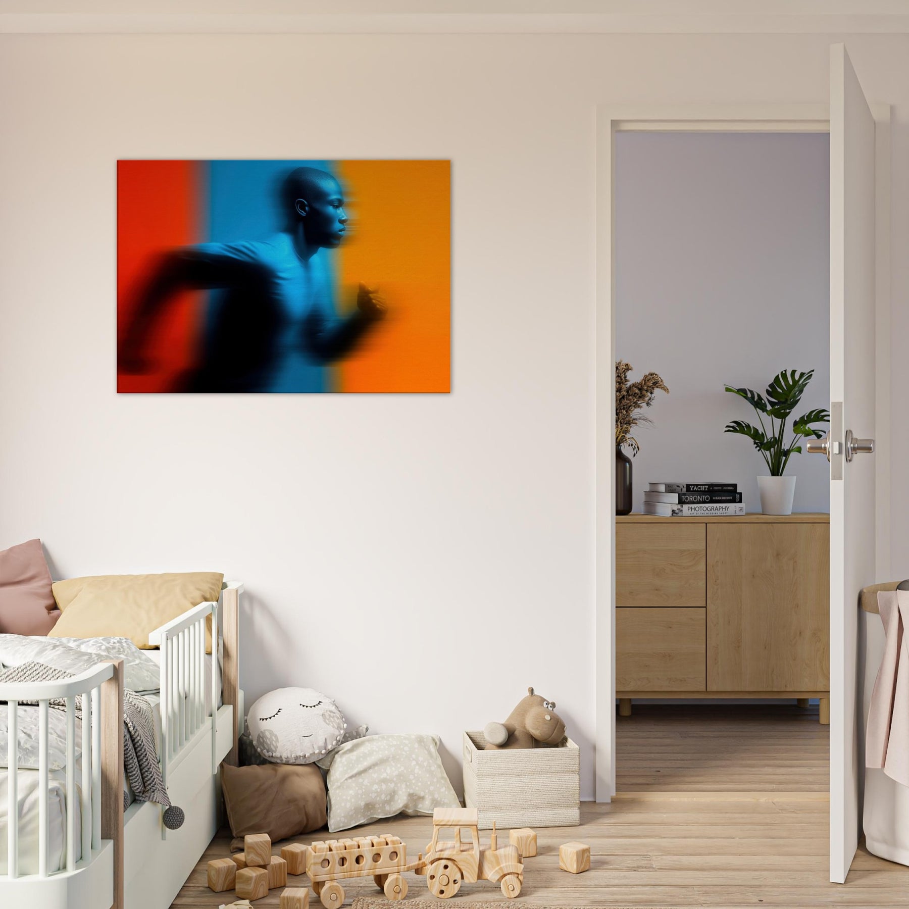This piece pulses with kinetic grace, a study in momentum rendered as a luminous silhouette of the Primary Subject, Runner in Motion. Swathes of cobalt blue meet blazing orange in a blur of motion that draws the eye forward, inviting you to feel the energy rather than simply see it. The atmosphere is electric and intimate like a dawn sprint or a city heartbeat captured mid step. Hang it in a living room or entryway to infuse space with momentum, depth, and restless beauty.
