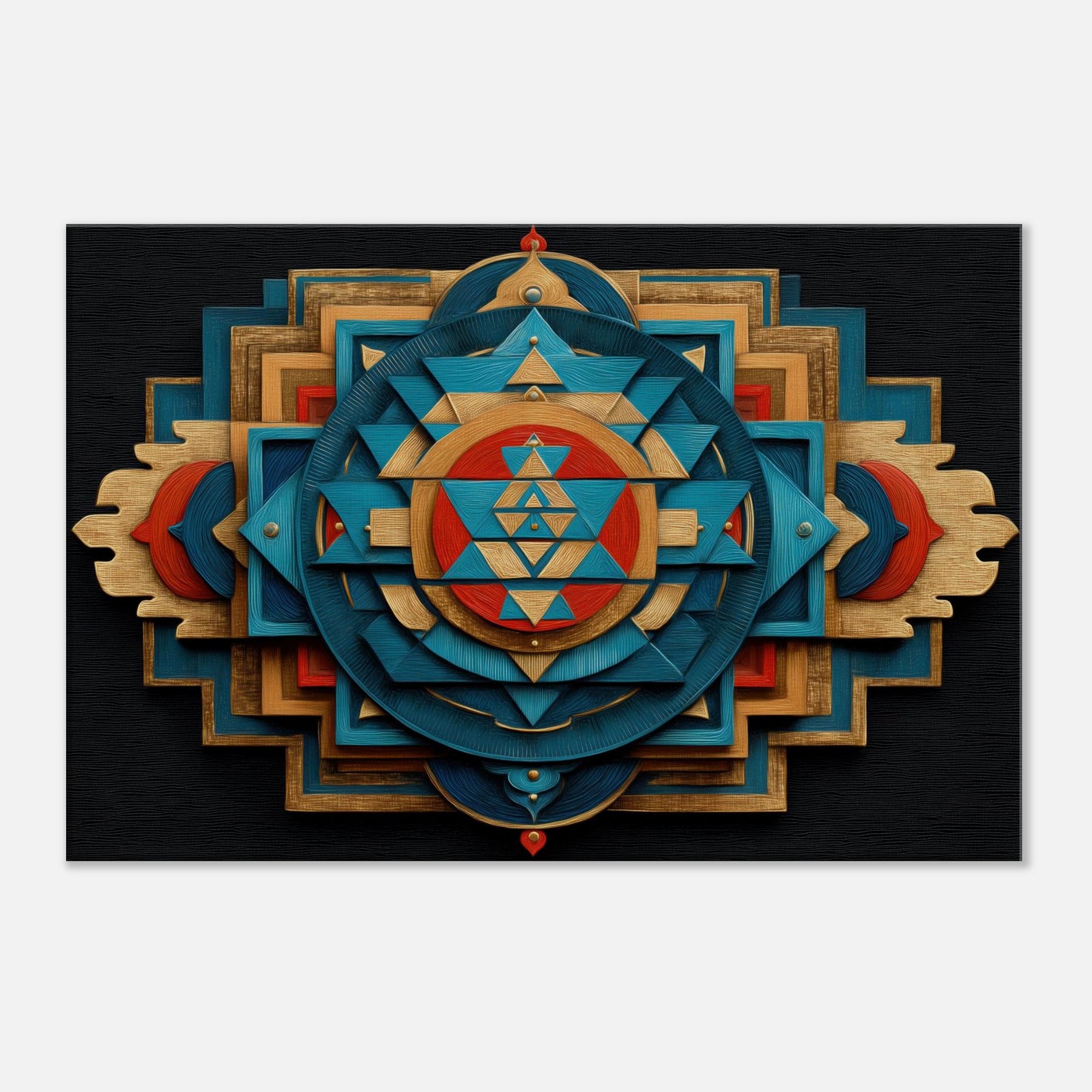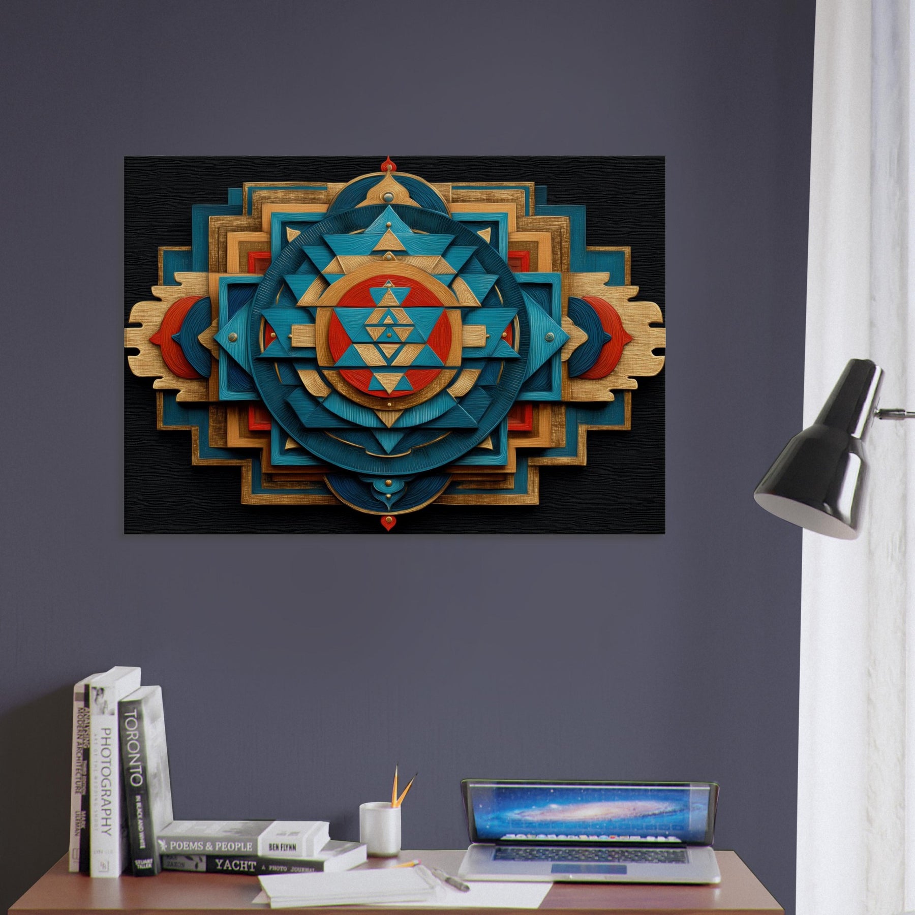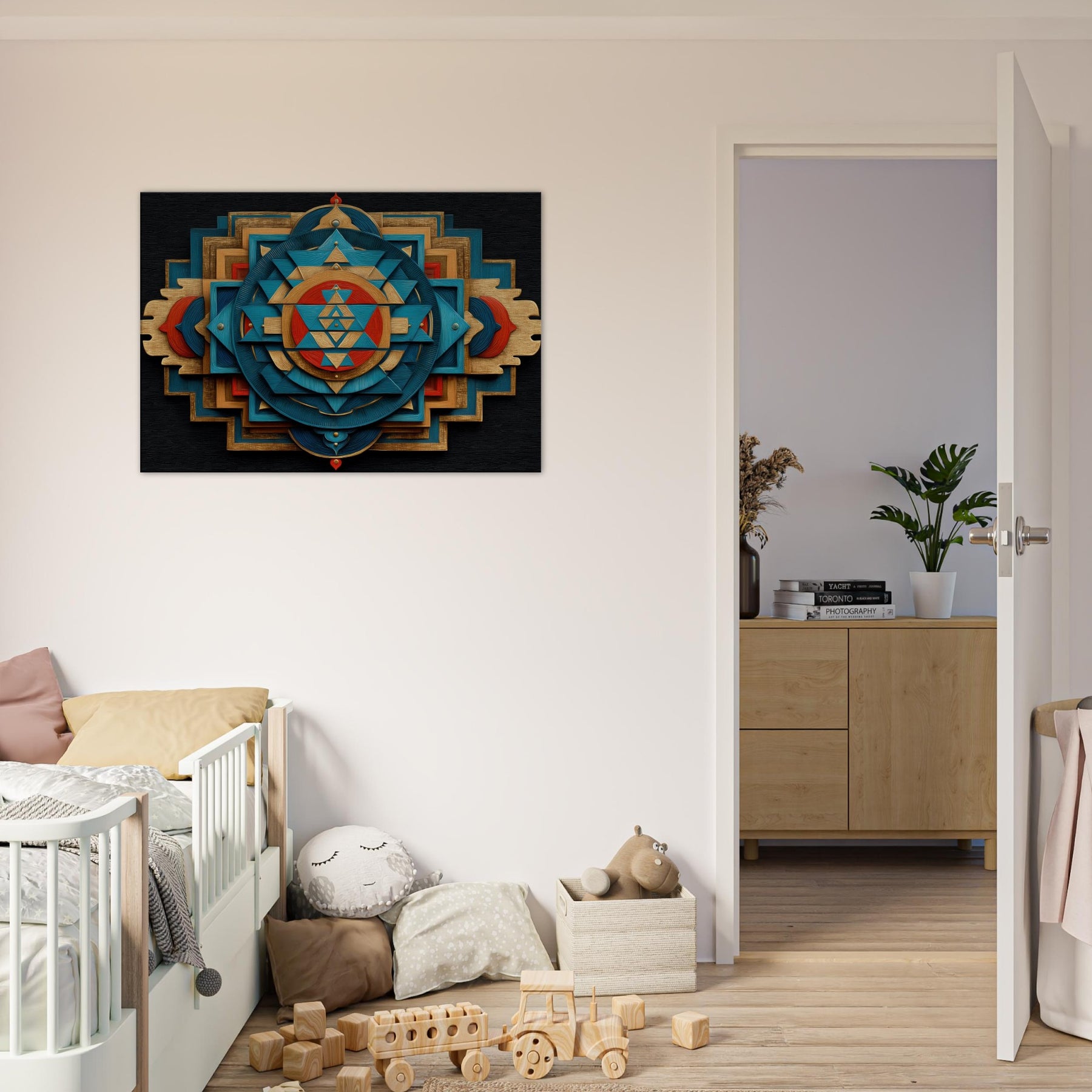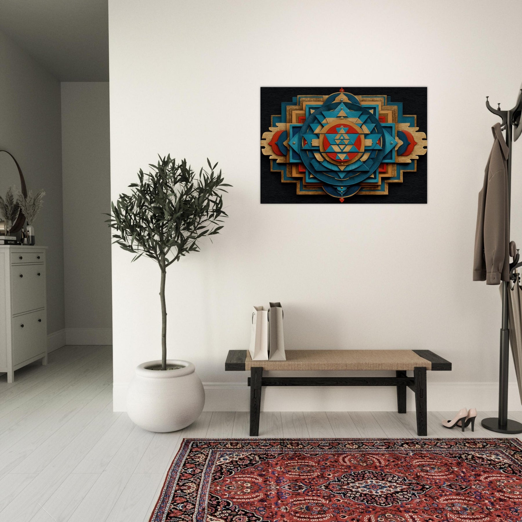 This Sri Yantra inspired piece unfolds in layered geometry, inviting a quiet gaze to travel its rings. Warm golds meet cool teals and coral accents, carving a tactile, whispered texture that feels like carved wood and metal at dawn. The atmosphere is ceremonial, meditative, and expansive, turning a living room into a sanctuary of focus. Hang it where light can catch each facet, and let the mystic energy guide conversations, rituals, and stillness alike.
