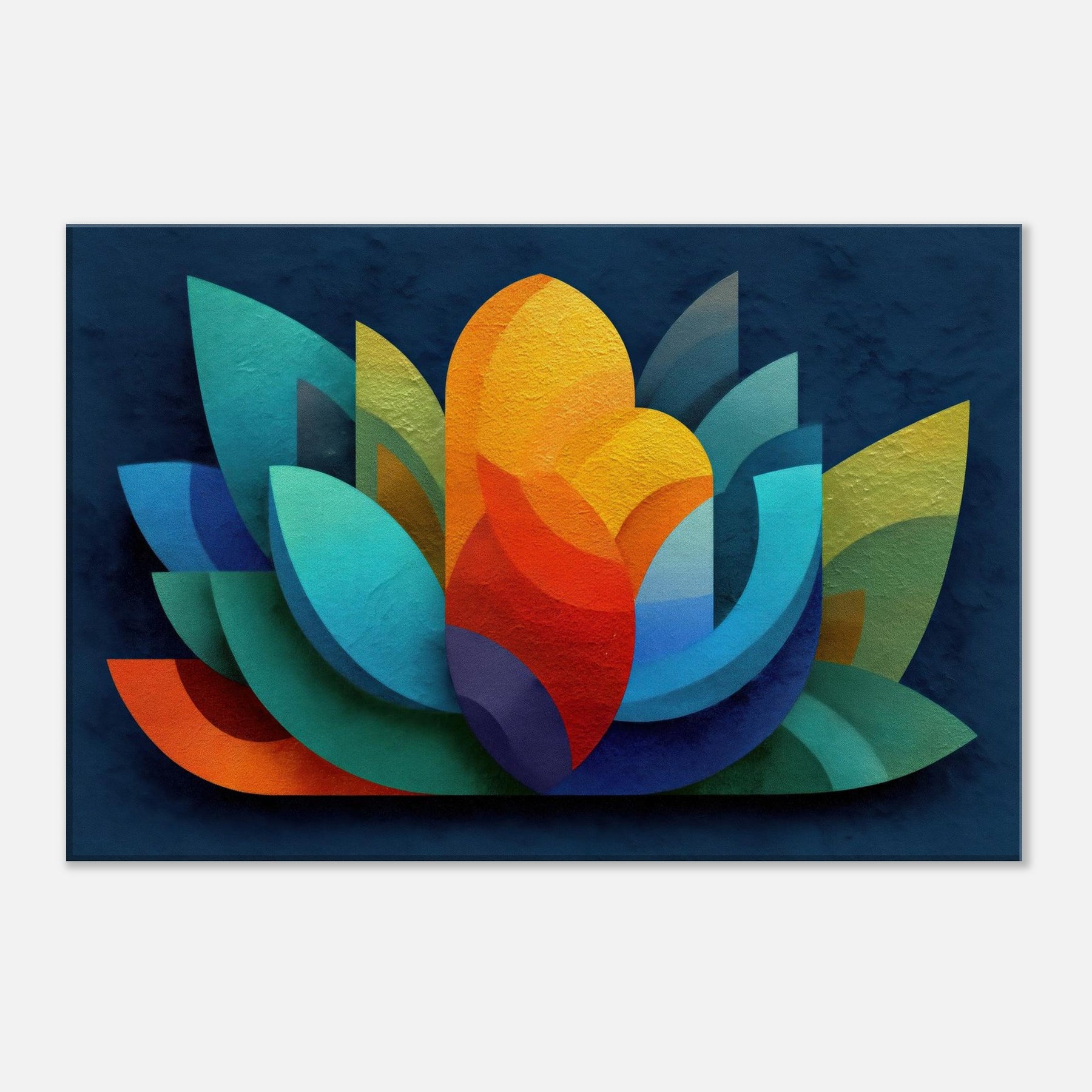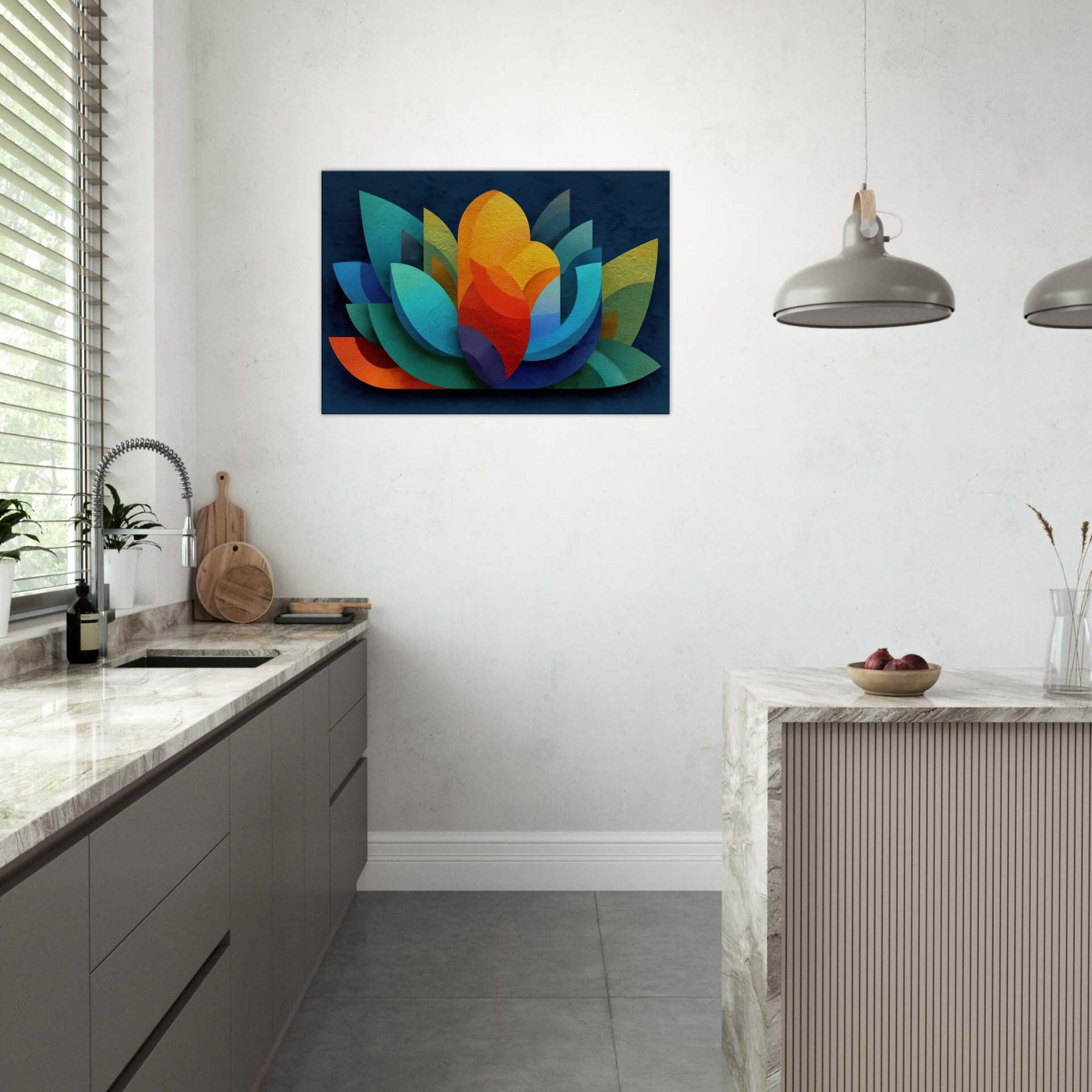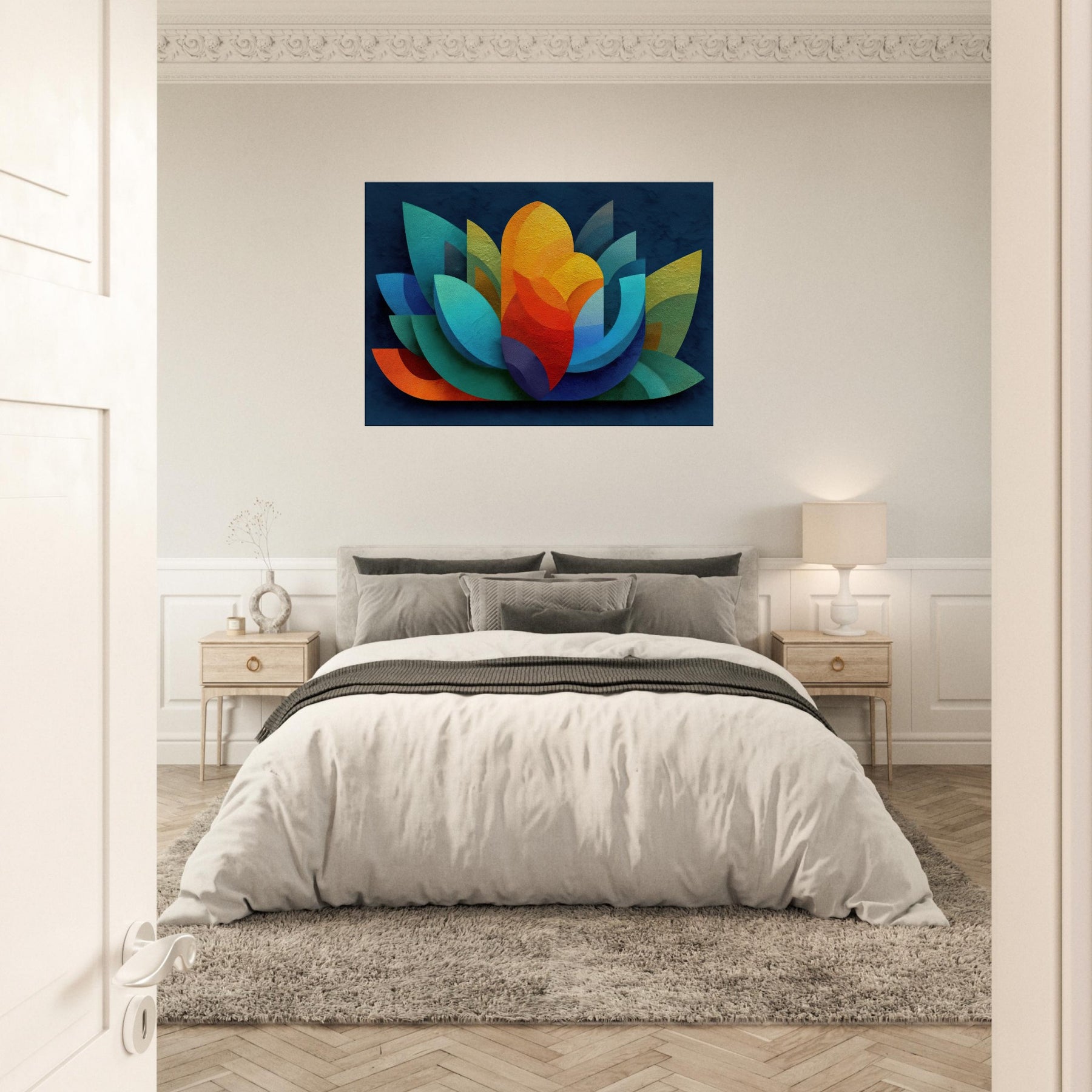 Within Sacred Geometry, color unfurls as a quiet chorus of layered petals. This abstract composition invites the eye to drift from warm amber centers to cool blues, catching light and memory at every edge. A tactile, sun warmed texture makes the surface feel almost sculpted, turning a wall into a sanctuary. In living spaces, it acts as a meditative focal point evoking mystery, balance, and a mystical aura that enriches atmosphere, depth, and everyday moments.