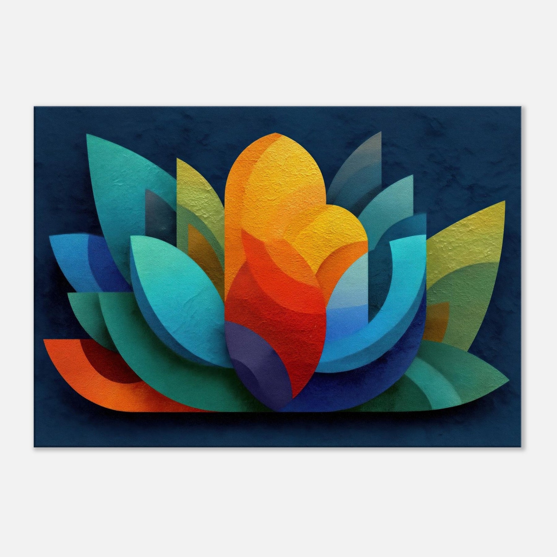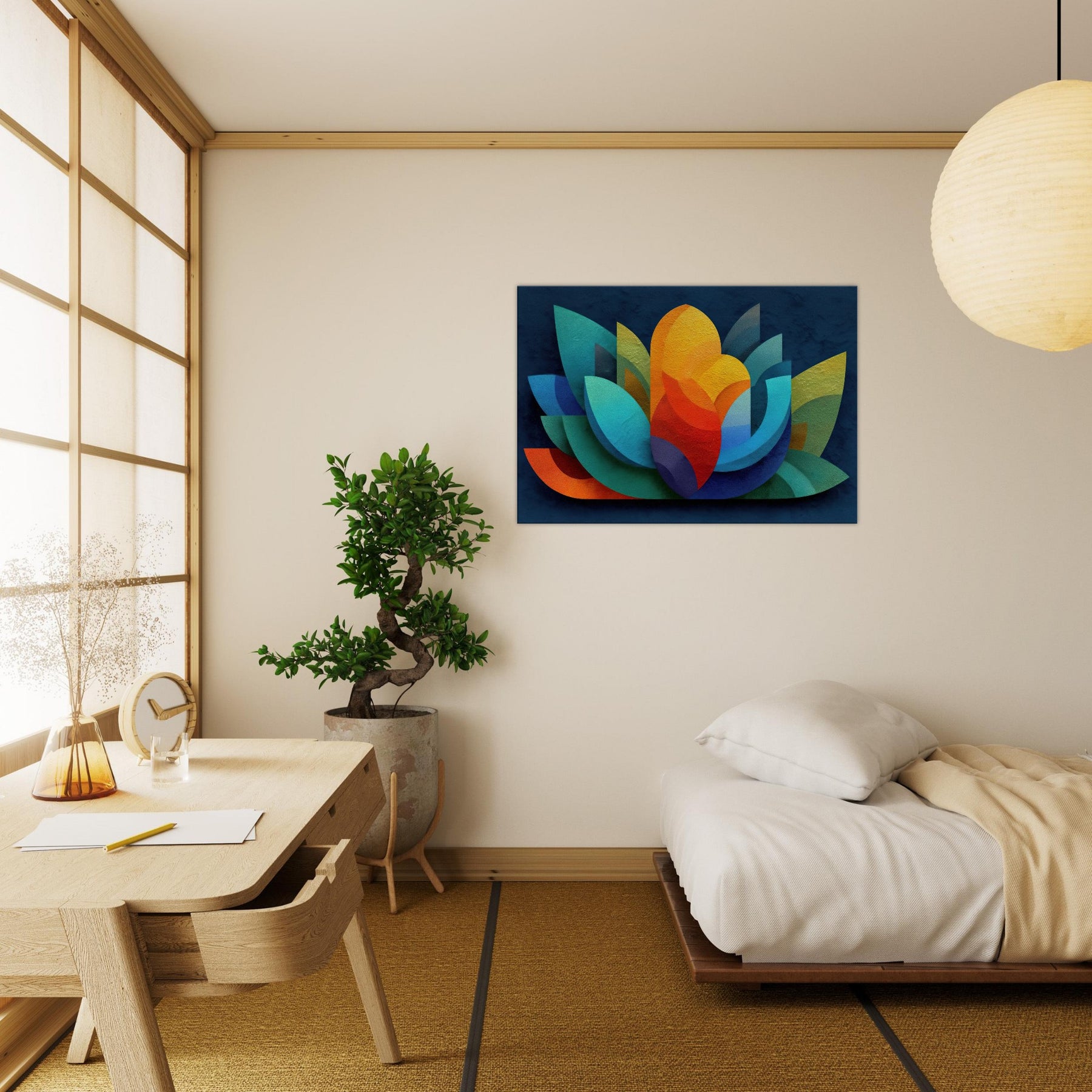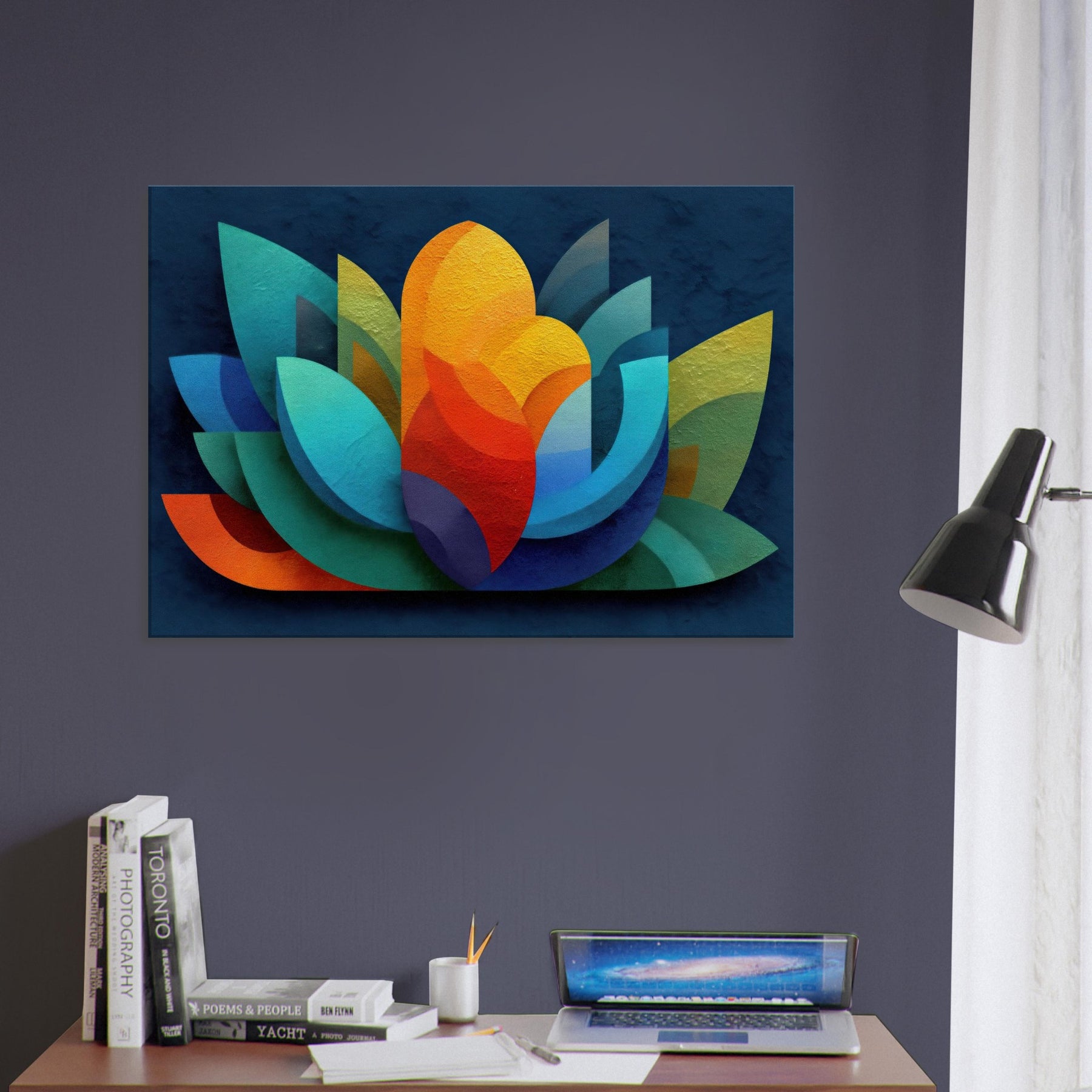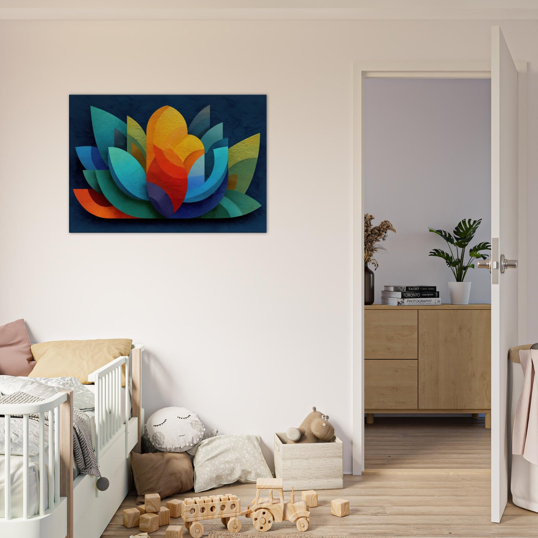 Within Sacred Geometry, color unfurls as a quiet chorus of layered petals. This abstract composition invites the eye to drift from warm amber centers to cool blues, catching light and memory at every edge. A tactile, sun warmed texture makes the surface feel almost sculpted, turning a wall into a sanctuary. In living spaces, it acts as a meditative focal point evoking mystery, balance, and a mystical aura that enriches atmosphere, depth, and everyday moments.