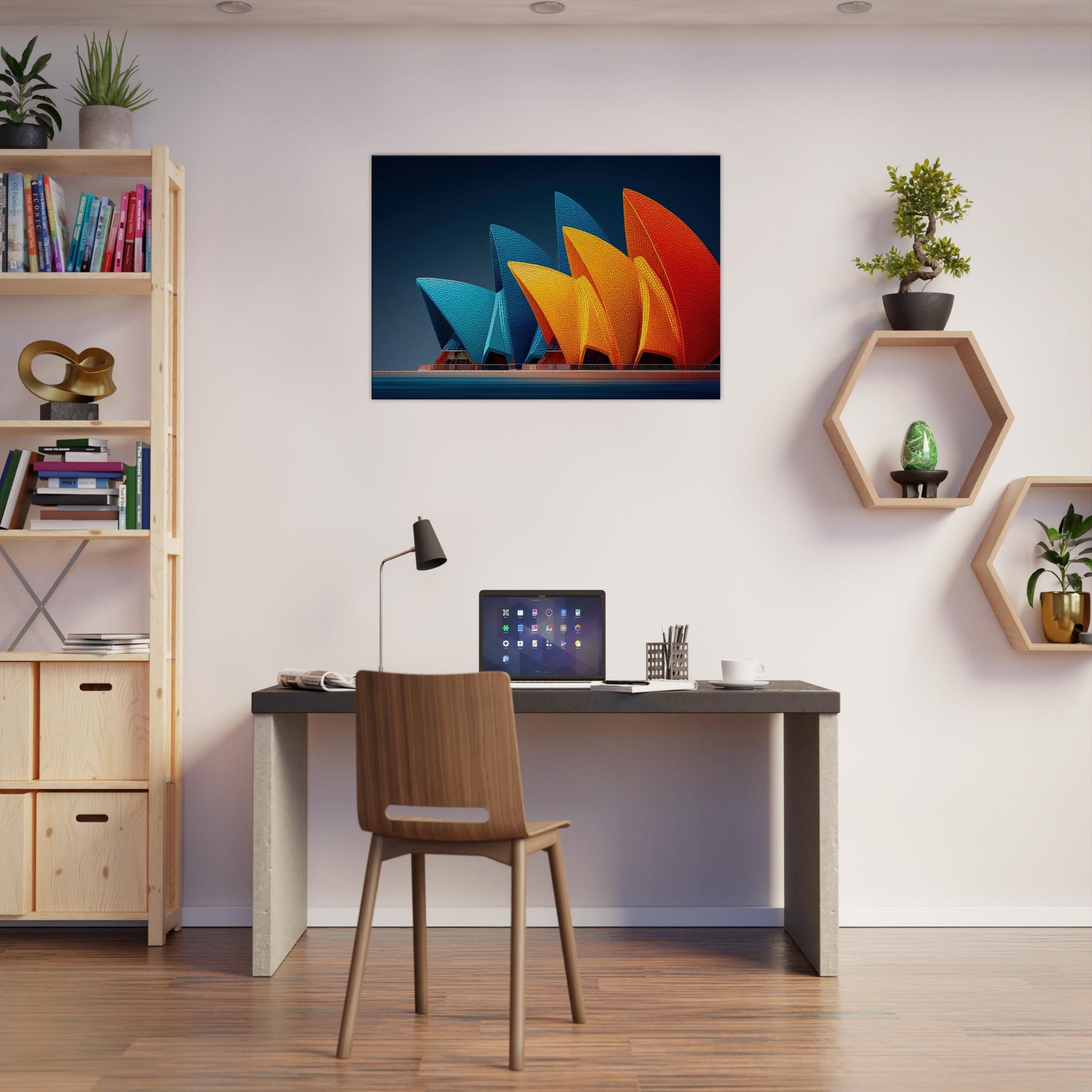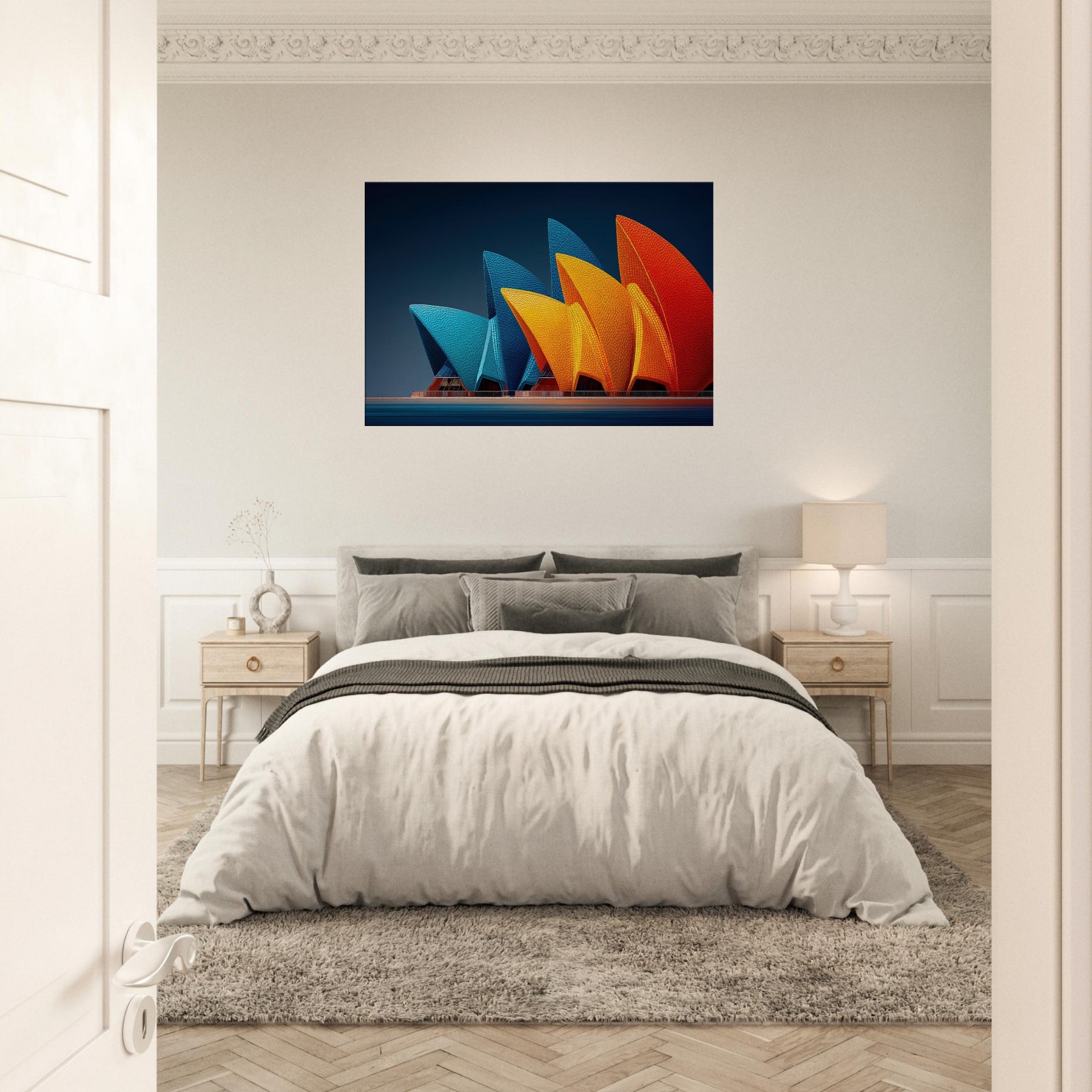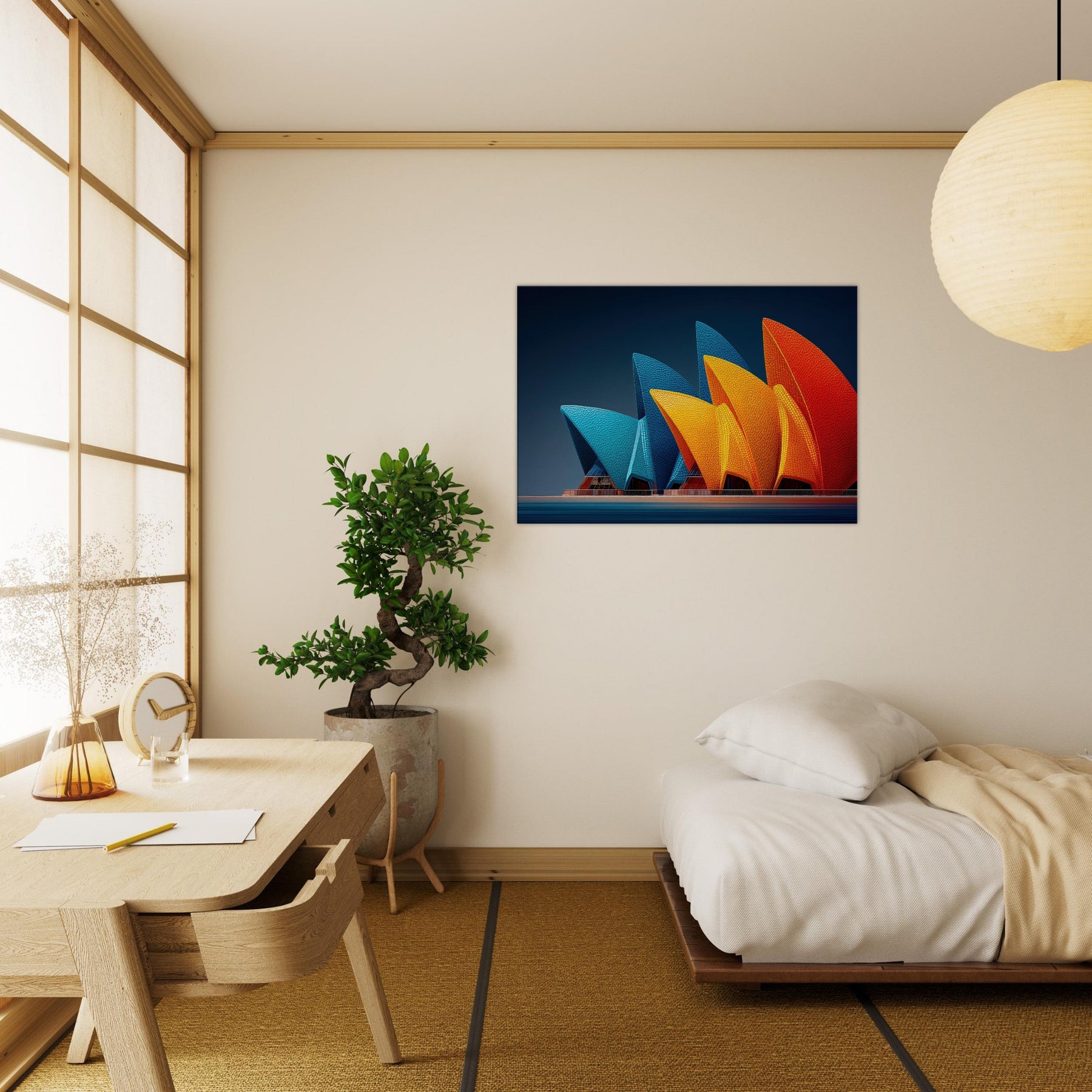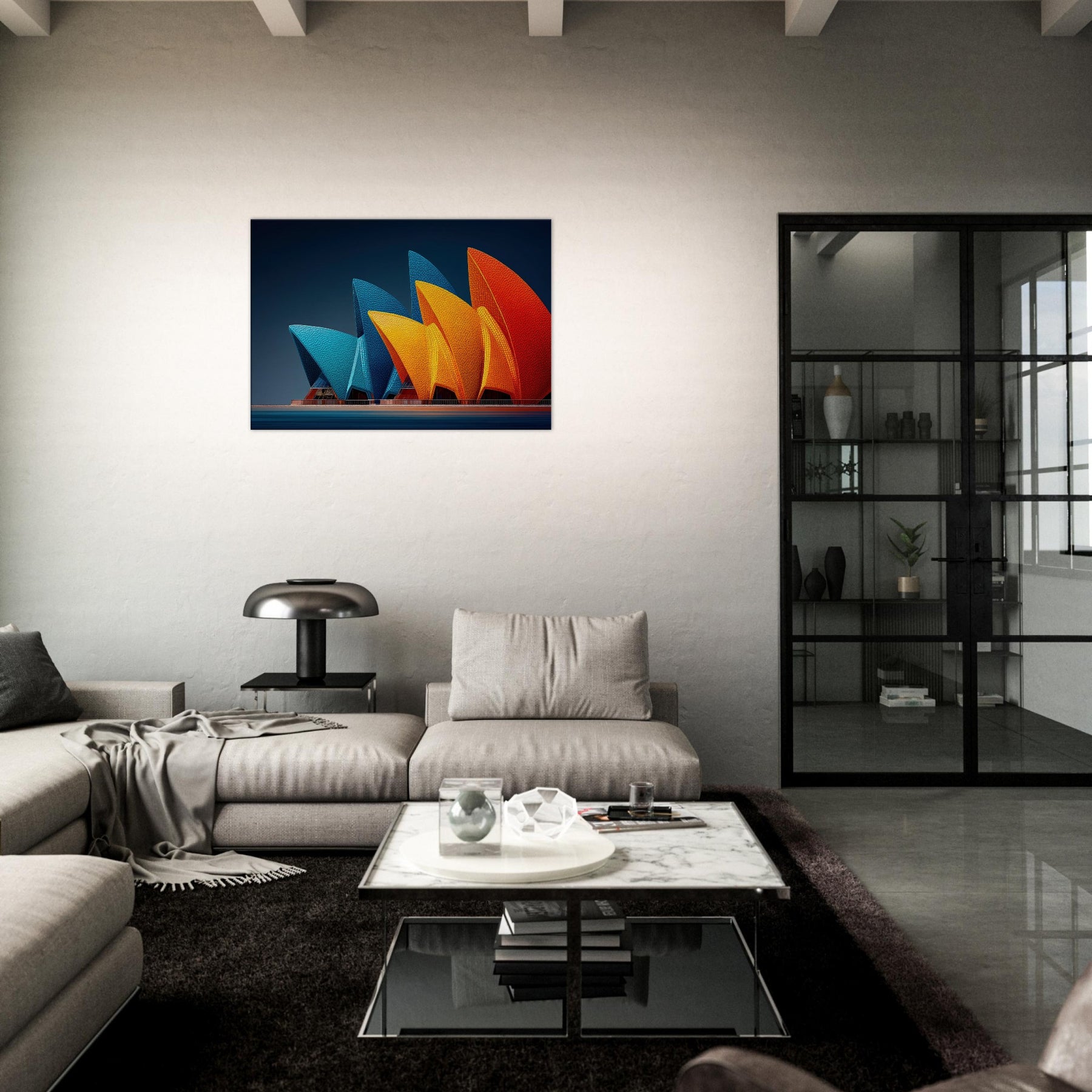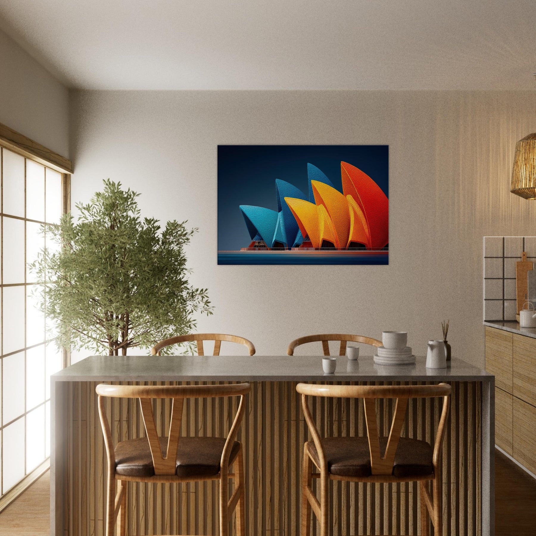 An abstract interpretation of the Sydney Opera House, this piece washes the iconic sails in a luminous duet of azure and flame. The painting room mood evokes sunlit shorelines and midnight harbor lights, infusing a living space with cinematic energy. Its layered geometric rhythm invites quiet contemplation, while the vivid contrast sparks conversation. Hang it in a living room or study to elevate ceilings and create a sense of travel, wonder, and timeless elegance.