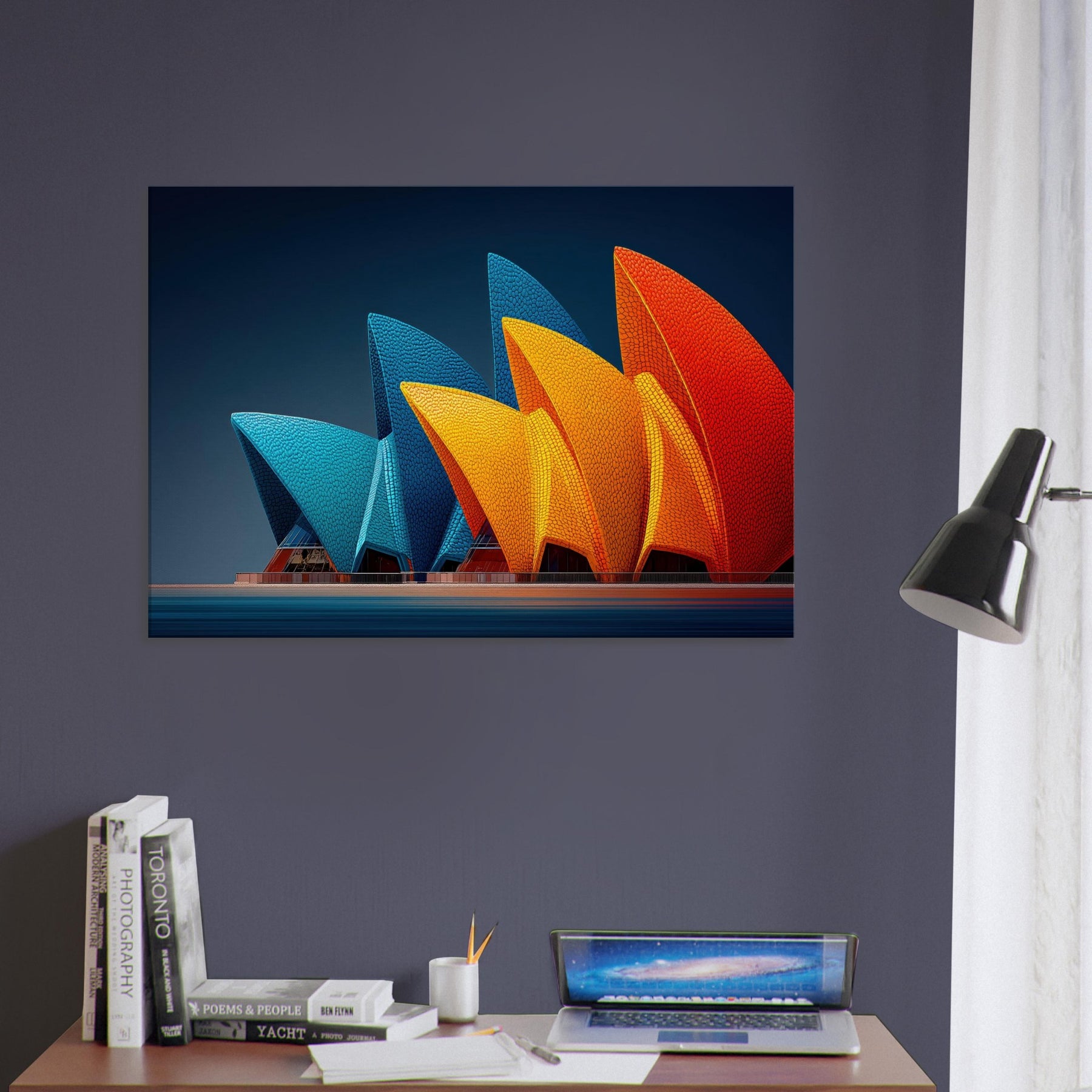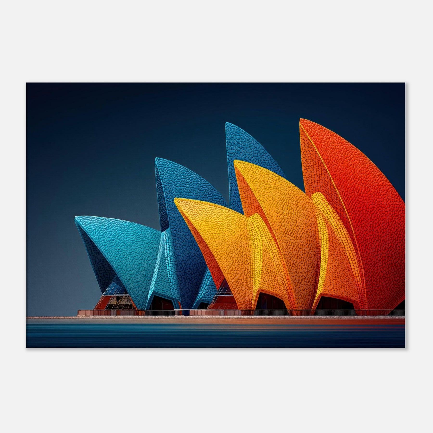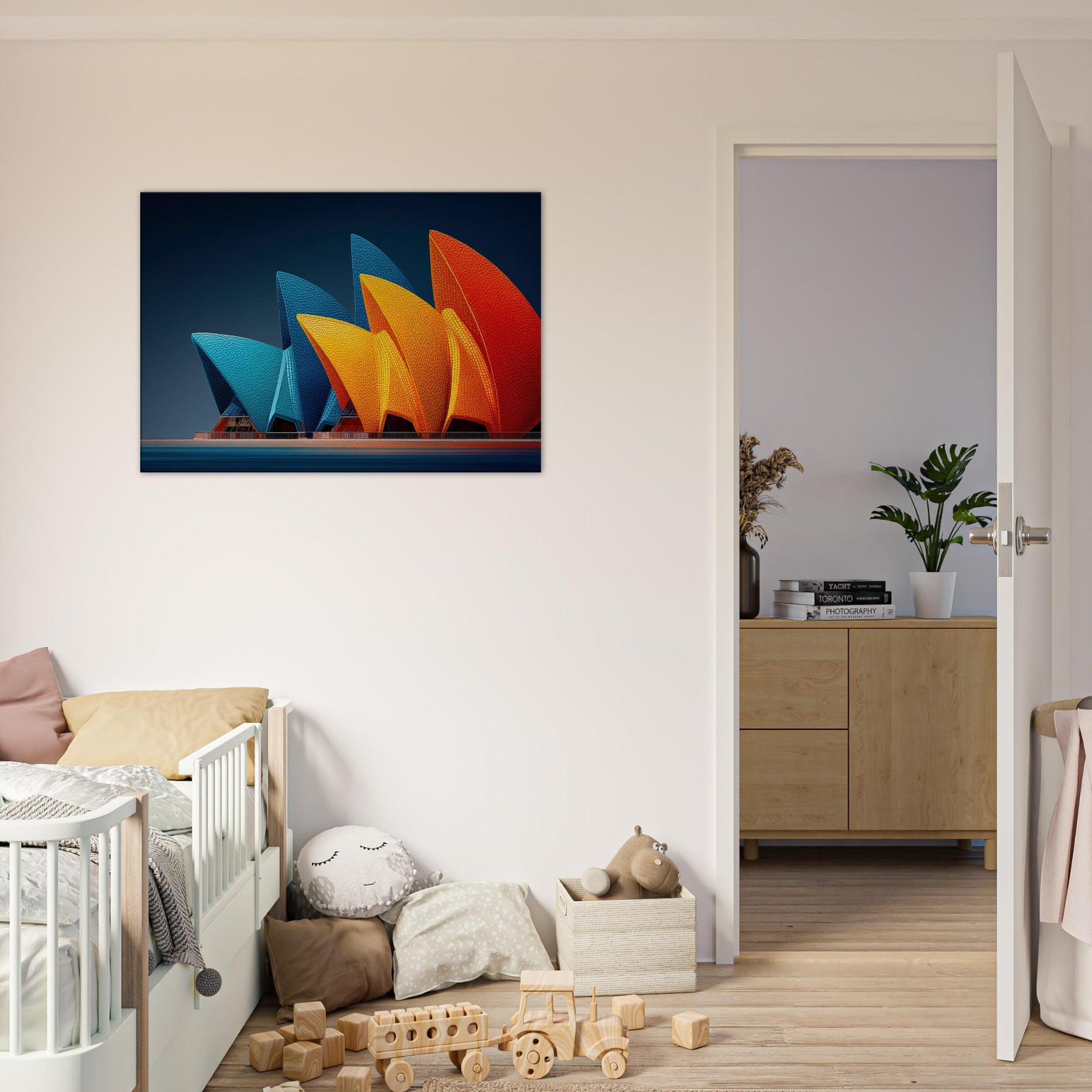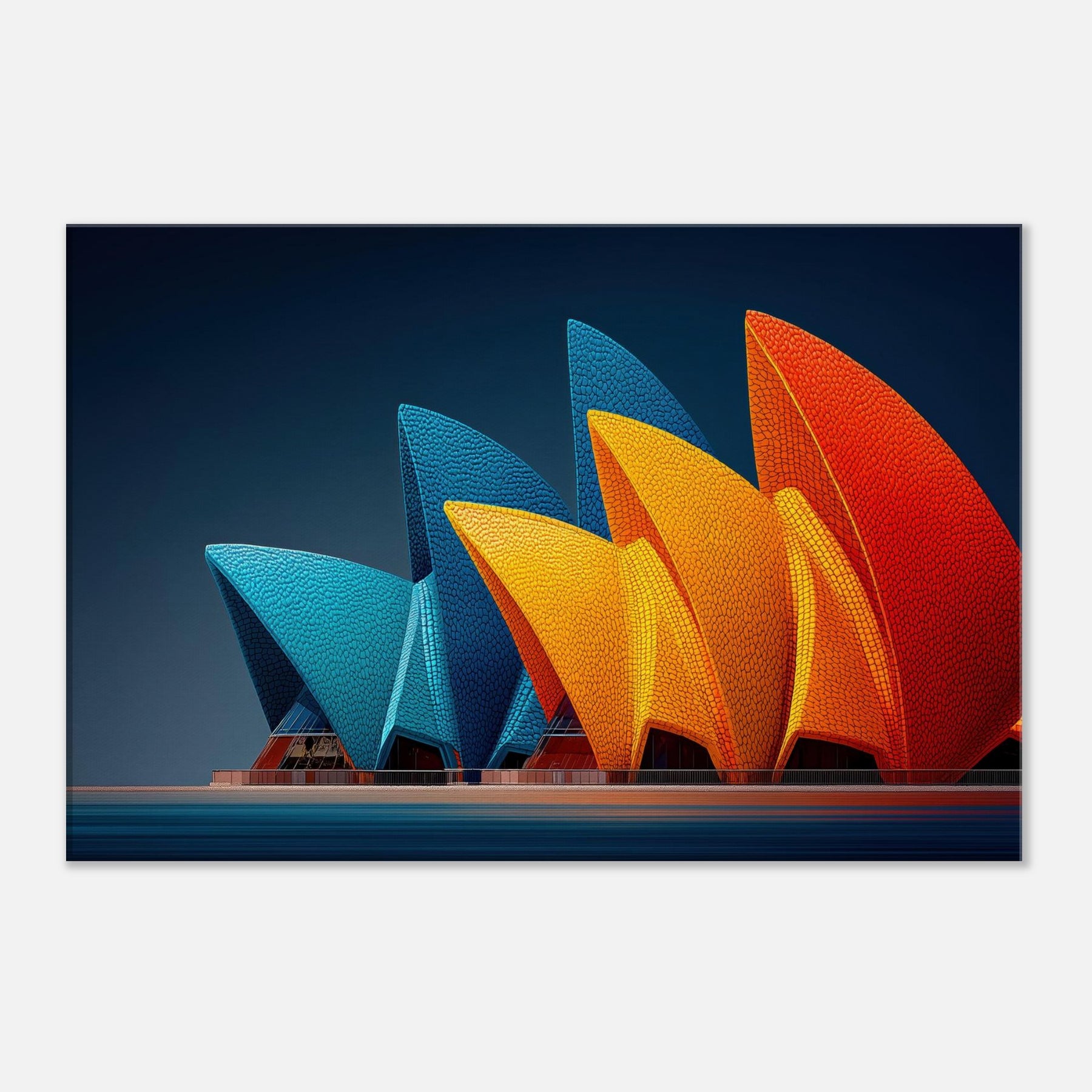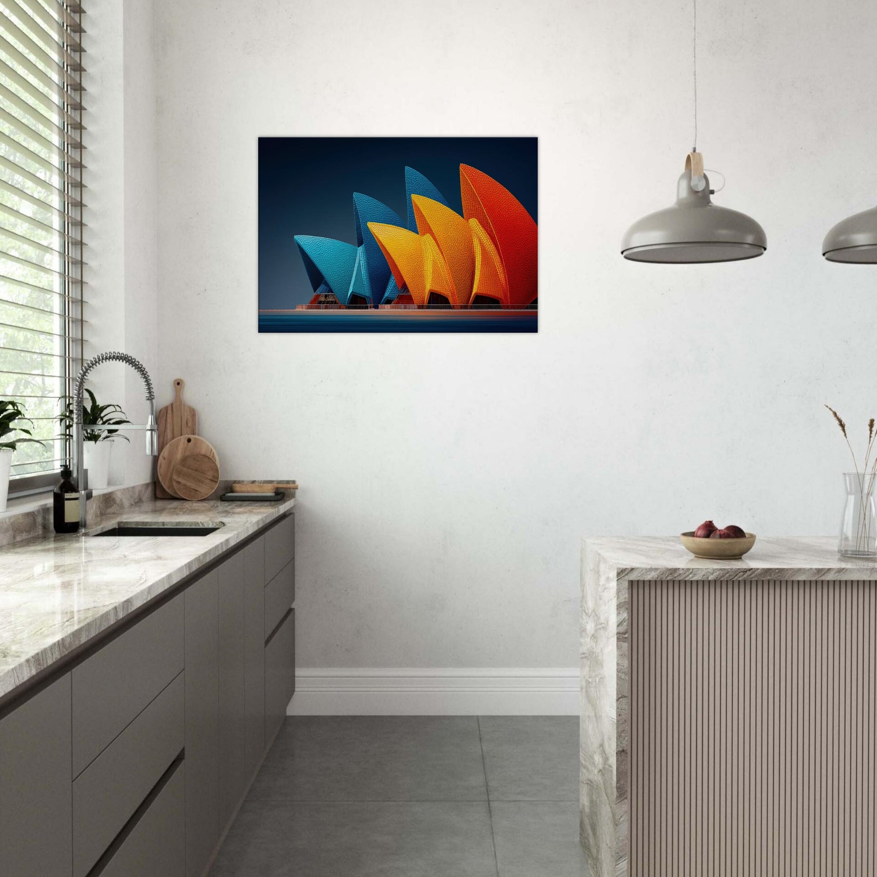 An abstract interpretation of the Sydney Opera House, this piece washes the iconic sails in a luminous duet of azure and flame. The painting room mood evokes sunlit shorelines and midnight harbor lights, infusing a living space with cinematic energy. Its layered geometric rhythm invites quiet contemplation, while the vivid contrast sparks conversation. Hang it in a living room or study to elevate ceilings and create a sense of travel, wonder, and timeless elegance.