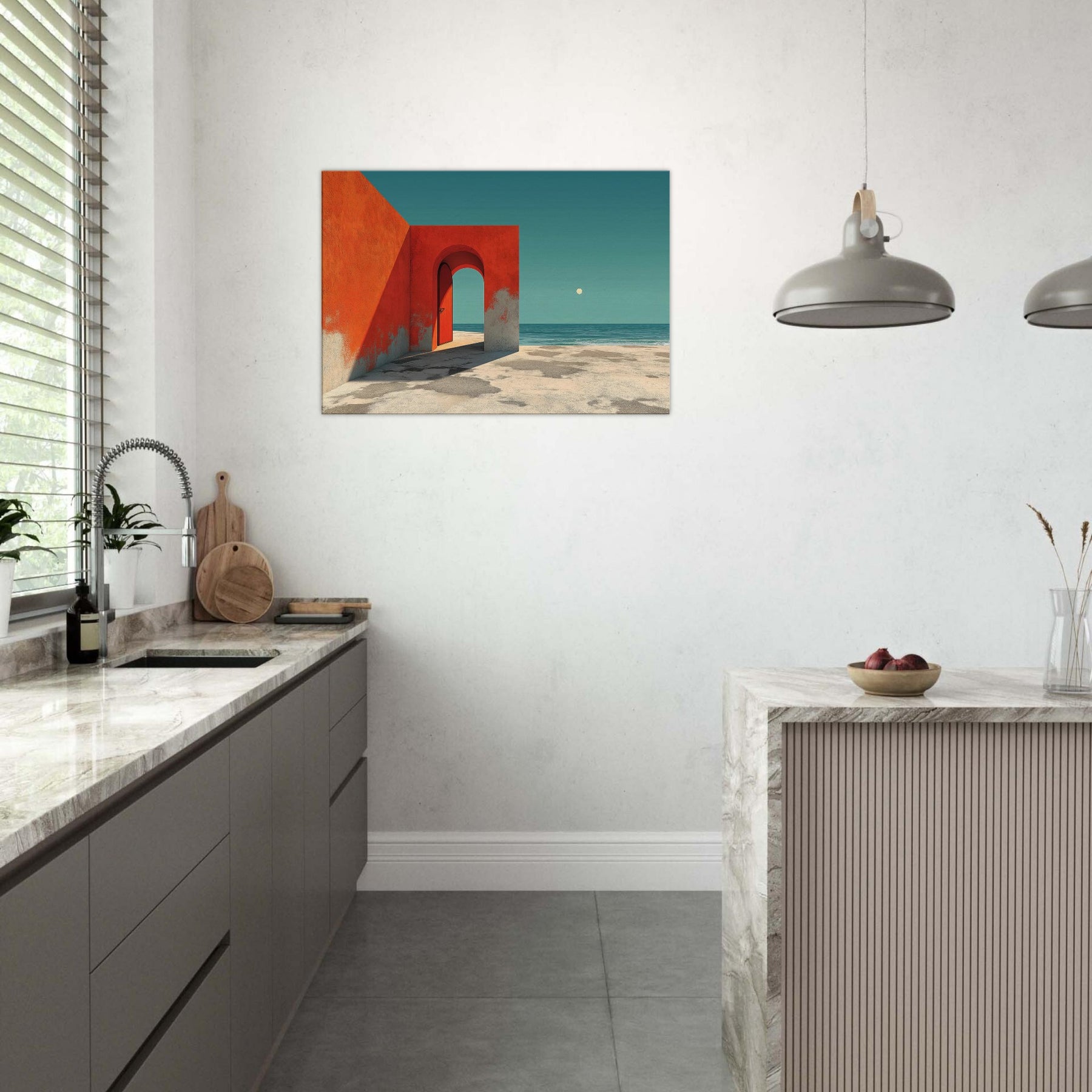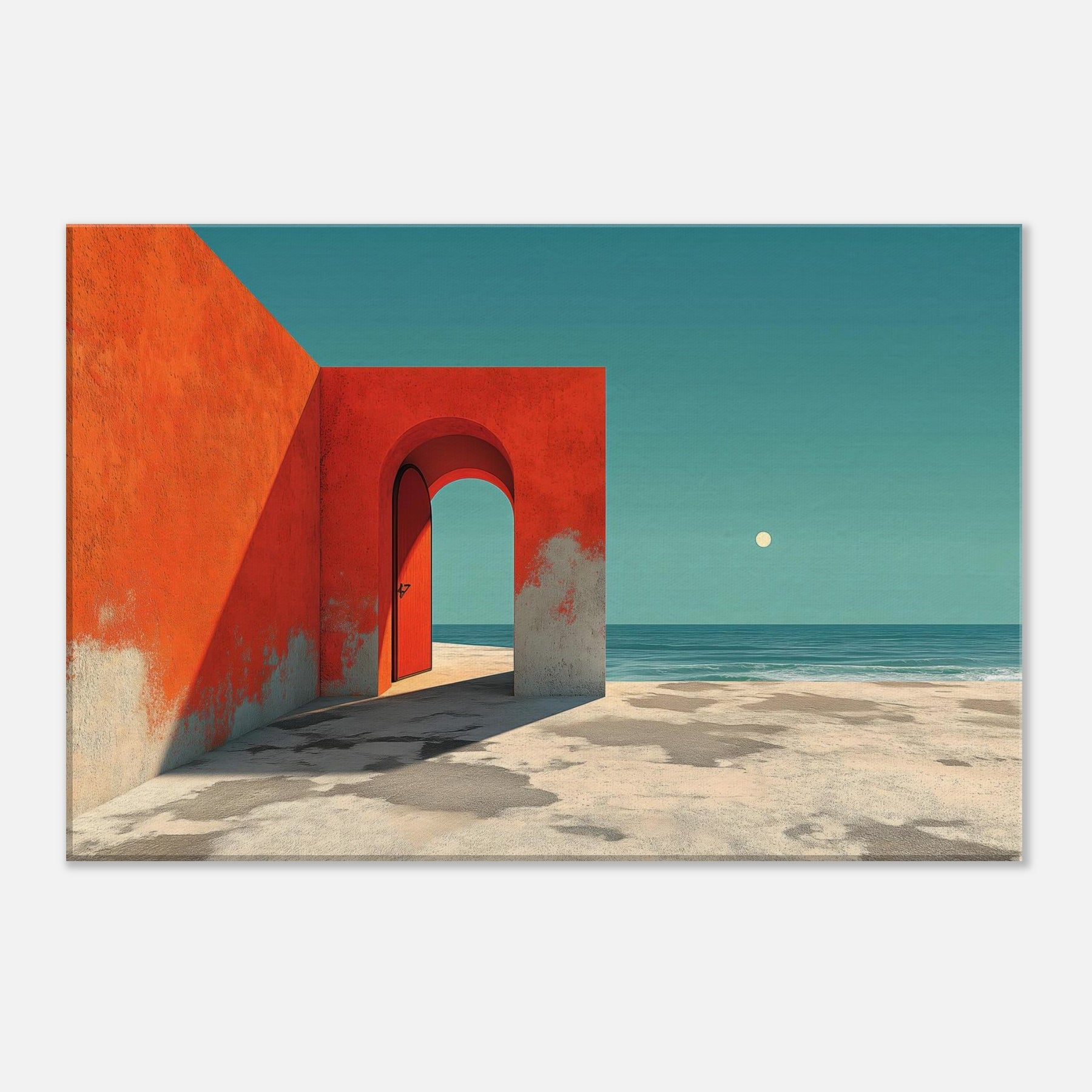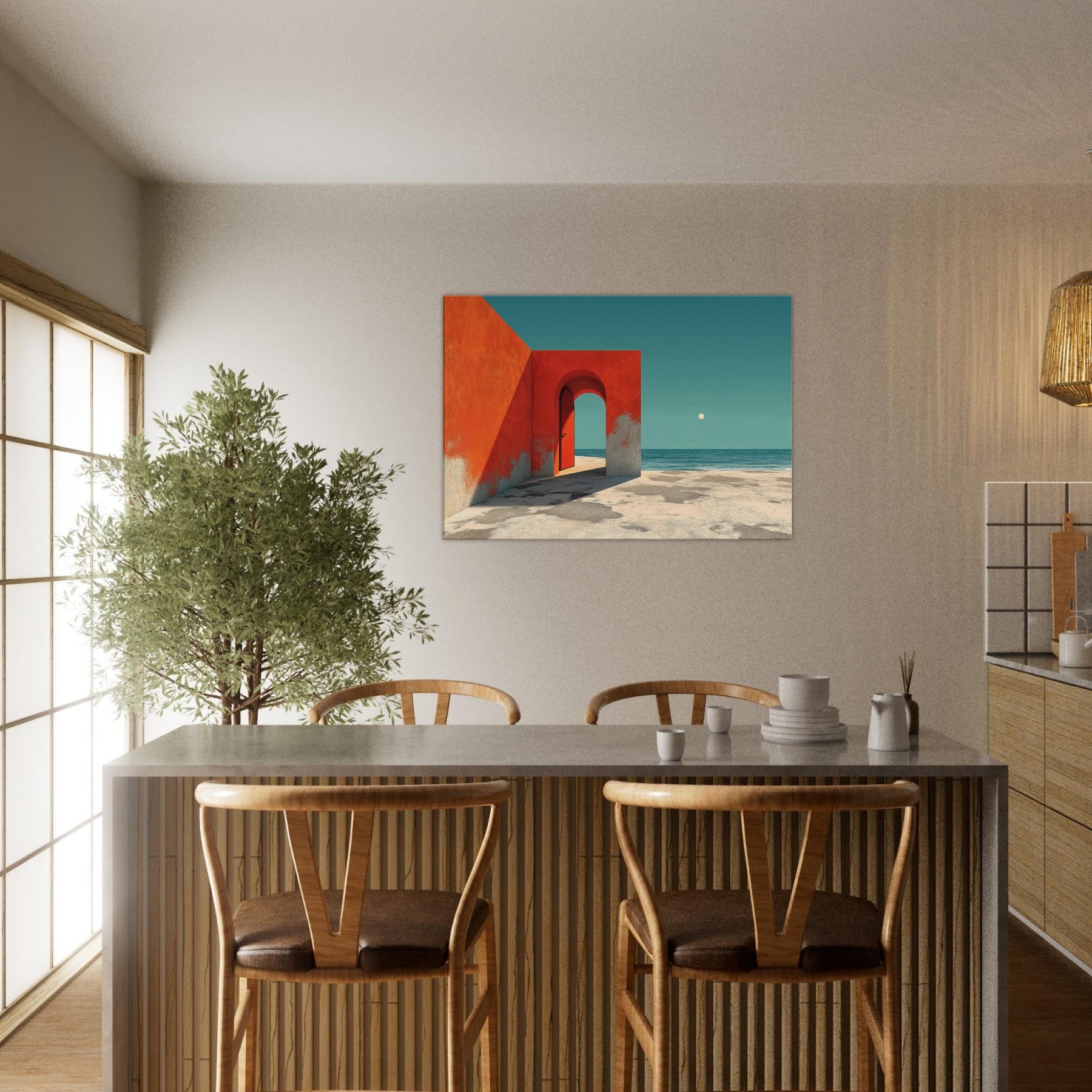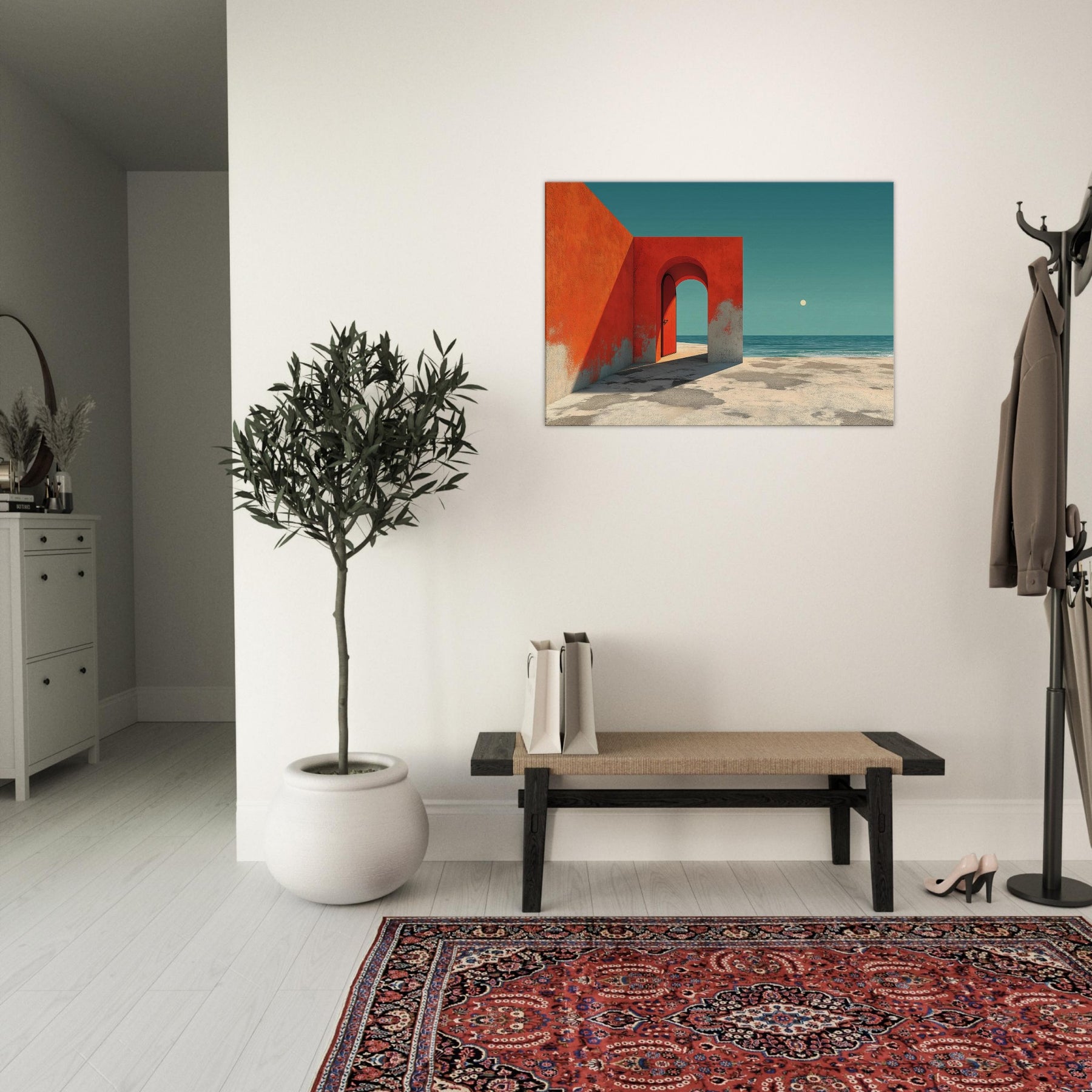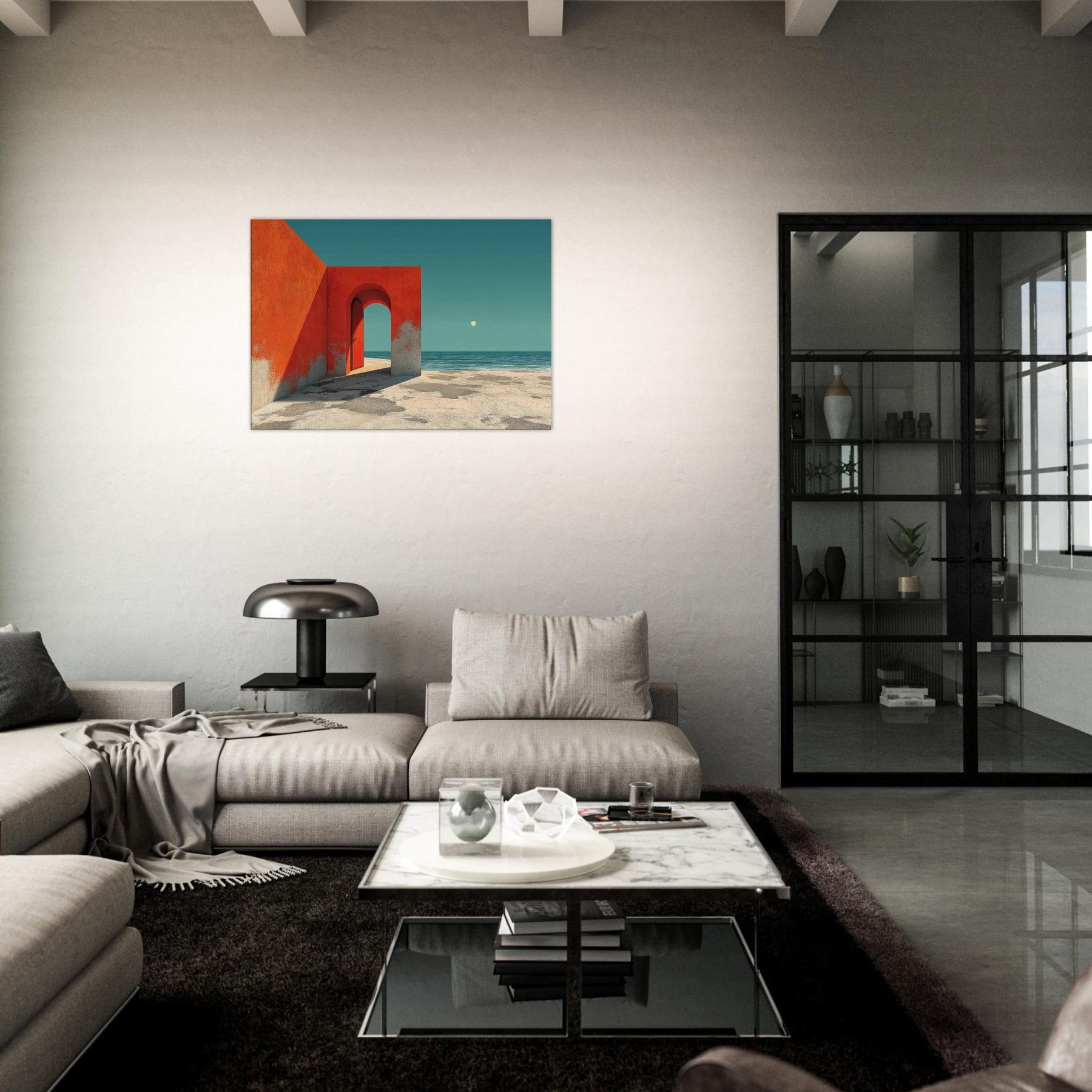 An Archway rises from sun bleached sand, a bold, coral orange portal opening to sea and sky. This abstract composition threads geometry with light, casting long shadows that lap the floor and invite a pause. The feeling is both tropical and urbane, a doorway to quiet mornings and quiet rooms. Hang it to breathe warmth into a living space, to frame conversations, and to anchor a brighter palette. The Archway becomes a memory of coastal light, softened by time and tide.