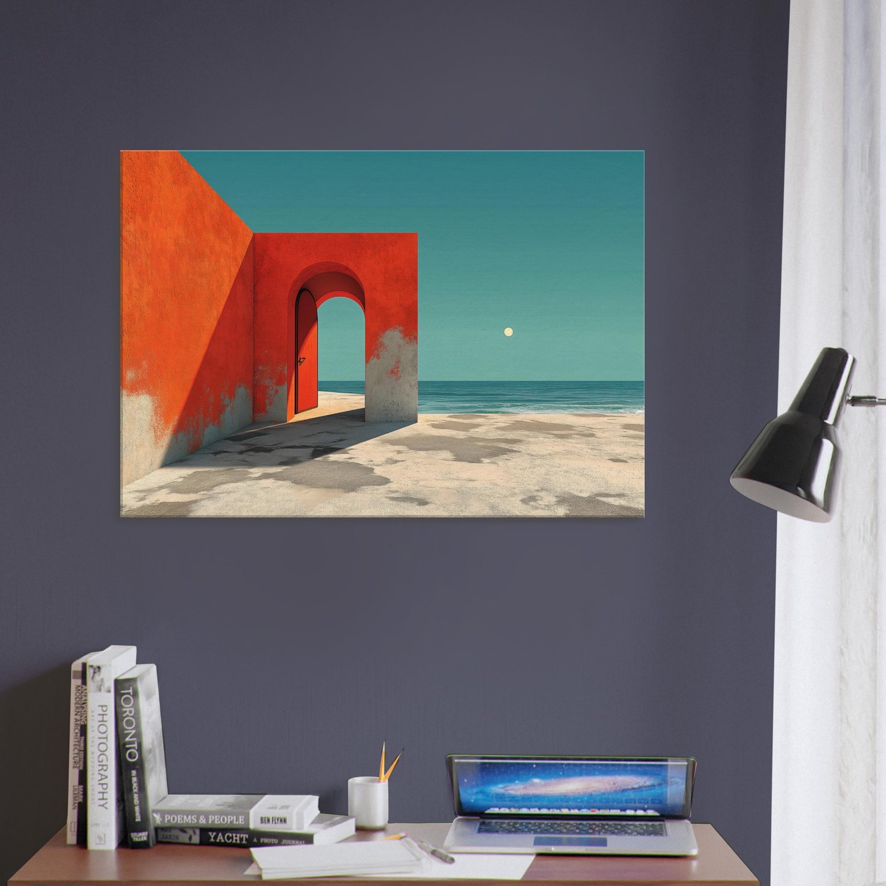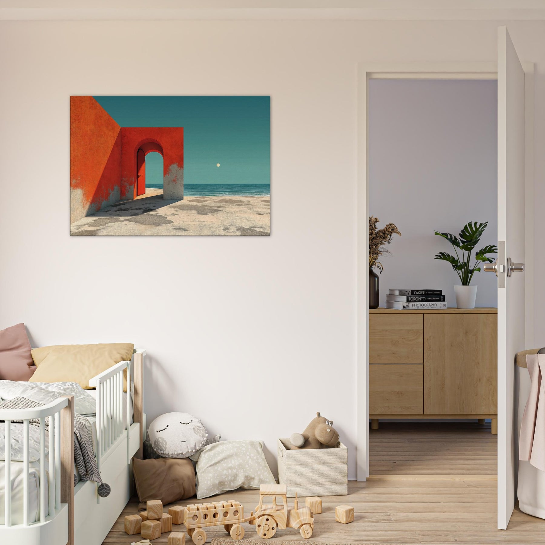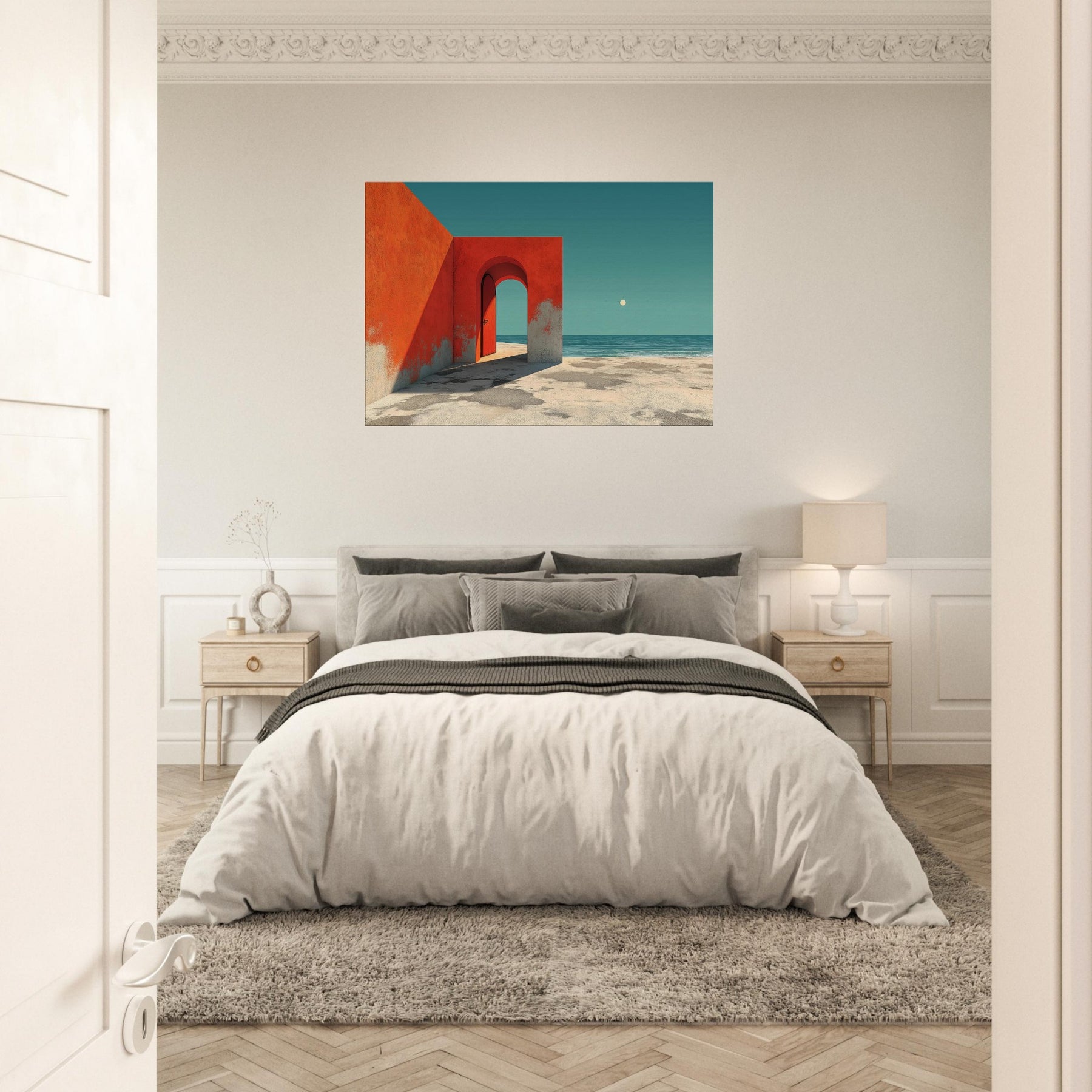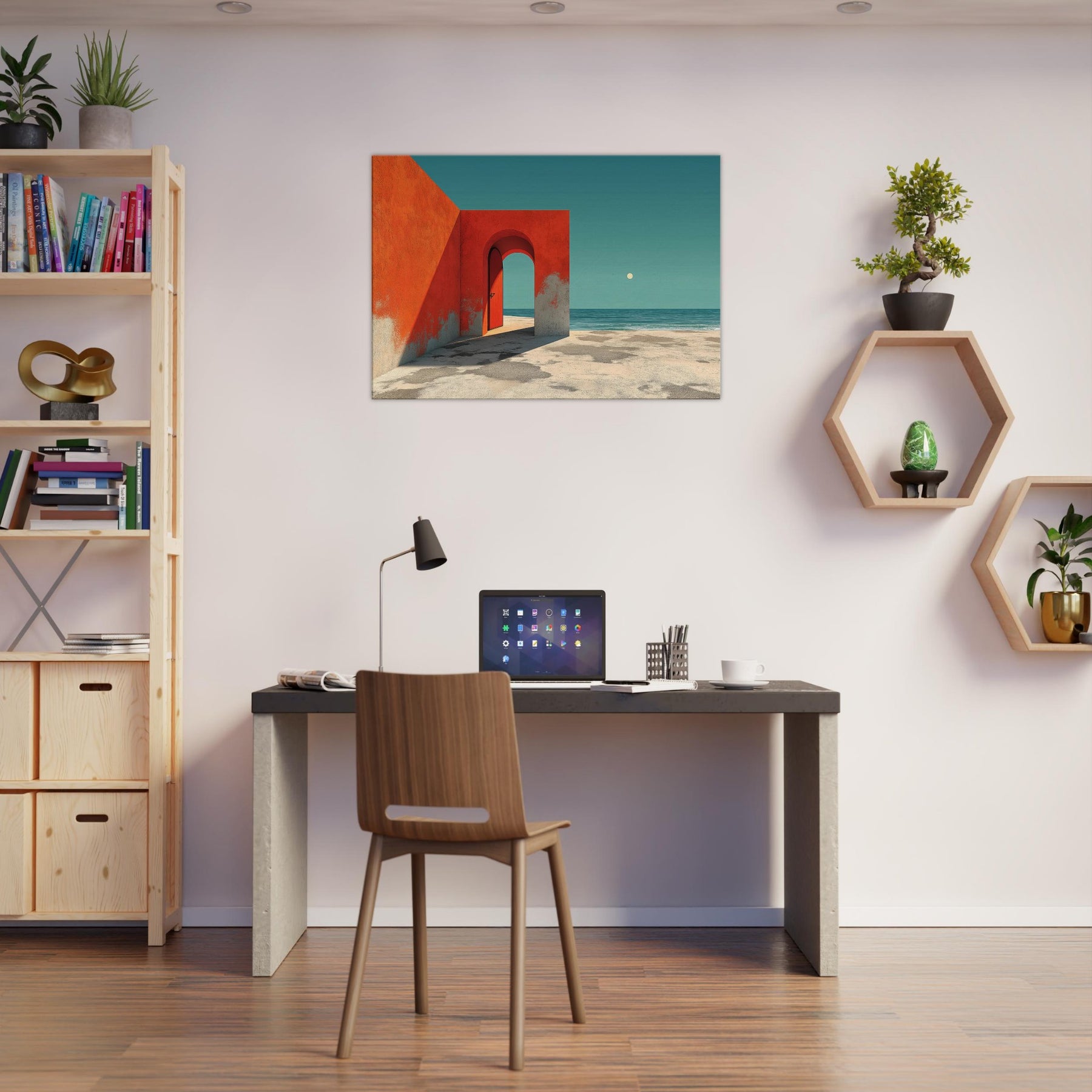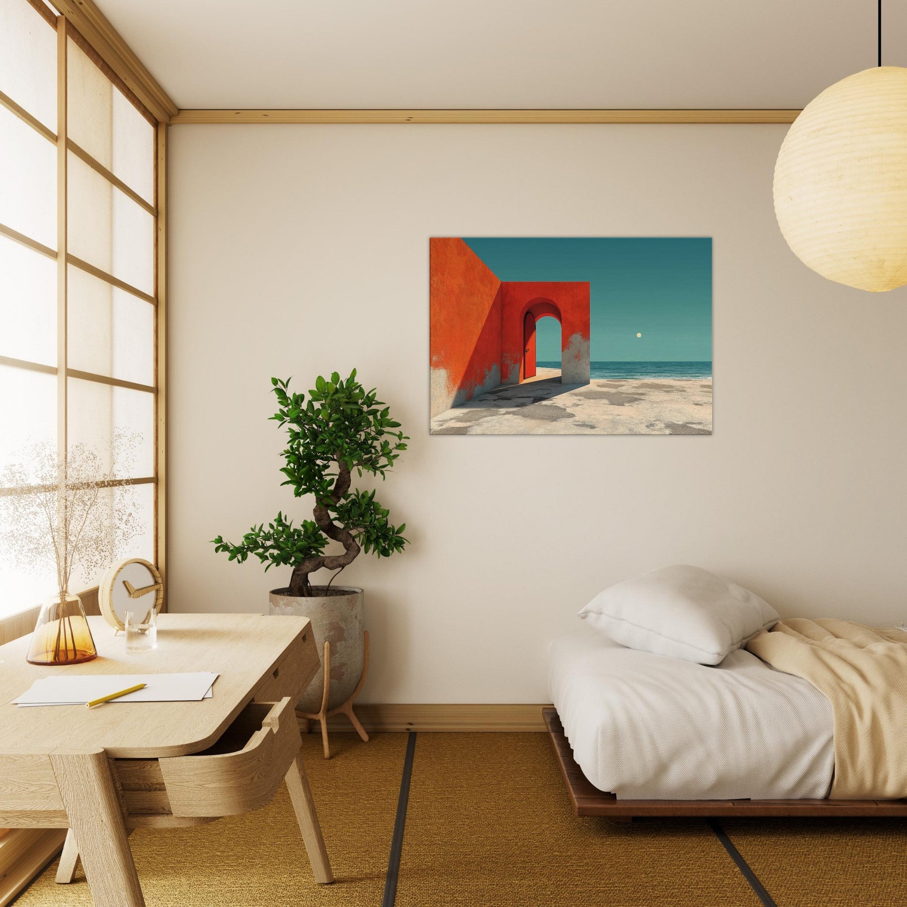 An Archway rises from sun bleached sand, a bold, coral orange portal opening to sea and sky. This abstract composition threads geometry with light, casting long shadows that lap the floor and invite a pause. The feeling is both tropical and urbane, a doorway to quiet mornings and quiet rooms. Hang it to breathe warmth into a living space, to frame conversations, and to anchor a brighter palette. The Archway becomes a memory of coastal light, softened by time and tide.