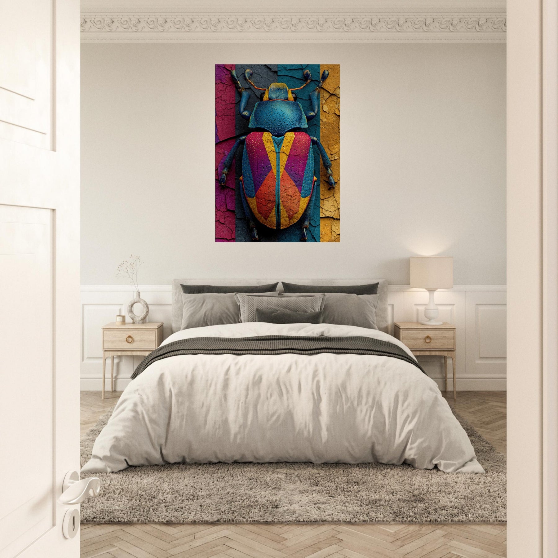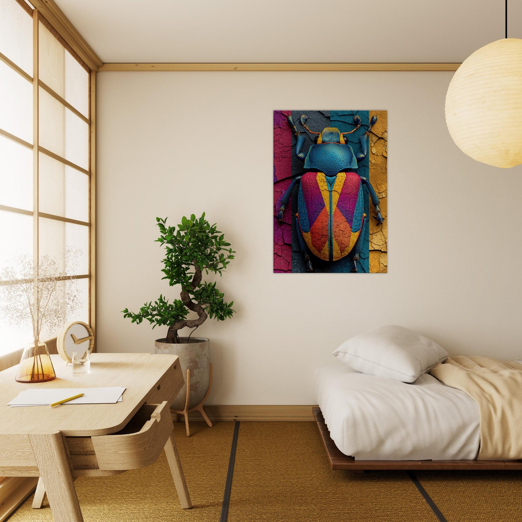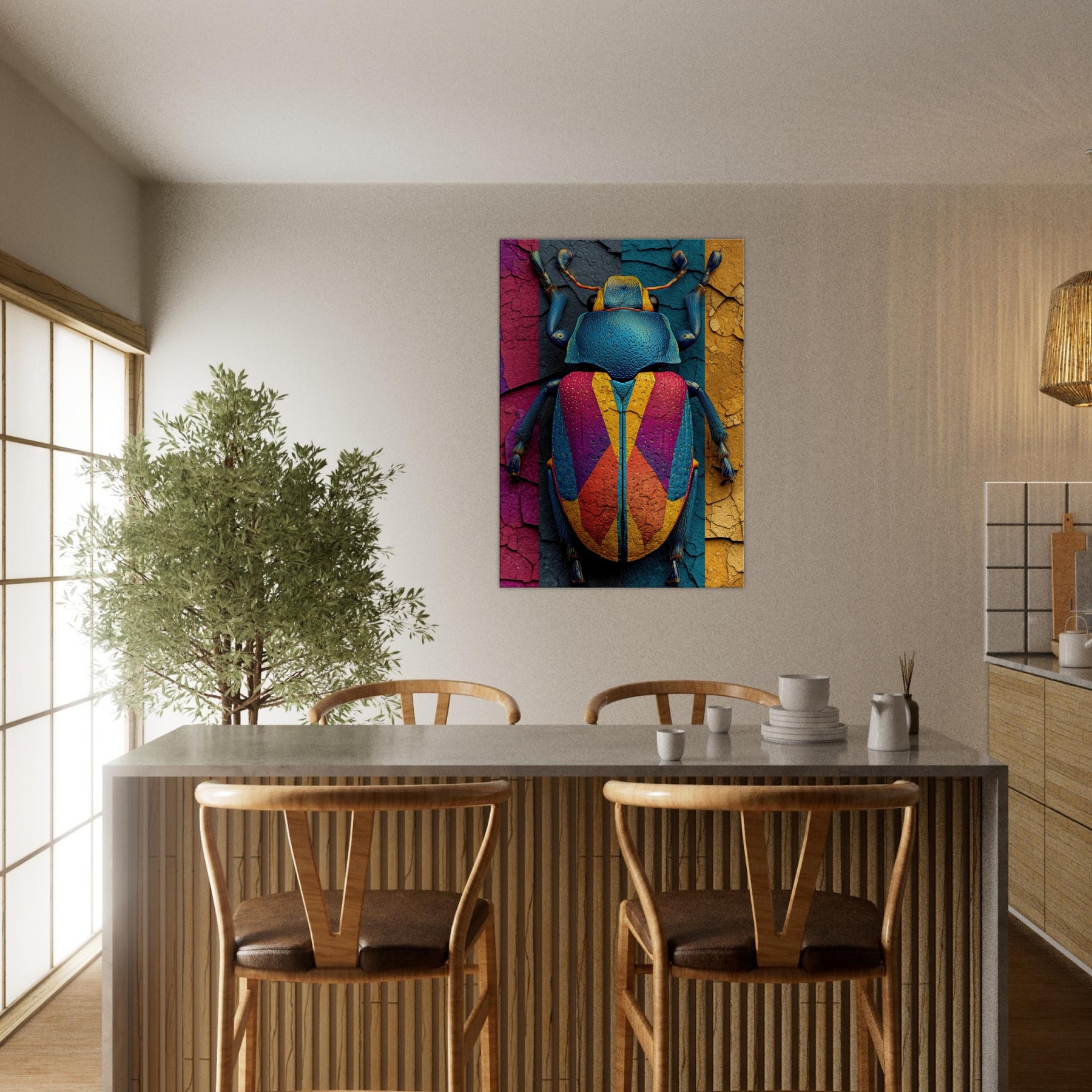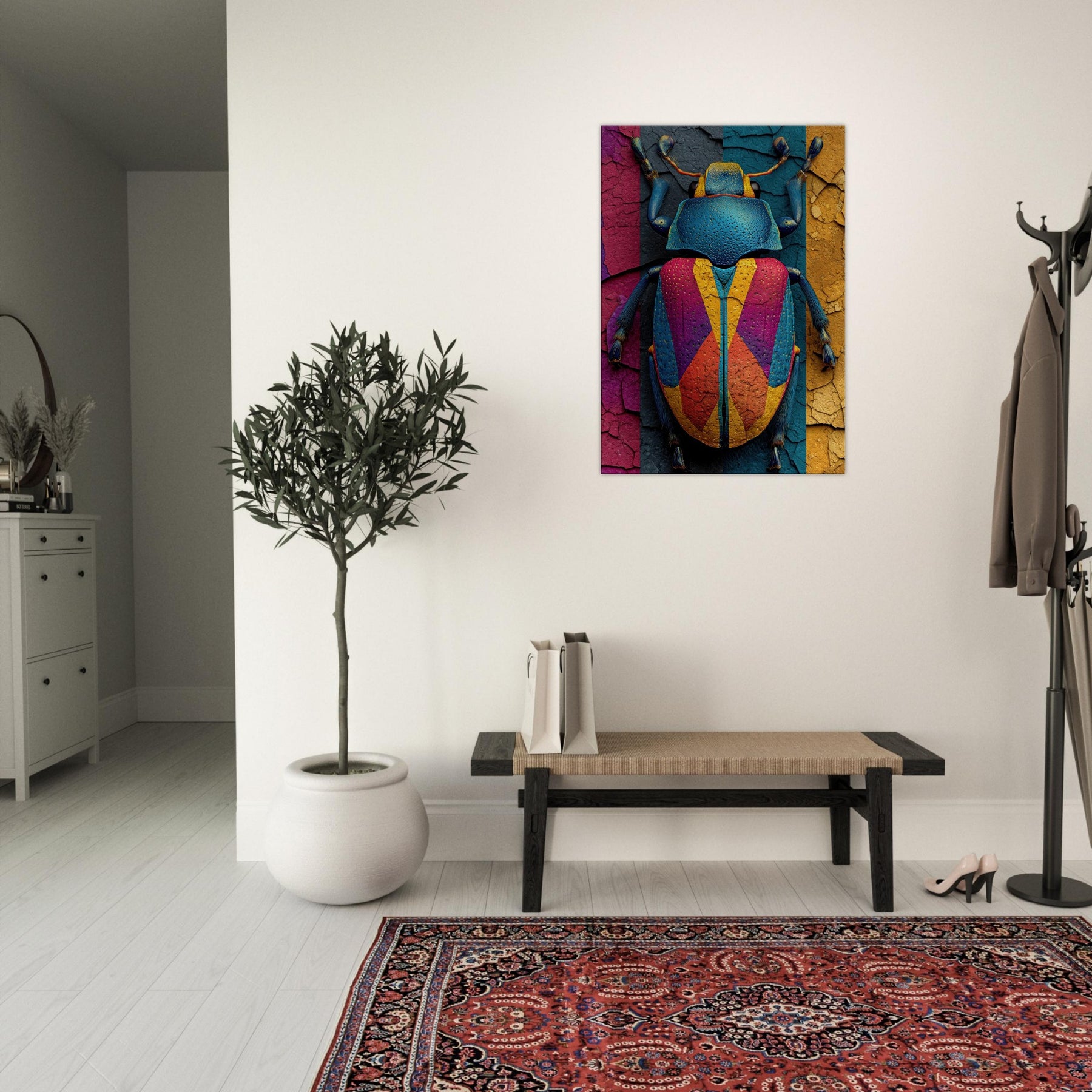 Let the scarab the symbol of renewal glow at the center of your room. This abstract piece unfurls color like a sunrise: cobalt carapace, ember edges, and panels of magenta, gold, and teal that catch the light and invite the eye to wander. The textured surface recalls ancient stone and living motion, turning a space into a sanctuary of wonder. Hang it where you savor morning calm or evening conversation; the mystical scarab elevates mood, sparks imagination, and softens every edge with luminous warmth.
