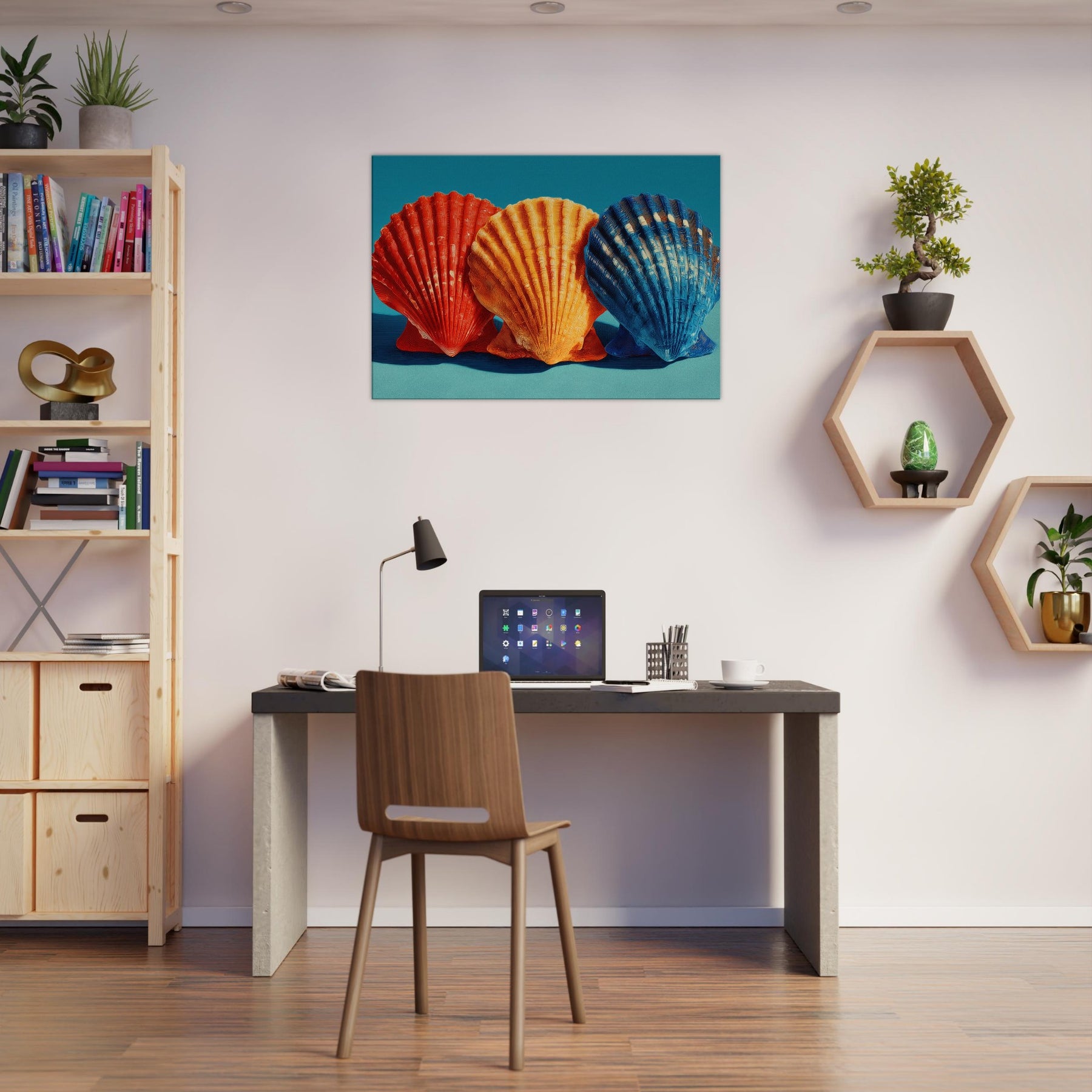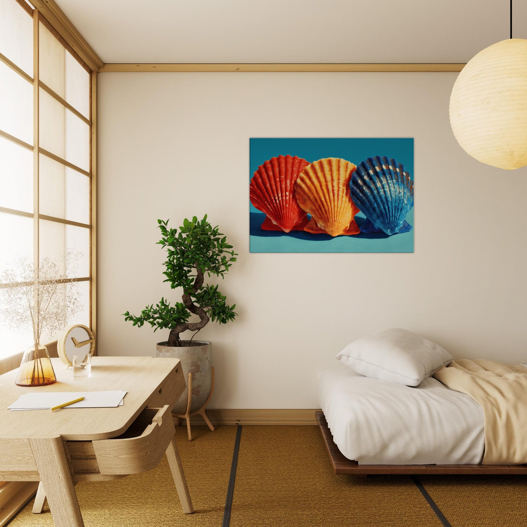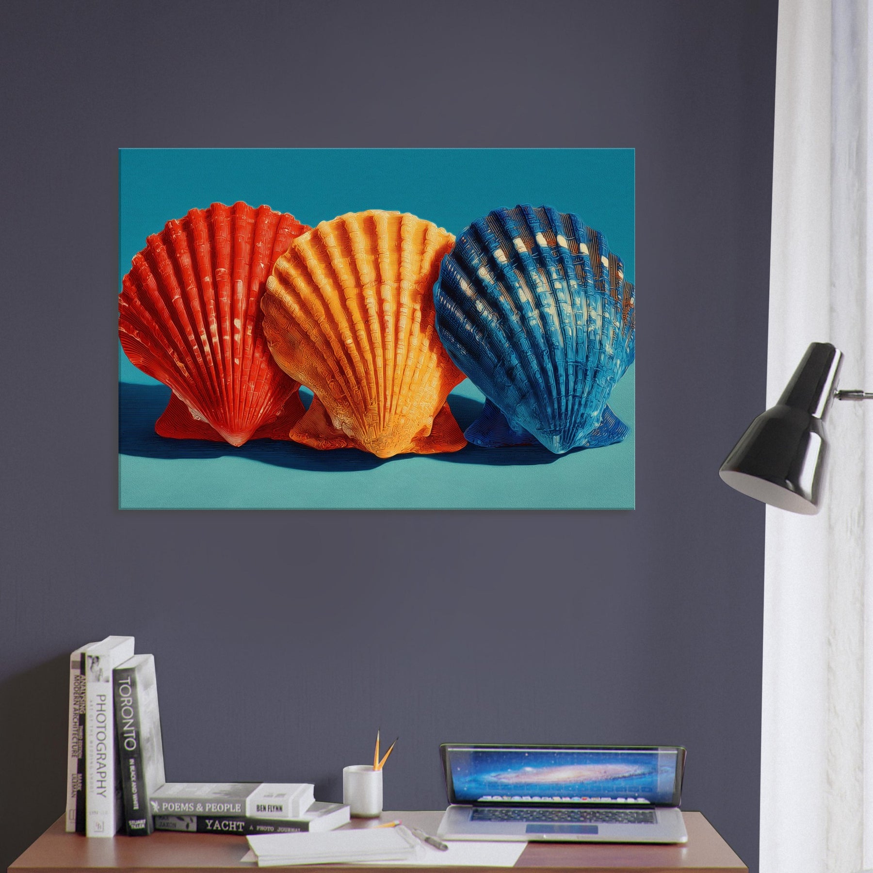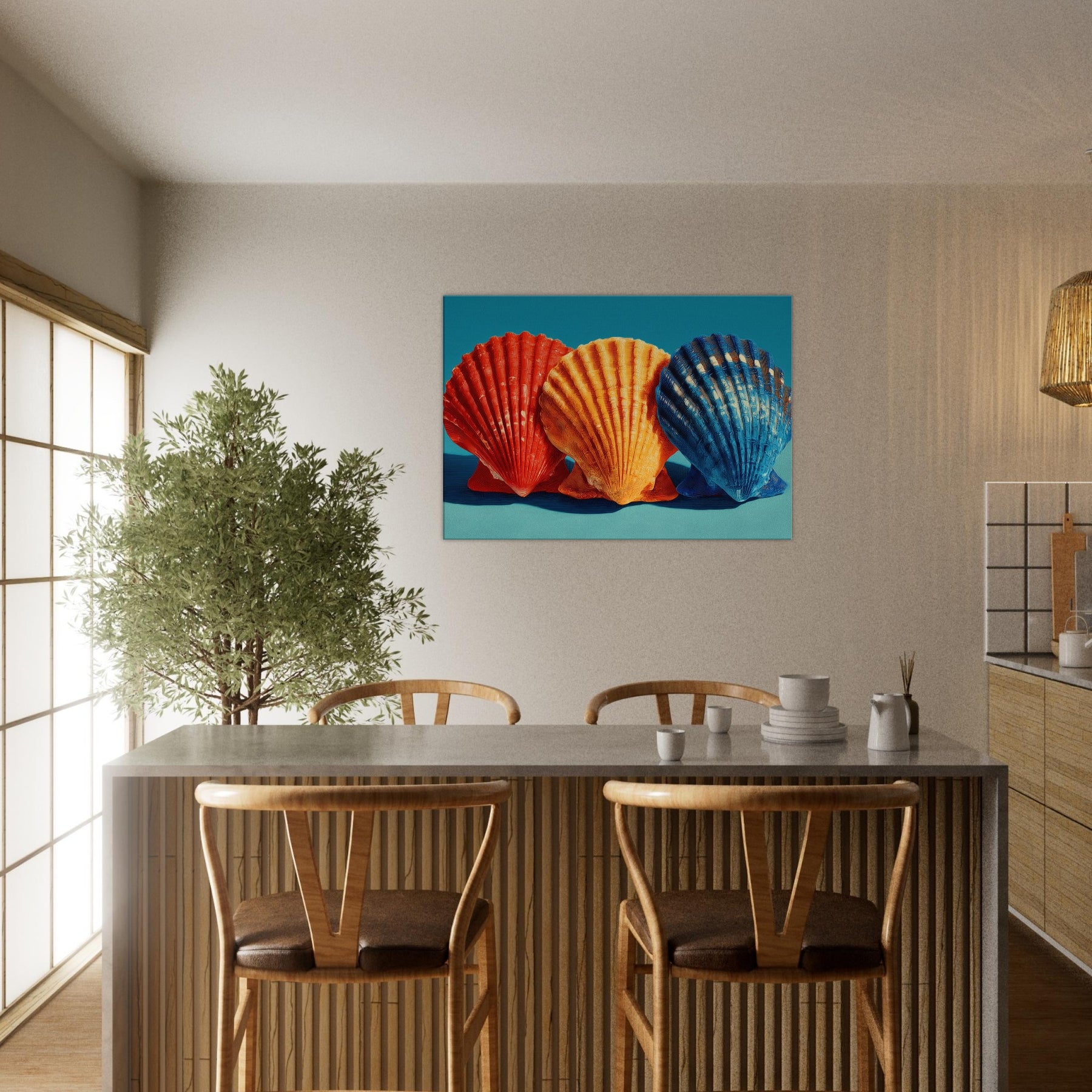 Seashells Trio rests in a soft, sunlit corner, where warm light plays across ribbed curves and brings their sculptural rhythm to life. The trio radiates a coastal warmth crimson, tangerine, and deep cobalt leaning into a calm teal backdrop that feels like sea air at dusk. This piece invites quiet reflection, casting a gentle glow that enhances a living space with texture, memory, and possibility. Perfect above a sofa or bedside, it turns everyday walls into a shoreline sanctuary inviting you to breathe, linger, and dream.