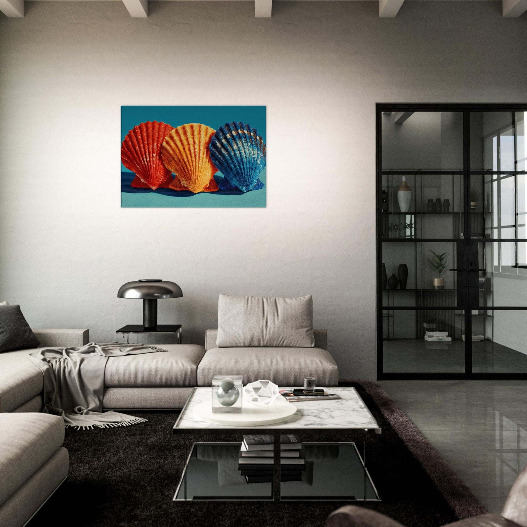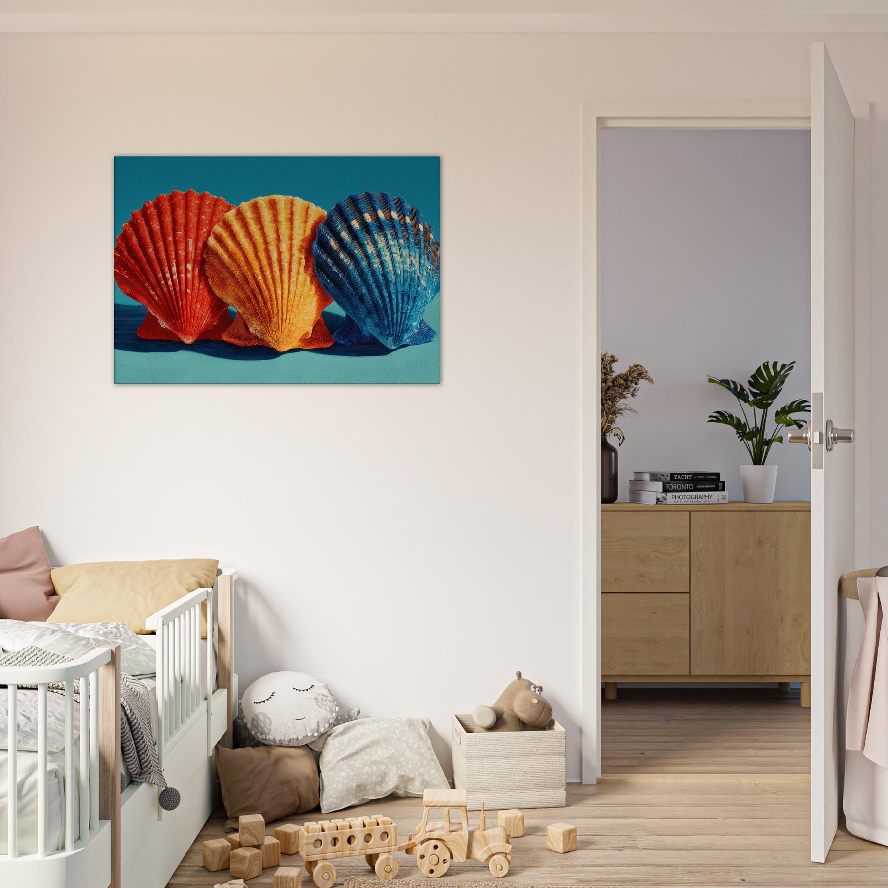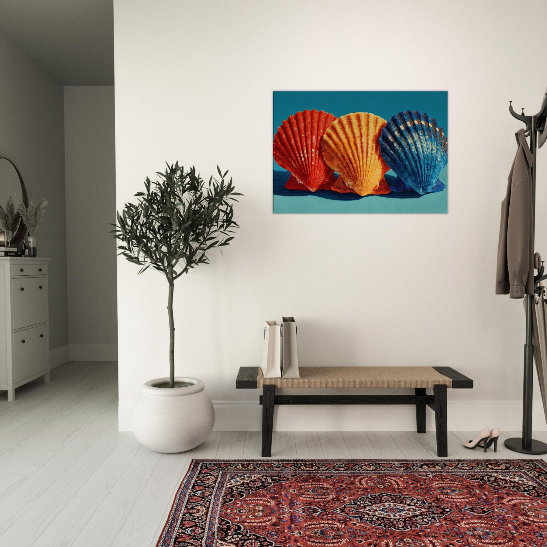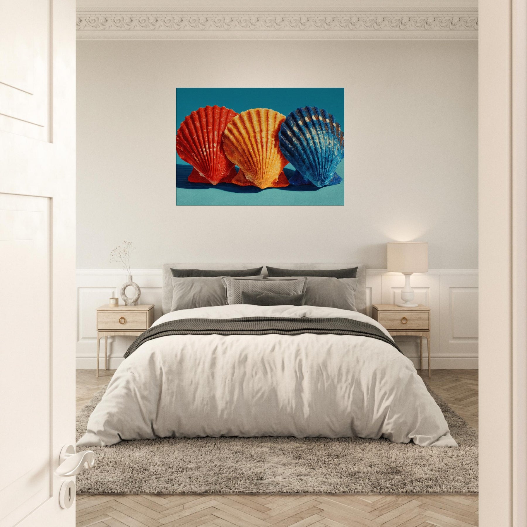Seashells Trio rests in a soft, sunlit corner, where warm light plays across ribbed curves and brings their sculptural rhythm to life. The trio radiates a coastal warmth crimson, tangerine, and deep cobalt leaning into a calm teal backdrop that feels like sea air at dusk. This piece invites quiet reflection, casting a gentle glow that enhances a living space with texture, memory, and possibility. Perfect above a sofa or bedside, it turns everyday walls into a shoreline sanctuary inviting you to breathe, linger, and dream.