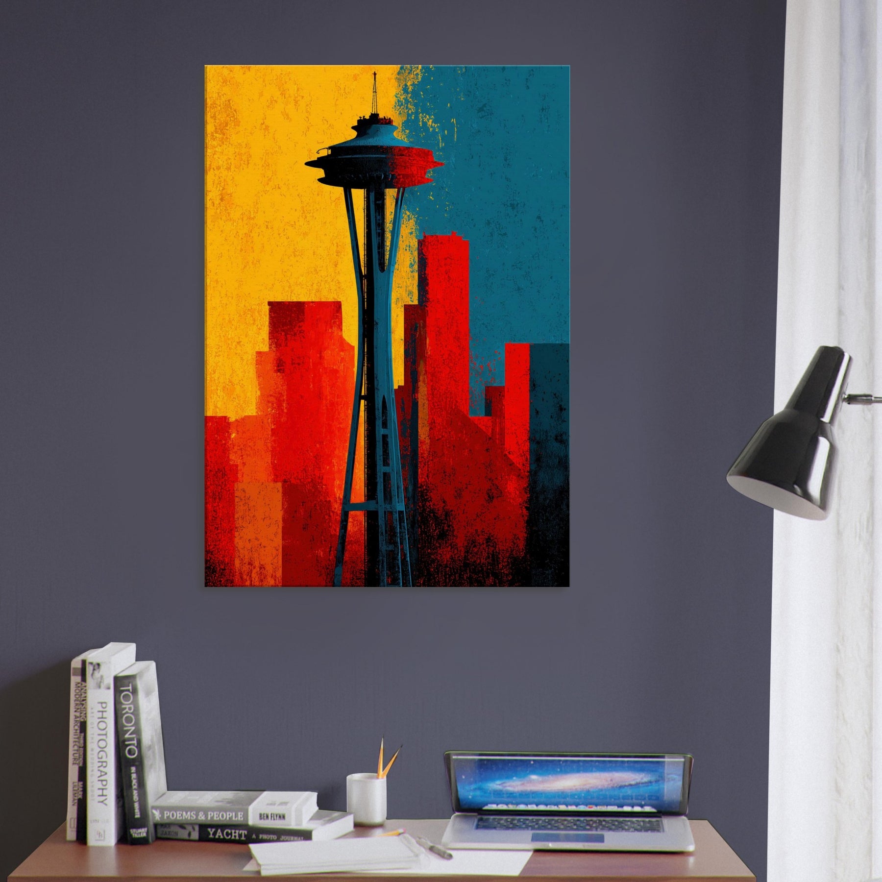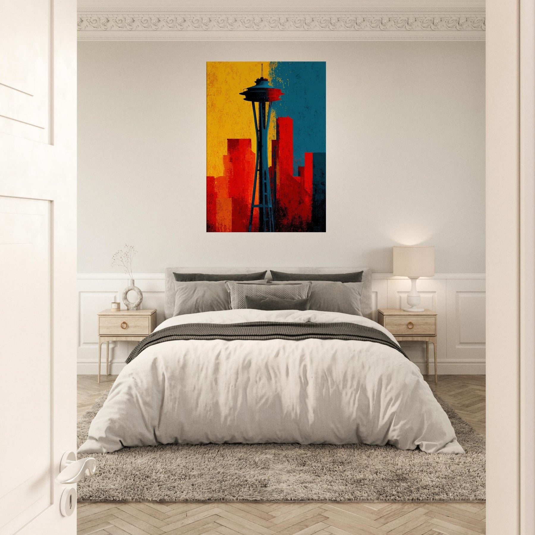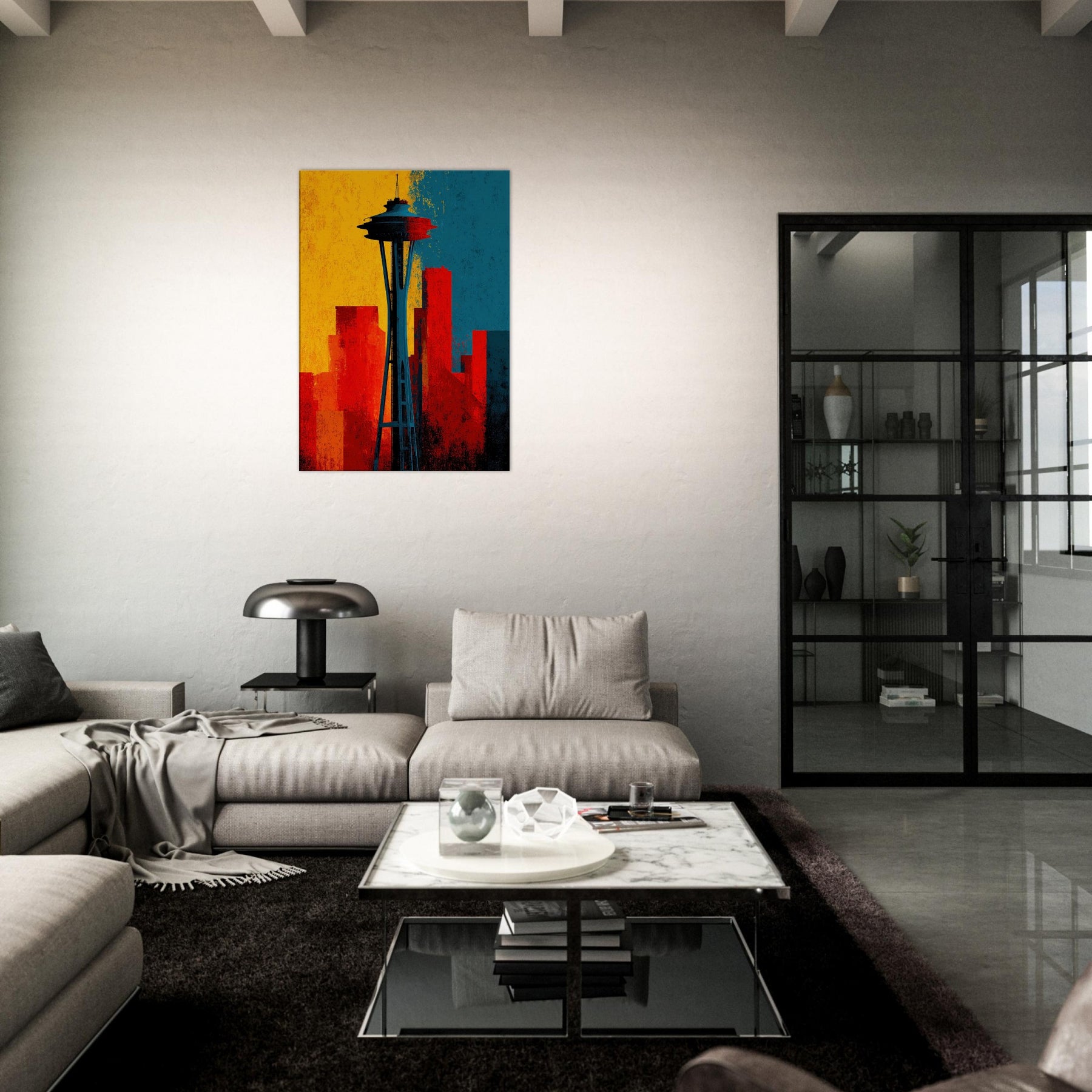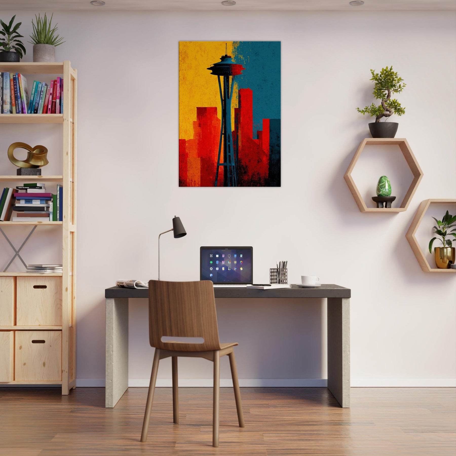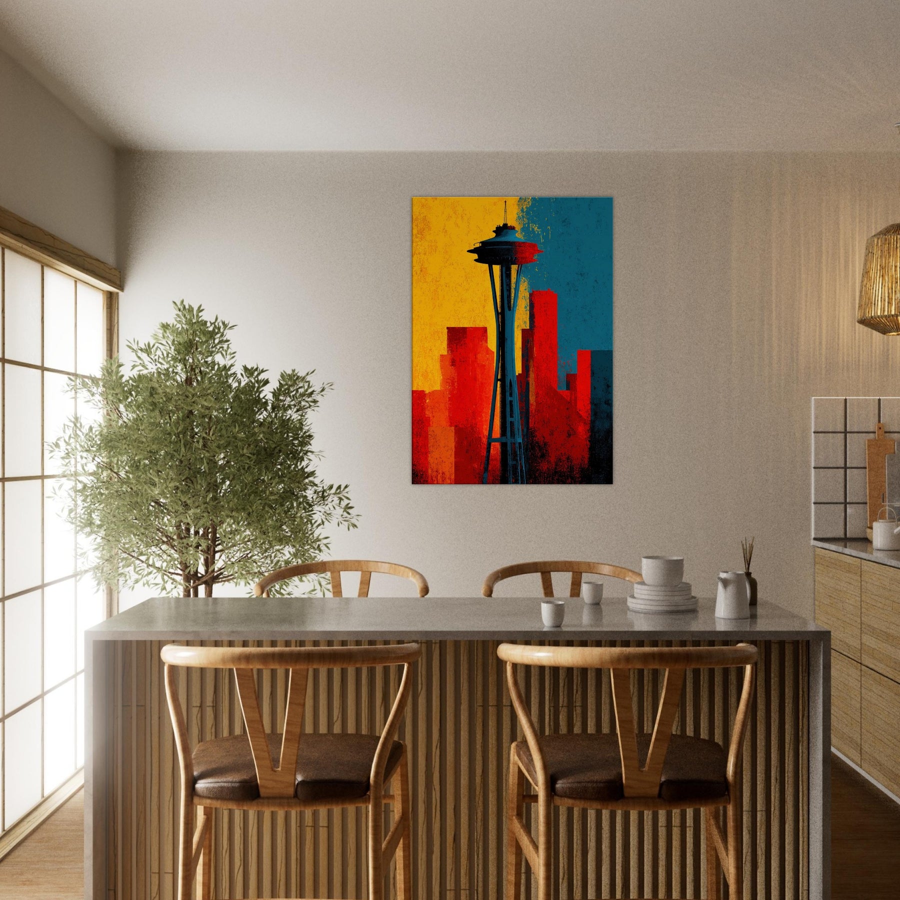 Seattle's skyline dissolves into a dance of color and form, inviting the room to breathe with urban energy. This abstract cityscape blends amber, teal, and deep crimson into a perceptual glow that shifts with the light. The slender, tower like silhouette anchors the composition, giving depth and a sense of quiet motion. Perfect for a living room, study, or entryway, it adds a sophisticated, atmospheric touch that warms conversations and makes every evening feel a little more connected to the city.