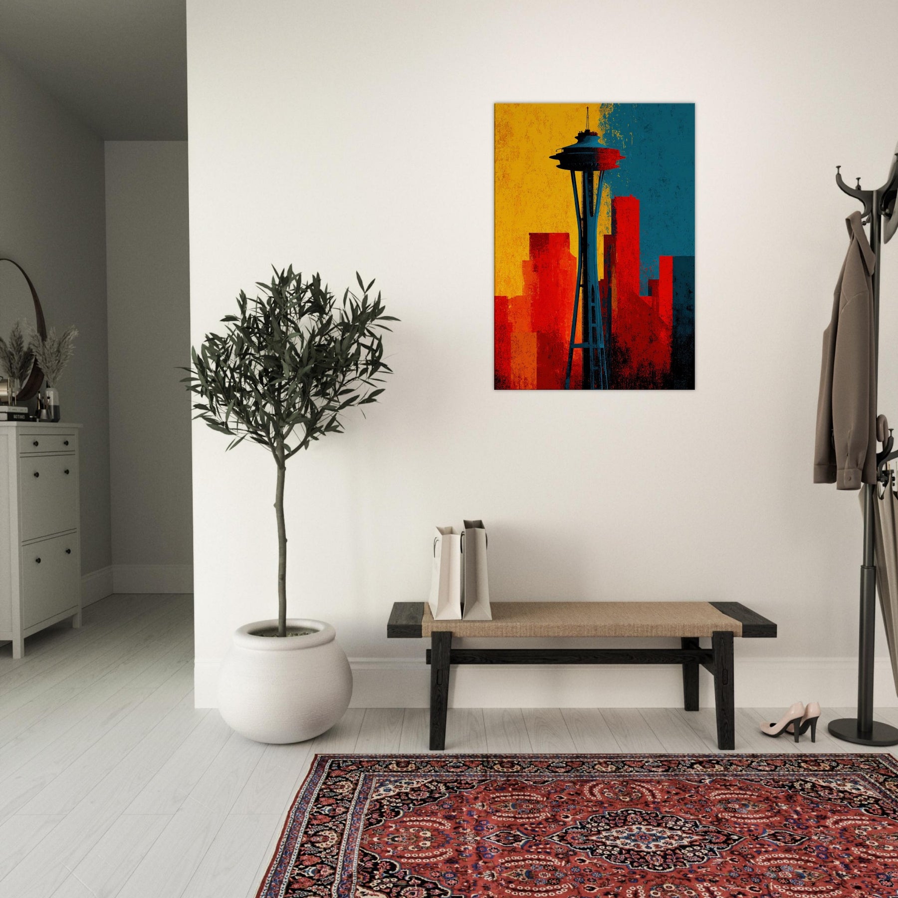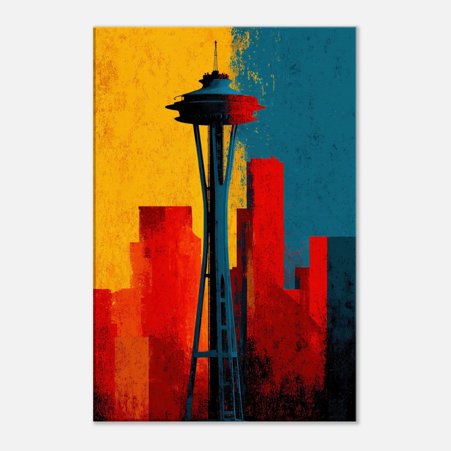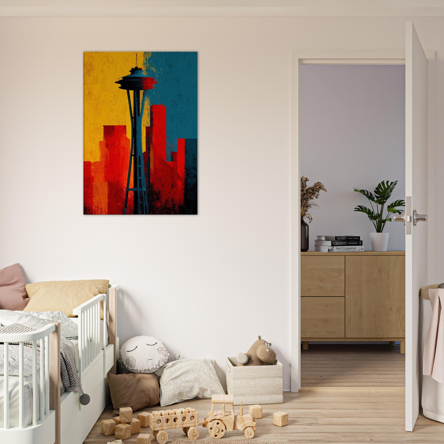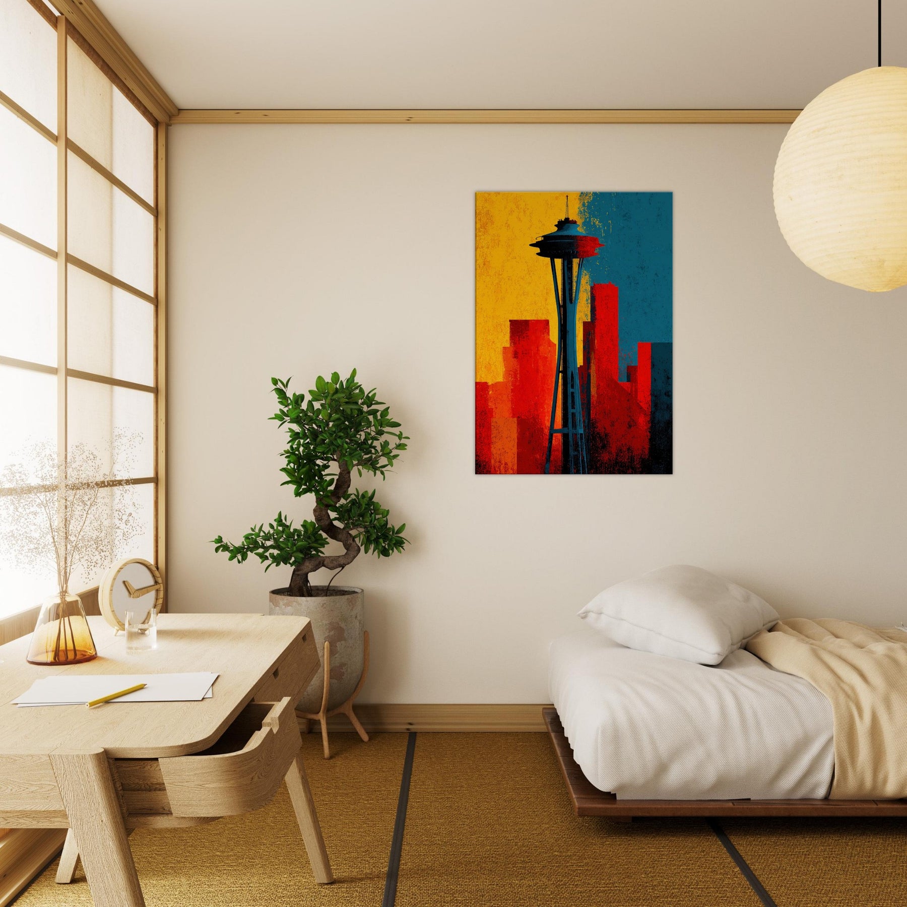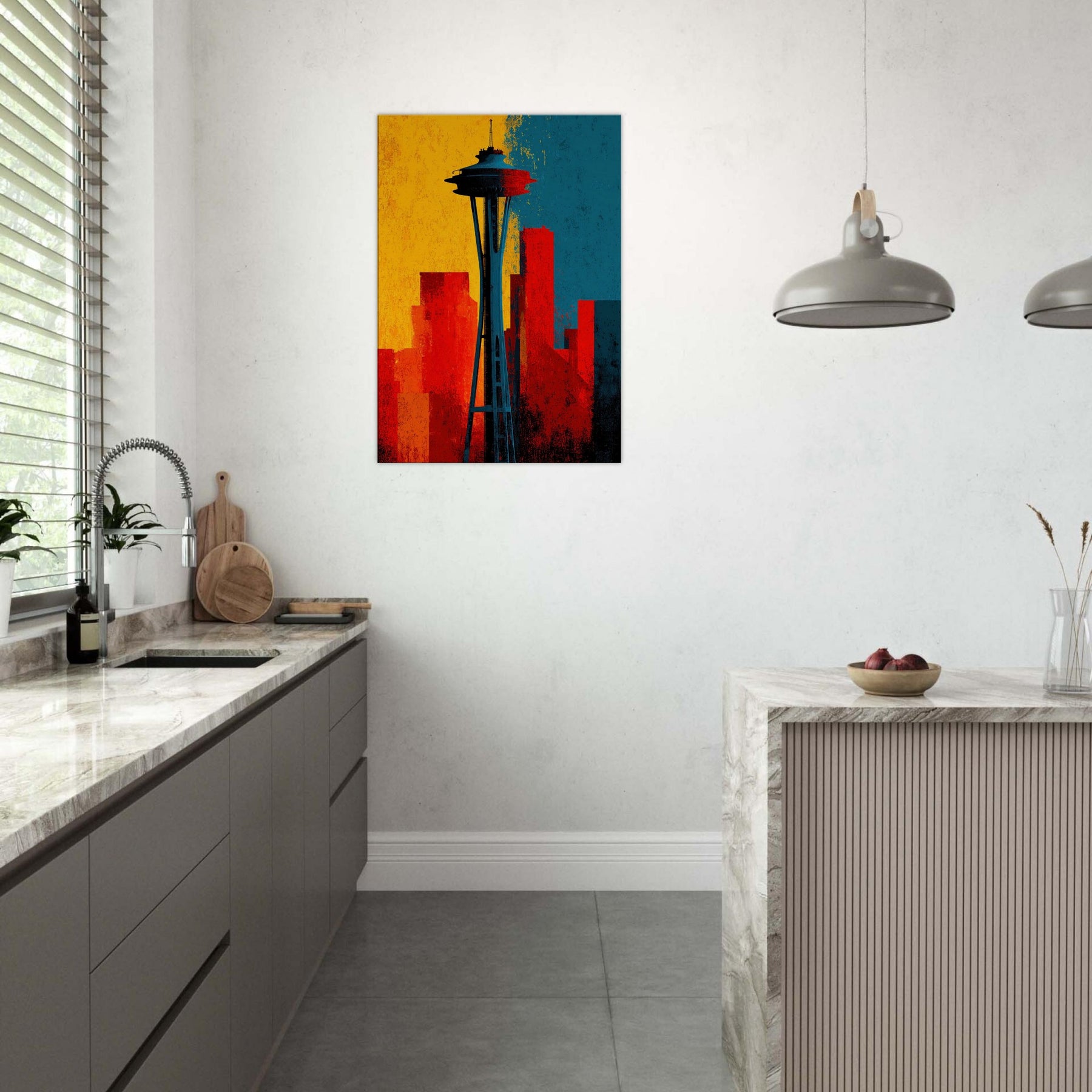 Seattle's skyline dissolves into a dance of color and form, inviting the room to breathe with urban energy. This abstract cityscape blends amber, teal, and deep crimson into a perceptual glow that shifts with the light. The slender, tower like silhouette anchors the composition, giving depth and a sense of quiet motion. Perfect for a living room, study, or entryway, it adds a sophisticated, atmospheric touch that warms conversations and makes every evening feel a little more connected to the city.