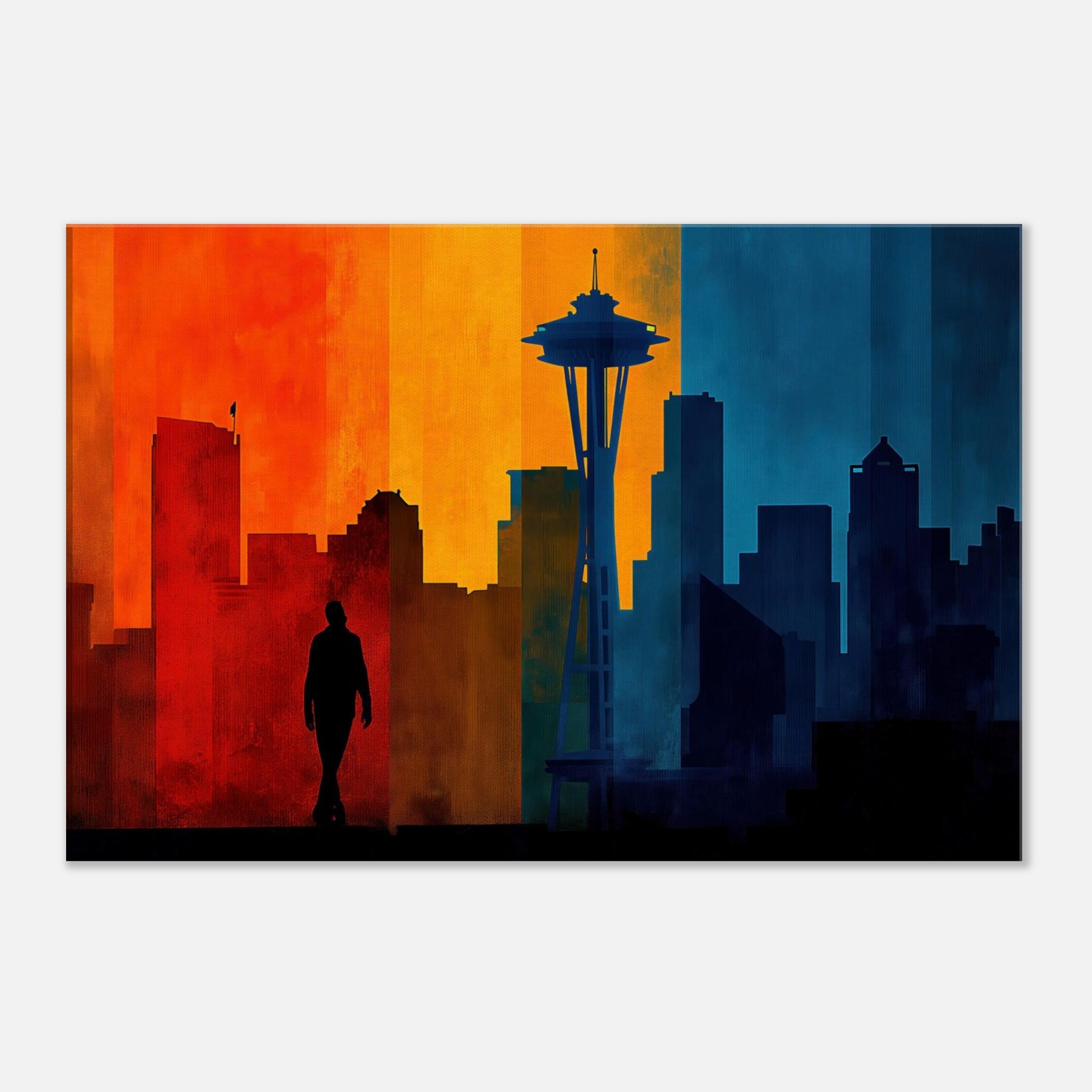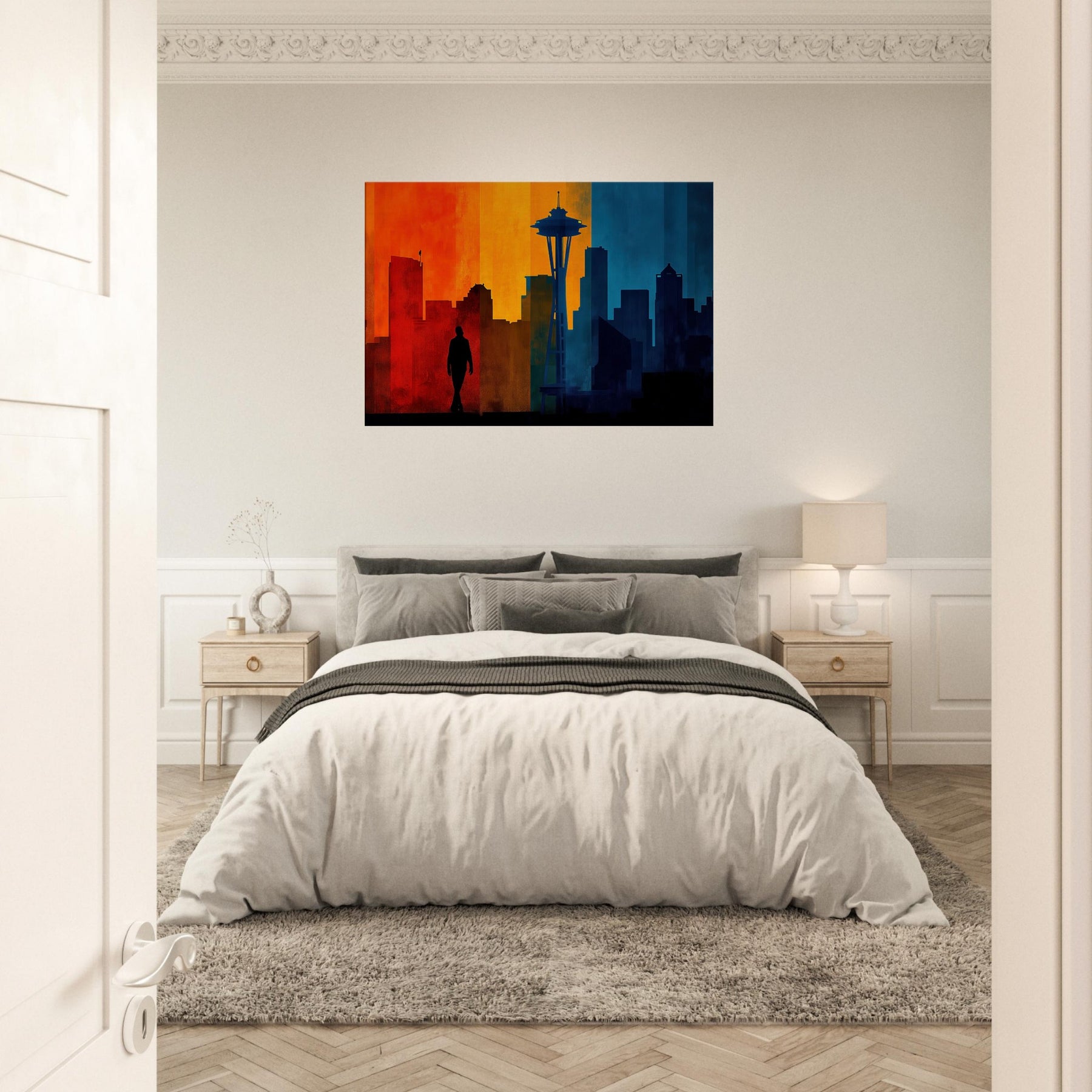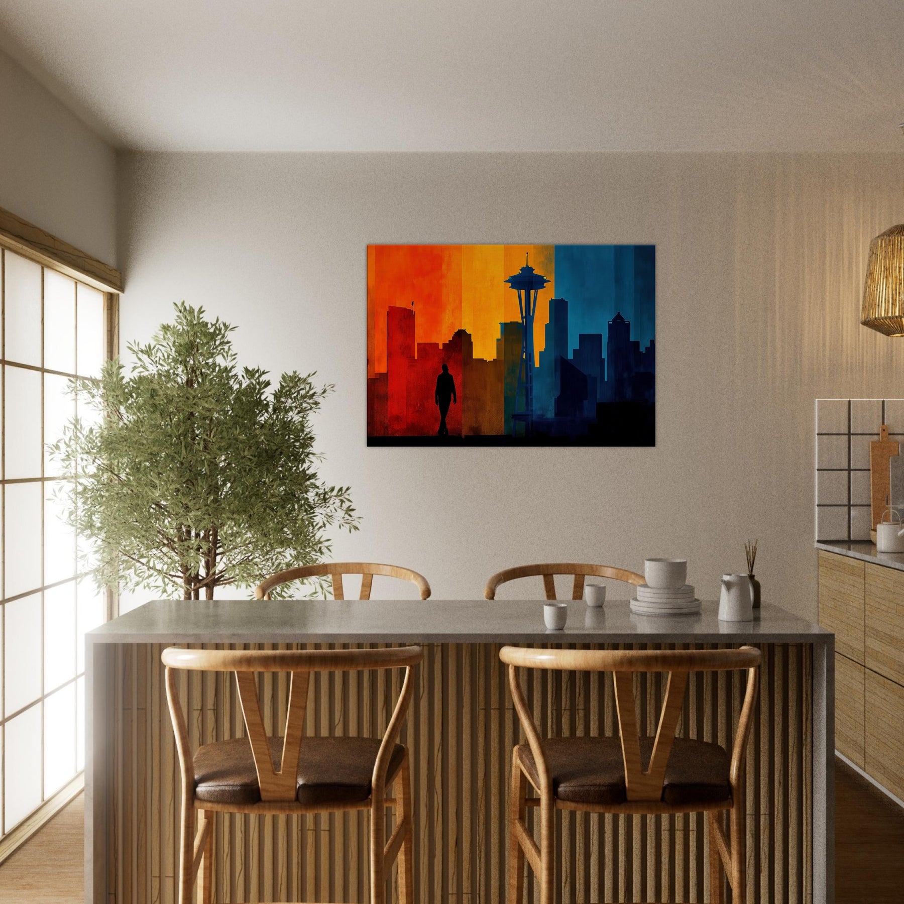 Seattle unfolds in a luminous, dreamlike cityscape where fire and frost meet. This abstract piece swallows the horizon in warm oranges and cool blues, guiding the eye toward the Space Needle’s sculpted silhouette. Printed on premium canvas with rich depth, it adds texture and atmosphere to any room, turning a living space into a quiet, cinematic moment perfect for slowing time, sparking conversation, and inviting urban wonder into your home.