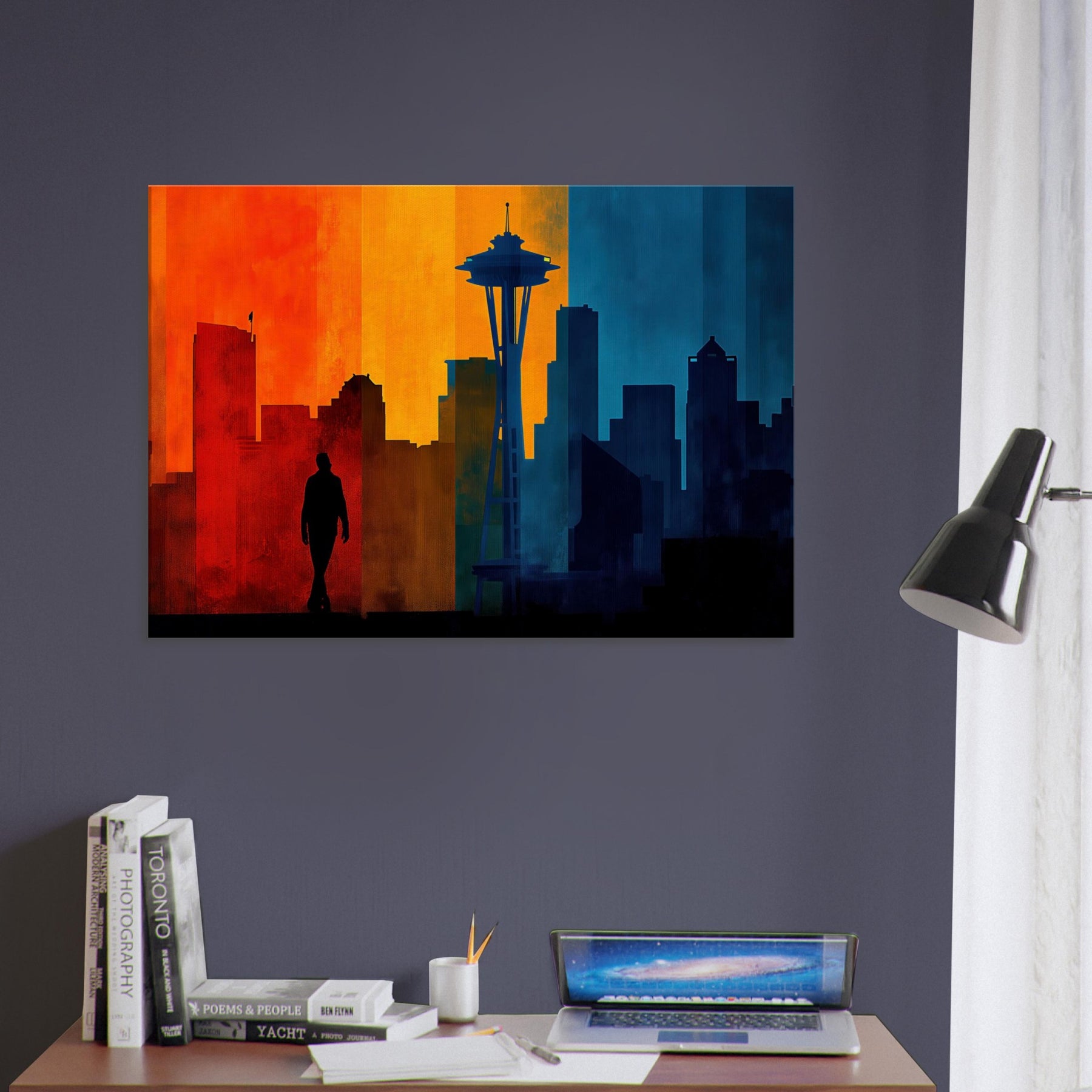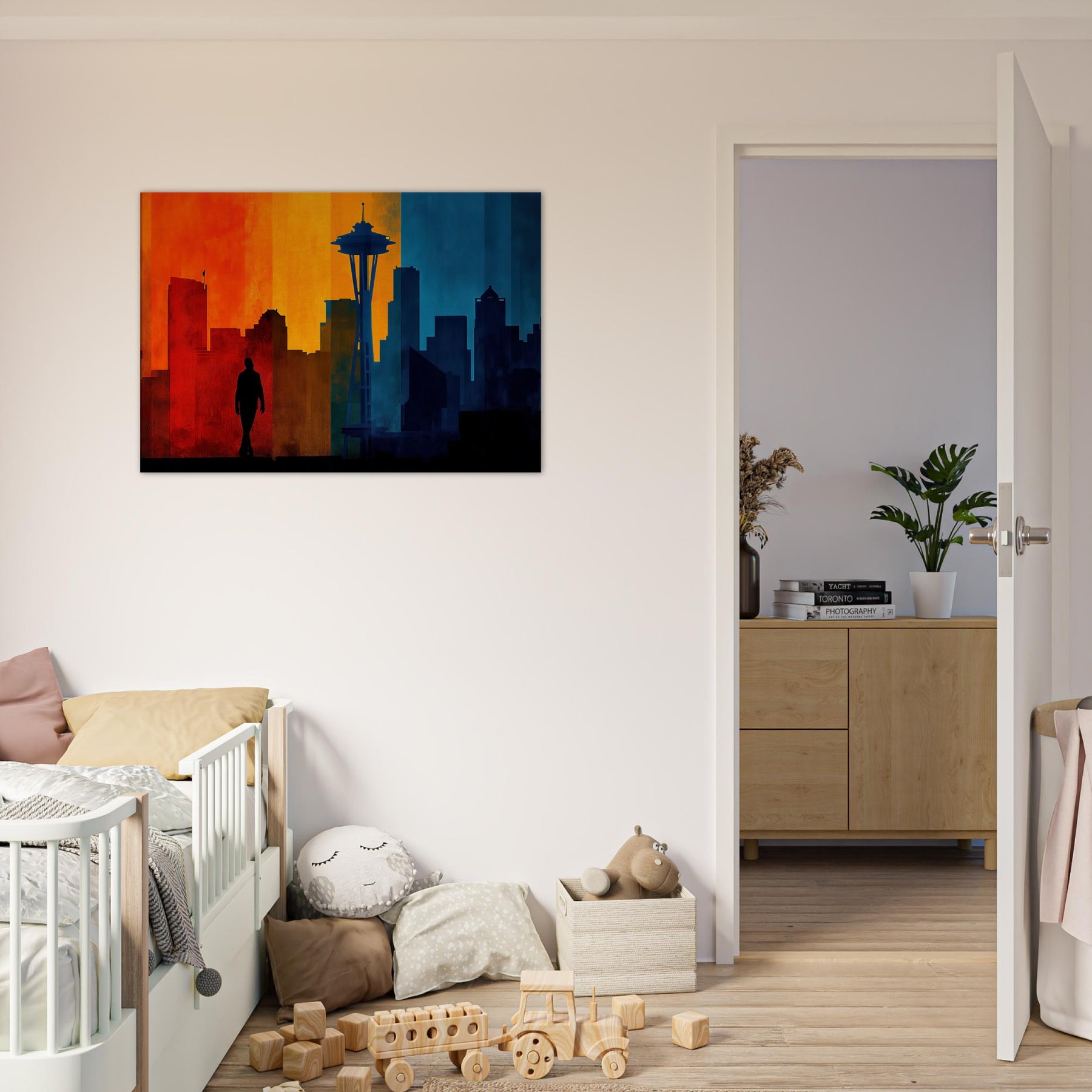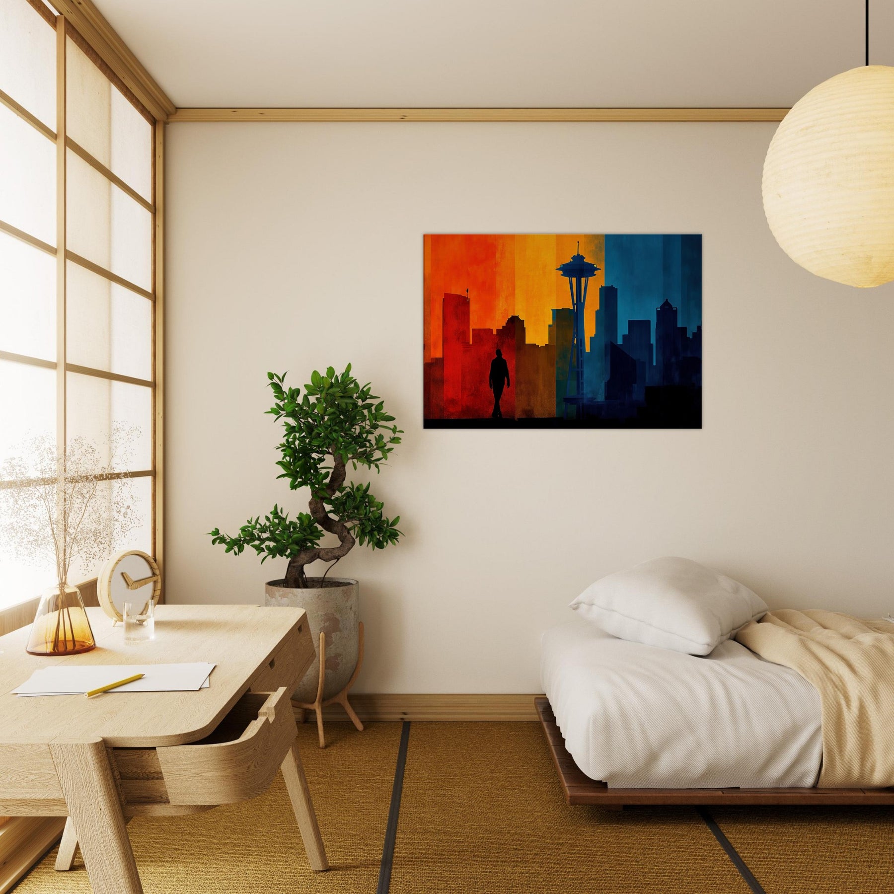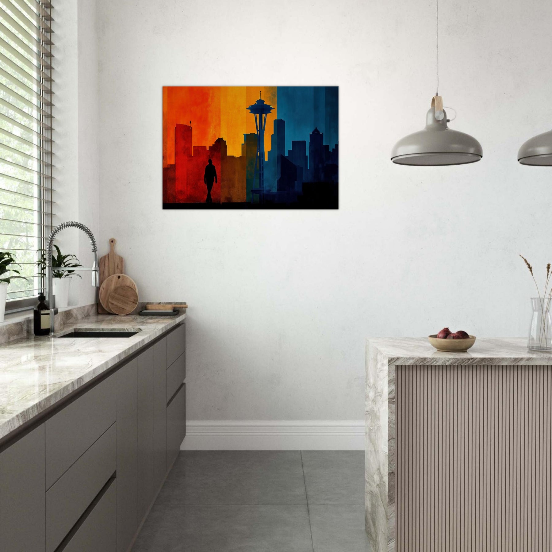 Seattle unfolds in a luminous, dreamlike cityscape where fire and frost meet. This abstract piece swallows the horizon in warm oranges and cool blues, guiding the eye toward the Space Needle’s sculpted silhouette. Printed on premium canvas with rich depth, it adds texture and atmosphere to any room, turning a living space into a quiet, cinematic moment perfect for slowing time, sparking conversation, and inviting urban wonder into your home.
