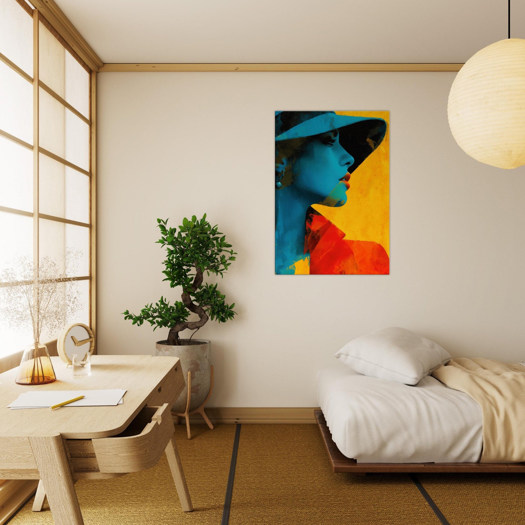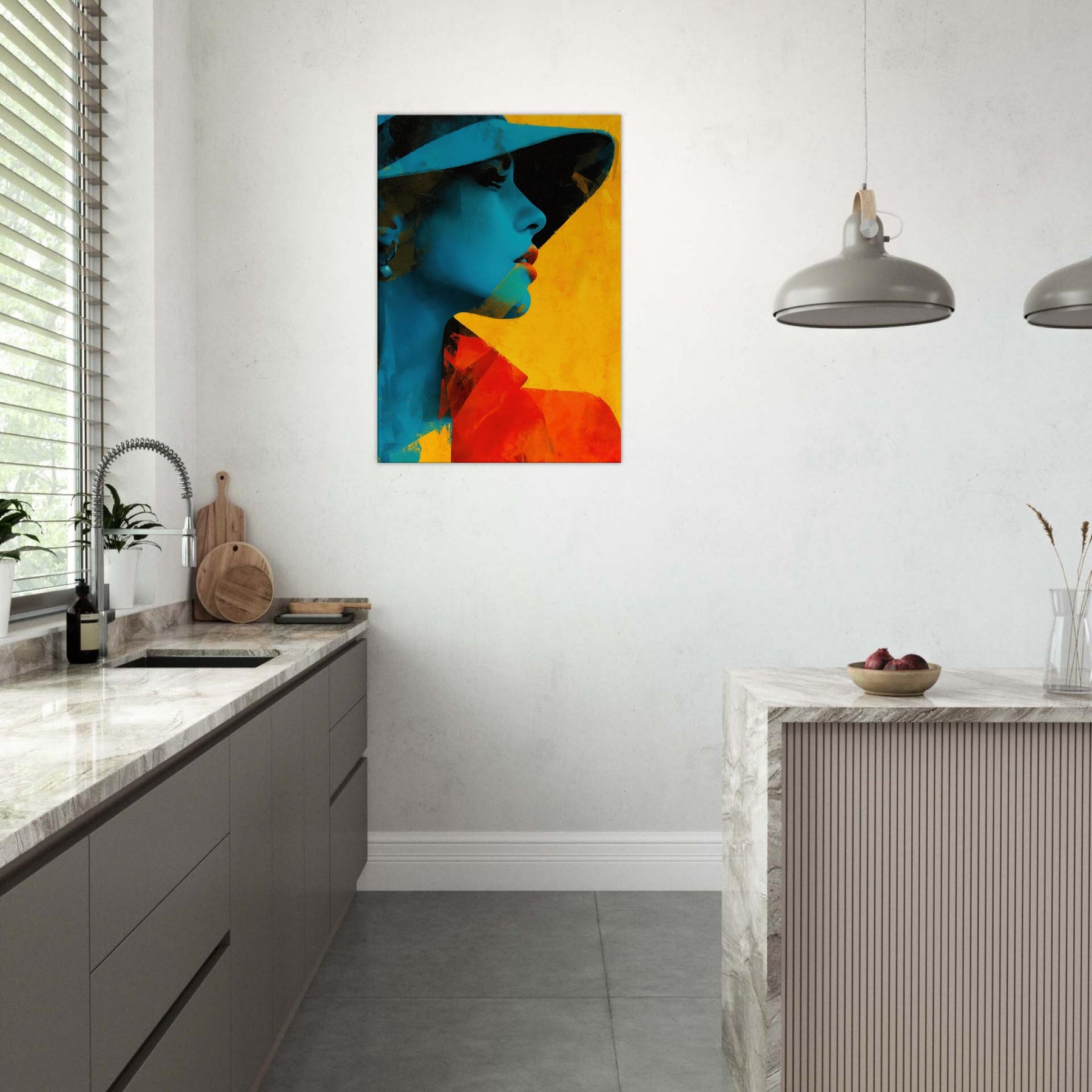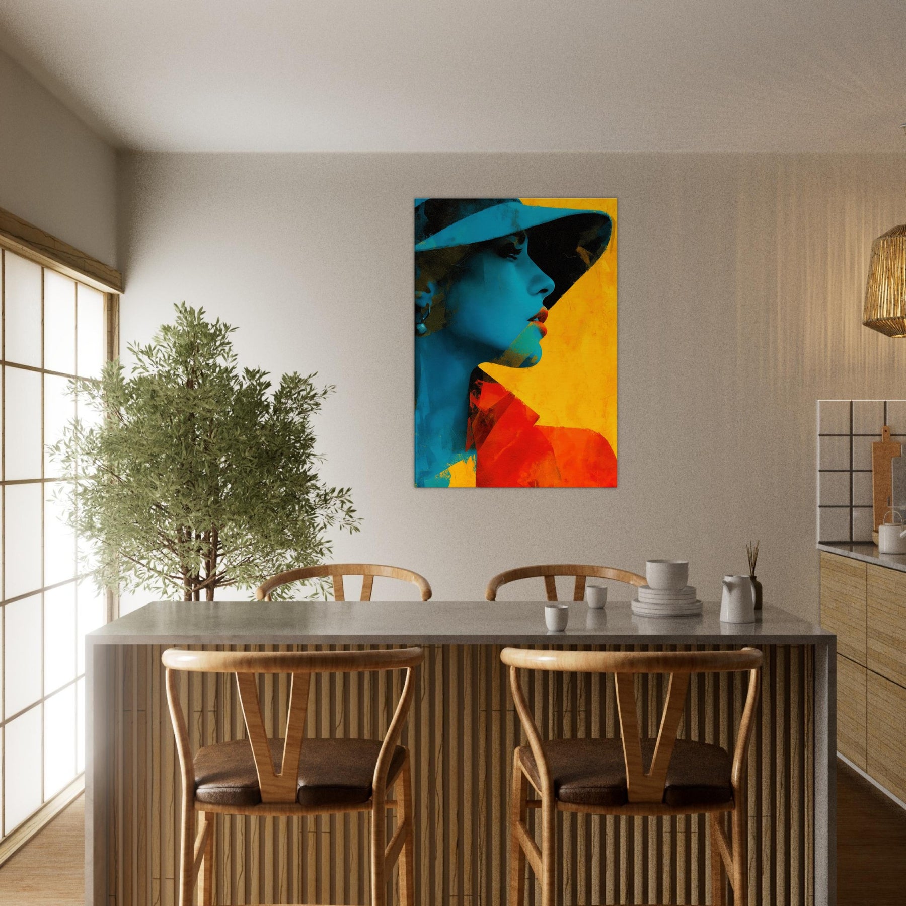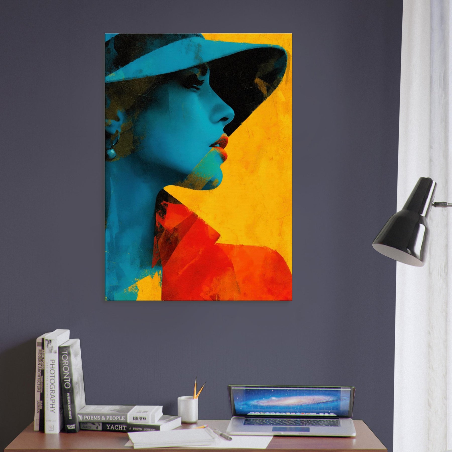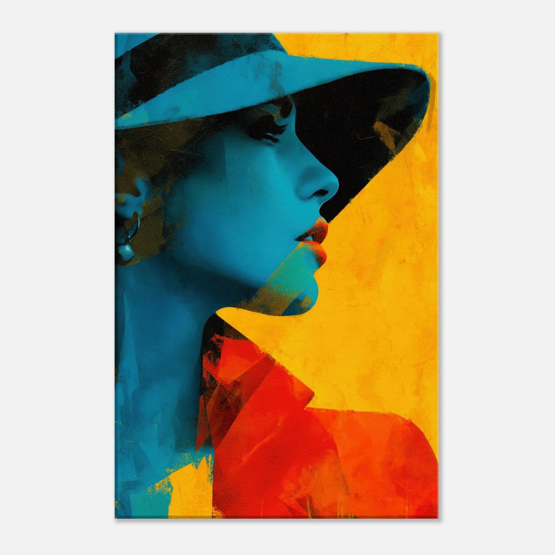 Step into a room where light bends and color sings. This piece presents a Woman with Hat in an arresting fusion of cyan shadows and warm yellow glow, captured in an abstract rhythm. The image breathes with quiet mystery, inviting you to linger at the edge of perception. It elevates a living space with sculptural presence and mood soft yet bold, intimate yet expansive. Hang it where conversations flow, and let the hat shadowed profile become a focal point of calm and curiosity.