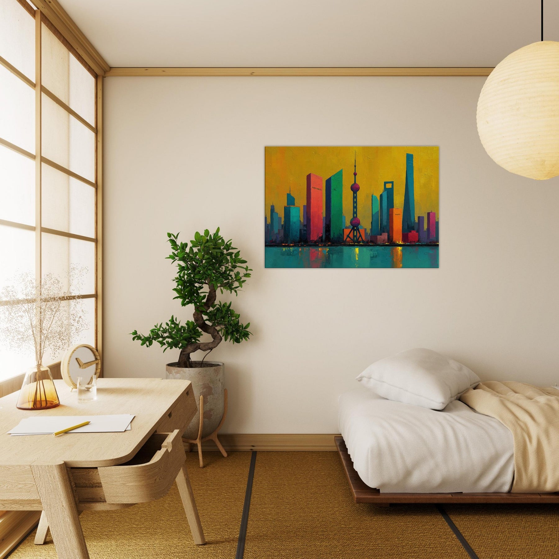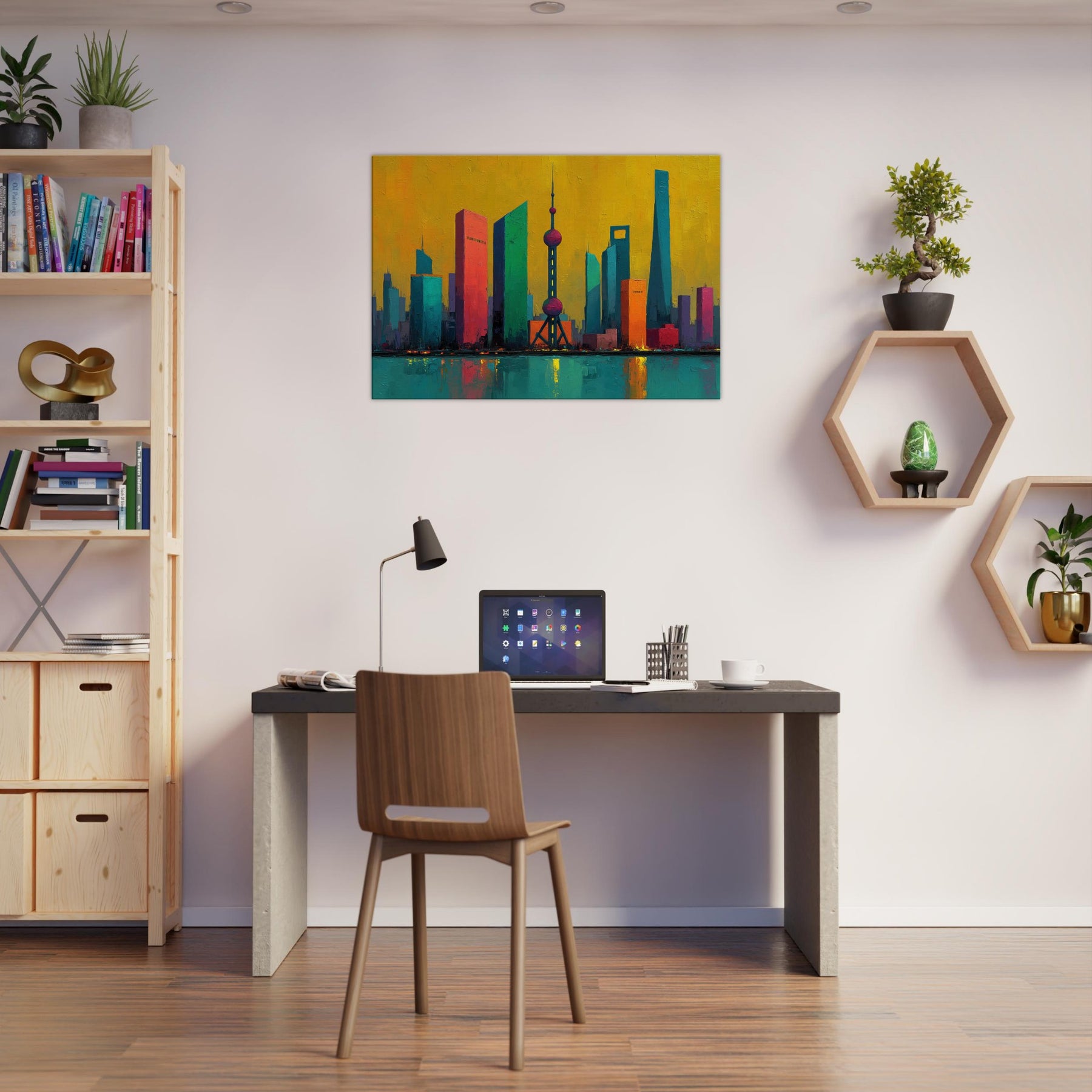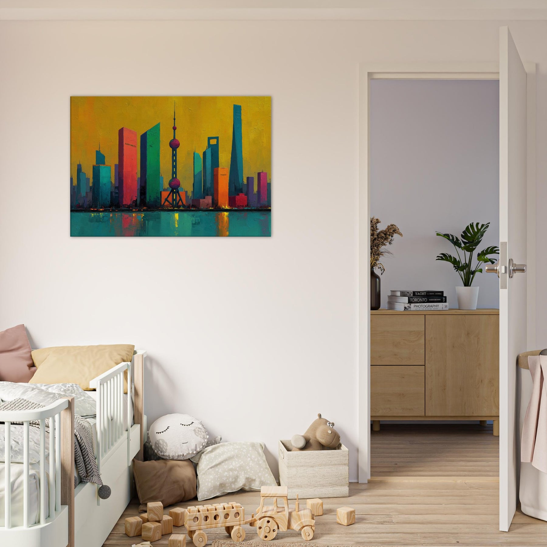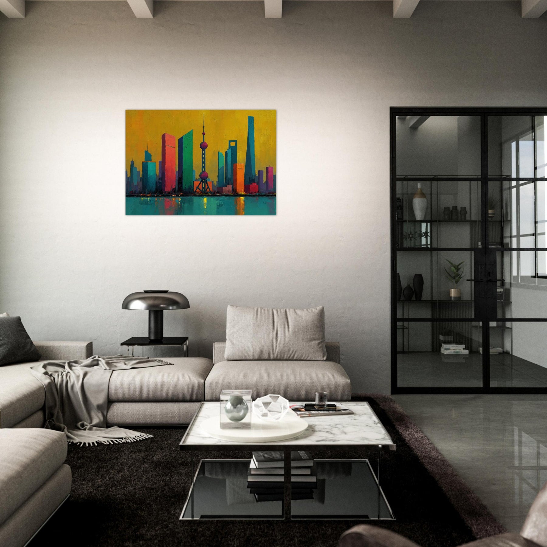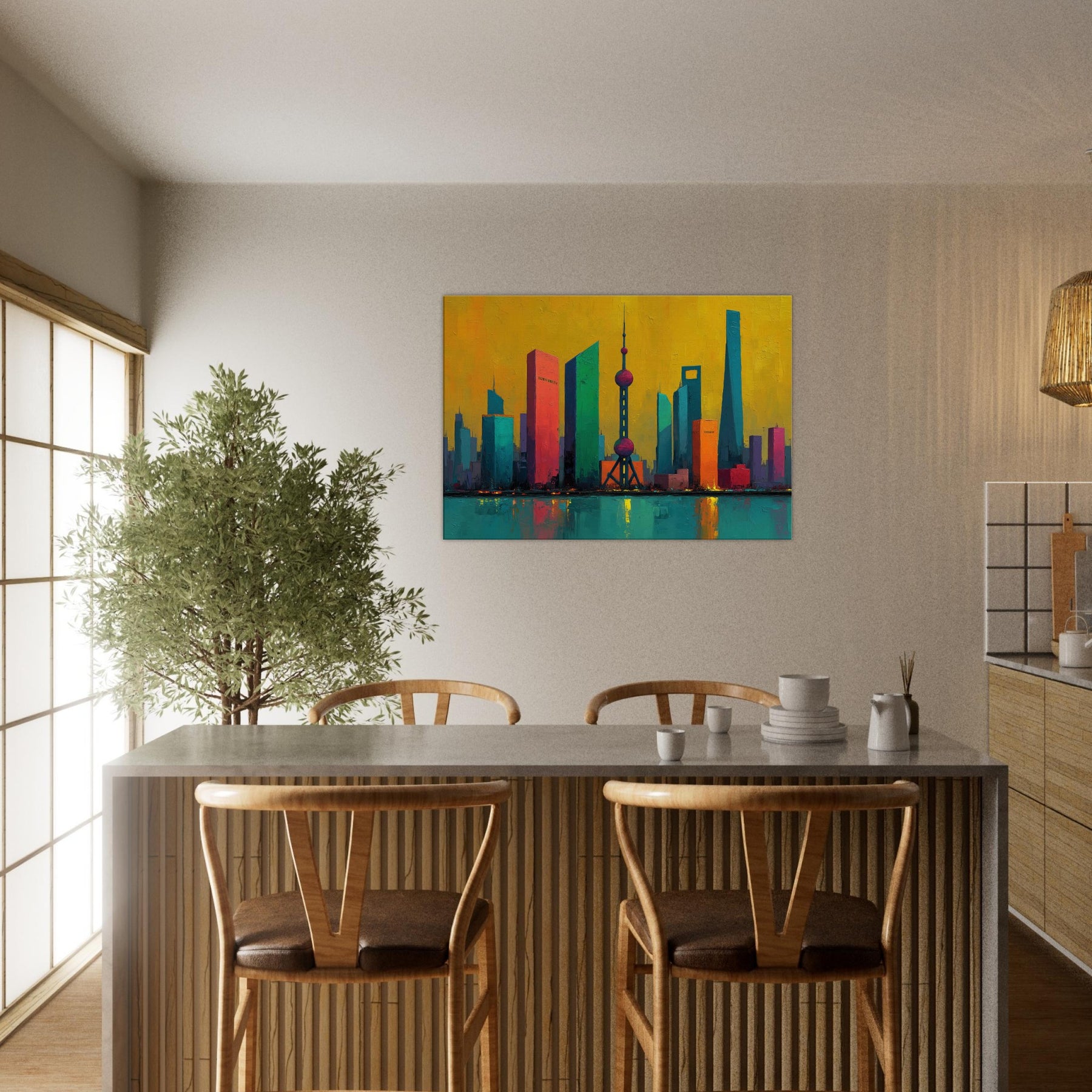 Shanghai unfolds across the canvas as a chorus of color and shape: towers rise in bold blocks, the river whispers beneath, and the horizon glows with a yellow gold dusk. The abstract forms pulse with energy, inviting the eye to travel from a teal shoreline to magenta spires and sapphire towers. This piece breathes motion into a living room, catching light at every hour and casting soft reflections across walls and glass. A sophisticated backdrop for conversation, this artwork makes everyday spaces feel global and alive.