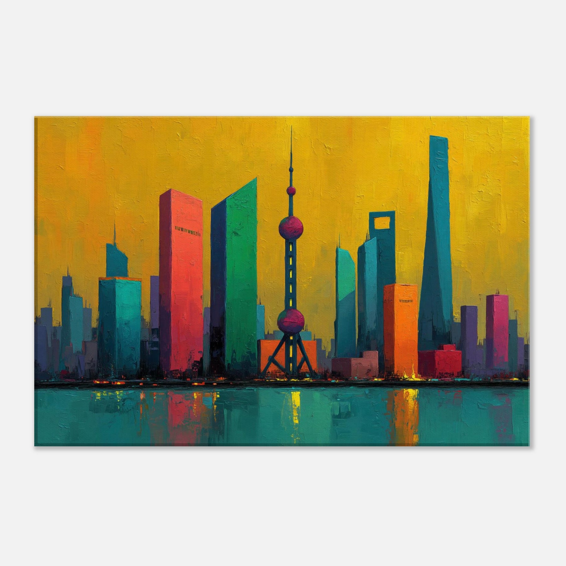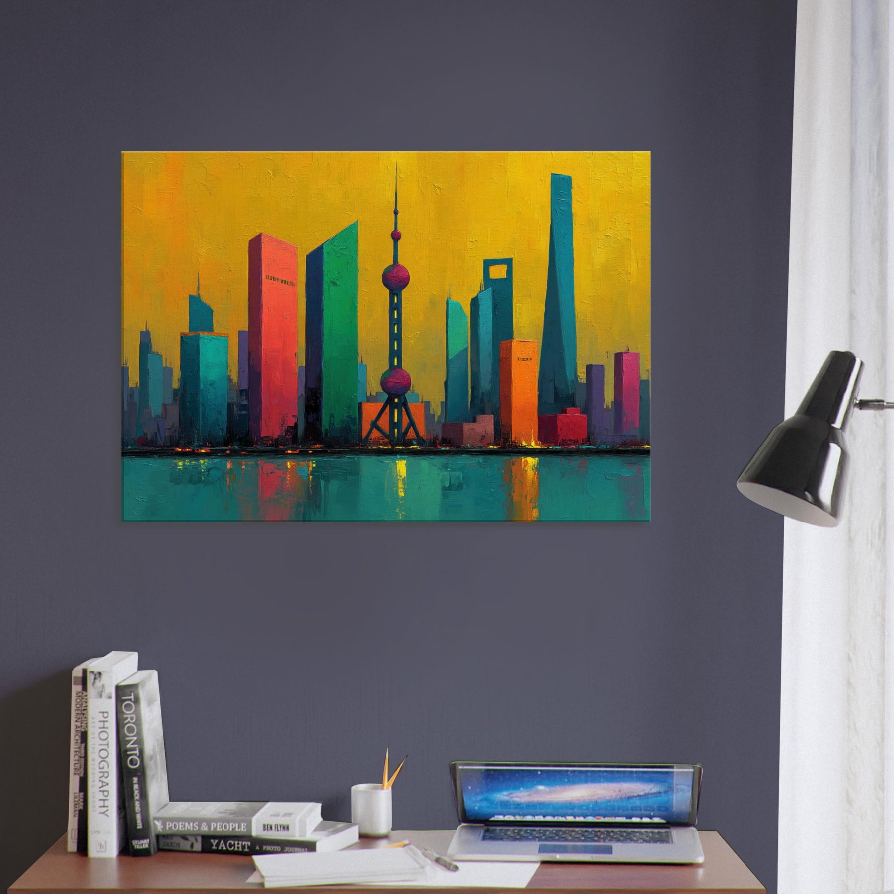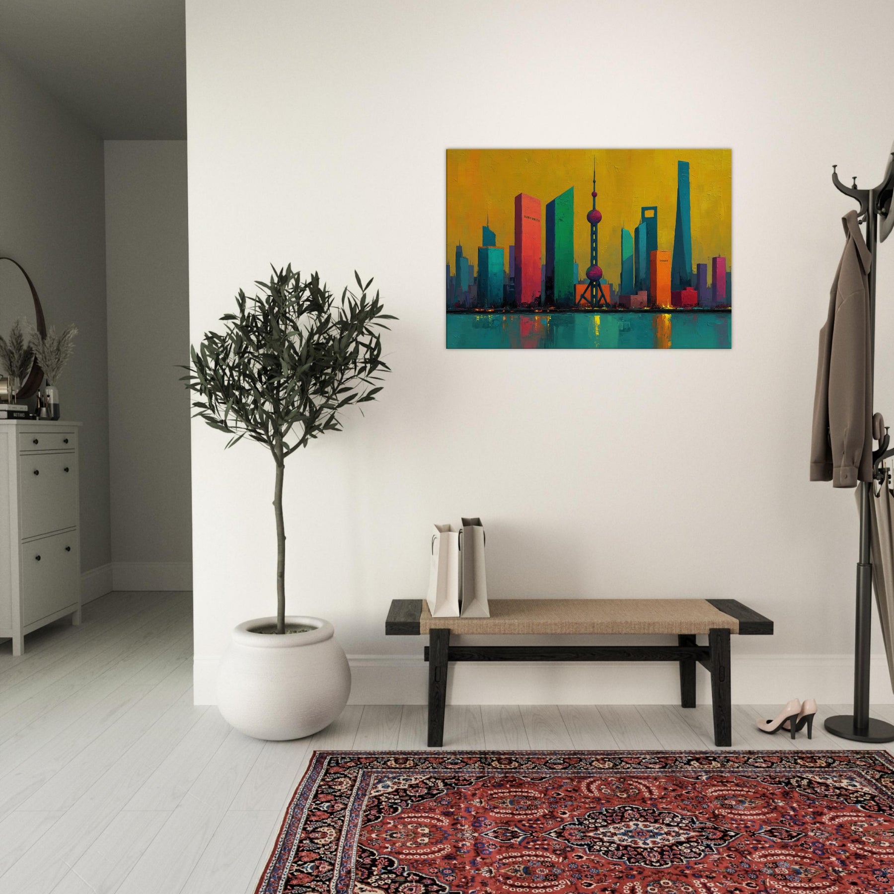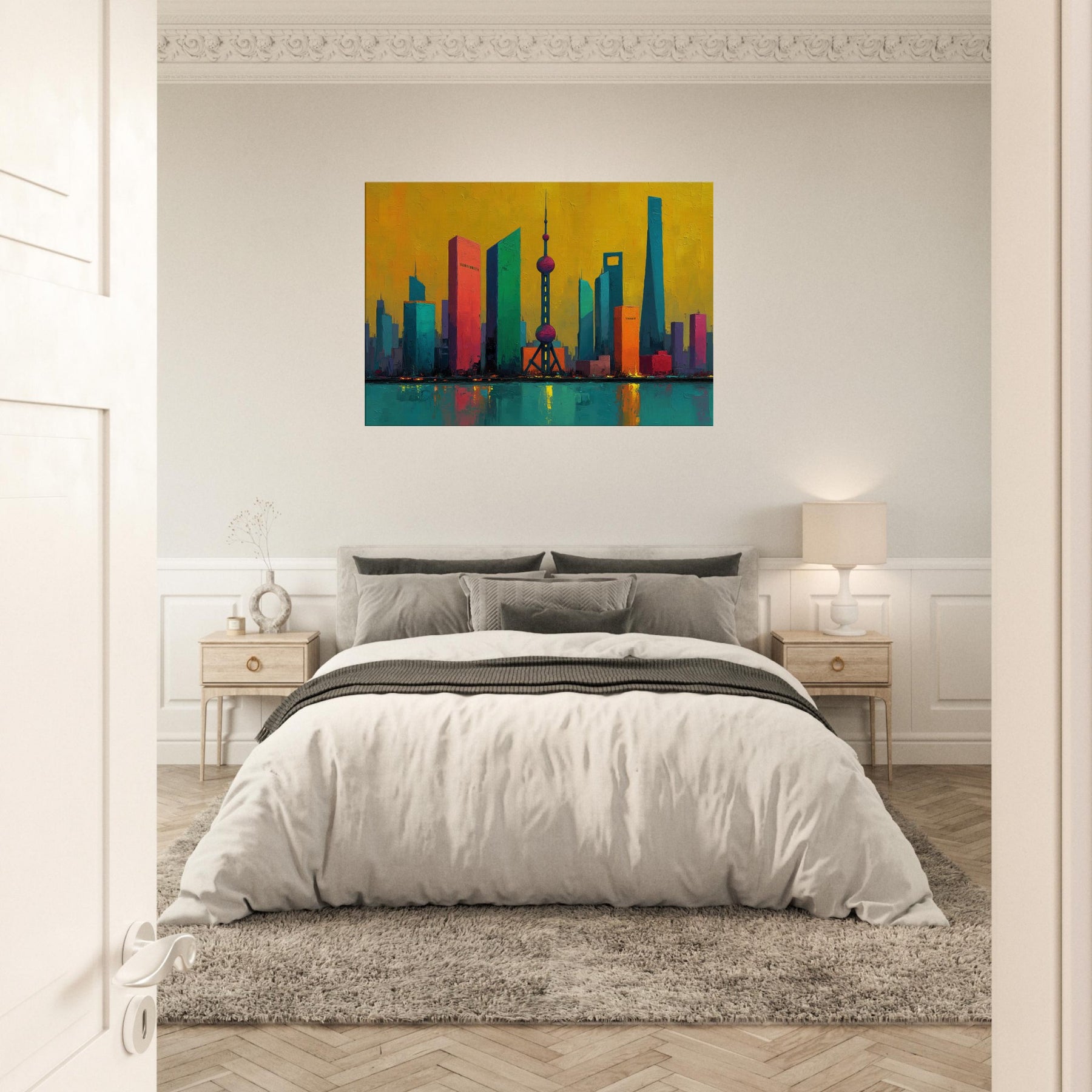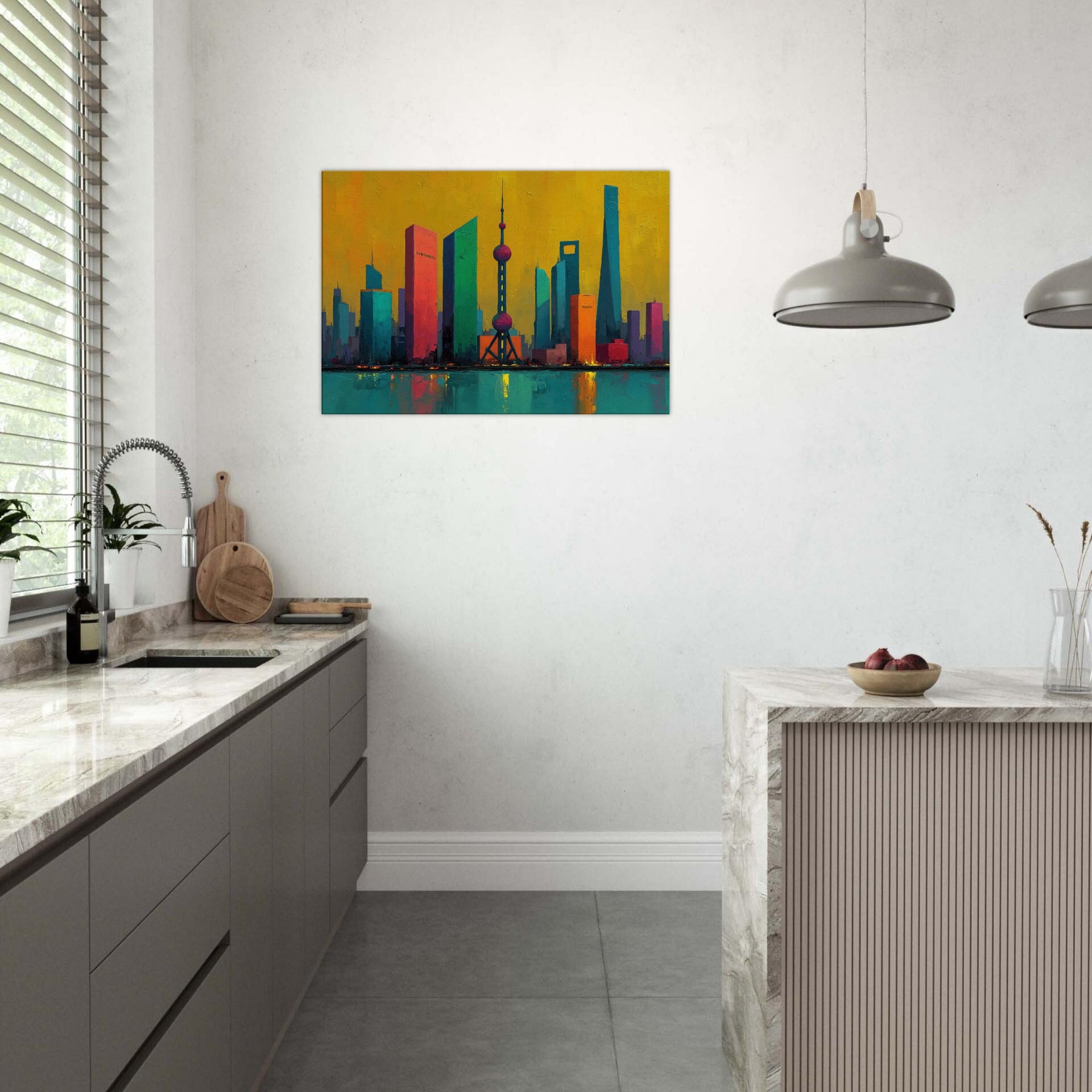 Shanghai unfolds across the canvas as a chorus of color and shape: towers rise in bold blocks, the river whispers beneath, and the horizon glows with a yellow gold dusk. The abstract forms pulse with energy, inviting the eye to travel from a teal shoreline to magenta spires and sapphire towers. This piece breathes motion into a living room, catching light at every hour and casting soft reflections across walls and glass. A sophisticated backdrop for conversation, this artwork makes everyday spaces feel global and alive.