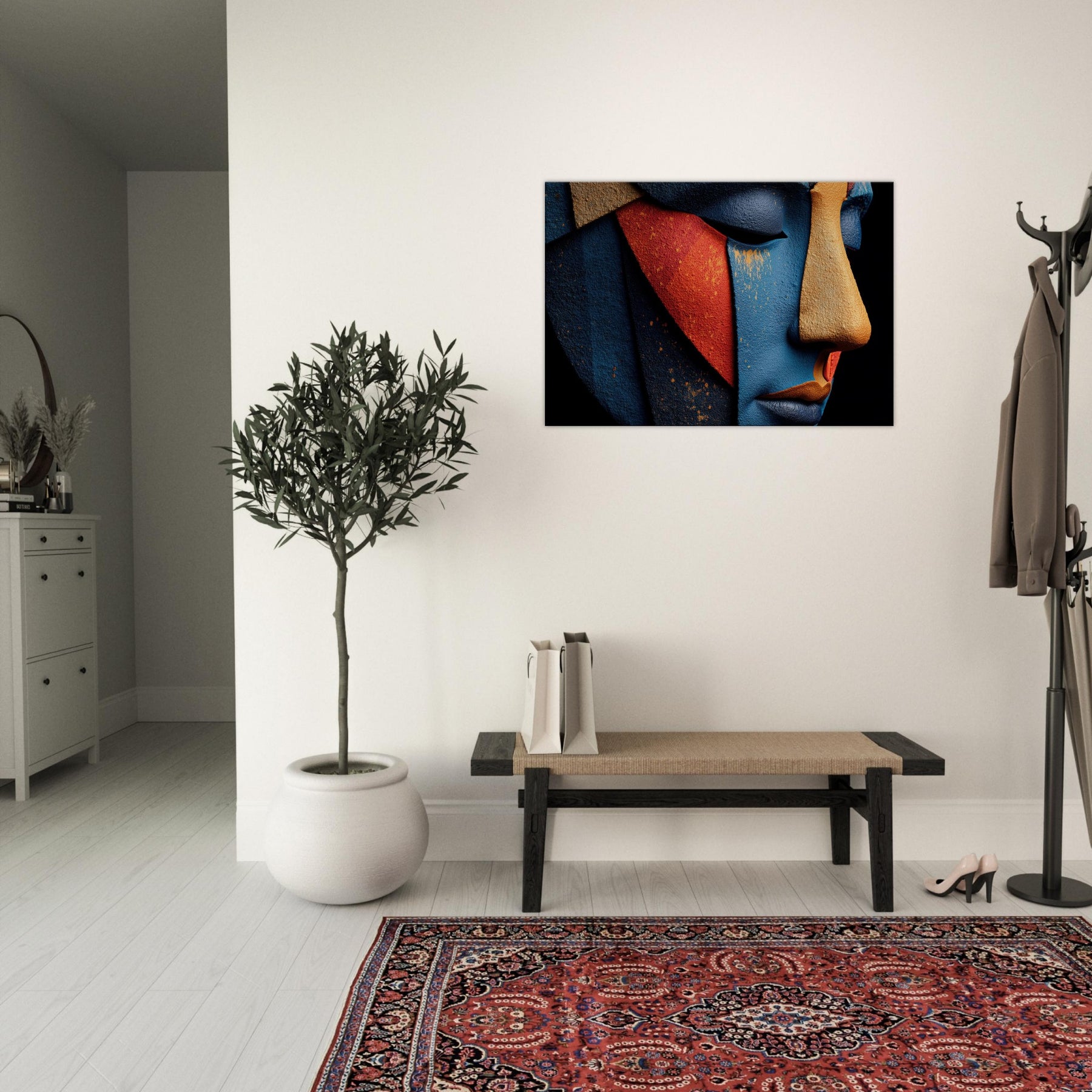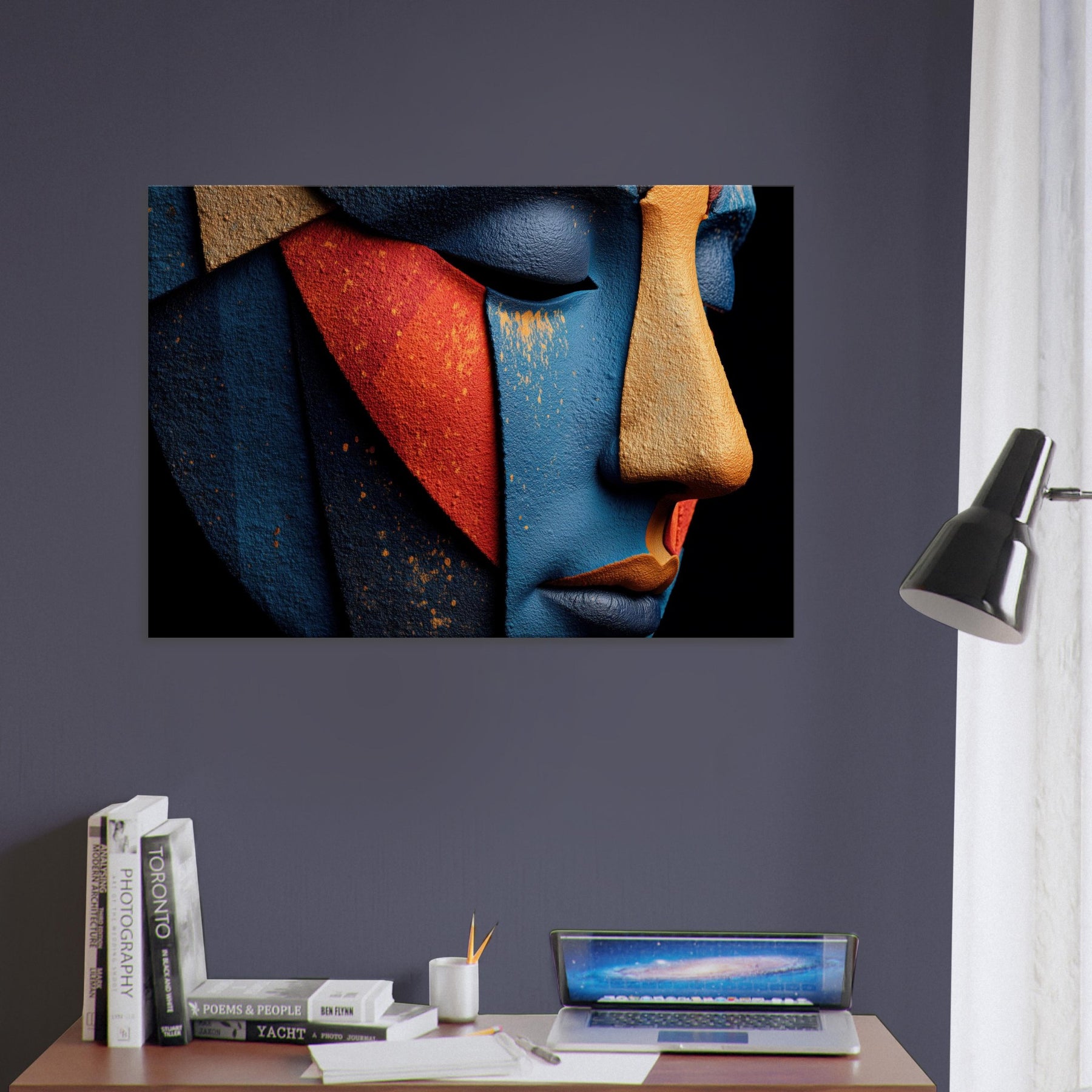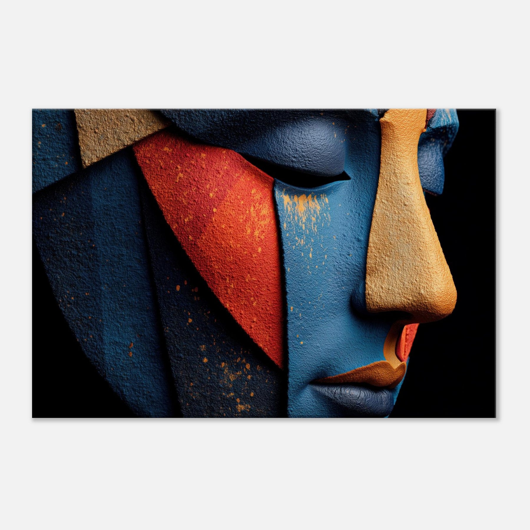 Step close and hear the quiet unfold. This abstract sculpture of light and shadow centers on the Primary Subject: Mask (Neutral Theater) Silhouette, a poised profile that dissolves into blocks of color. The piece breathes drama through cobalt, coral, and saffron panels, inviting the eye to drift and settle. Perfect for a living room or hallway, it creates a cinematic atmosphere, like a stage already set for conversation. Hang it where night and morning can play across its sculpted angles, turning walls into quiet, luminous narratives.