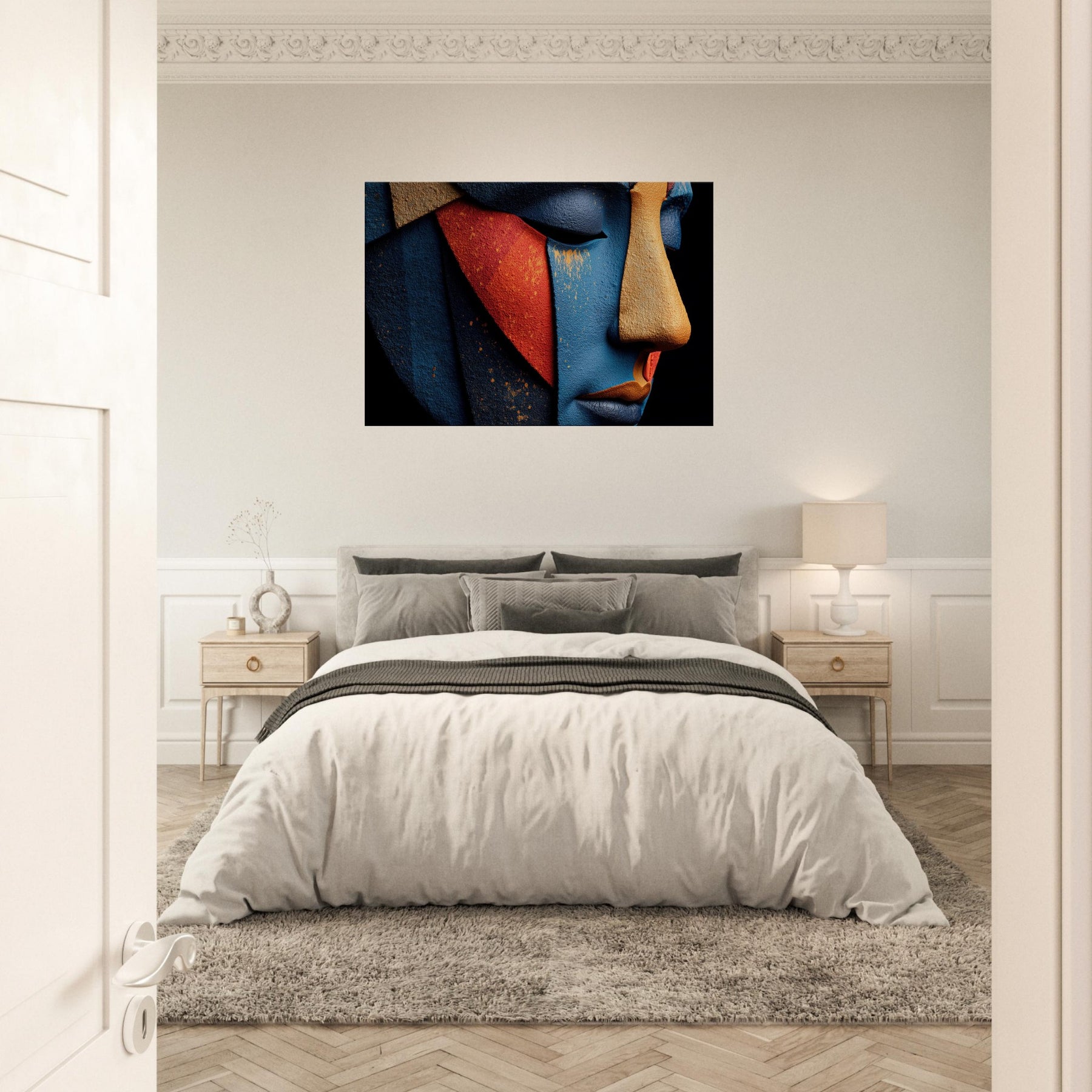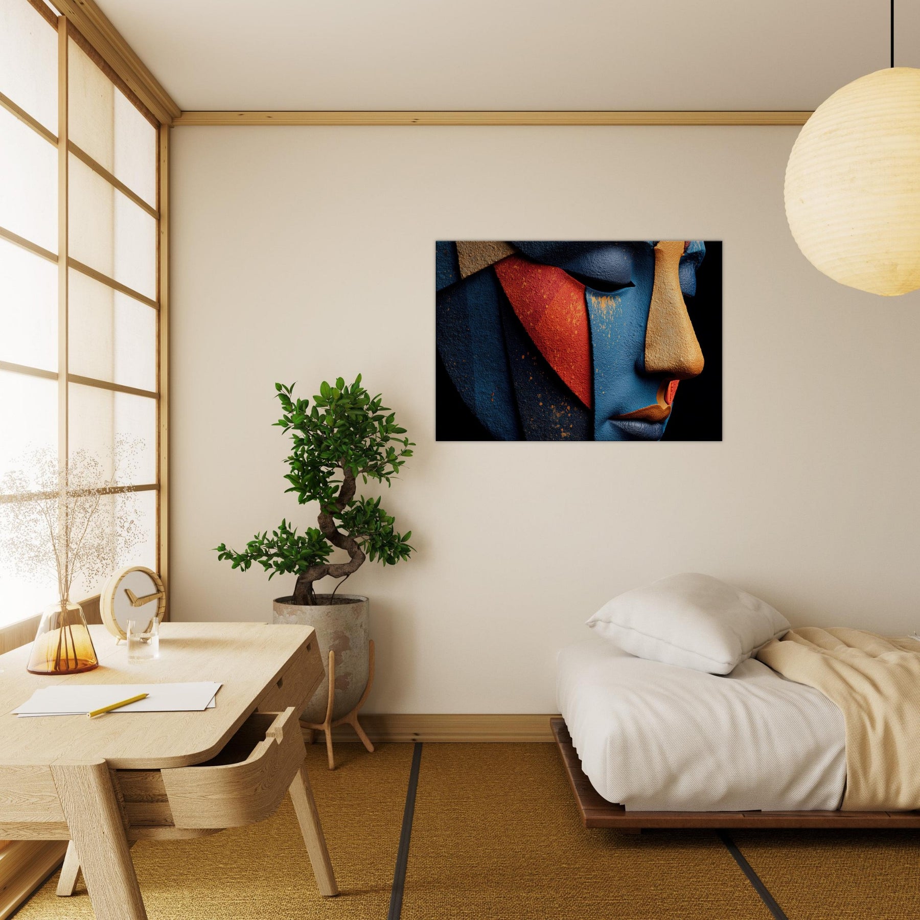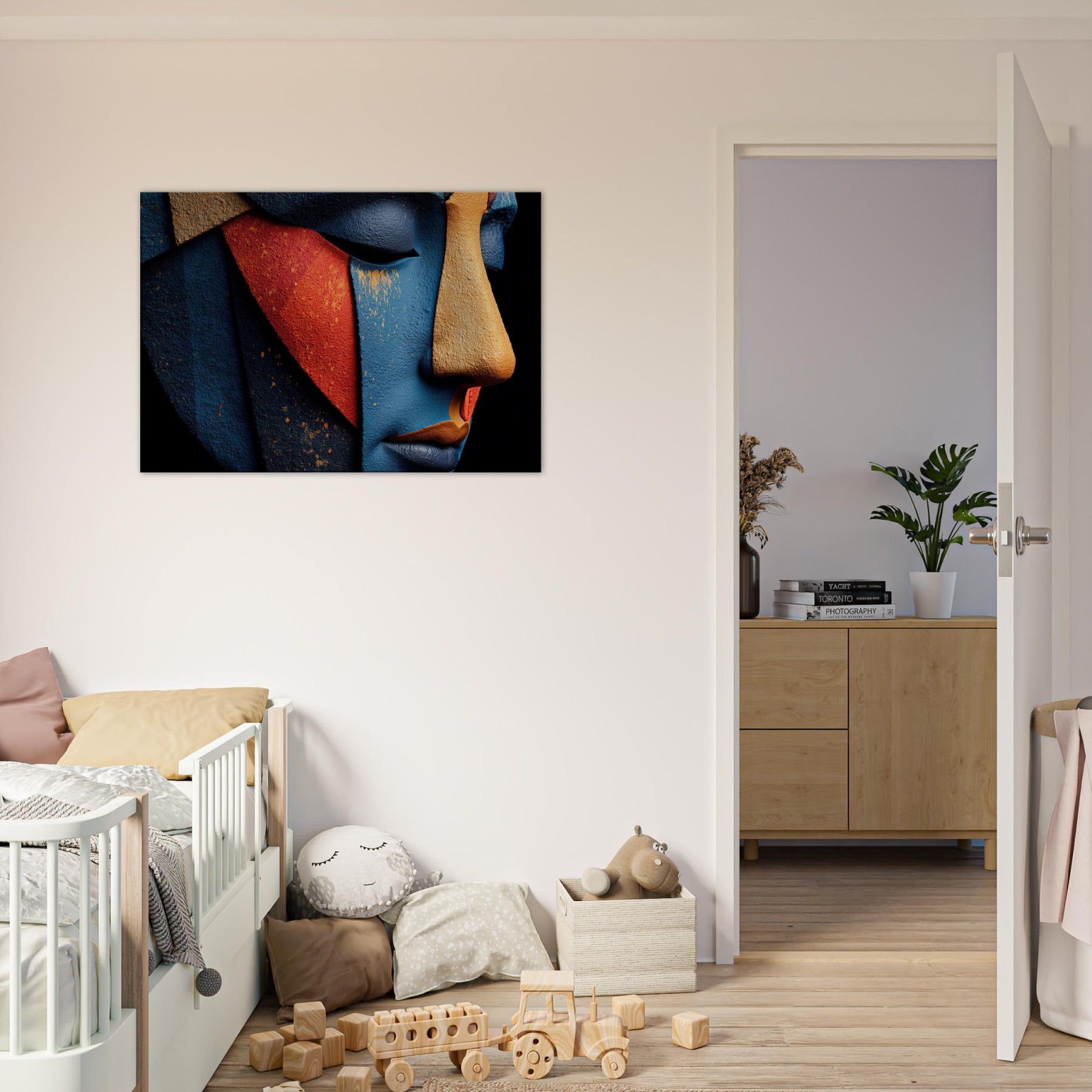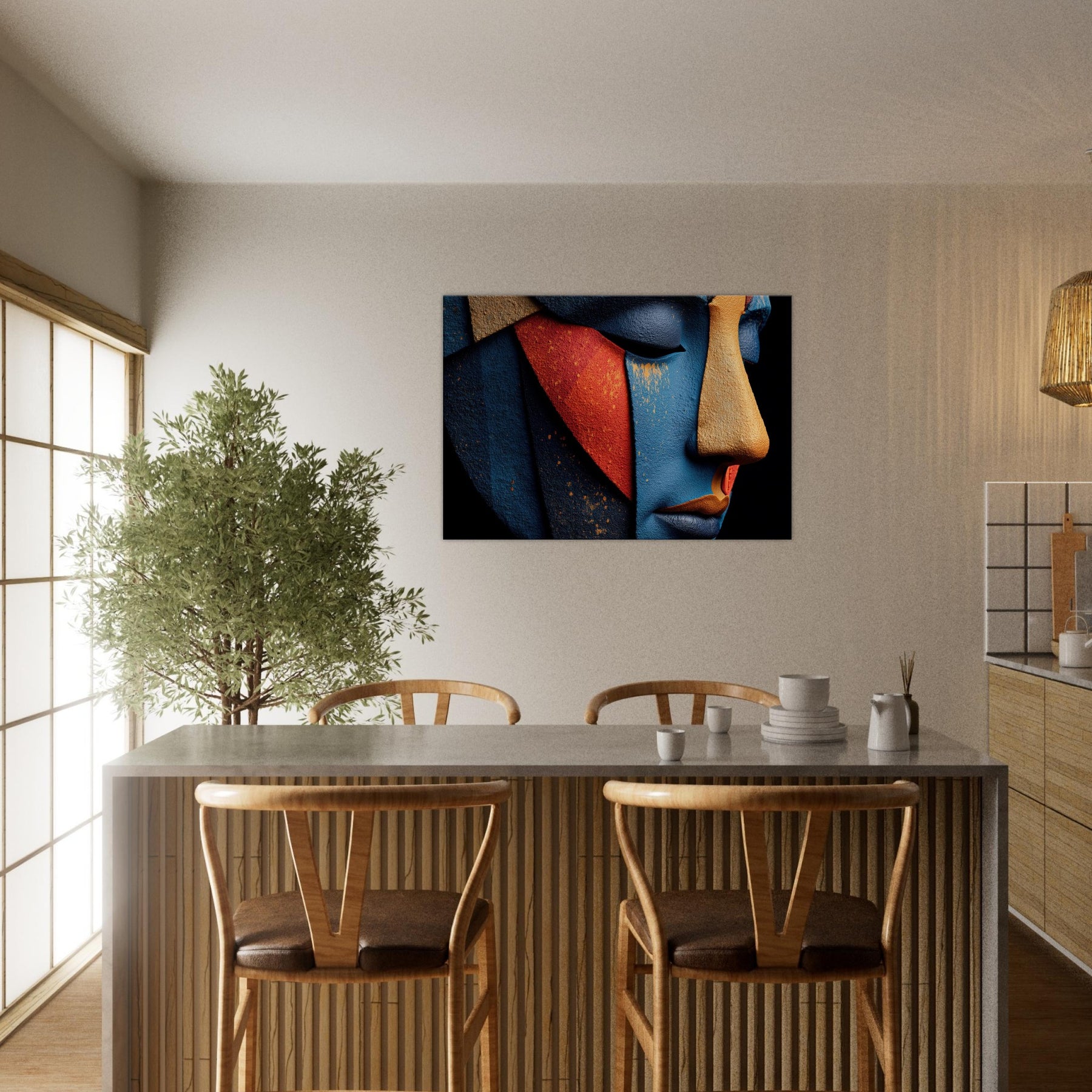 Step close and hear the quiet unfold. This abstract sculpture of light and shadow centers on the Primary Subject: Mask (Neutral Theater) Silhouette, a poised profile that dissolves into blocks of color. The piece breathes drama through cobalt, coral, and saffron panels, inviting the eye to drift and settle. Perfect for a living room or hallway, it creates a cinematic atmosphere, like a stage already set for conversation. Hang it where night and morning can play across its sculpted angles, turning walls into quiet, luminous narratives.