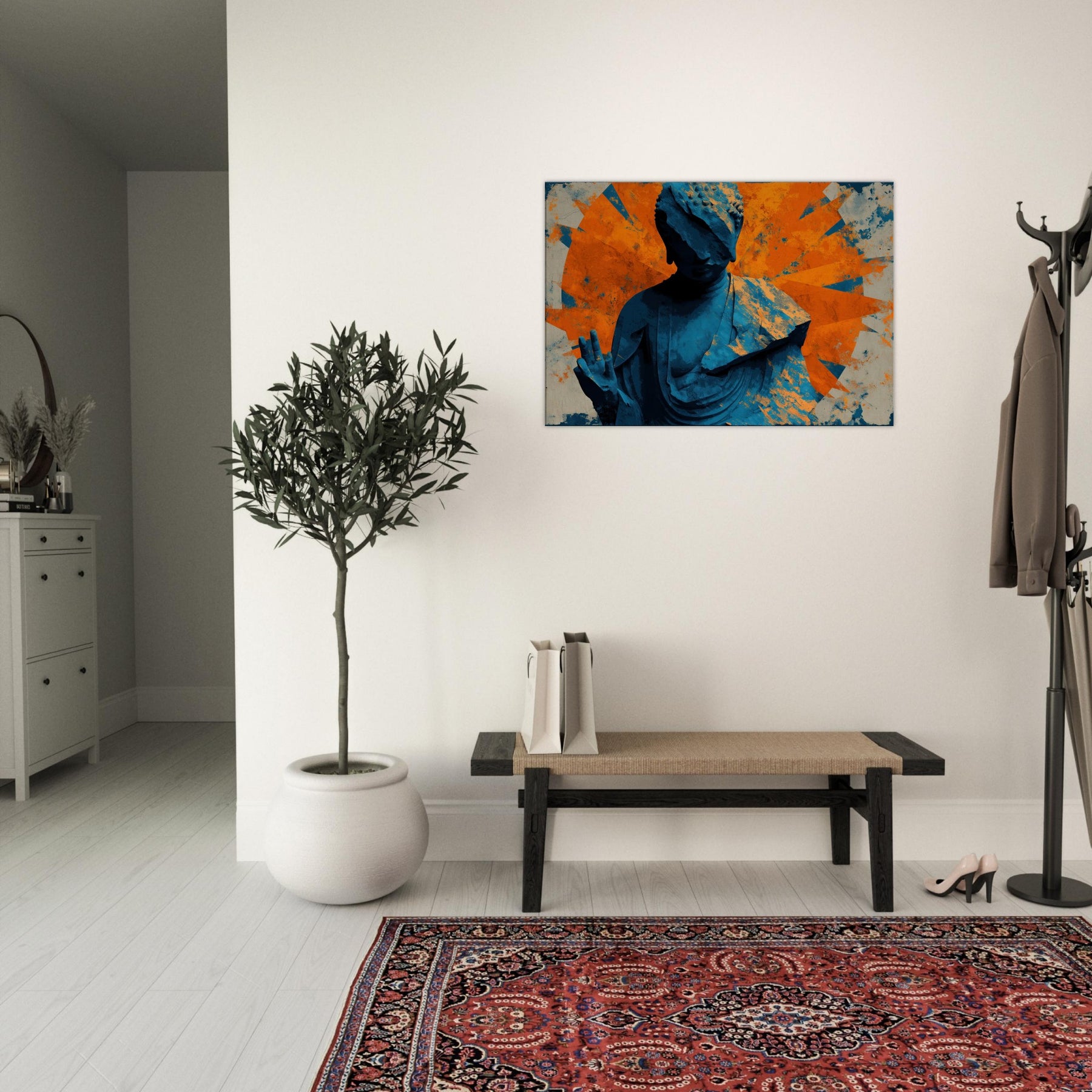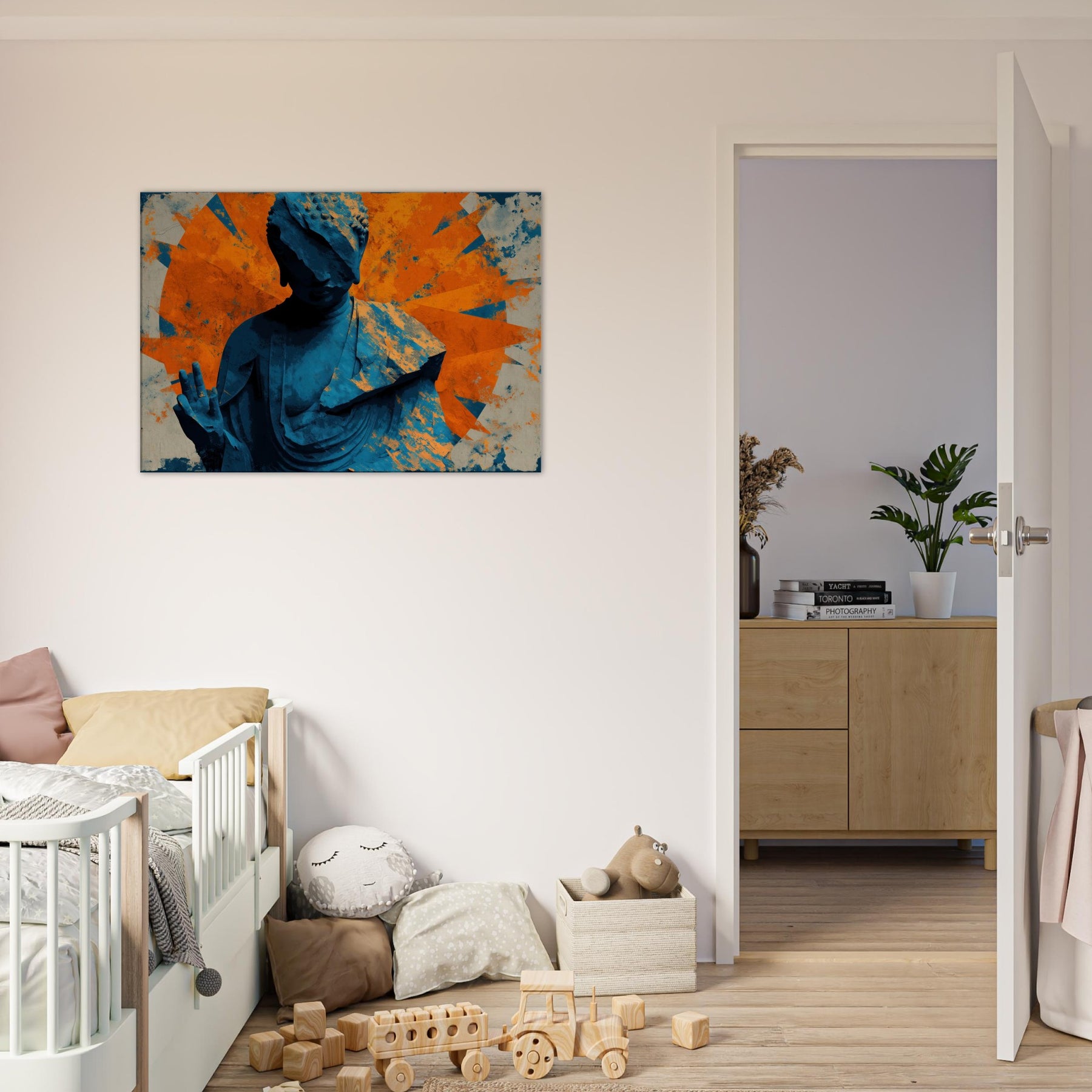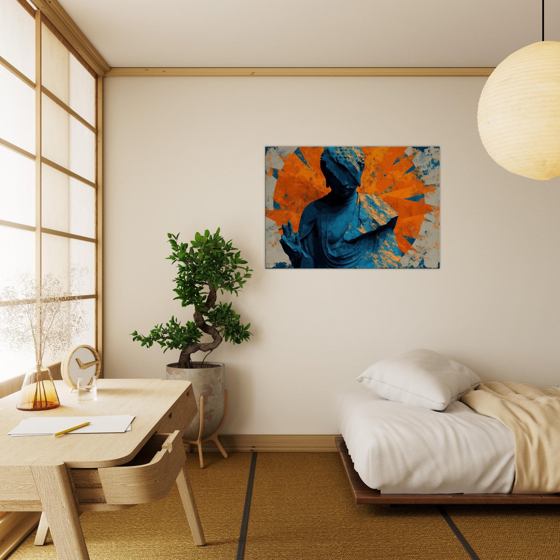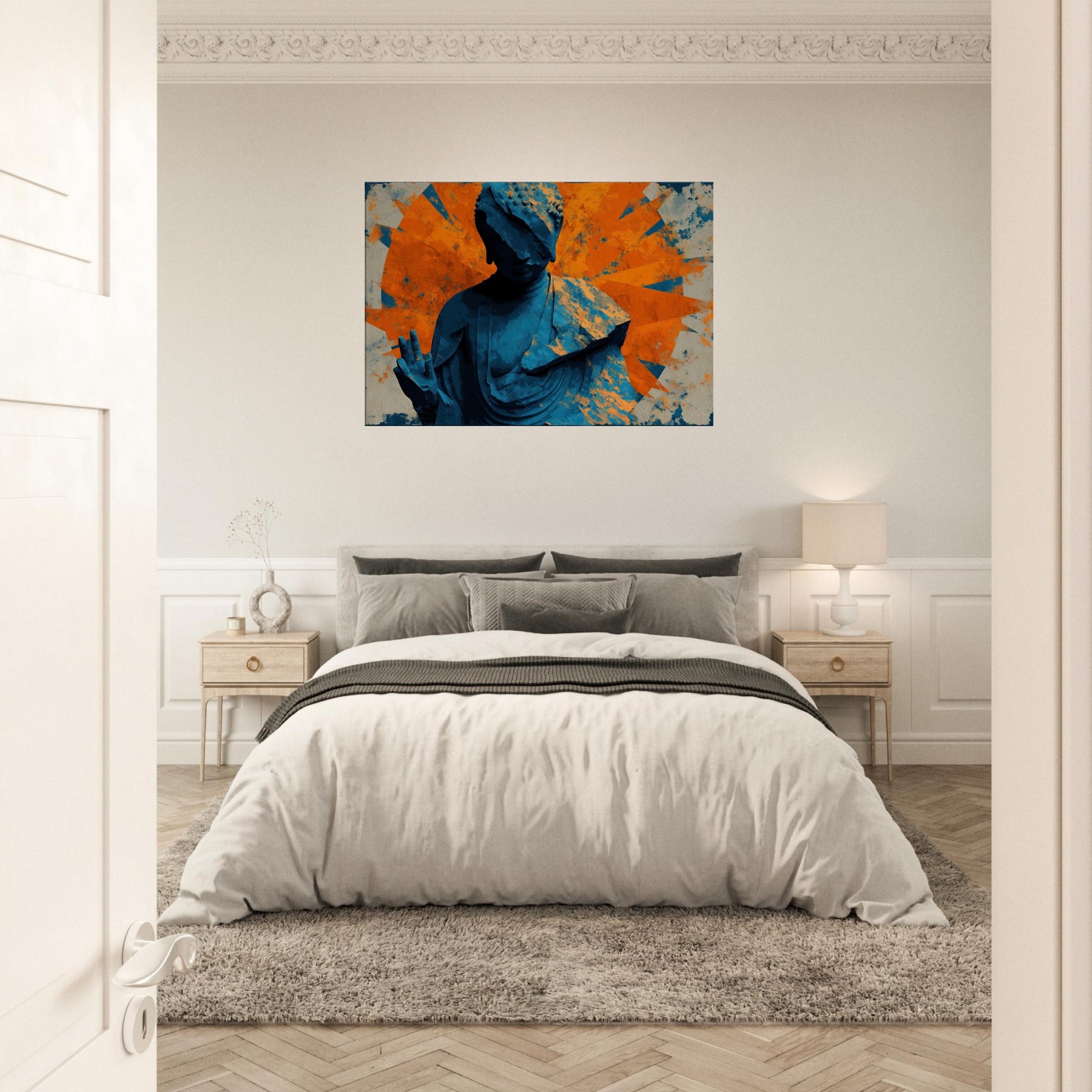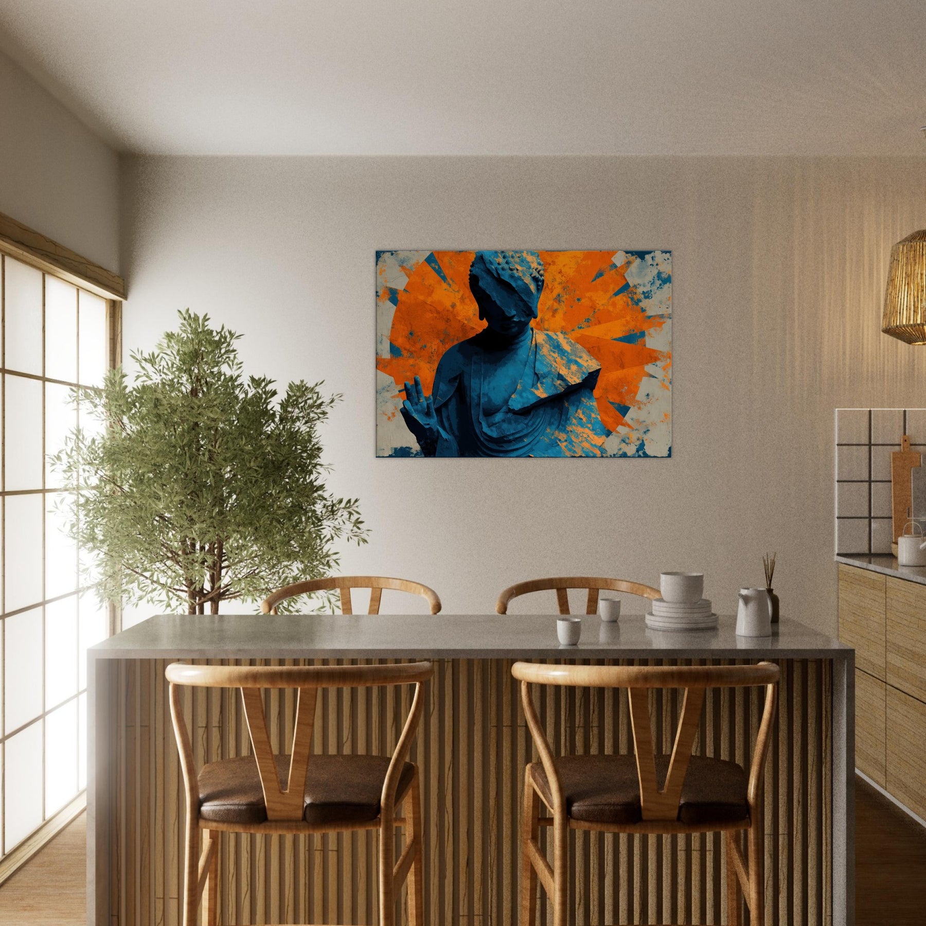 An abstracted Bodhisattva emerges in tranquil cobalt hues, set against explosive shards of orange that pulse like a sunrise. The composition invites the eye to drift along draped robes and a calm gesture, as if the figure offers blessing from a quiet, mystic horizon. Texture hints at weathered stone and whispered light, making the piece feel tactile and alive. In a living space, it becomes a meditative focal point calming, inspiring, and subtly energizing the room with balance, depth, and luminous color. The central subject is Bodhisattva (Abstract).