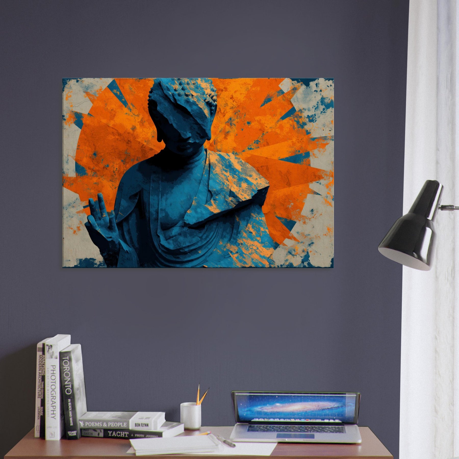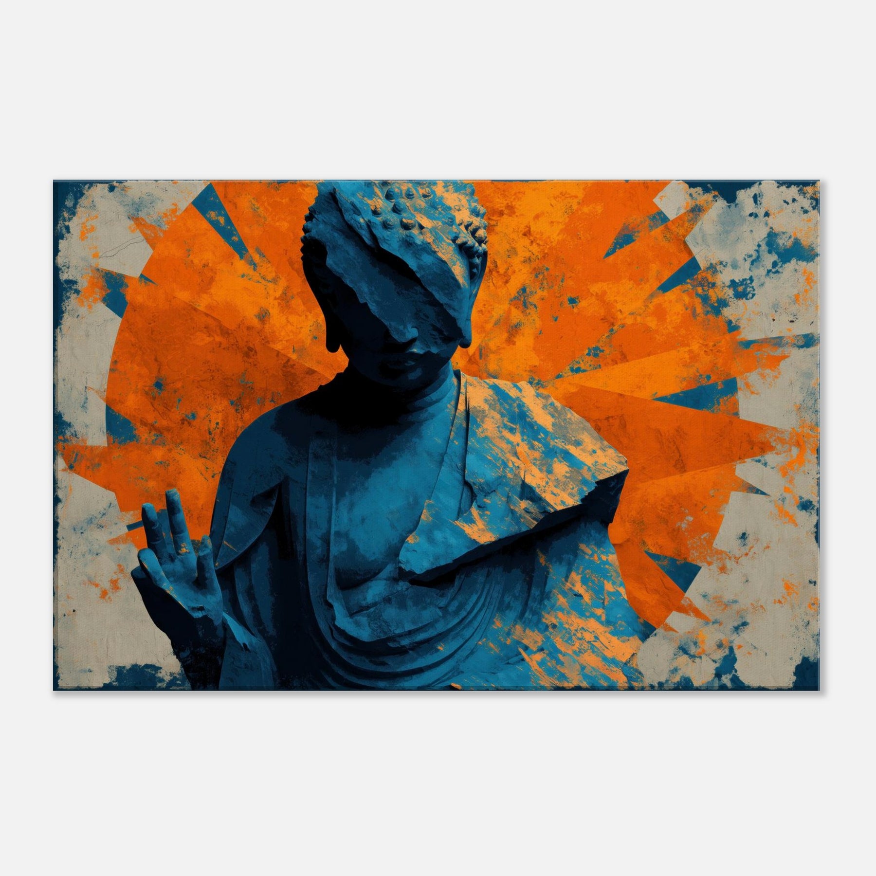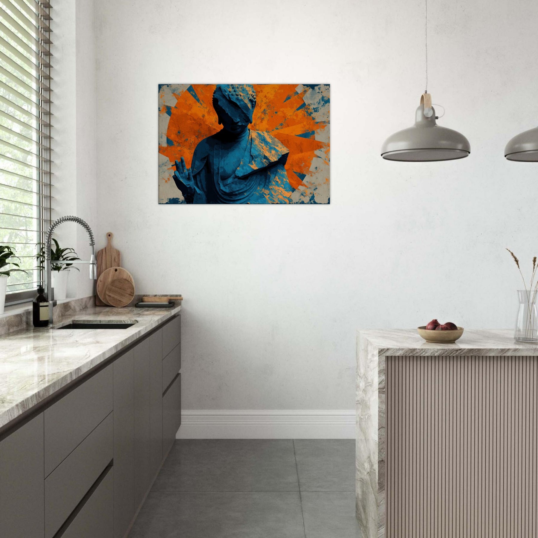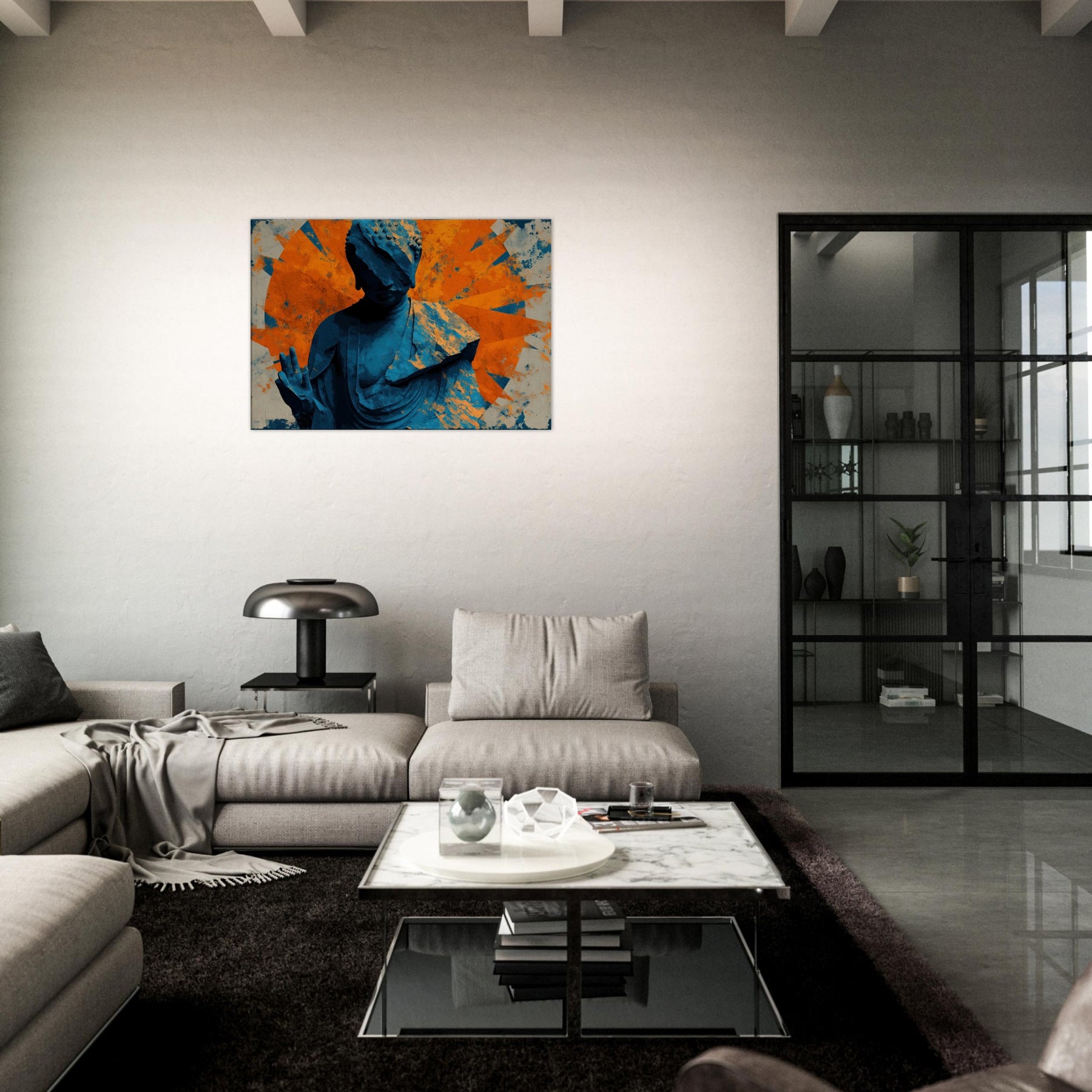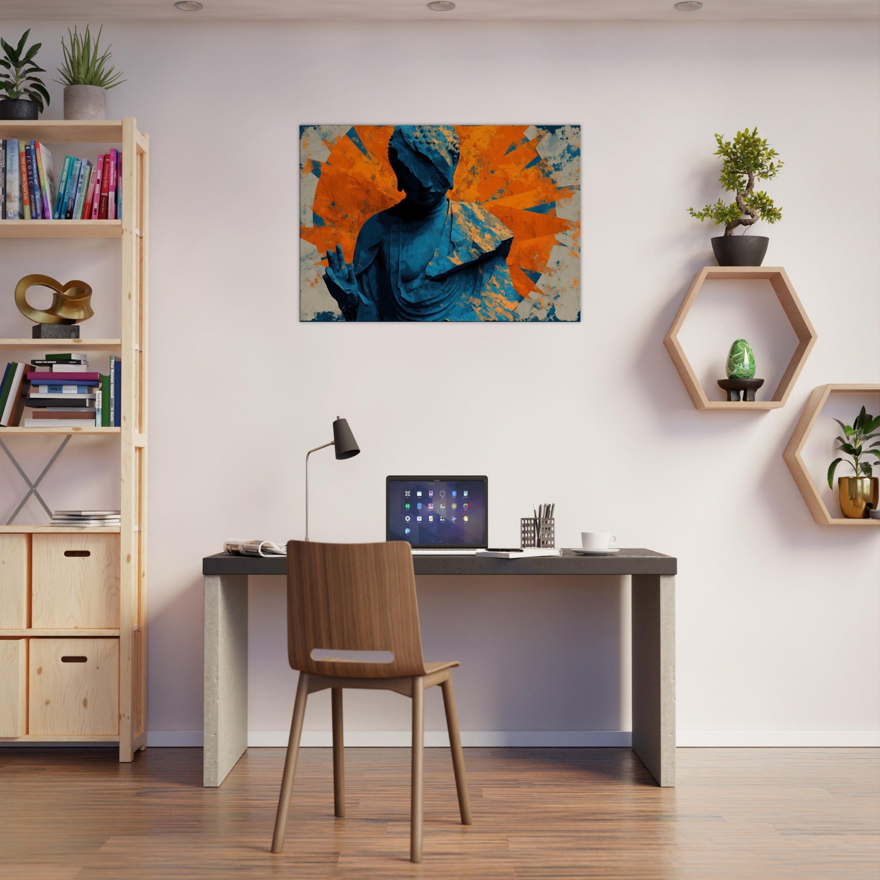 An abstracted Bodhisattva emerges in tranquil cobalt hues, set against explosive shards of orange that pulse like a sunrise. The composition invites the eye to drift along draped robes and a calm gesture, as if the figure offers blessing from a quiet, mystic horizon. Texture hints at weathered stone and whispered light, making the piece feel tactile and alive. In a living space, it becomes a meditative focal point calming, inspiring, and subtly energizing the room with balance, depth, and luminous color. The central subject is Bodhisattva (Abstract).