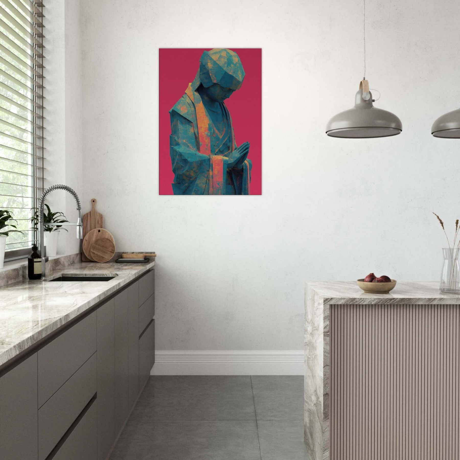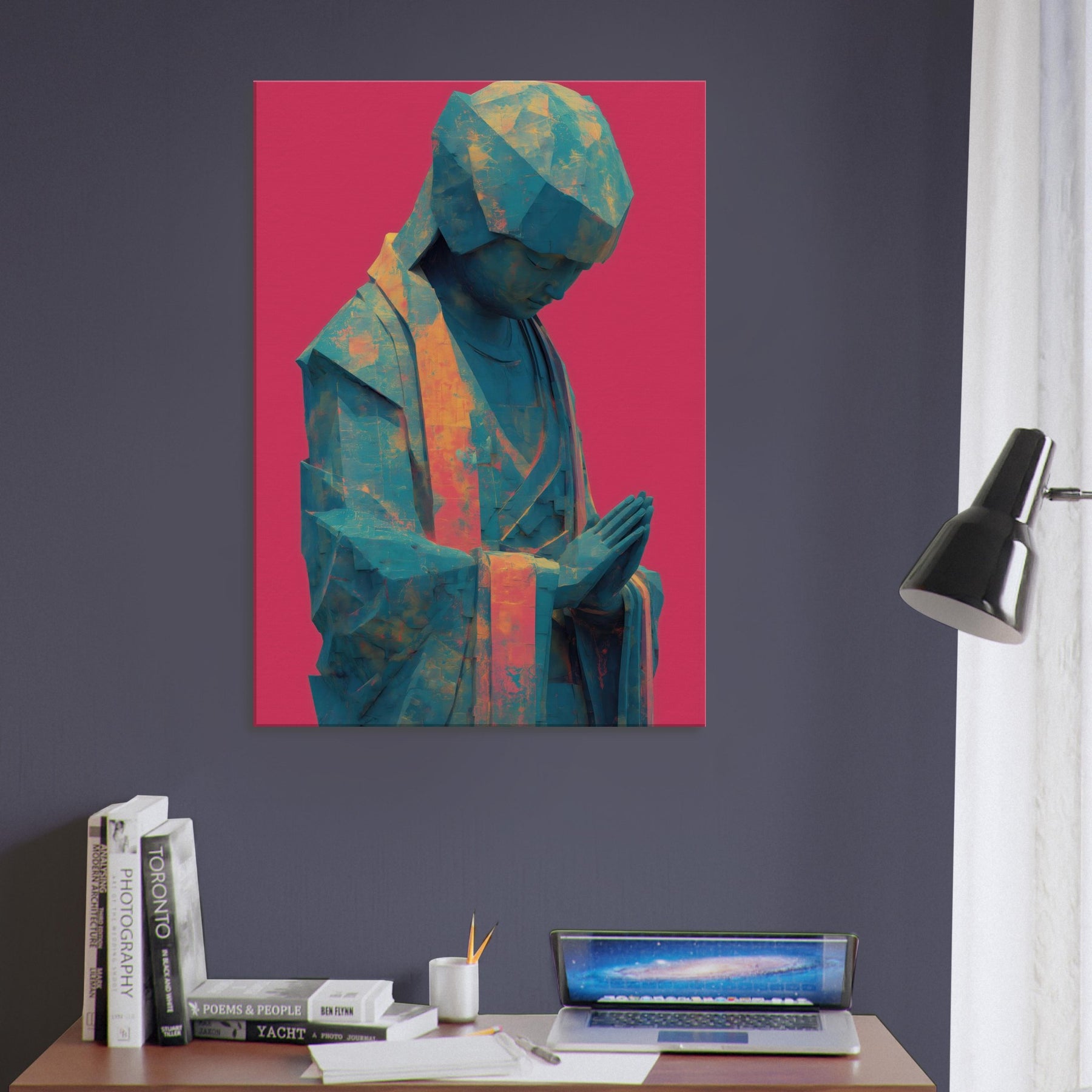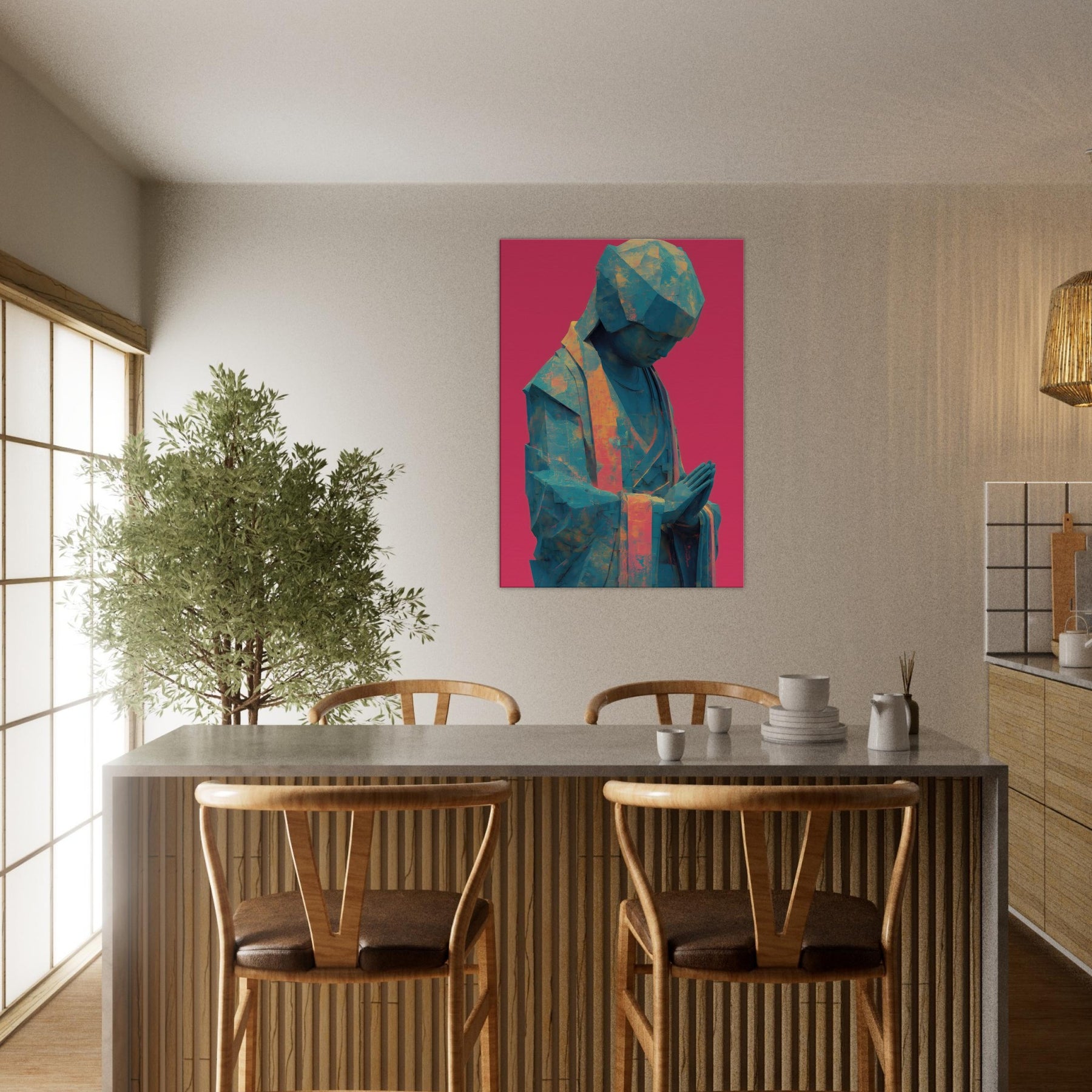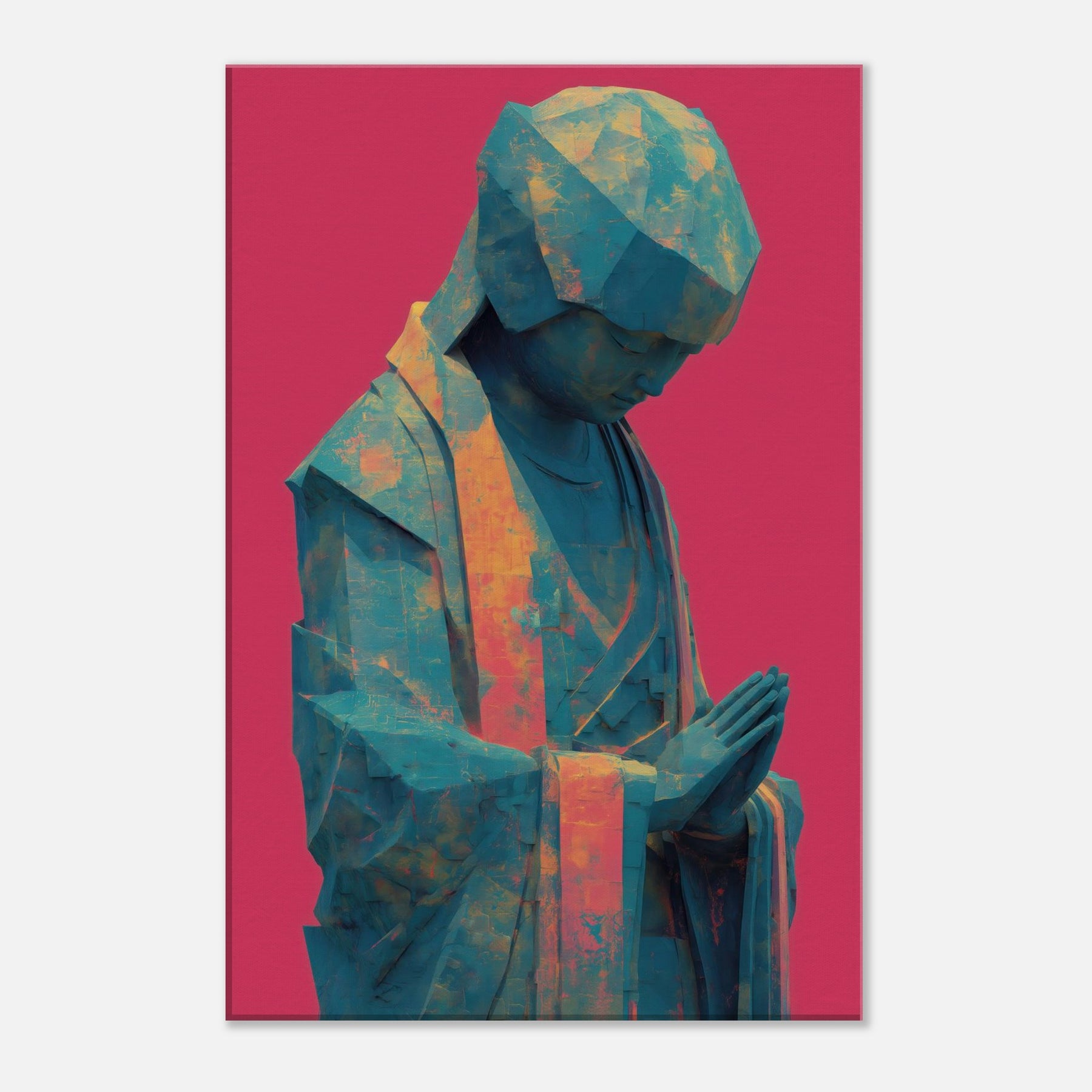 Mystical Kuan Yin (Guanyin) emerges in abstracted form, a serene silhouette in teal and amber tones, resting against a bold magenta backdrop. The folded hands and bowed head invite quiet prayer, guiding the eye with soft light across its faceted surface. This piece blends temple calm with contemporary texture, turning everyday walls into a sanctuary where luminosity, air, and spirituality mingle. Ideal for a calming corner or living space, it brings reverent stillness and a luminous, mystical presence.