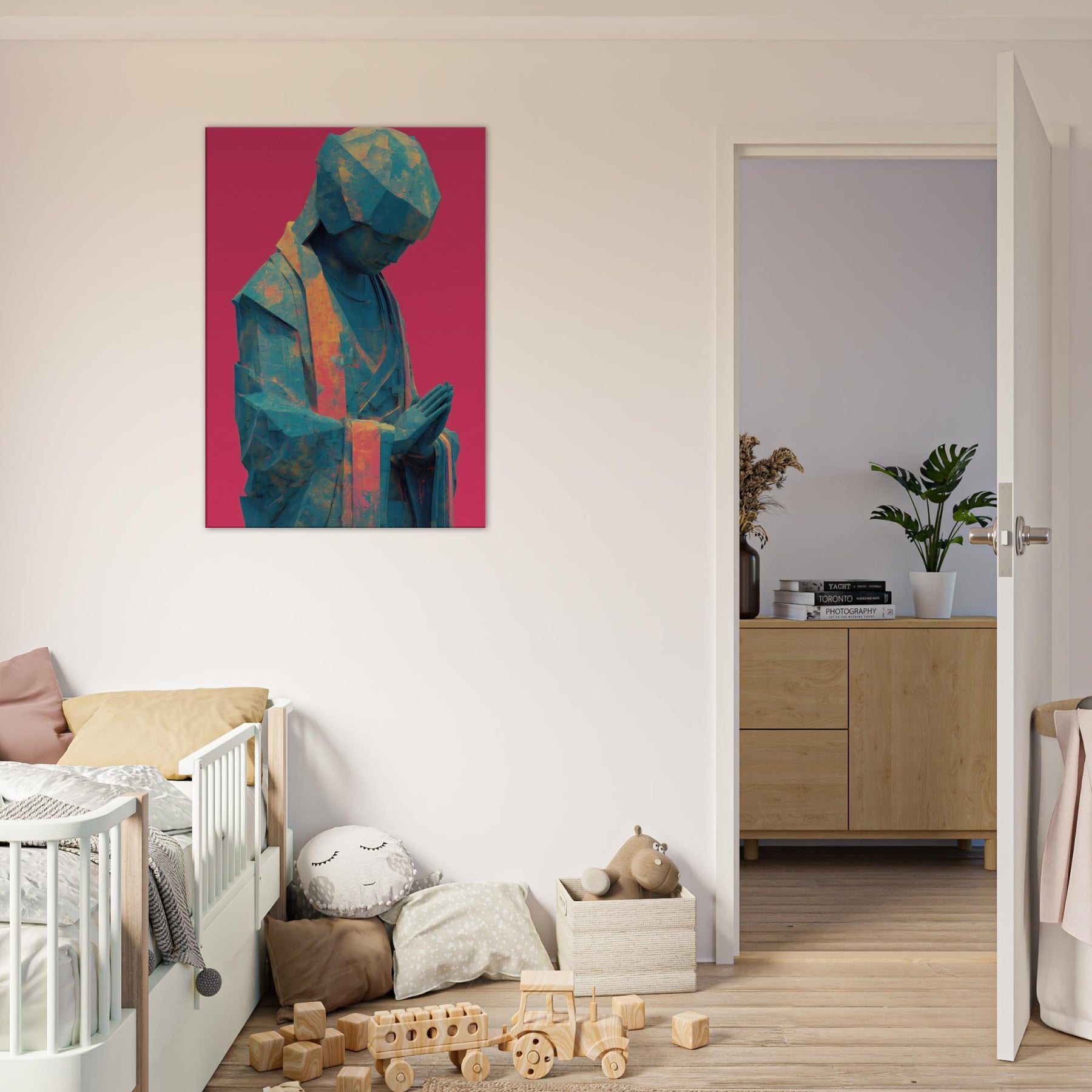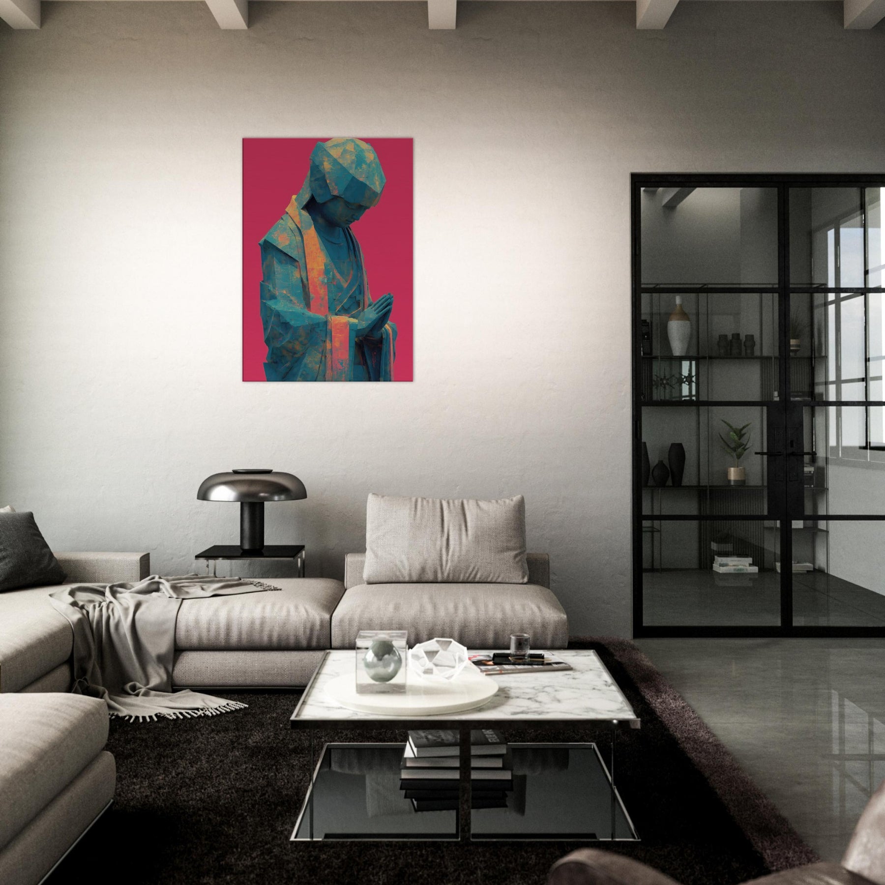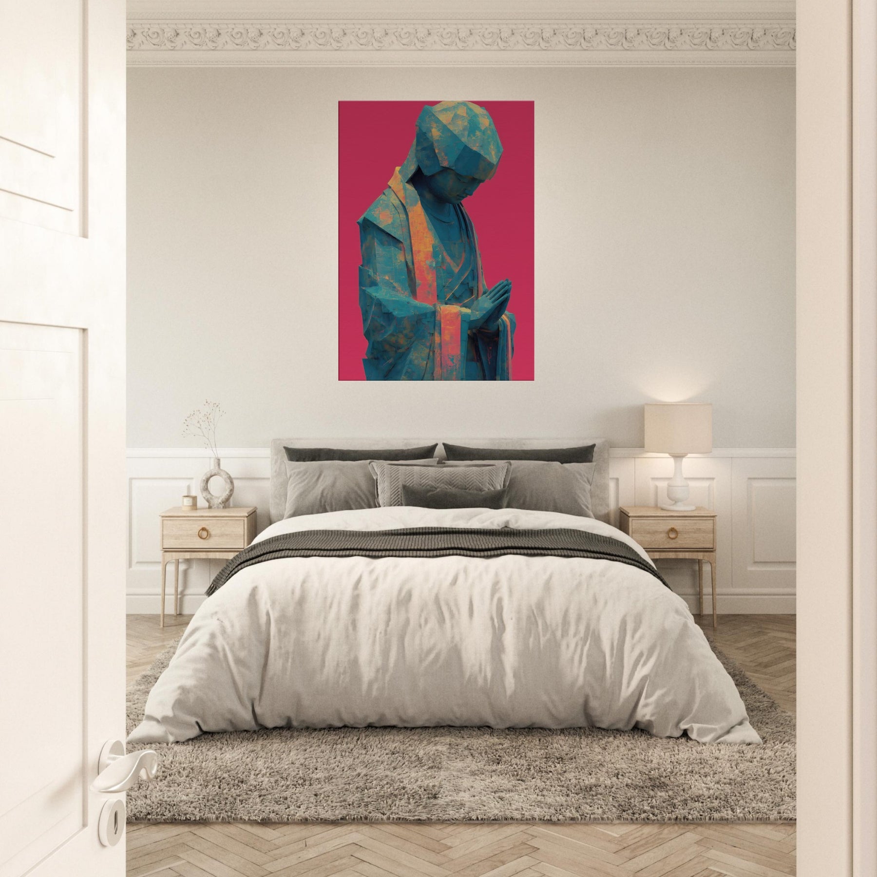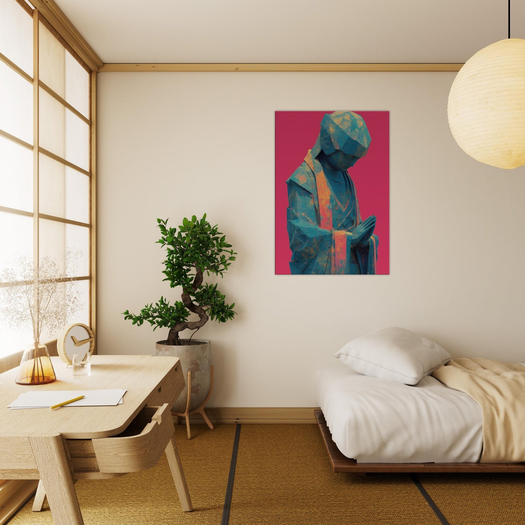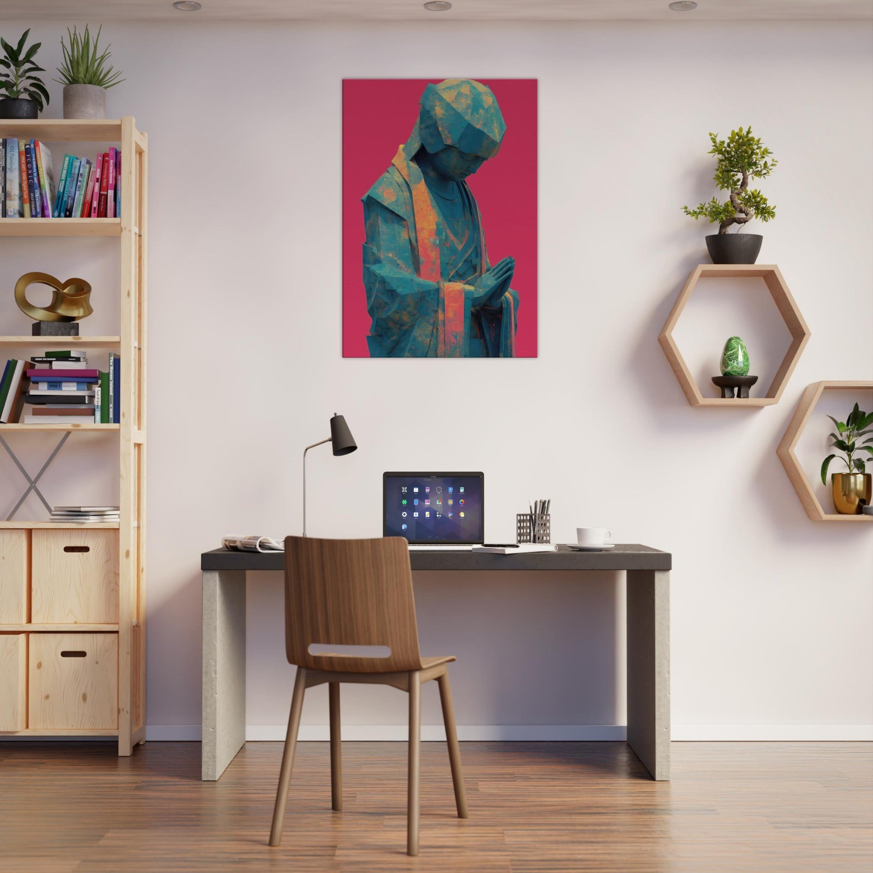 Mystical Kuan Yin (Guanyin) emerges in abstracted form, a serene silhouette in teal and amber tones, resting against a bold magenta backdrop. The folded hands and bowed head invite quiet prayer, guiding the eye with soft light across its faceted surface. This piece blends temple calm with contemporary texture, turning everyday walls into a sanctuary where luminosity, air, and spirituality mingle. Ideal for a calming corner or living space, it brings reverent stillness and a luminous, mystical presence.