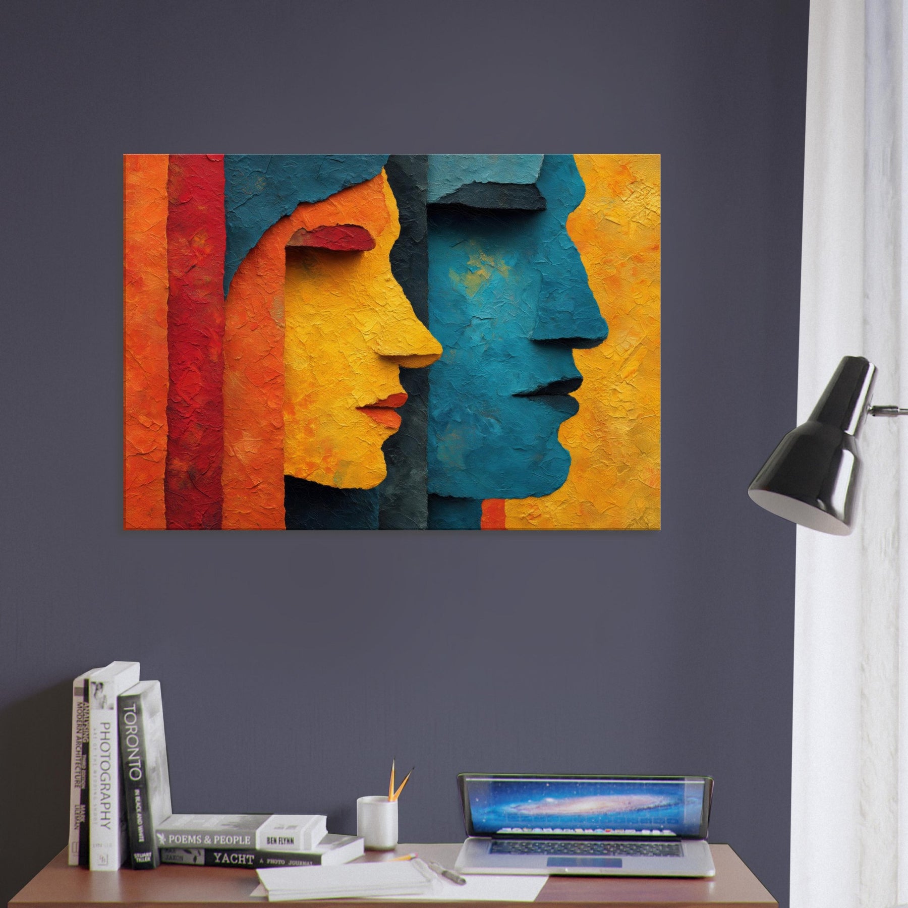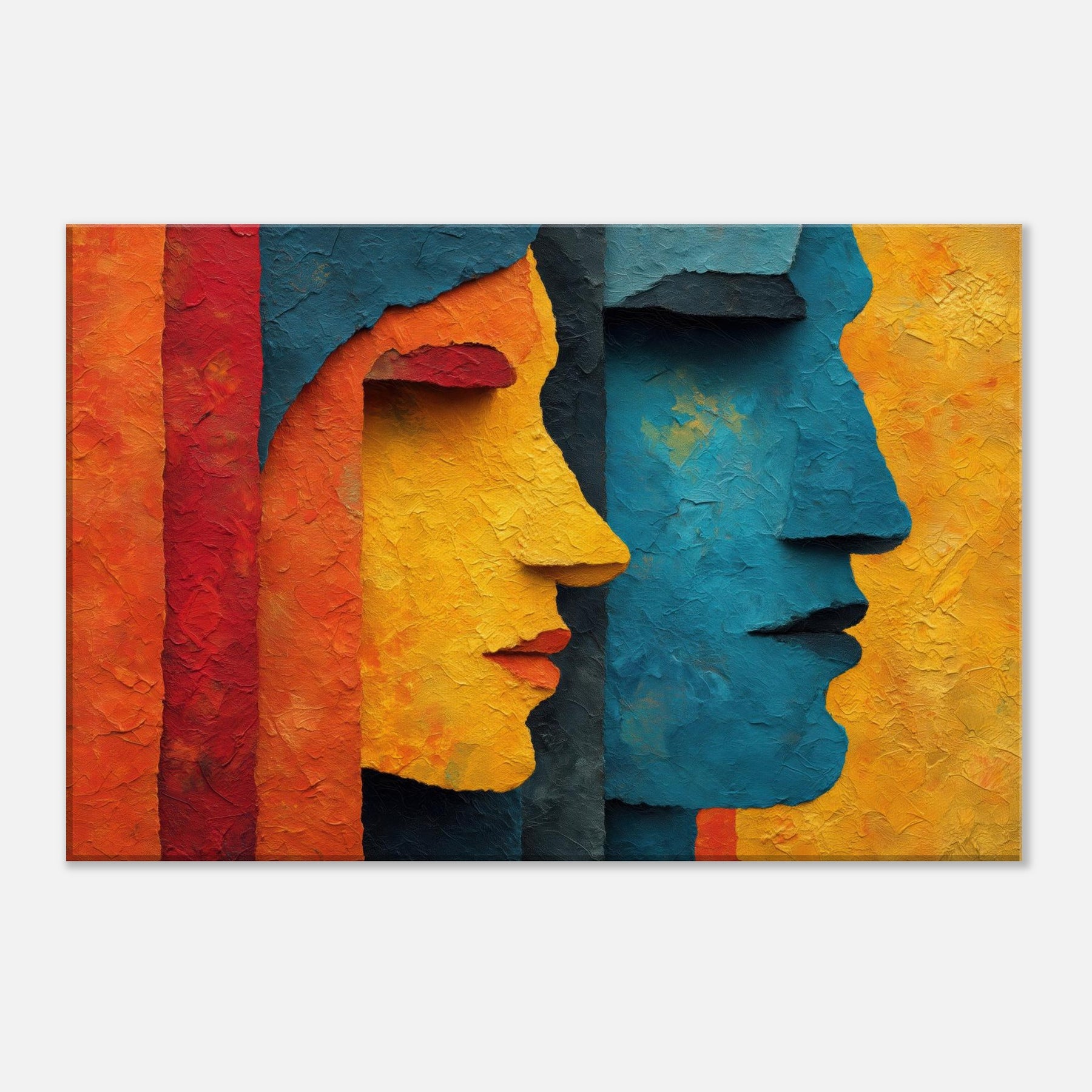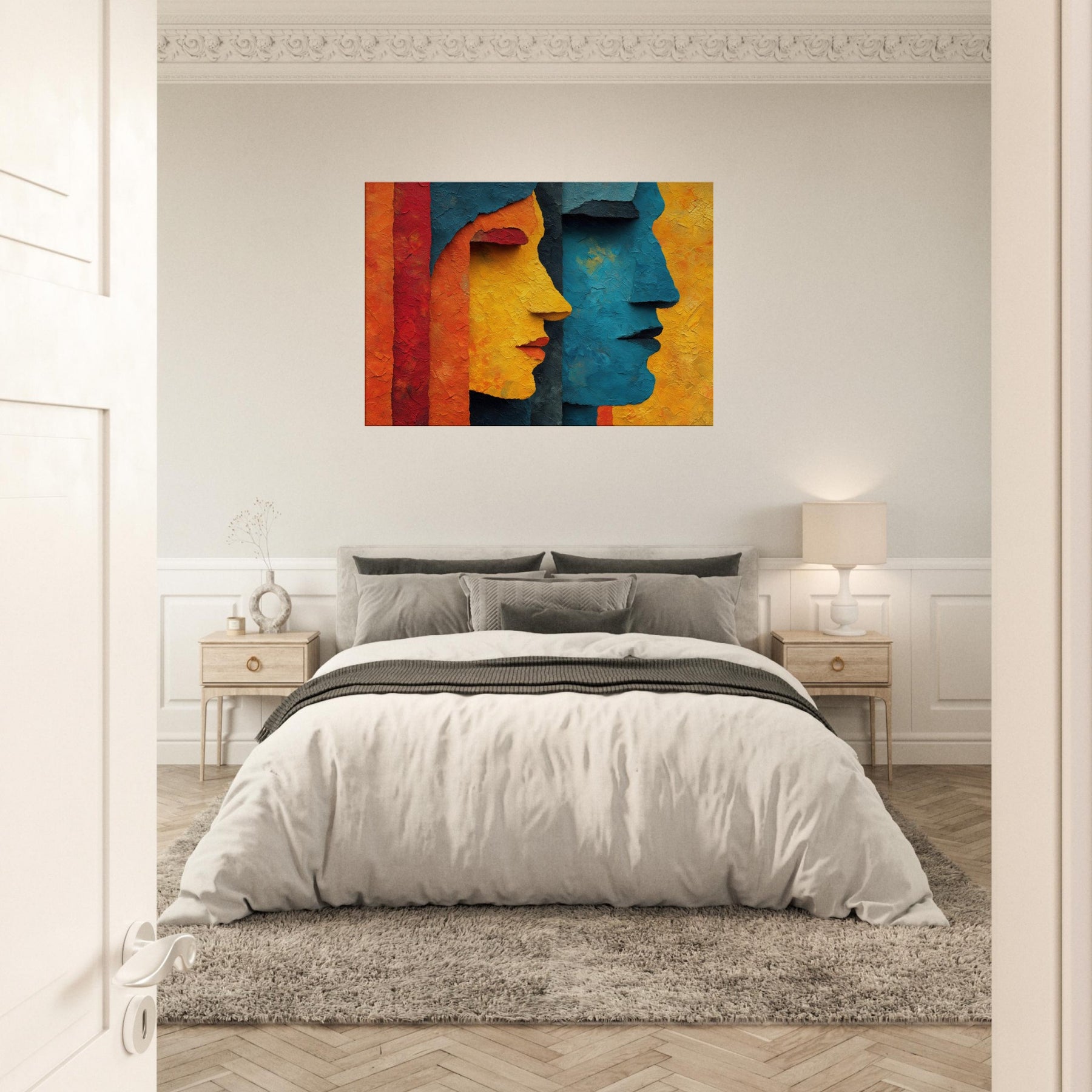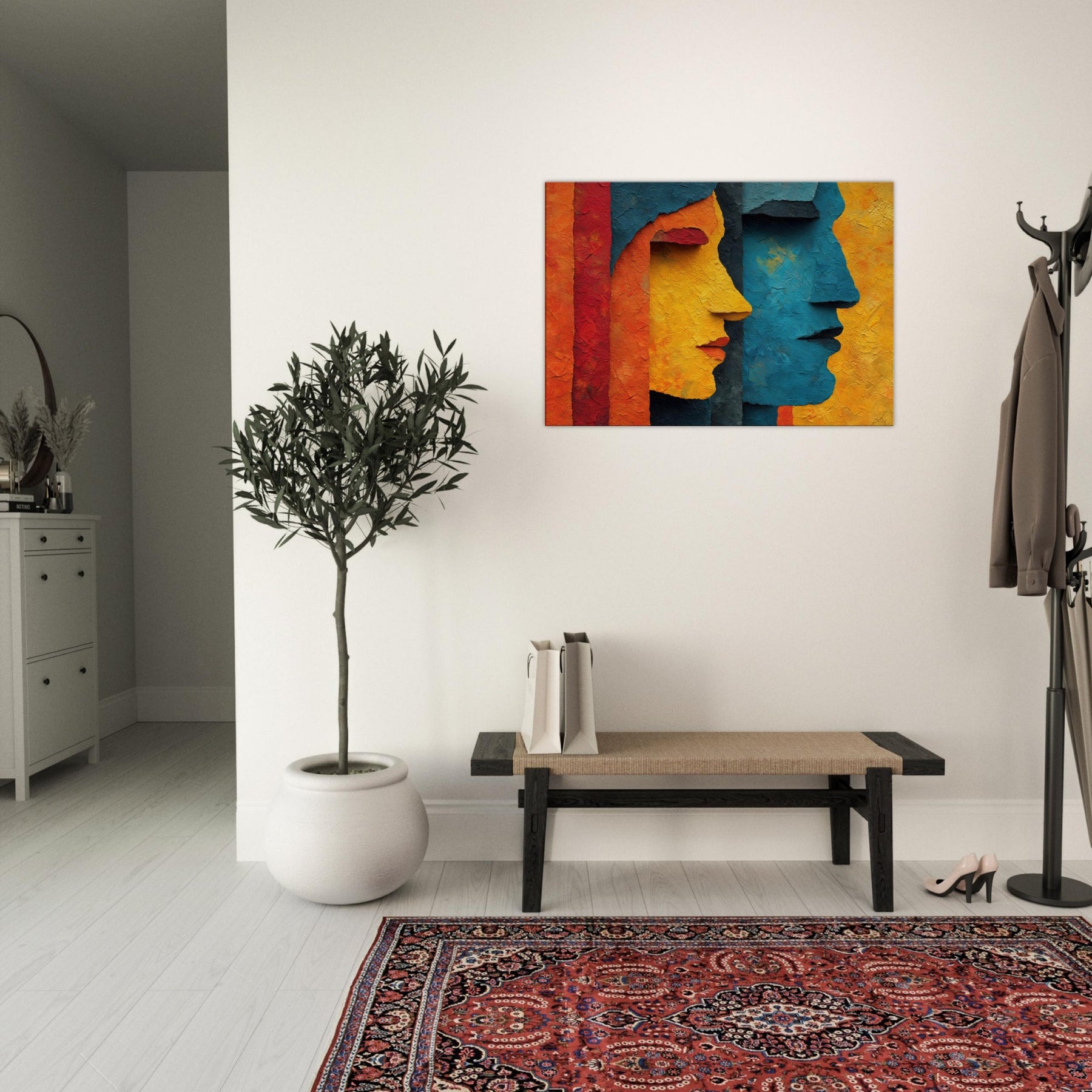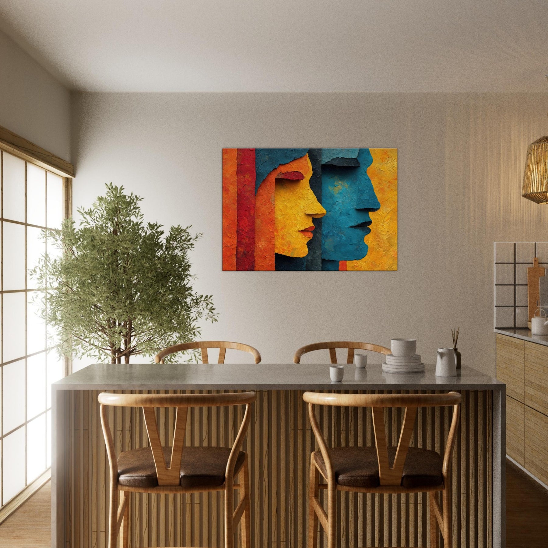 Couple Silhouette unfolds as a luminous dialogue of form and color. The Couple Silhouette becomes a vivid balance of sun warmed yellows and deep ocean blues, its textured surface catching light and casting graceful shadows. This abstract invites quiet reflection, turning a wall into a living mood board of intimacy and presence. Perfect for a main living area or a tranquil bedroom, it brings warmth, contrast, and a refined glow that elevates space without overpowering it.