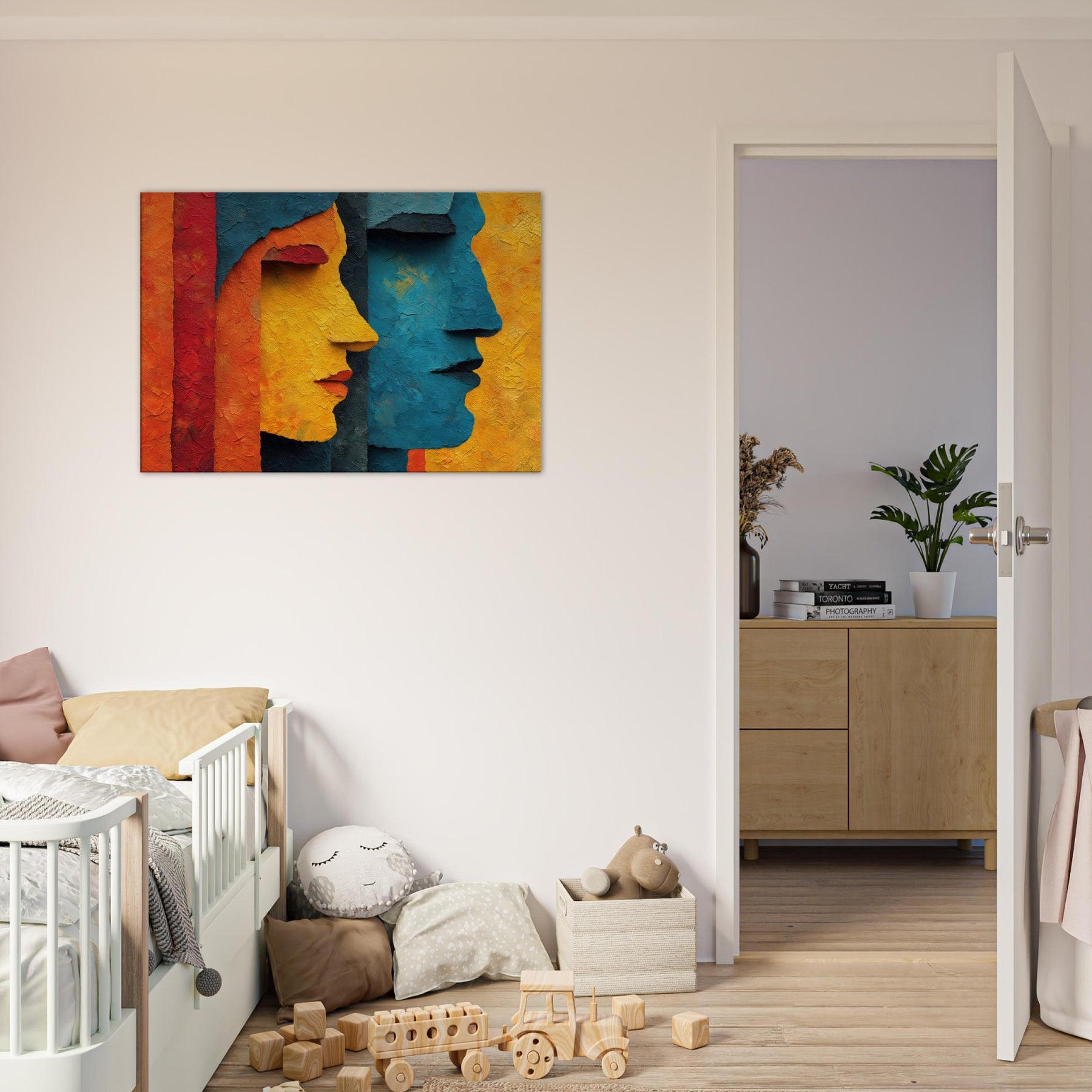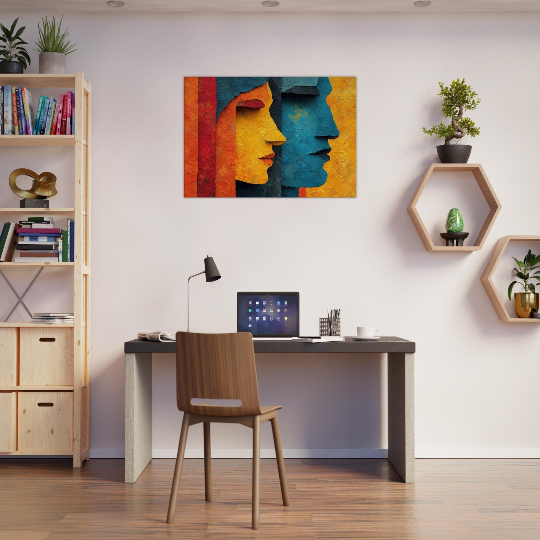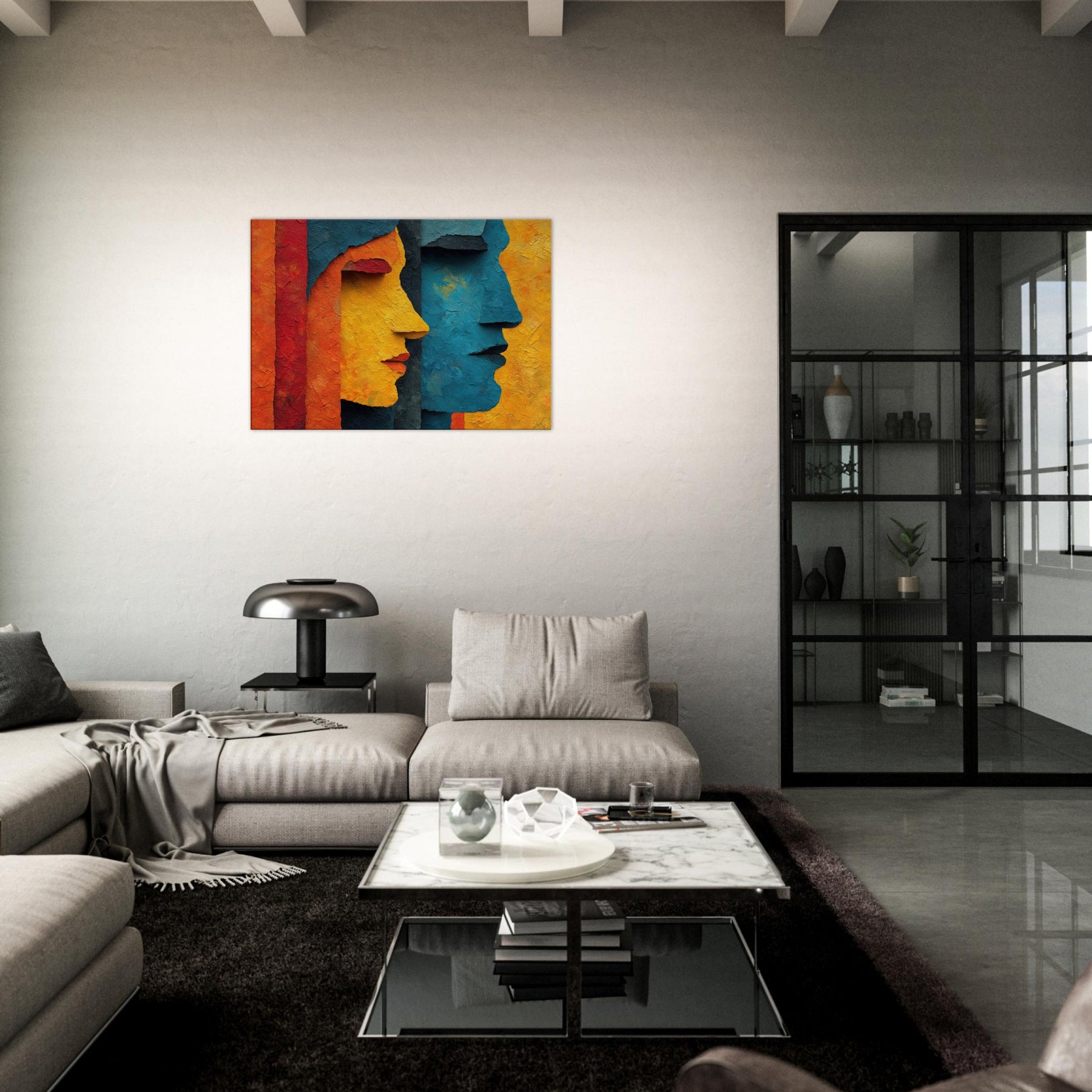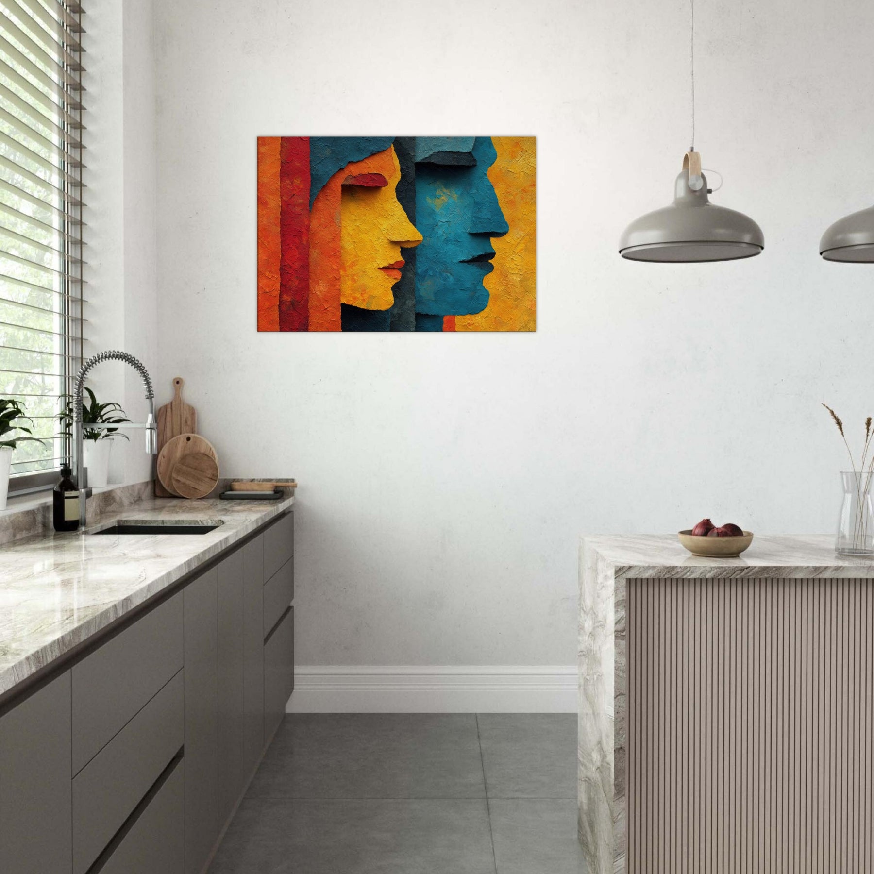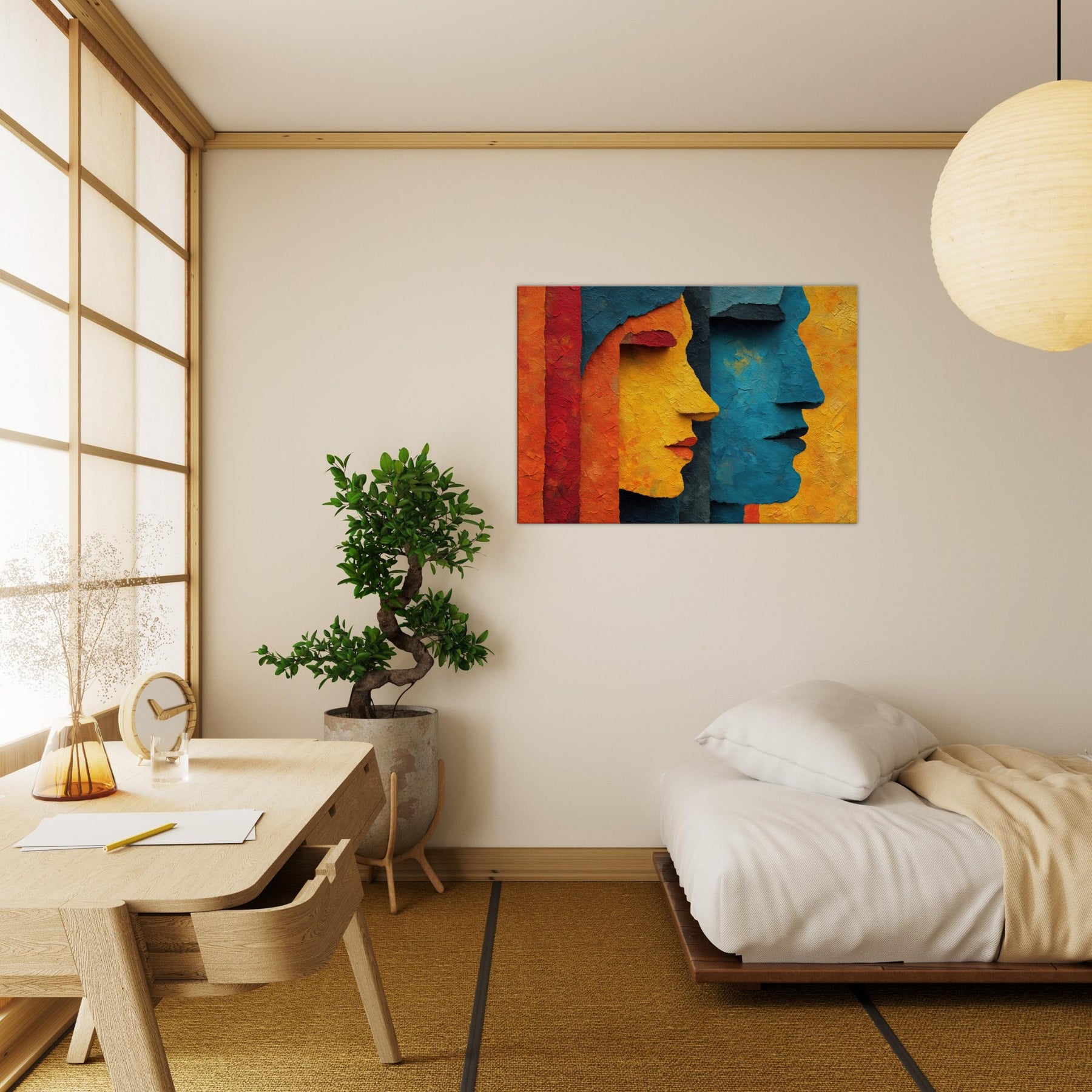 Couple Silhouette unfolds as a luminous dialogue of form and color. The Couple Silhouette becomes a vivid balance of sun warmed yellows and deep ocean blues, its textured surface catching light and casting graceful shadows. This abstract invites quiet reflection, turning a wall into a living mood board of intimacy and presence. Perfect for a main living area or a tranquil bedroom, it brings warmth, contrast, and a refined glow that elevates space without overpowering it.