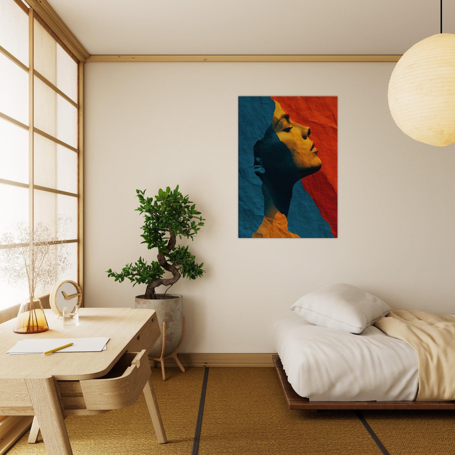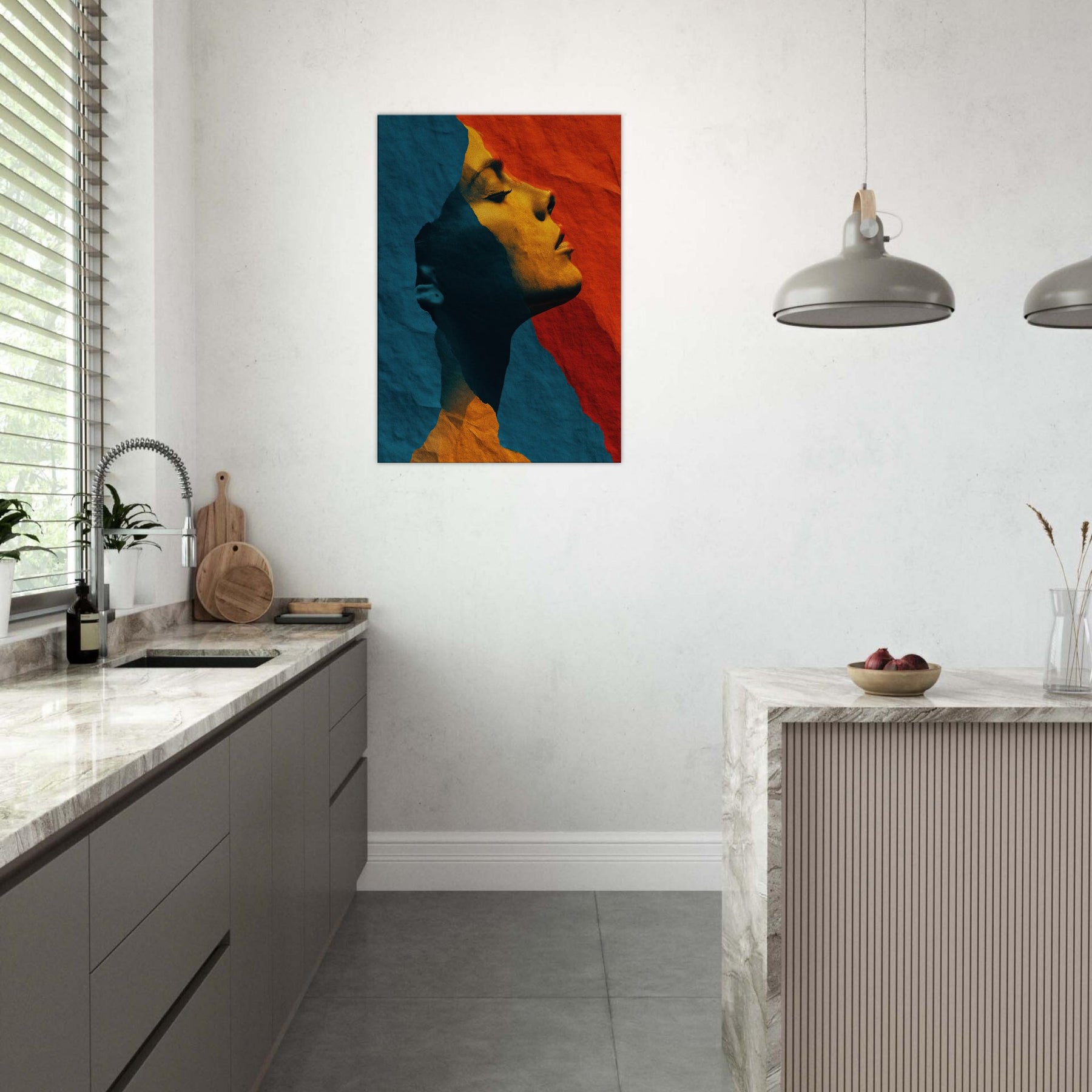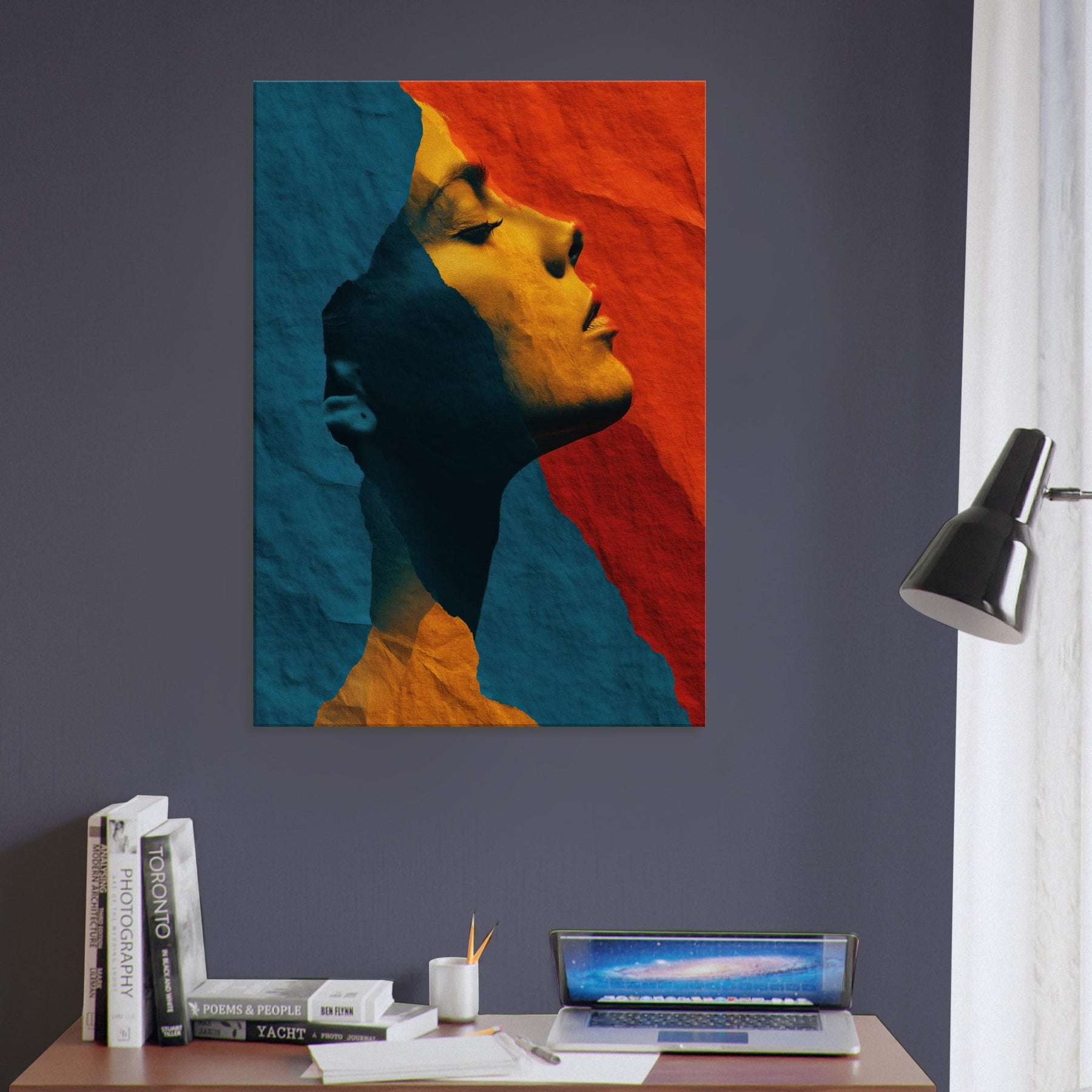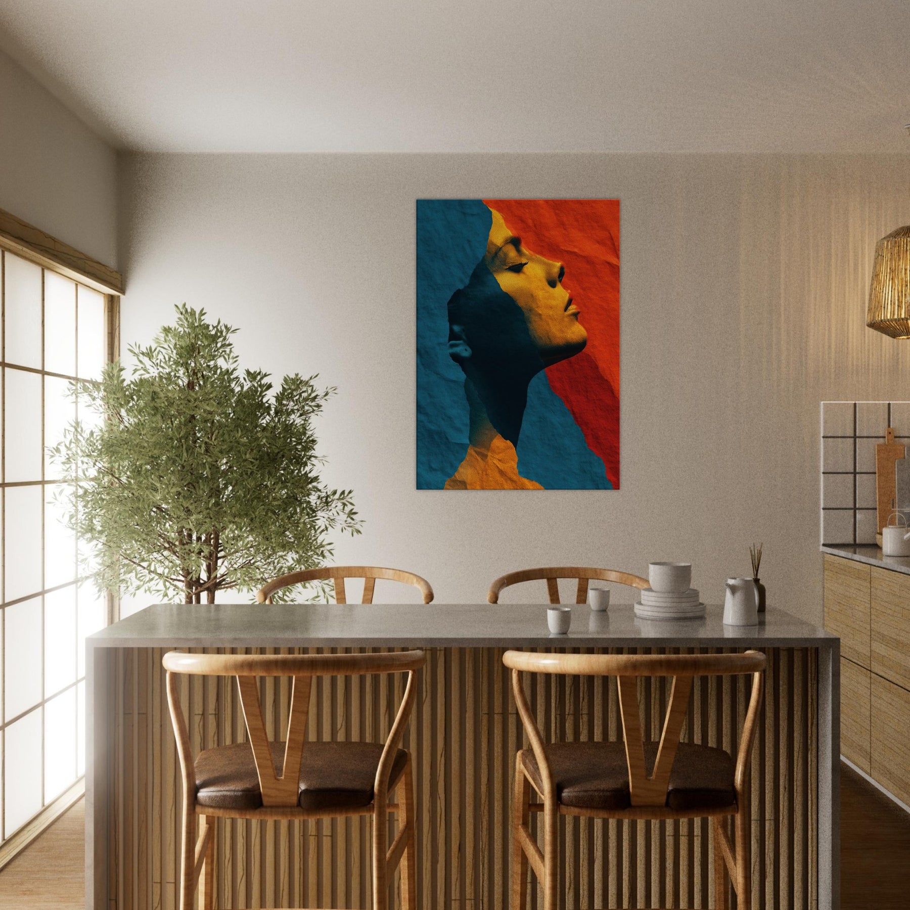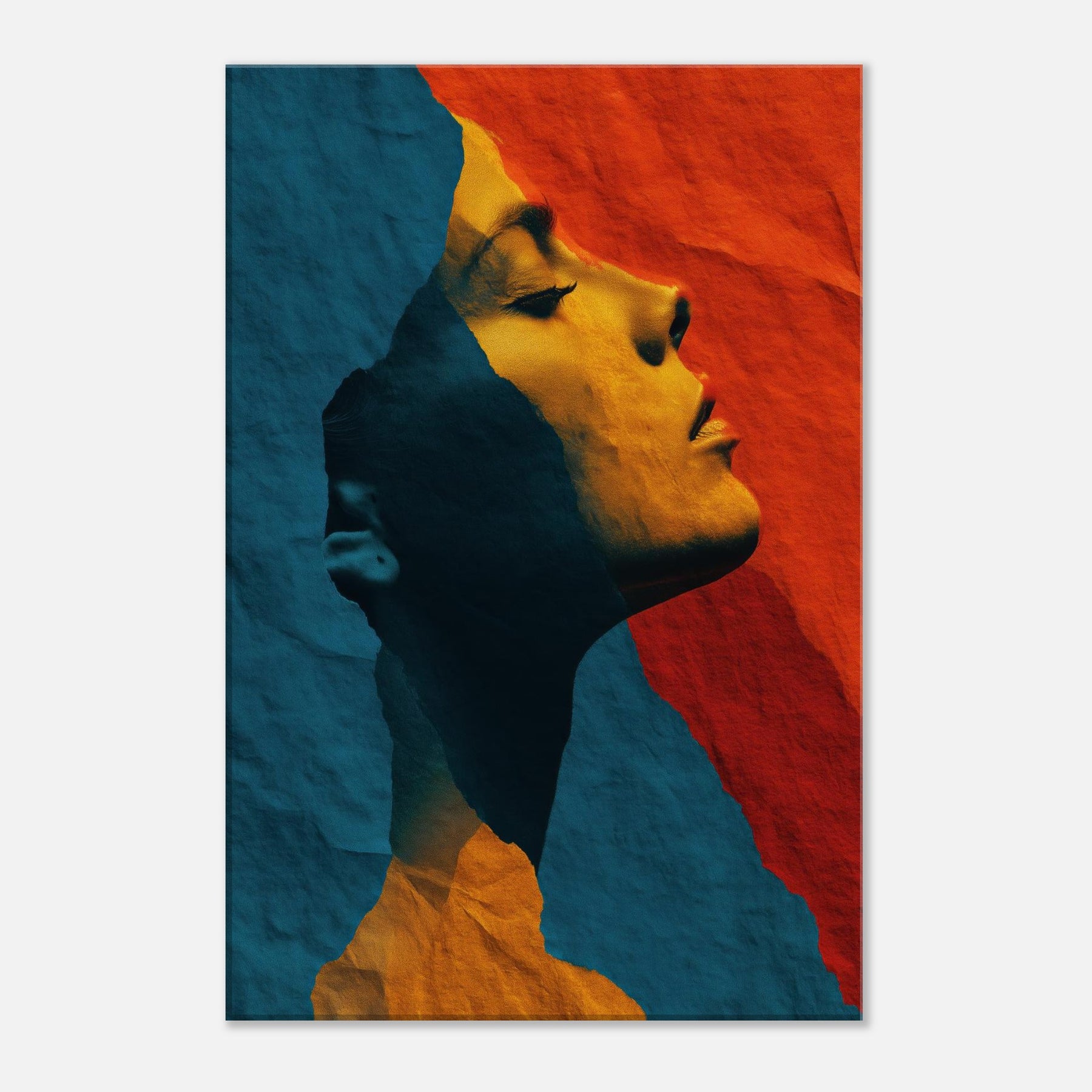 Like a whispered sculpture, this piece invites the eye to glide along the female silhouette, where lines collapse into color and light. The abstract forms breathe a quiet drama blue shadows meeting warm ochre glow creating a mood of introspective grace. Framed by soft edges and tactile, torn paper texture, it transforms a room into a sanctuary of calm energy. Place it above a sofa or in a hallway to catch the gaze and invite slow, pondering breaths as evening settles.