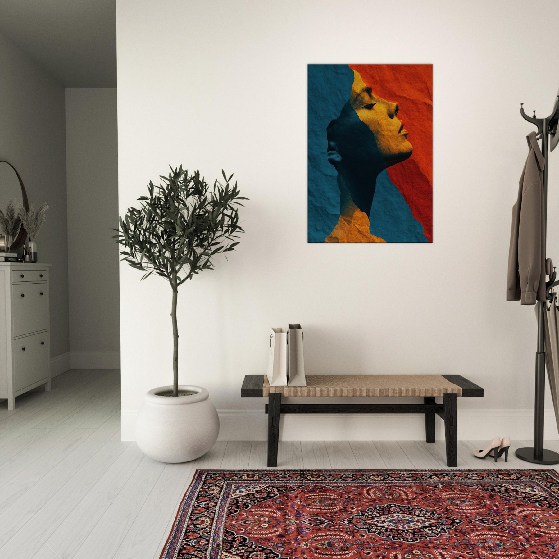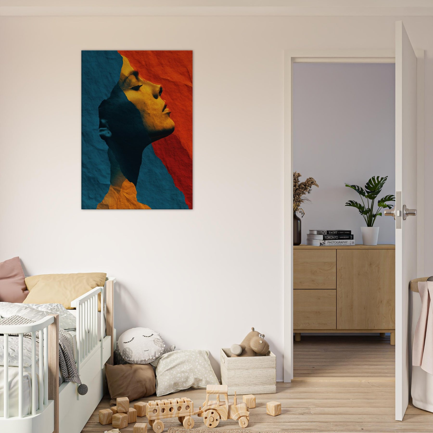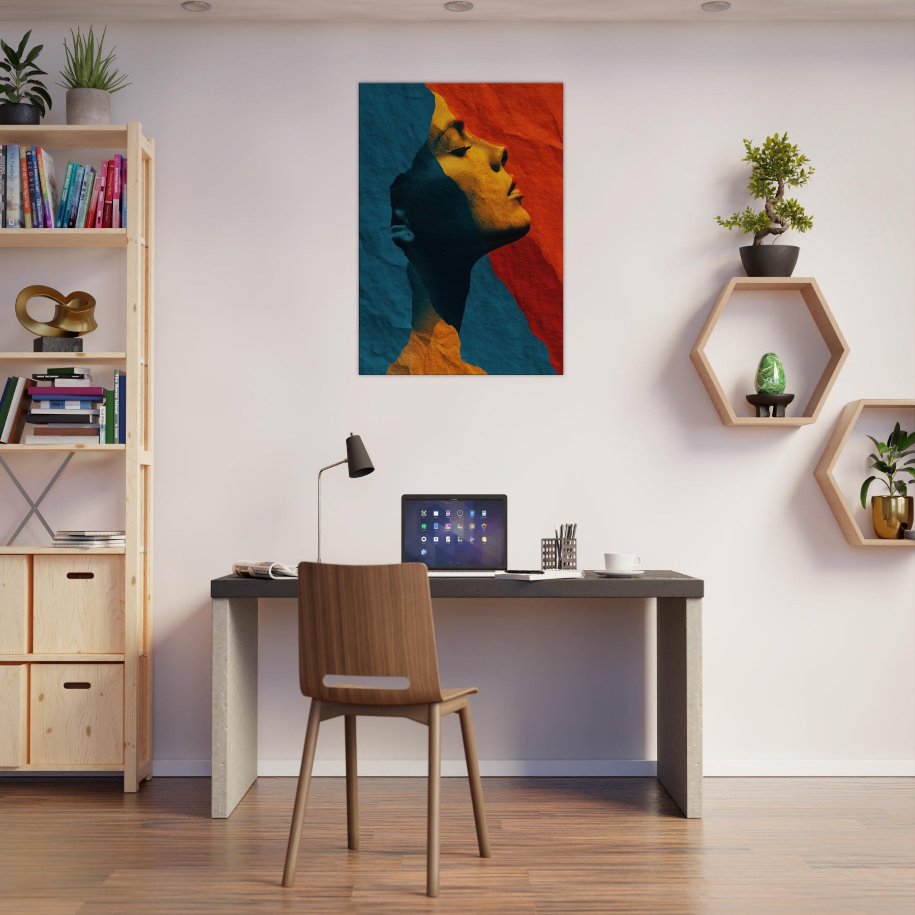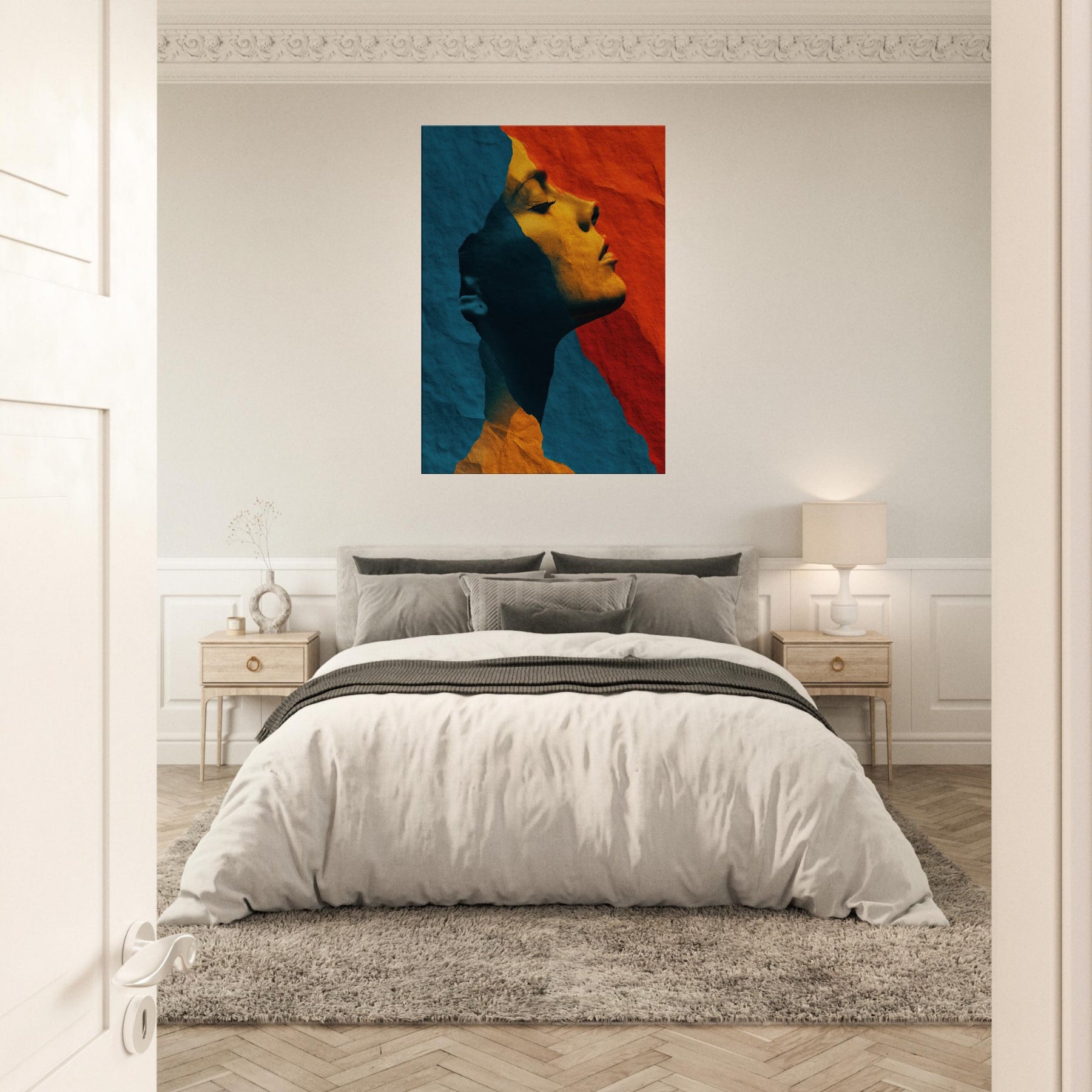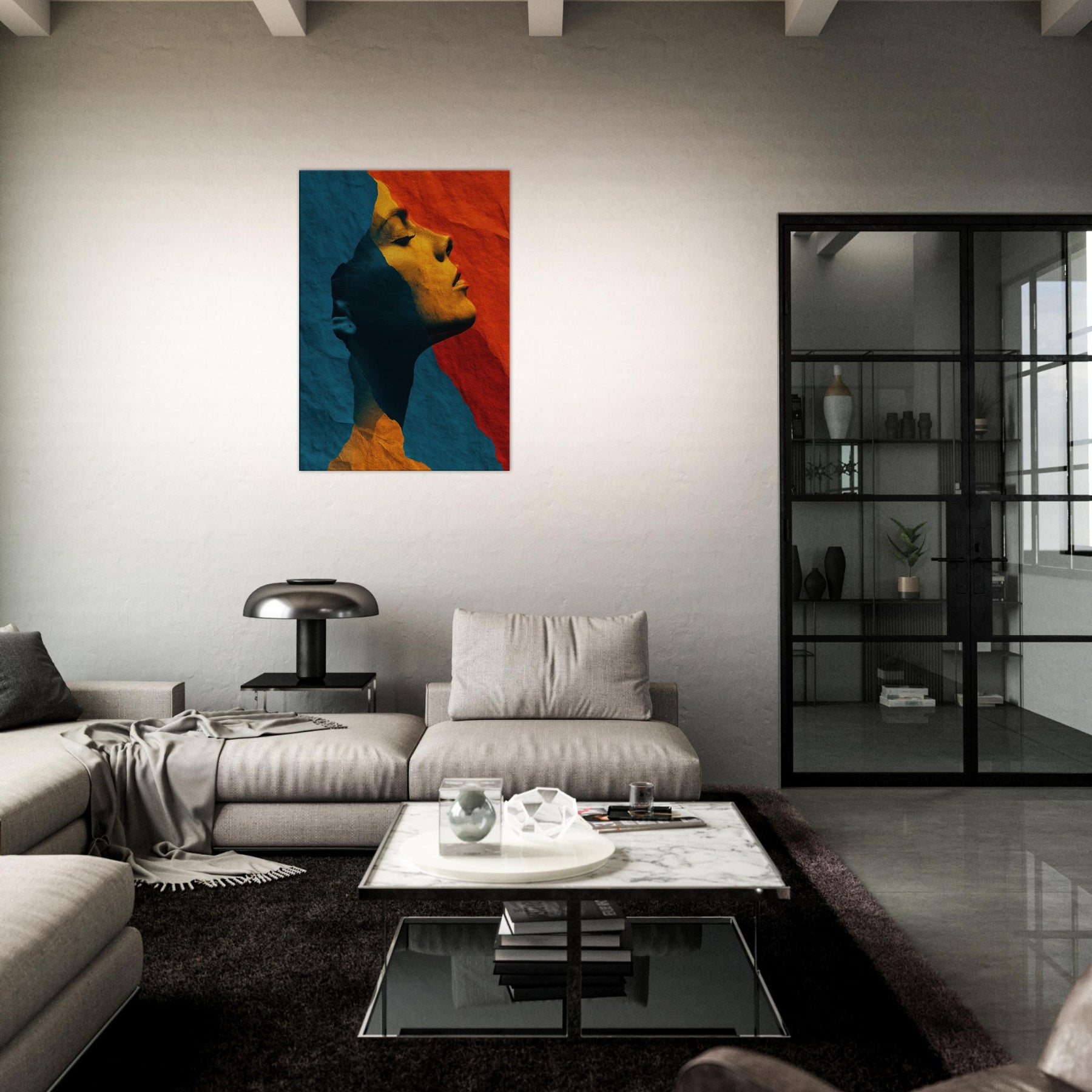 Like a whispered sculpture, this piece invites the eye to glide along the female silhouette, where lines collapse into color and light. The abstract forms breathe a quiet drama blue shadows meeting warm ochre glow creating a mood of introspective grace. Framed by soft edges and tactile, torn paper texture, it transforms a room into a sanctuary of calm energy. Place it above a sofa or in a hallway to catch the gaze and invite slow, pondering breaths as evening settles.
